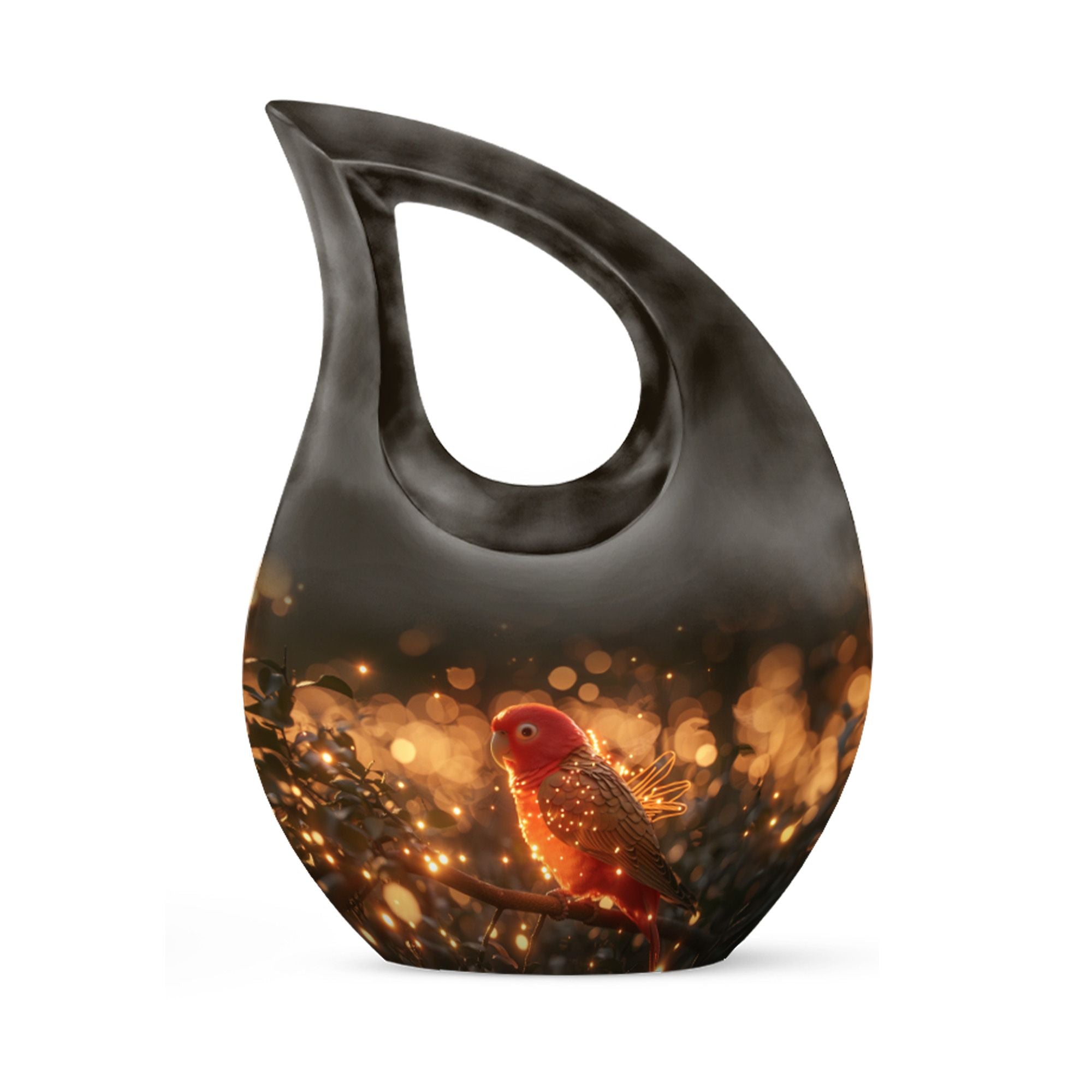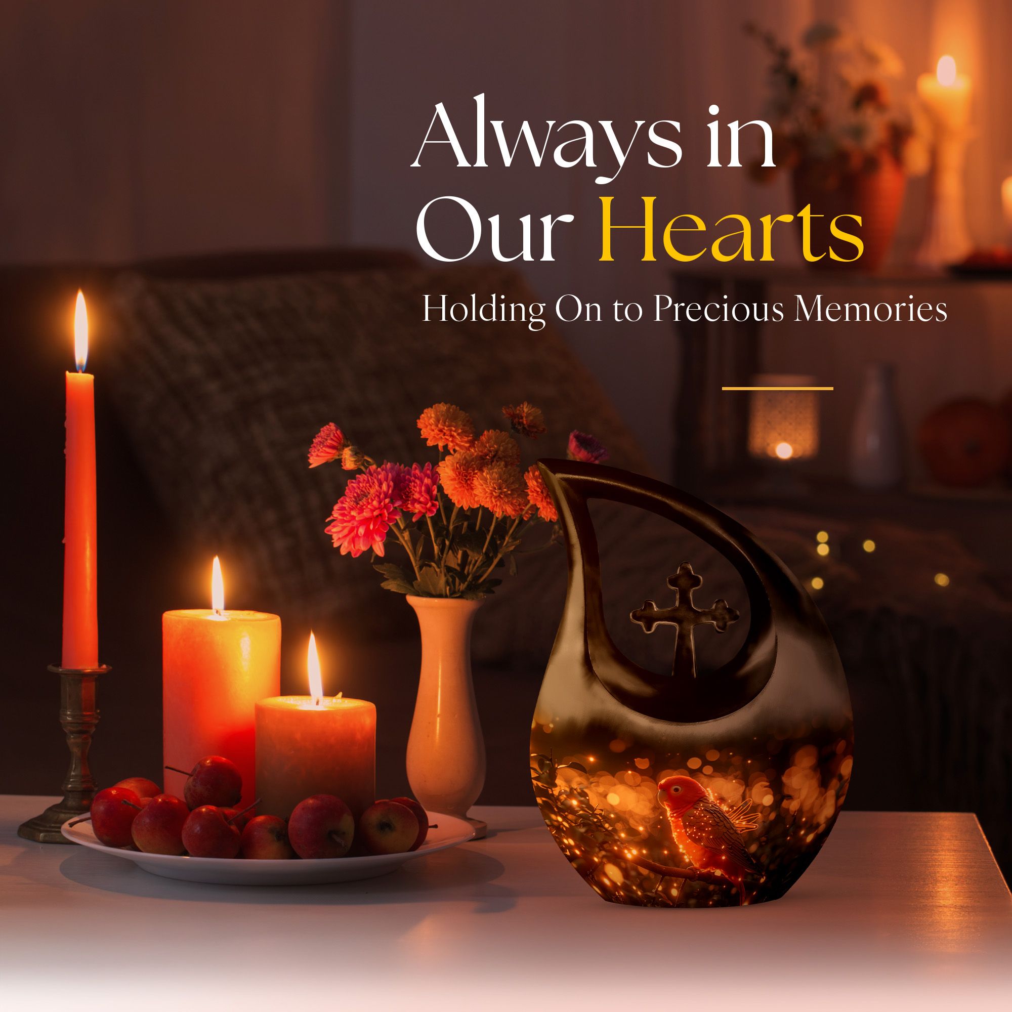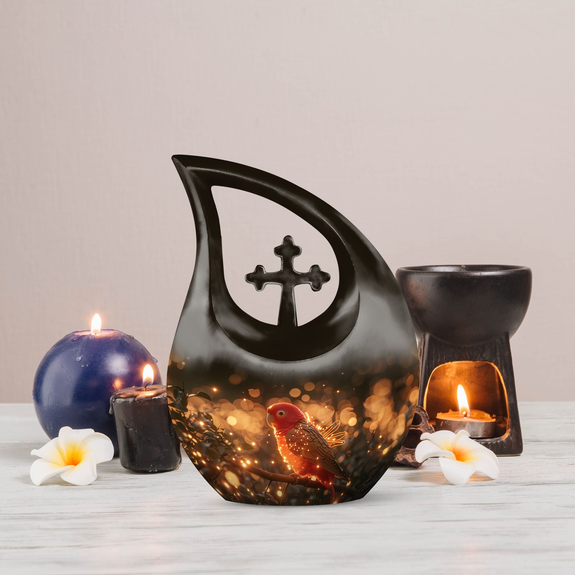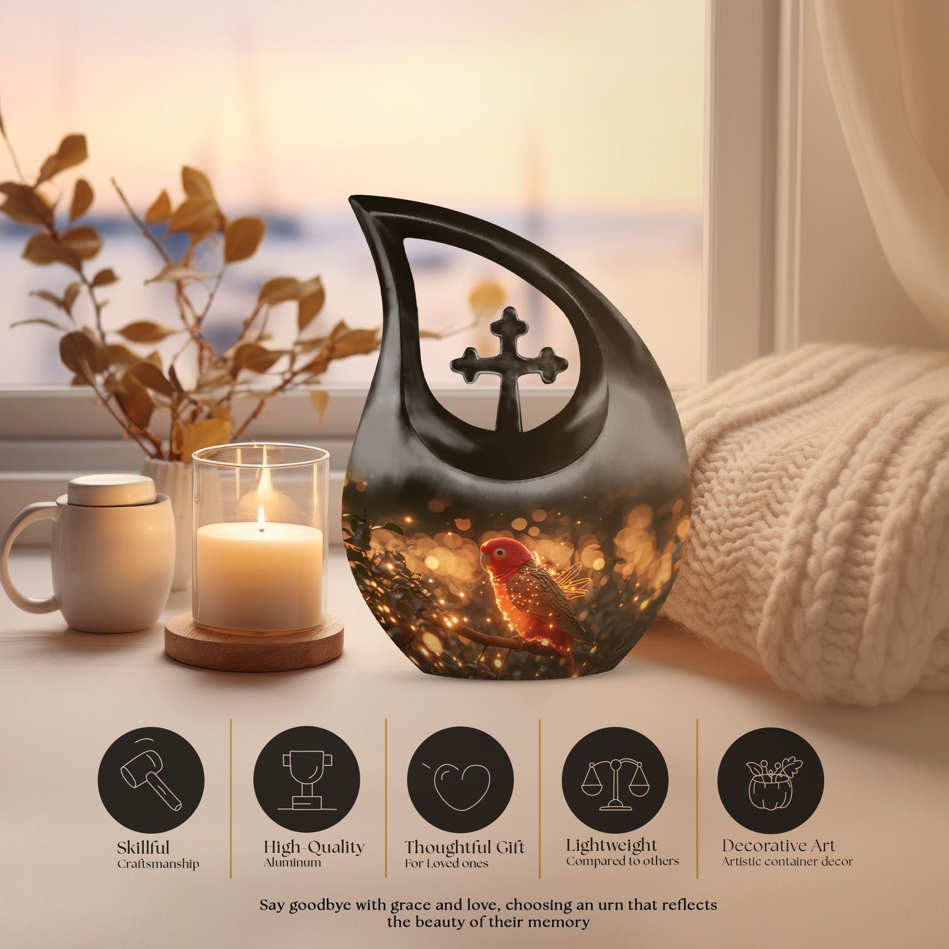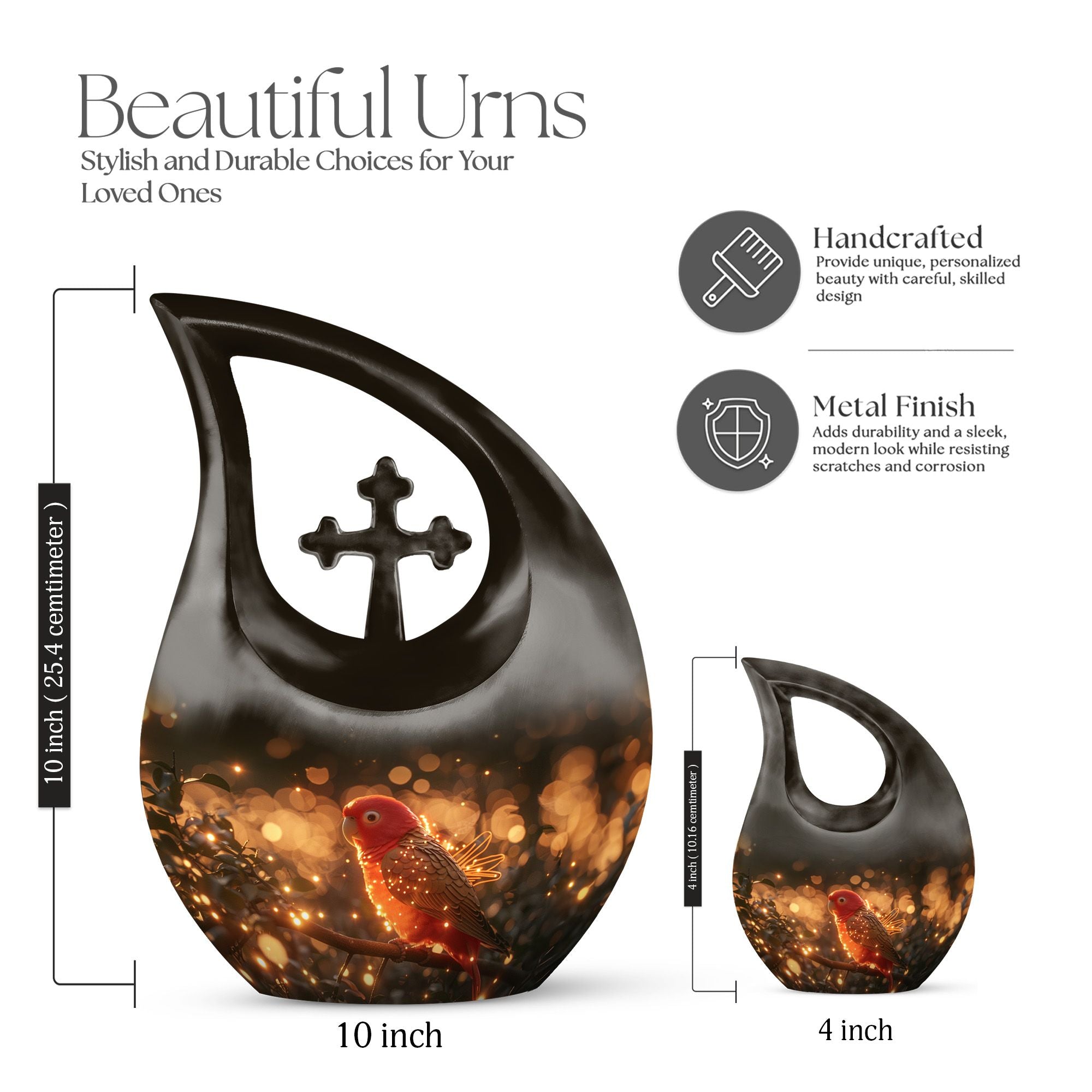 Find peace and solace with our Twilight Ember Wings Urn, thoughtfully designed as an intimate memorial to honor a beloved. This large cremation container, sized at a generous 10 inches and holding a substantial 200 cubic inches of loved one's ashes, is meticulously crafted from durable aluminium, displaying robust quality that ensures its longevity. Its exceptional Cross Drop motif adds a touch of delightful serenity, complementing the peaceful theme of Twilight Ember Wings. Each urn arrives with a tasteful velvet pouch, perfect for keeping the ashes safe and secure. With a weight of 3.3 pounds, it is substantial yet portable, making it easy to place in various locations according to your preference. You may further personalize this one-of-a-kind treasure with engraved names, allowing for a truly unique way to remember. Welcome the Twilight Ember Wings Urn, a choice that melds respect with meaningful symbolism.