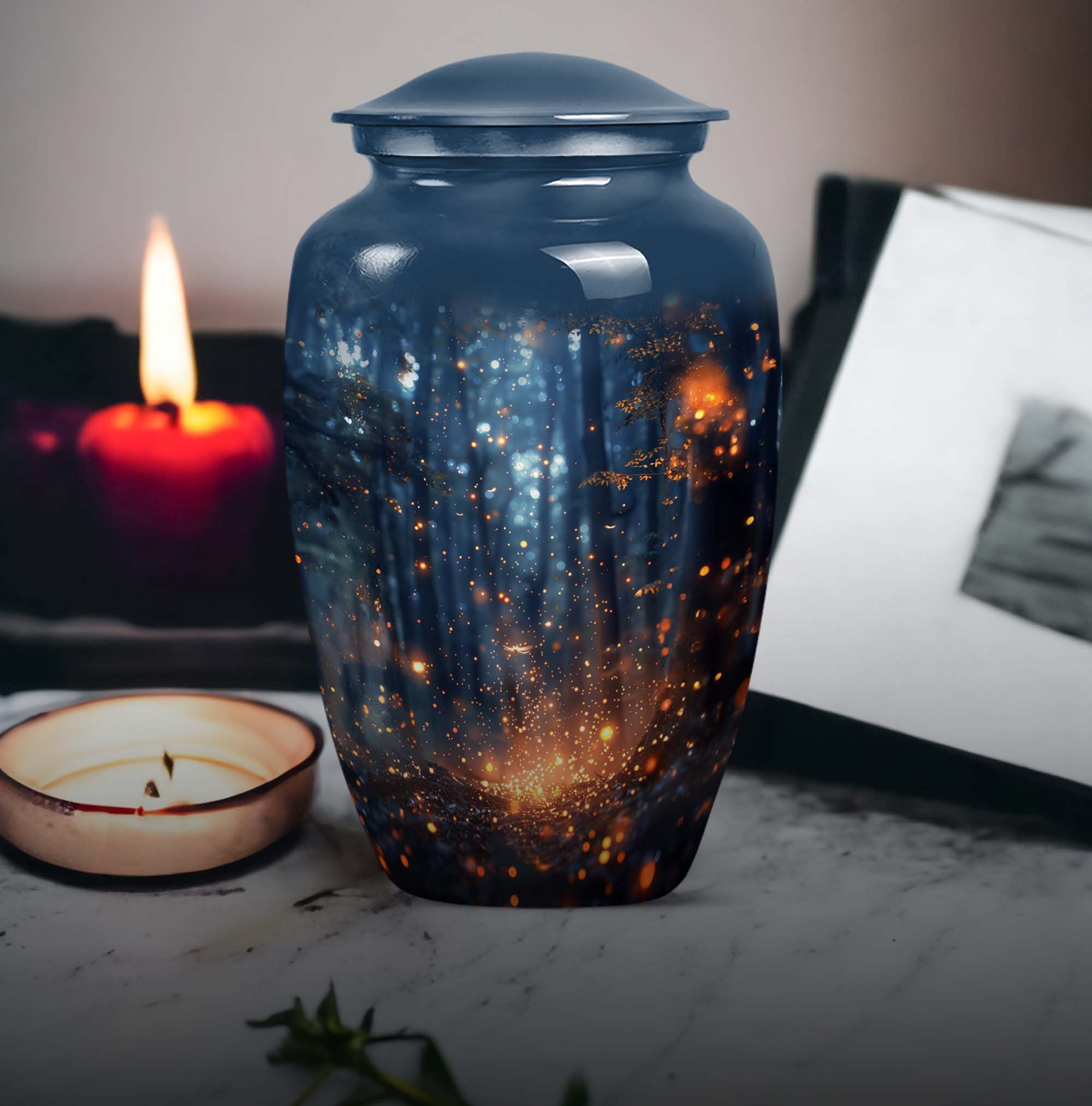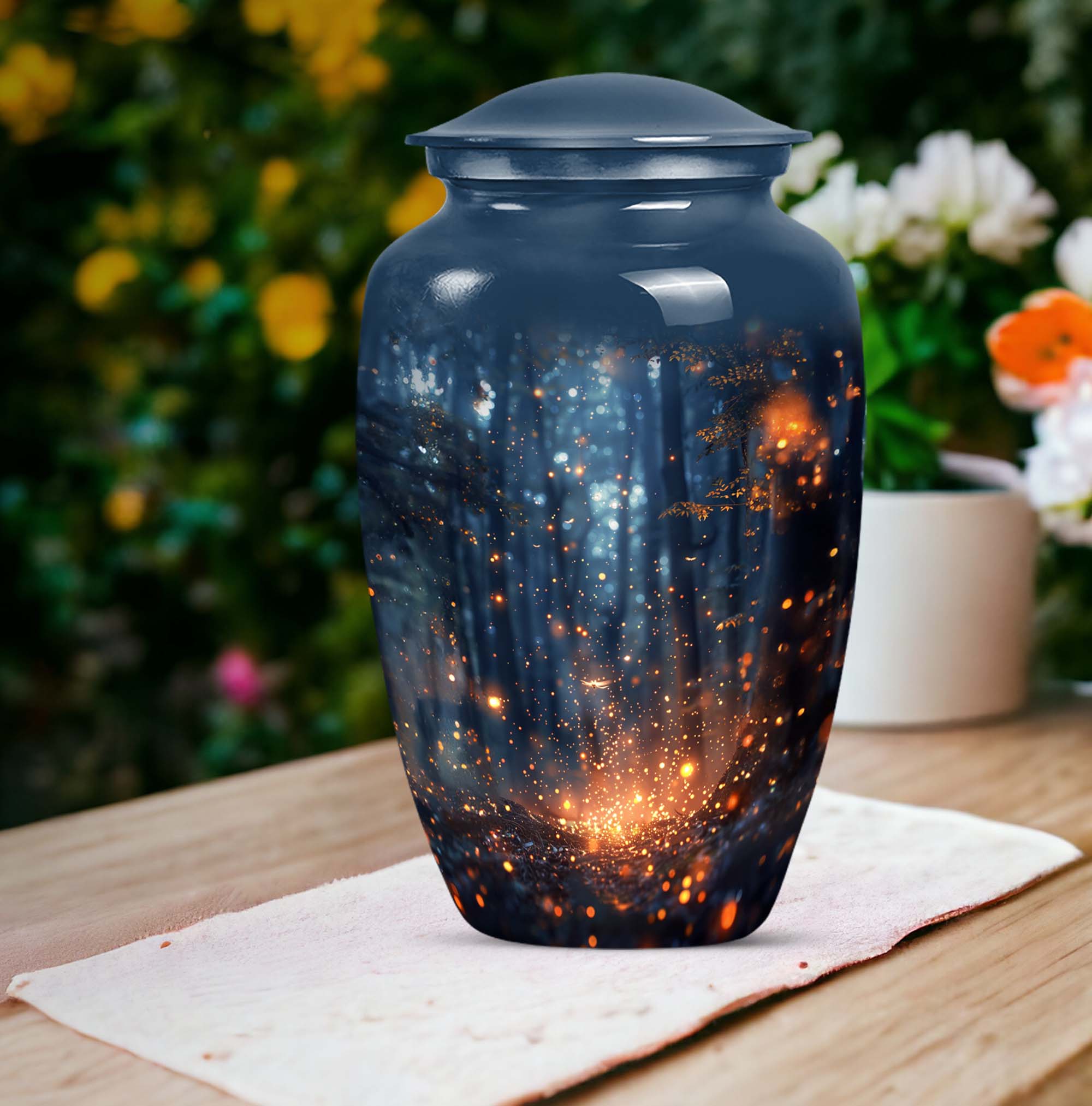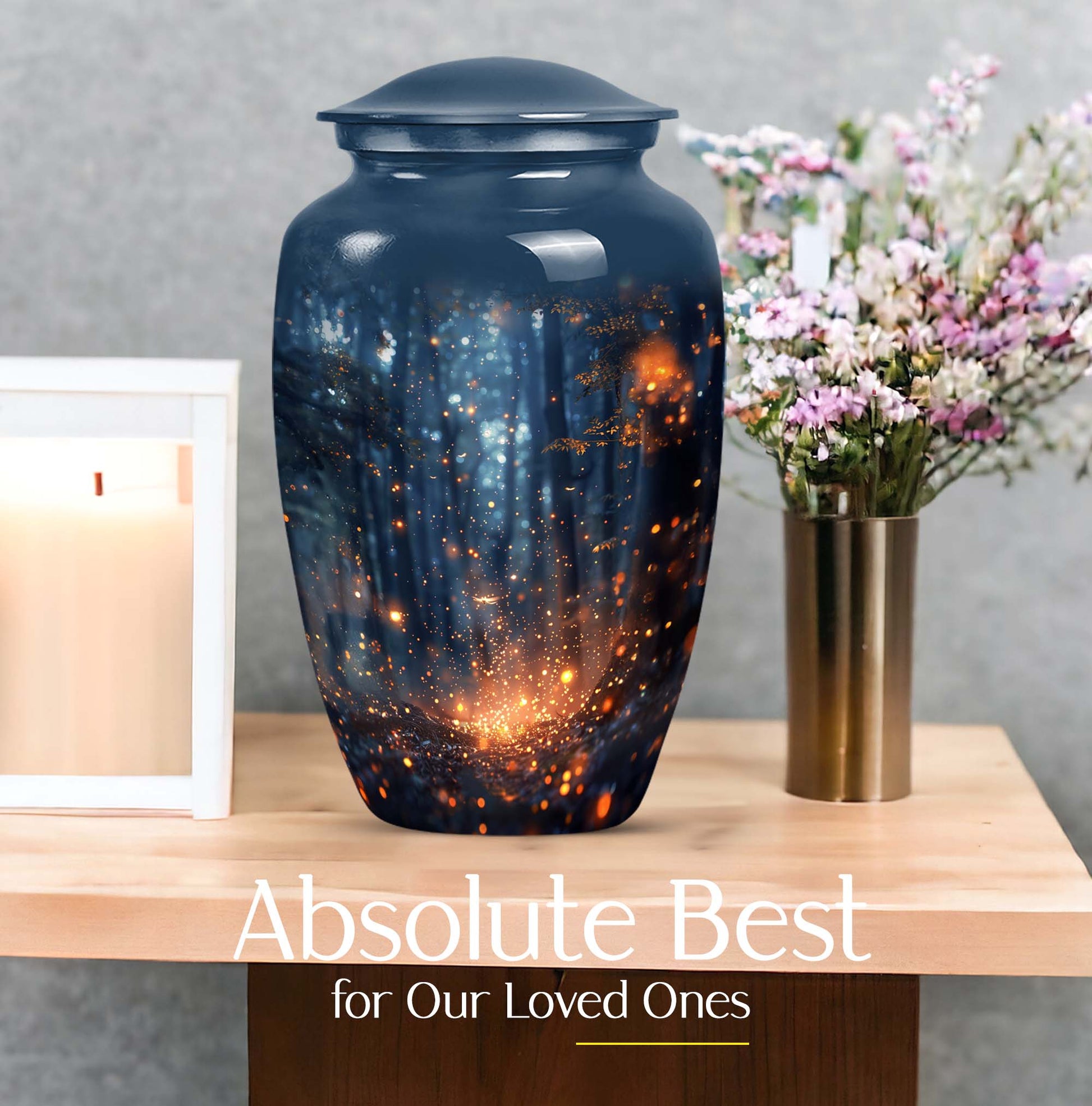 Discover the remarkable craftsmanship embedded in the Twilight Forest Urn, meticulously built for memorial uses. This outstanding funeral urn showcases a classic urn style, imbued with an abstract theme for a unique yet tastefully understated aesthetic. Constructed from resilient Aluminium, this 10-inch large urn stands as a testament of love and reverent tribute to your loved ones. It weighs a sturdy 3.3 pounds, ensuring longevity while maintaining a solemn grace. This burial urns' capacity is amped to hold up to 200 cubic inches of cremation ash, allowing you to preserve in entirety, memories of your cherished ones. The Twilight Forest Urn also offers personal engraving options to further personalize your tribute. It is accompanied by a velvet pouch designed for the dignified containment of ashes. An ideal choice for cremation urns for dad, human adult urns, or adult burial cremation urns.