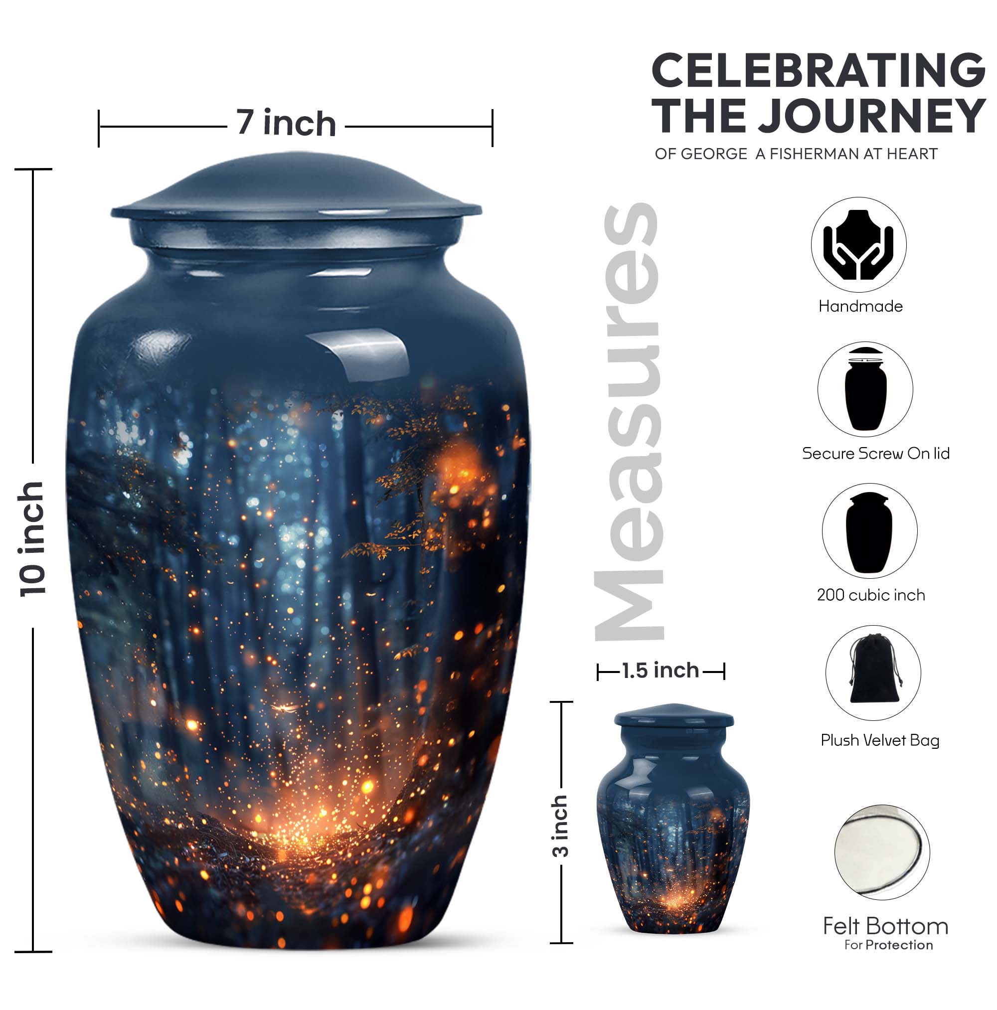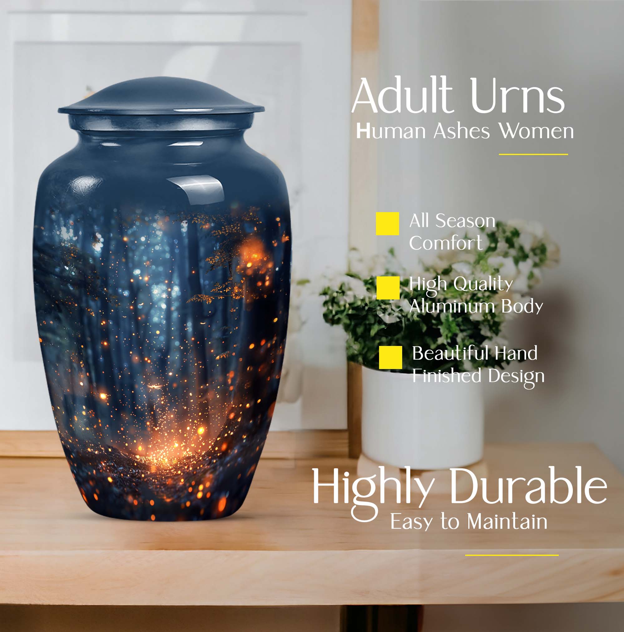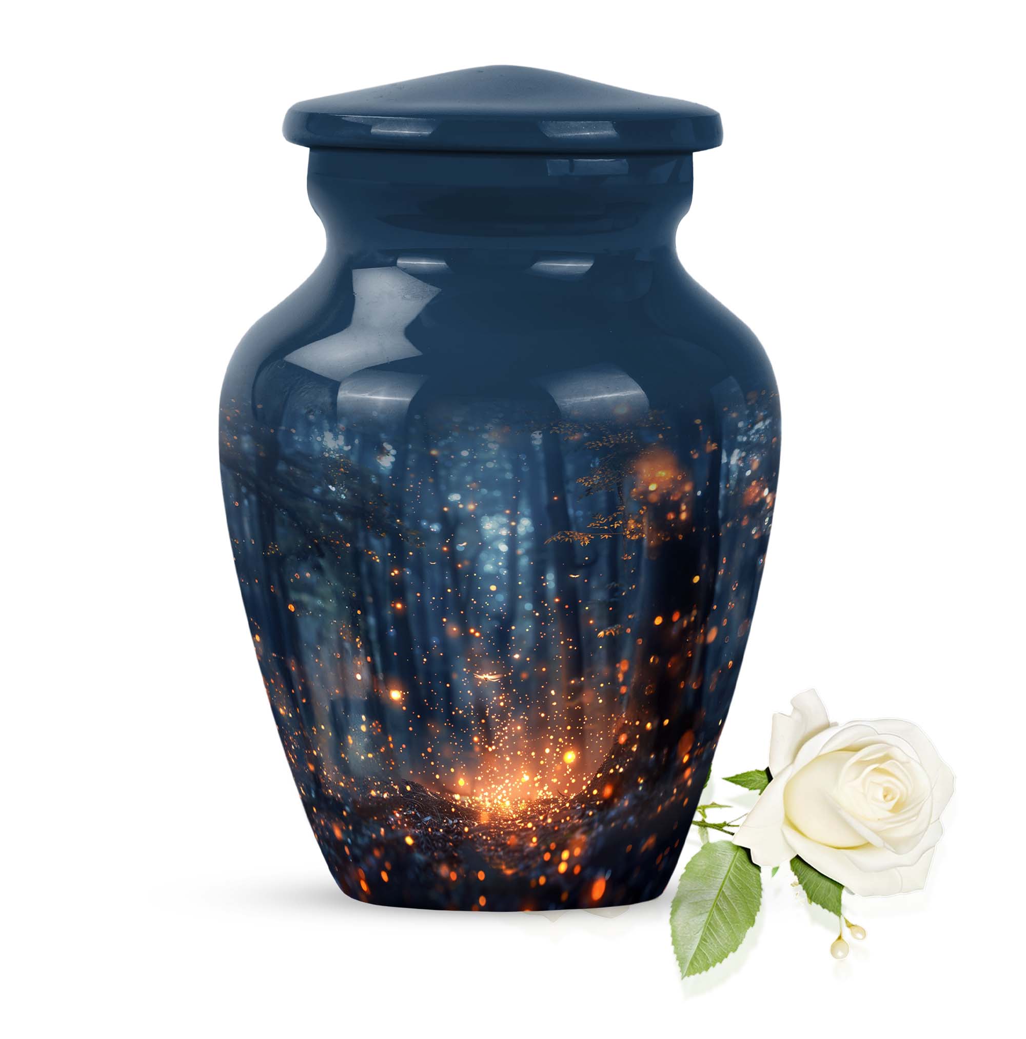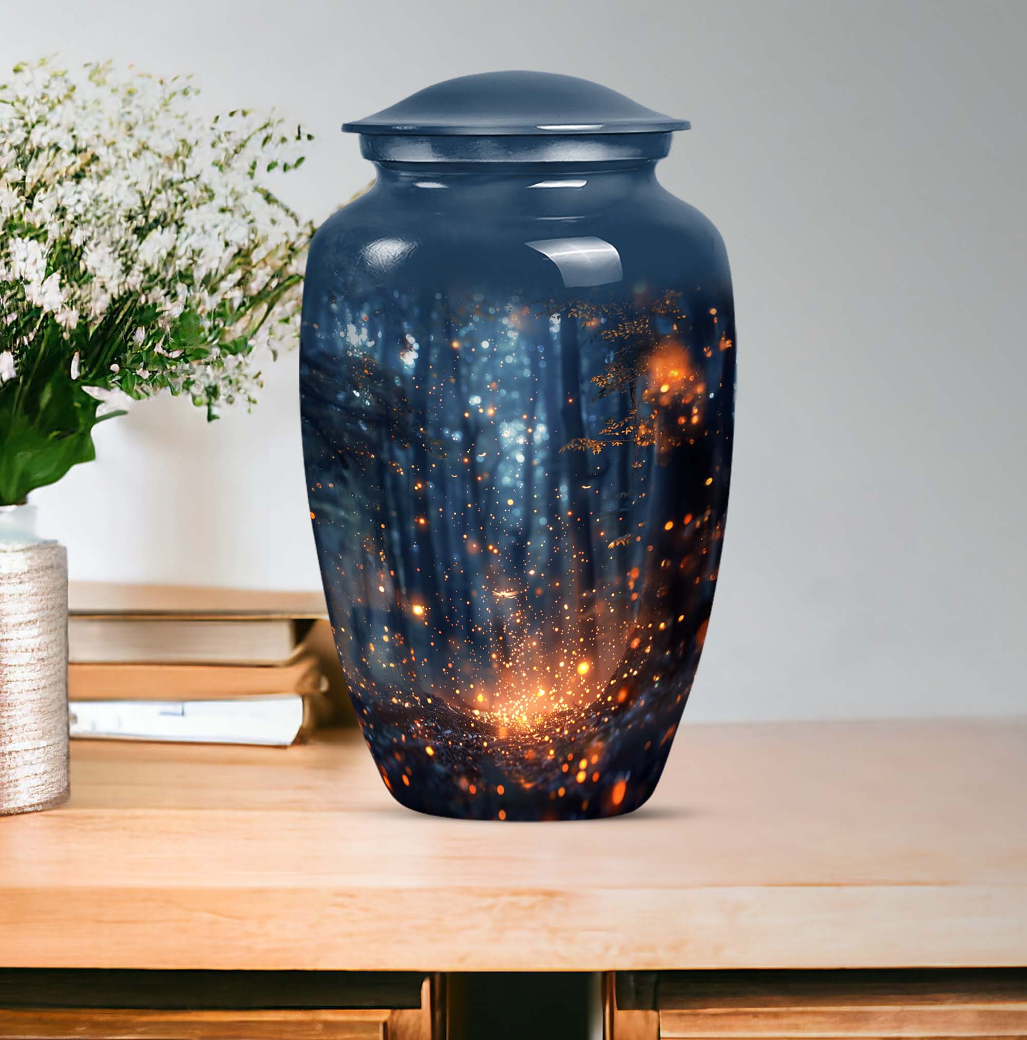 Discover the remarkable craftsmanship embedded in the Twilight Forest Urn, meticulously built for memorial uses. This outstanding funeral urn showcases a classic urn style, imbued with an abstract theme for a unique yet tastefully understated aesthetic. Constructed from resilient Aluminium, this 10-inch large urn stands as a testament of love and reverent tribute to your loved ones. It weighs a sturdy 3.3 pounds, ensuring longevity while maintaining a solemn grace. This burial urns' capacity is amped to hold up to 200 cubic inches of cremation ash, allowing you to preserve in entirety, memories of your cherished ones. The Twilight Forest Urn also offers personal engraving options to further personalize your tribute. It is accompanied by a velvet pouch designed for the dignified containment of ashes. An ideal choice for cremation urns for dad, human adult urns, or adult burial cremation urns.