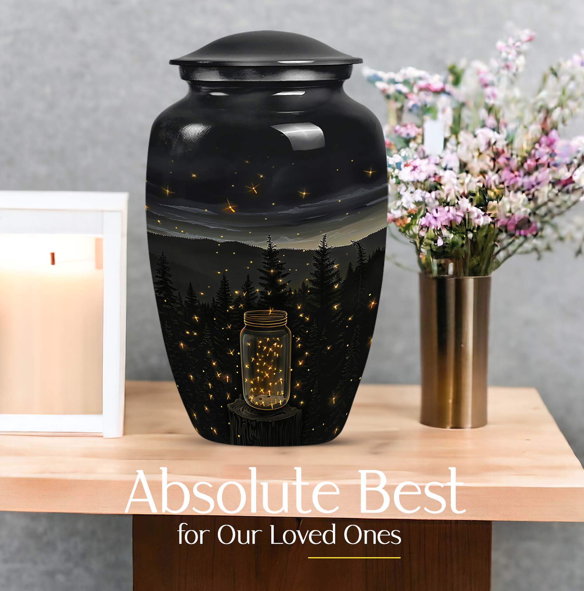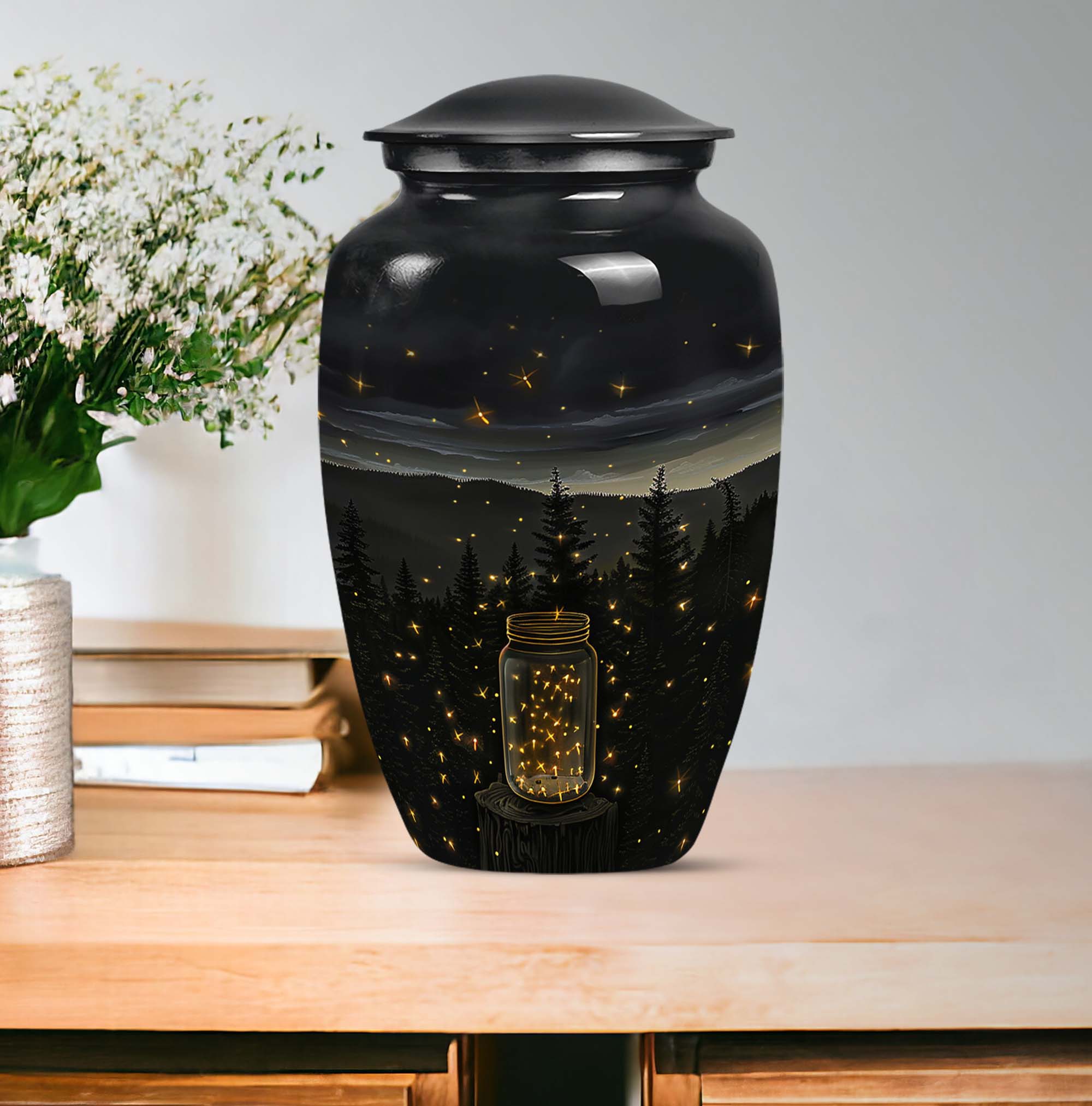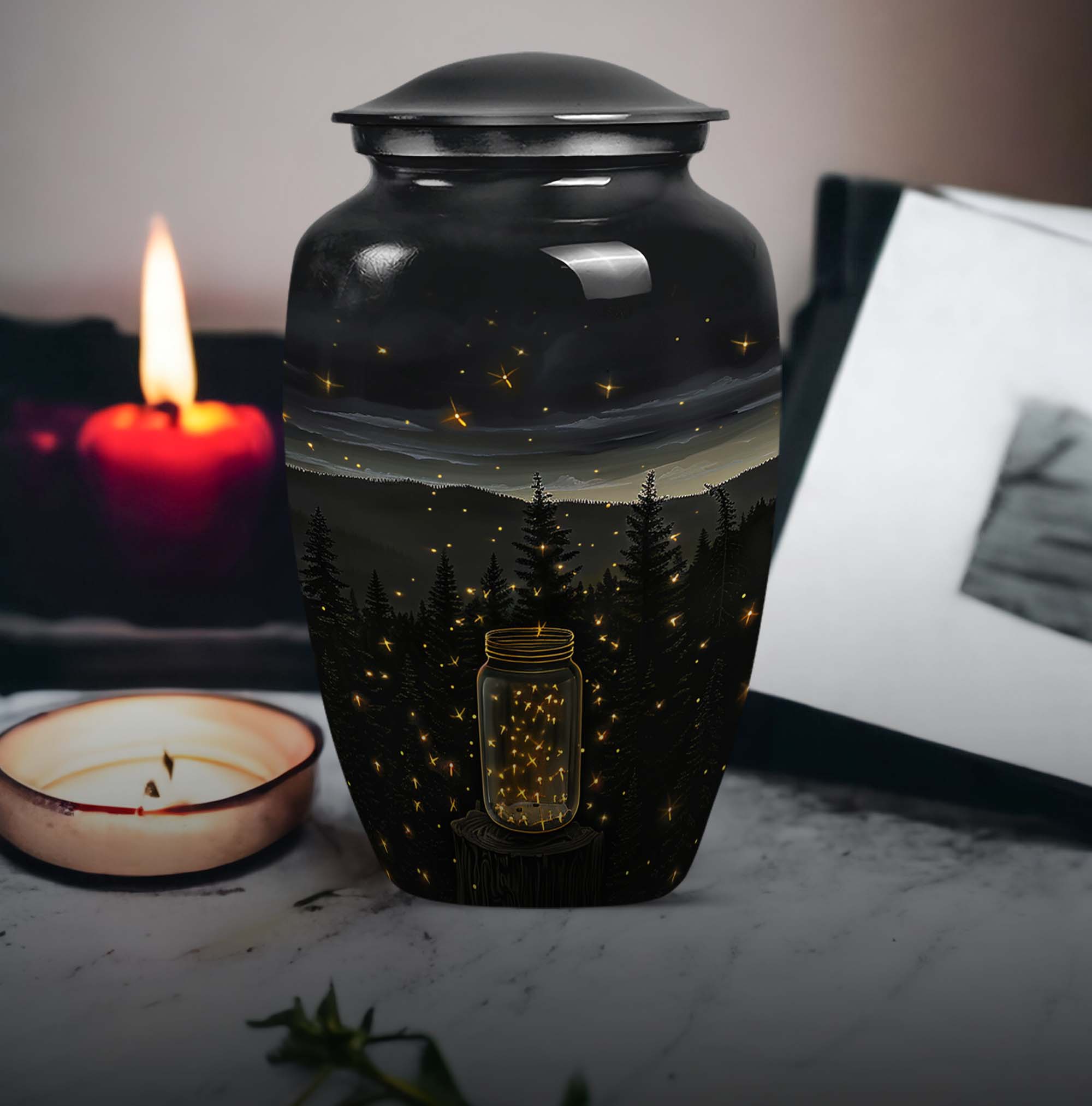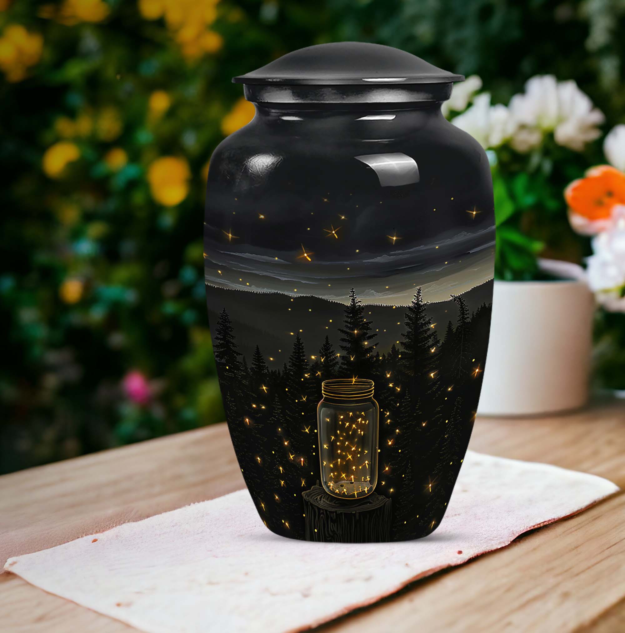 Encapsulate the lasting memory of your loved beloved ones with our Twilight Forest Urn, a significant piece of funeral merchandise designed for an adult male father. With a capacious measurement of 200 cubic inches, this 10-inch cremation urn is noteworthy for its resolute aluminium material, ensuring long-term durability and maintaining the memorial's solemnity. Weighing 3.3 pounds with a height of 10 inches, it's large enough to accommodate and protect the ashes, accessories, and keepsakes in a respectful manner. The urn's abstract theme conjures a dynamic perspective on life and death through its unique, non-conformist visualization. This cremation urn comes with an additional velvet pouch, providing a gentler environment for the containment of ashes, which intensifies the emotional connection and preserves the artifacts. Furthermore, we welcome personal customization, such as engraved names to add a personal touch to this memorial. Notably, this Twilight Forest Urn also fits the keywords: memorial urns for mom, cremation urn for a woman, and urns for cremation ashes, broadening its relevance to potential search queries.