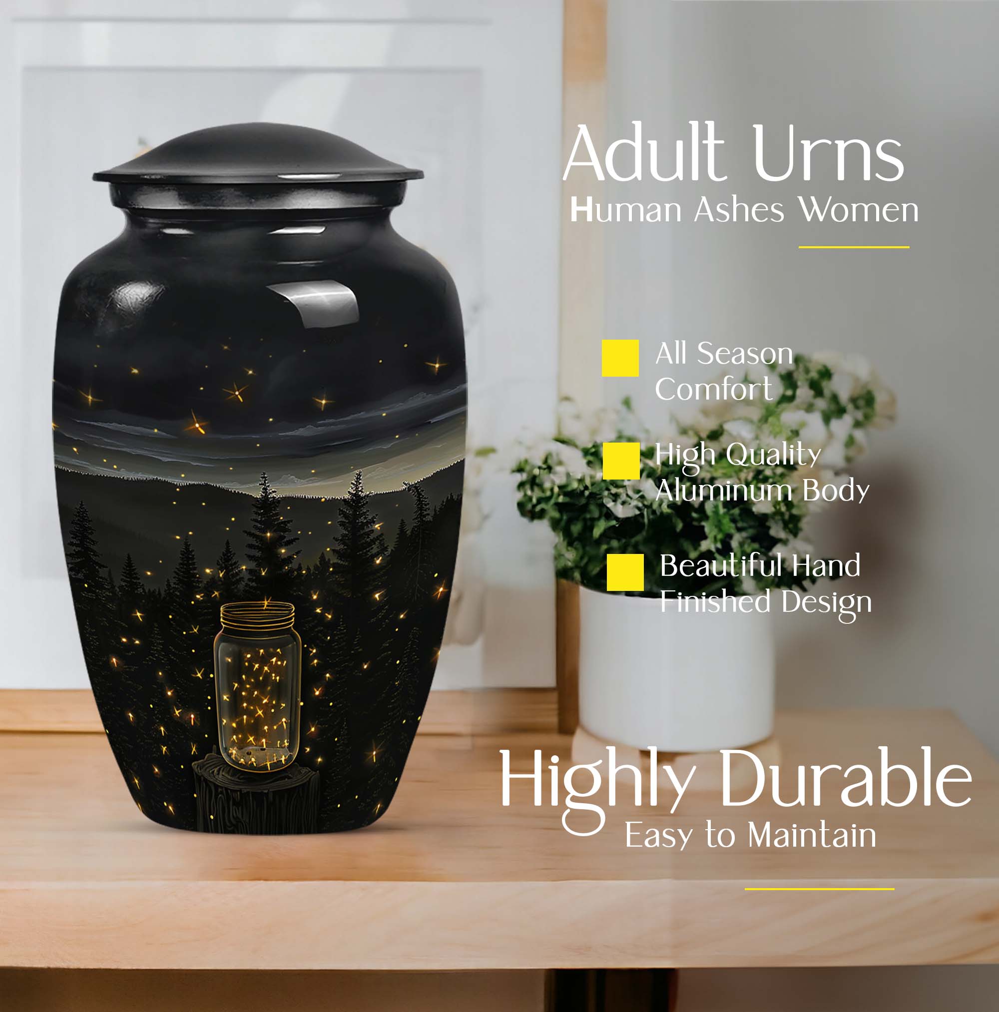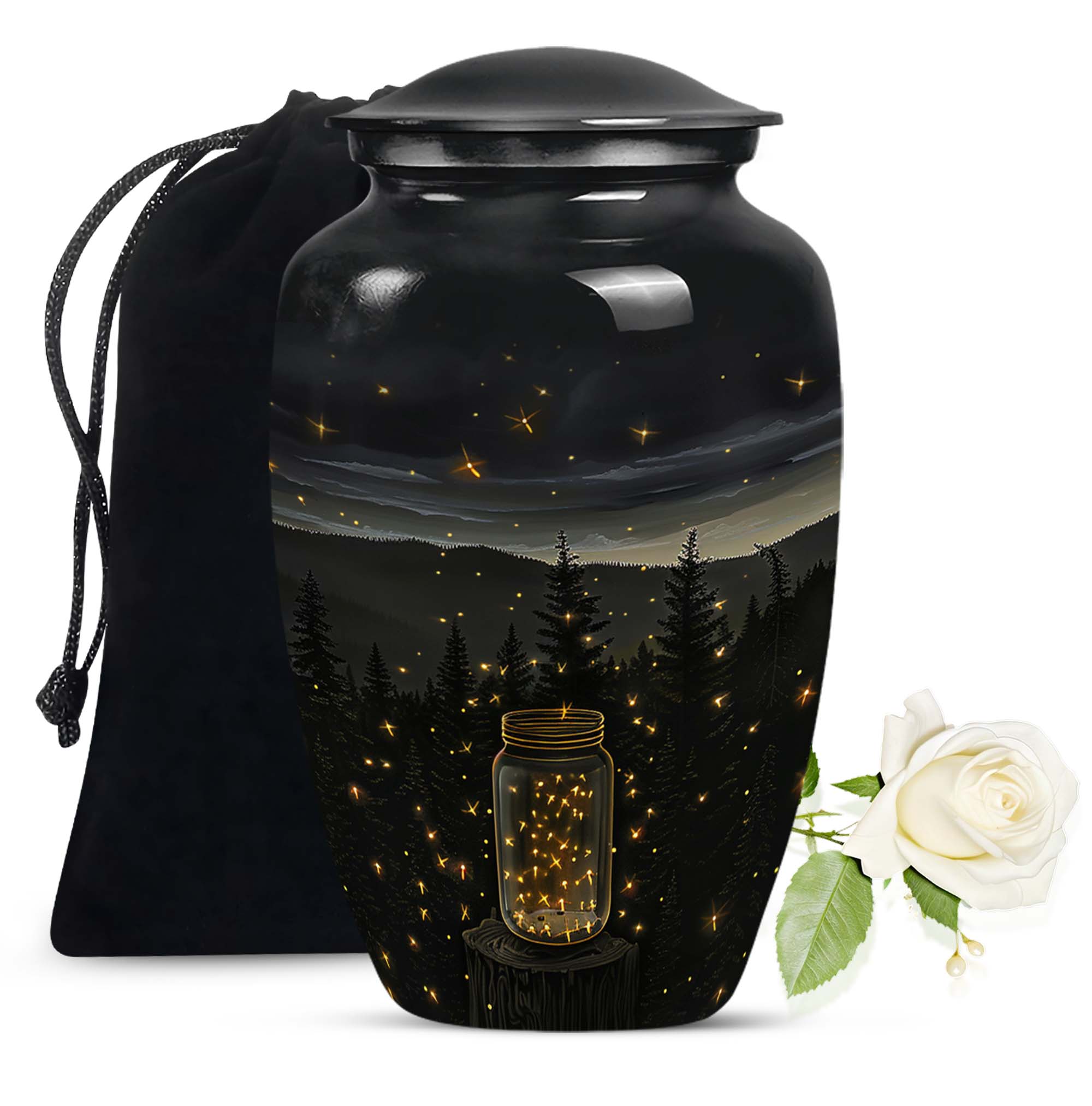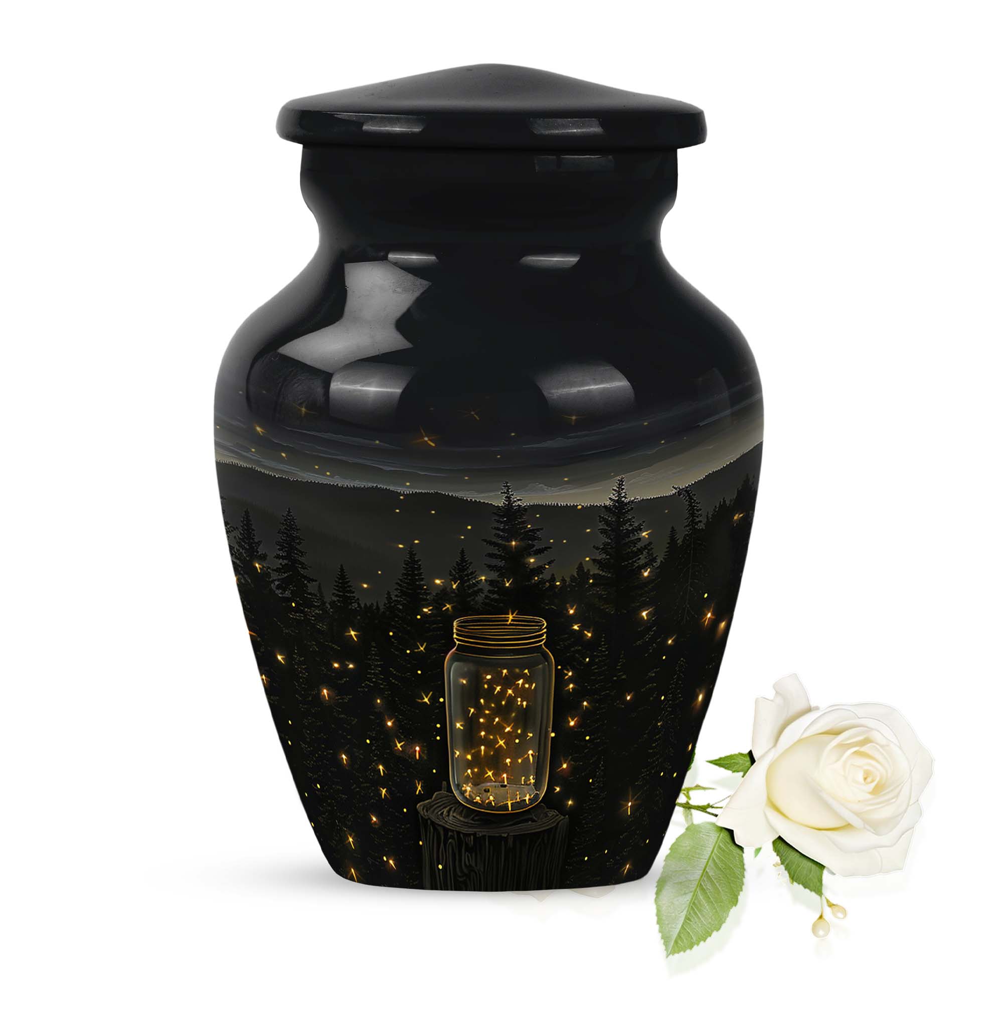 Encapsulate the lasting memory of your loved beloved ones with our Twilight Forest Urn, a significant piece of funeral merchandise designed for an adult male father. With a capacious measurement of 200 cubic inches, this 10-inch cremation urn is noteworthy for its resolute aluminium material, ensuring long-term durability and maintaining the memorial's solemnity. Weighing 3.3 pounds with a height of 10 inches, it's large enough to accommodate and protect the ashes, accessories, and keepsakes in a respectful manner. The urn's abstract theme conjures a dynamic perspective on life and death through its unique, non-conformist visualization. This cremation urn comes with an additional velvet pouch, providing a gentler environment for the containment of ashes, which intensifies the emotional connection and preserves the artifacts. Furthermore, we welcome personal customization, such as engraved names to add a personal touch to this memorial. Notably, this Twilight Forest Urn also fits the keywords: memorial urns for mom, cremation urn for a woman, and urns for cremation ashes, broadening its relevance to potential search queries.