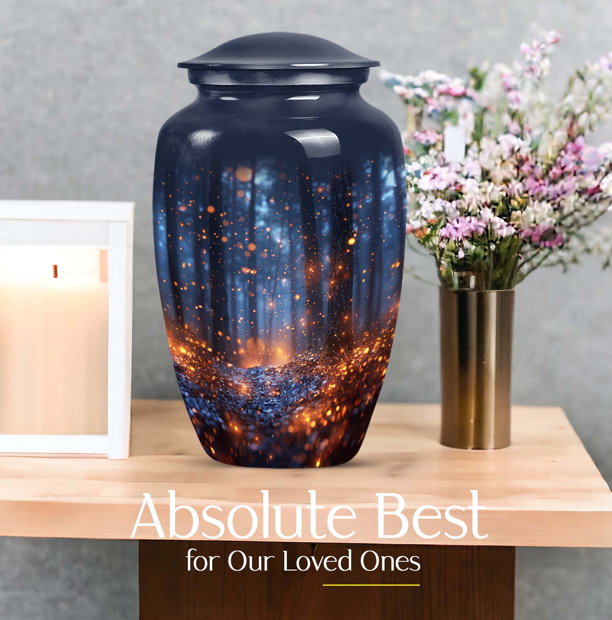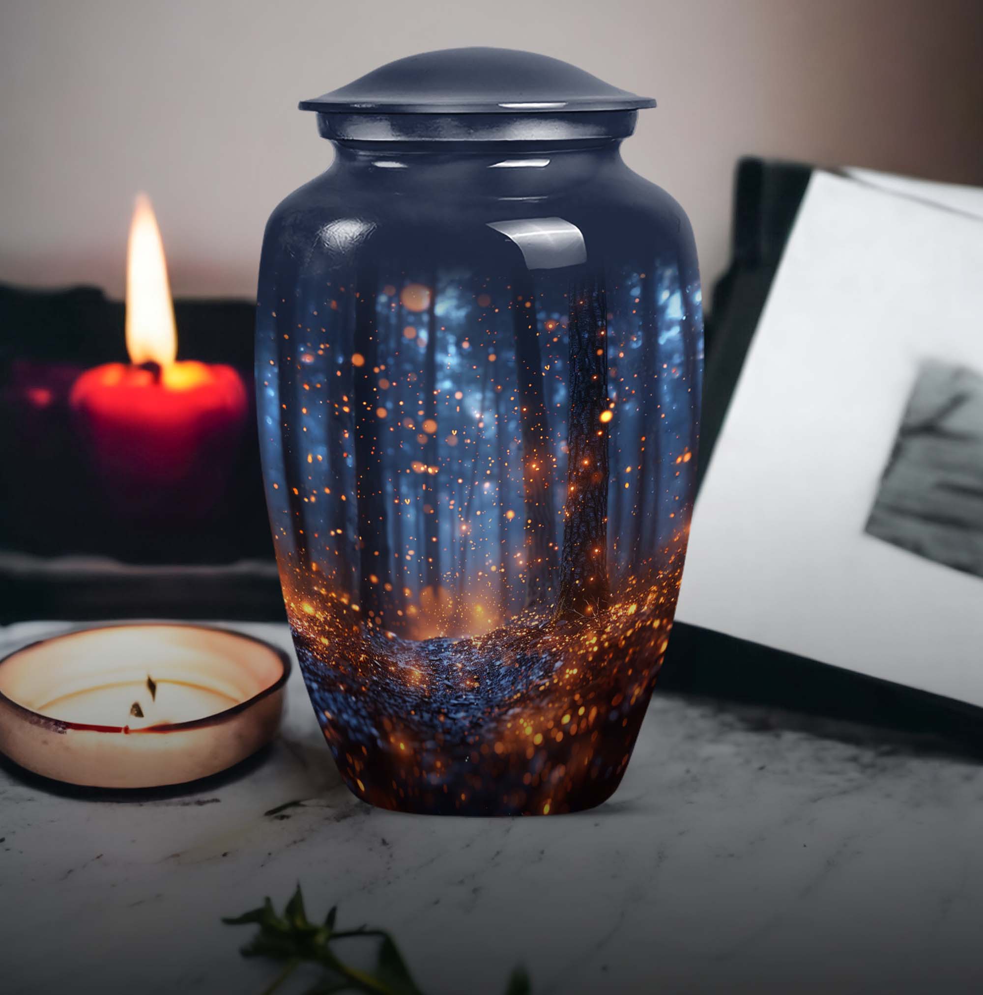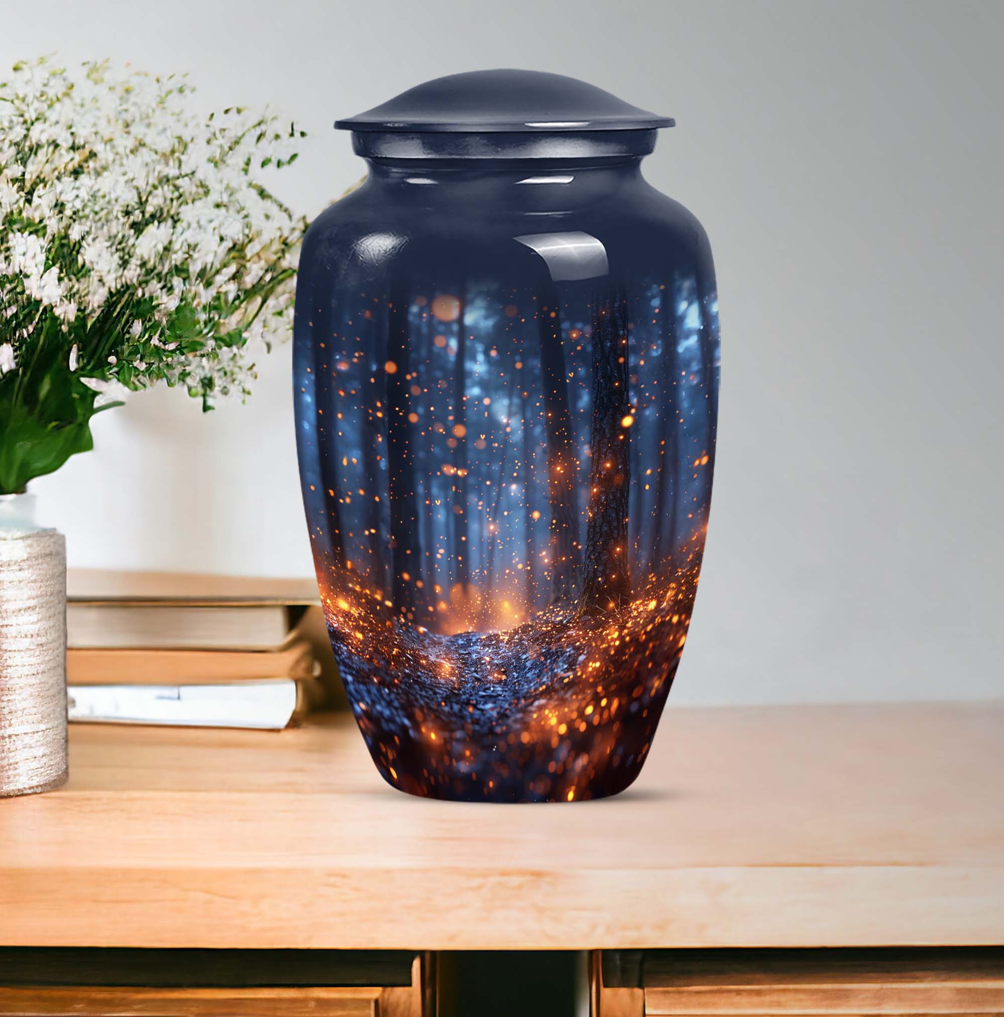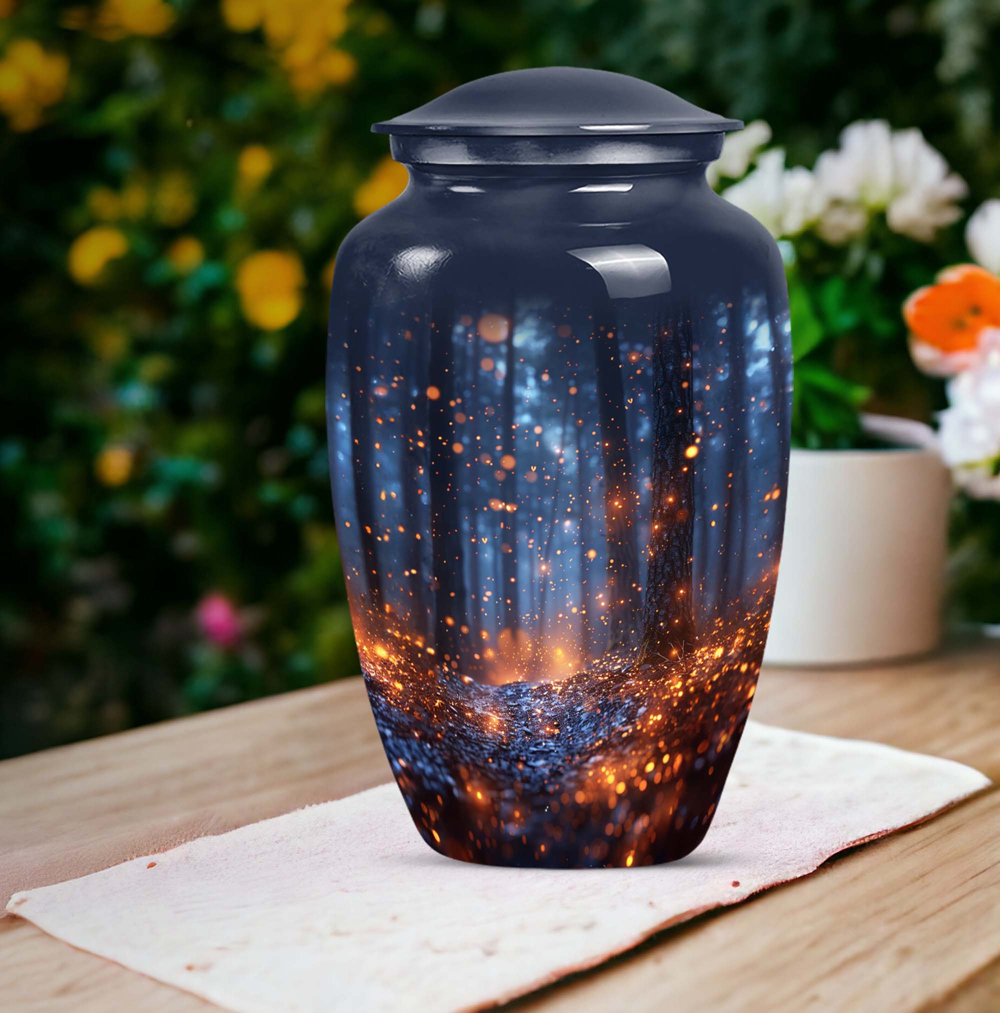 Discover our Twilight Forest Urn, a refined piece from our selection of cremation urns for men. Skilfully crafted, this large urn stands 10 inches in height and weighs a sturdy 3.3 pounds. Made from high-grade aluminium for maximum durability, the urn exhibits an abstract theme echoing the eternal and the ethereal in its design. With its sizeable capacity of 200 cubic inches, this urn can comfortably hold ashes from either one or two adults. Included in the package is a velvet pouch to hold the ashes. Our customization option allows you to personalize the urn with engraved names, offering a unique way to remember your loved ones. This makes our Twilight Forest Urn an ideal choice for those searching for 'memorial urns' or 'urn for human ashes adult men'. It tastefully meets the needs of those who desire a more substantial conversation piece that peacefully commemorates their loved ones.