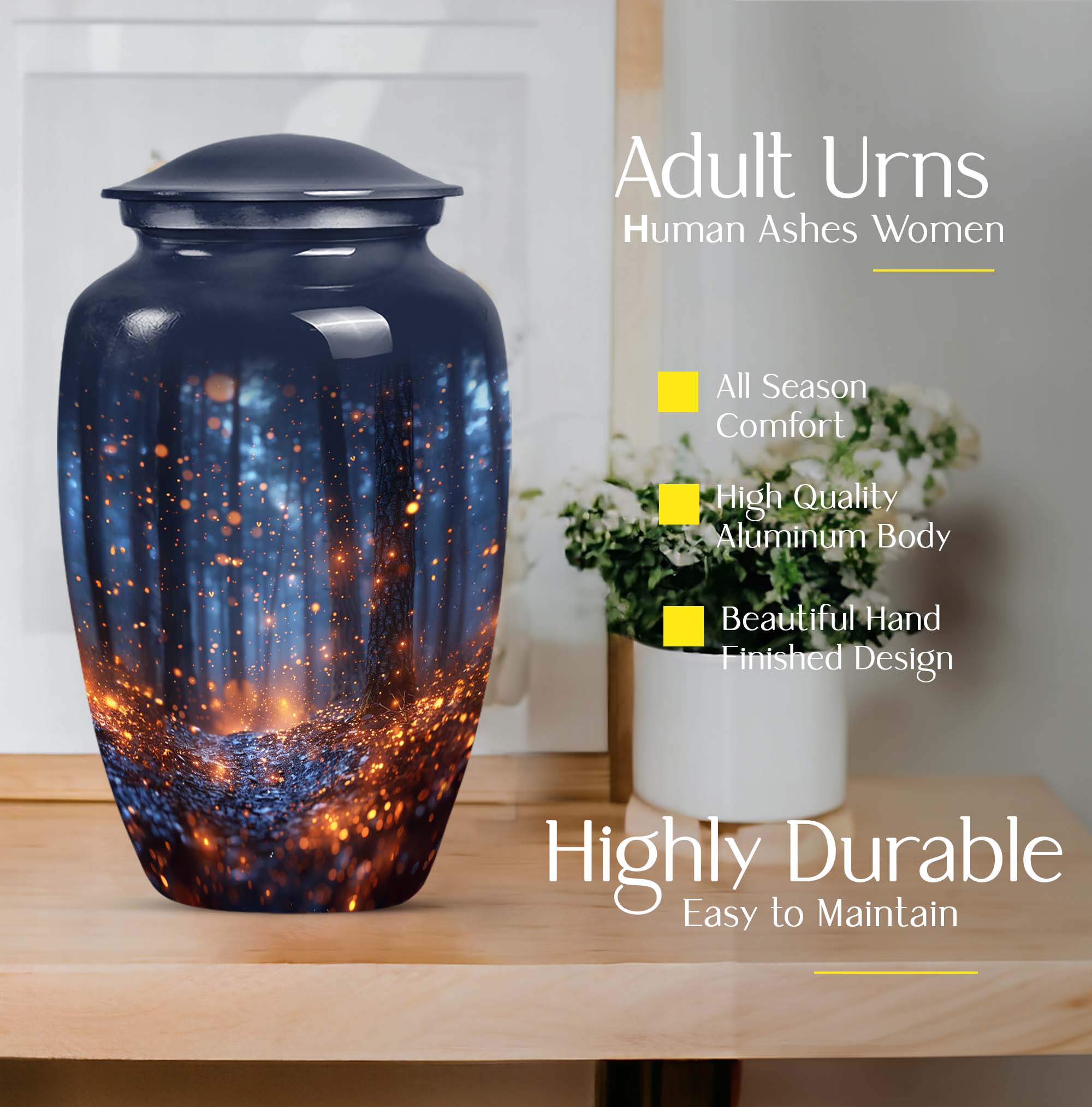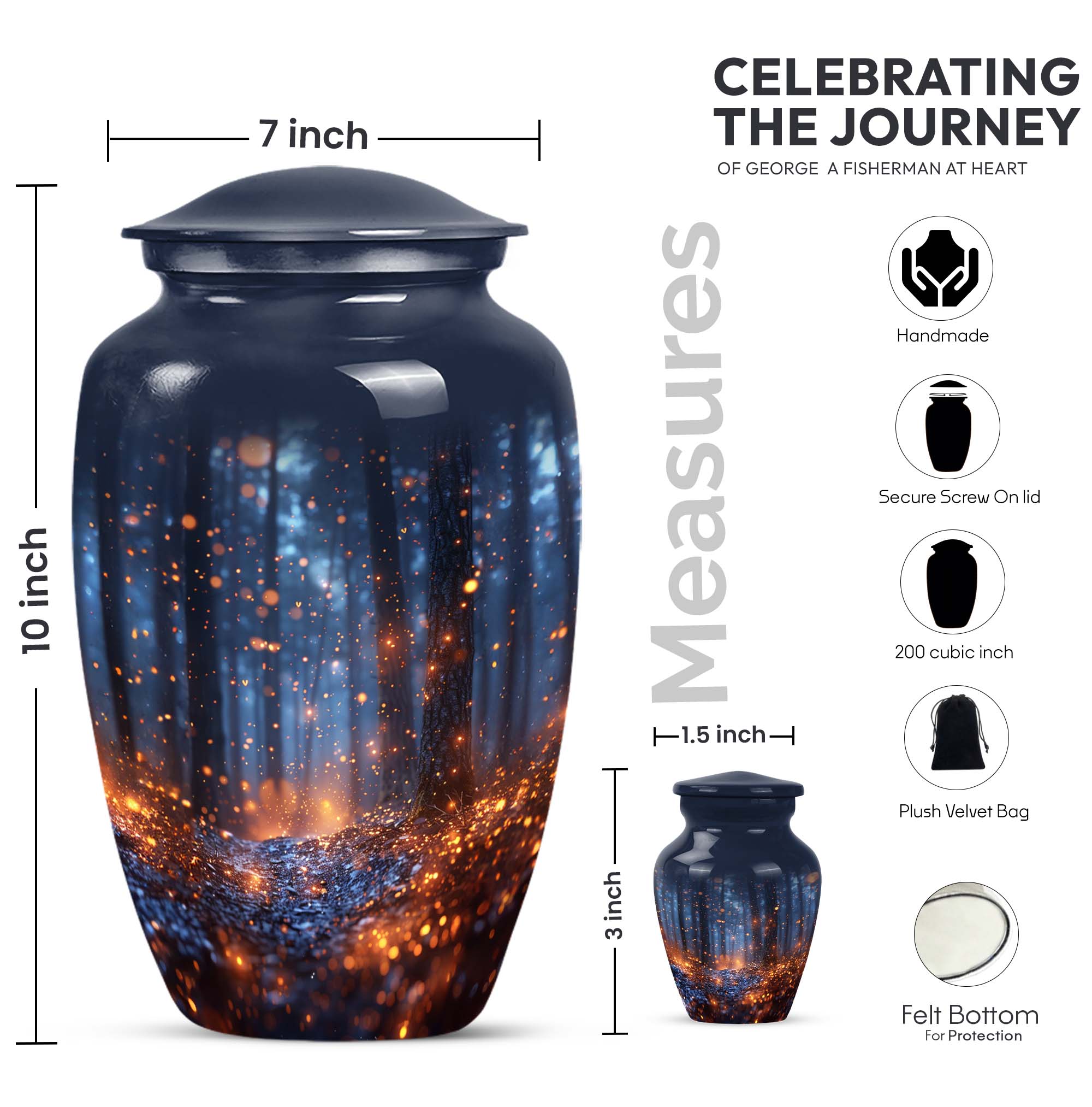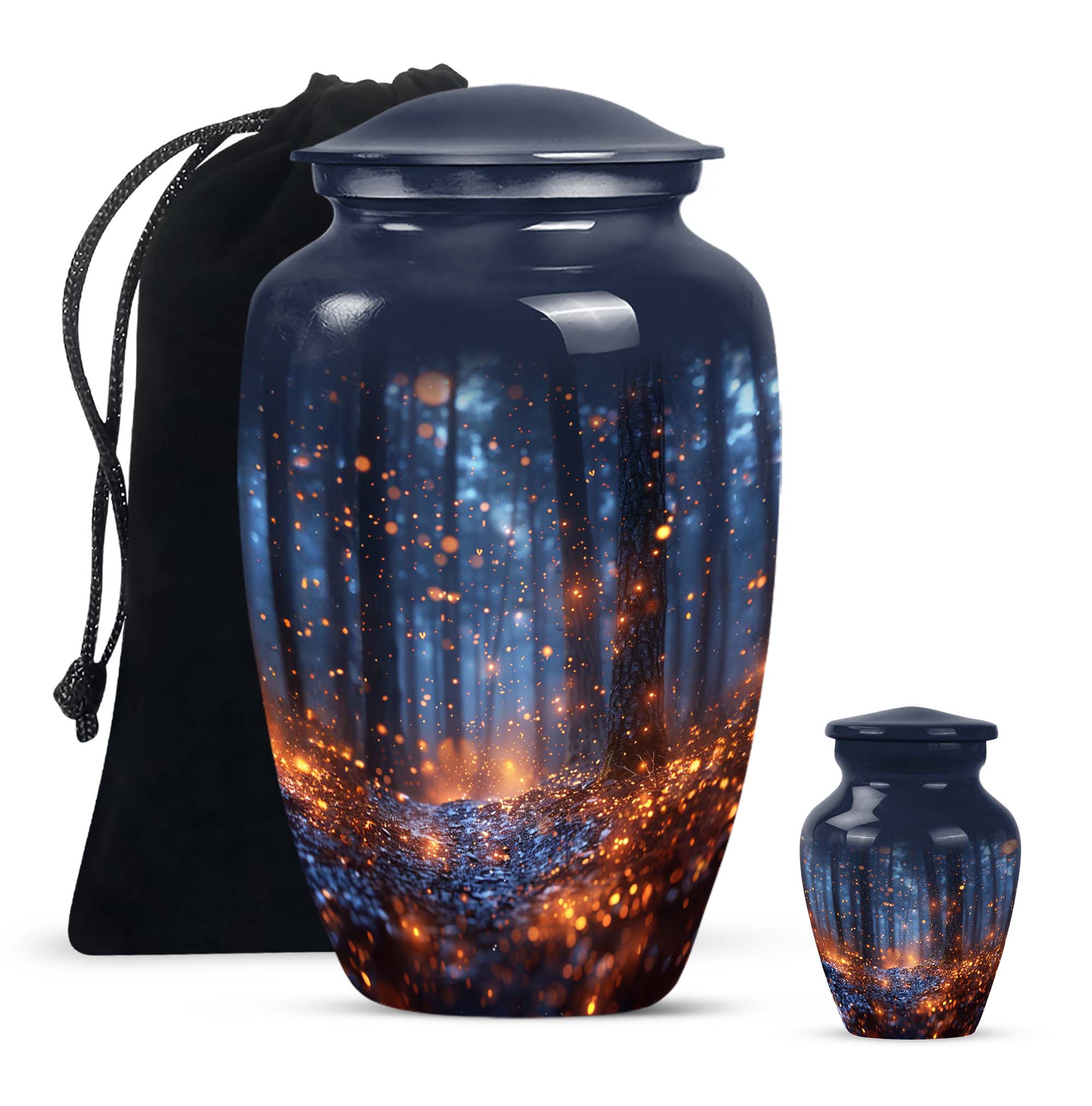 Discover our Twilight Forest Urn, a refined piece from our selection of cremation urns for men. Skilfully crafted, this large urn stands 10 inches in height and weighs a sturdy 3.3 pounds. Made from high-grade aluminium for maximum durability, the urn exhibits an abstract theme echoing the eternal and the ethereal in its design. With its sizeable capacity of 200 cubic inches, this urn can comfortably hold ashes from either one or two adults. Included in the package is a velvet pouch to hold the ashes. Our customization option allows you to personalize the urn with engraved names, offering a unique way to remember your loved ones. This makes our Twilight Forest Urn an ideal choice for those searching for 'memorial urns' or 'urn for human ashes adult men'. It tastefully meets the needs of those who desire a more substantial conversation piece that peacefully commemorates their loved ones.