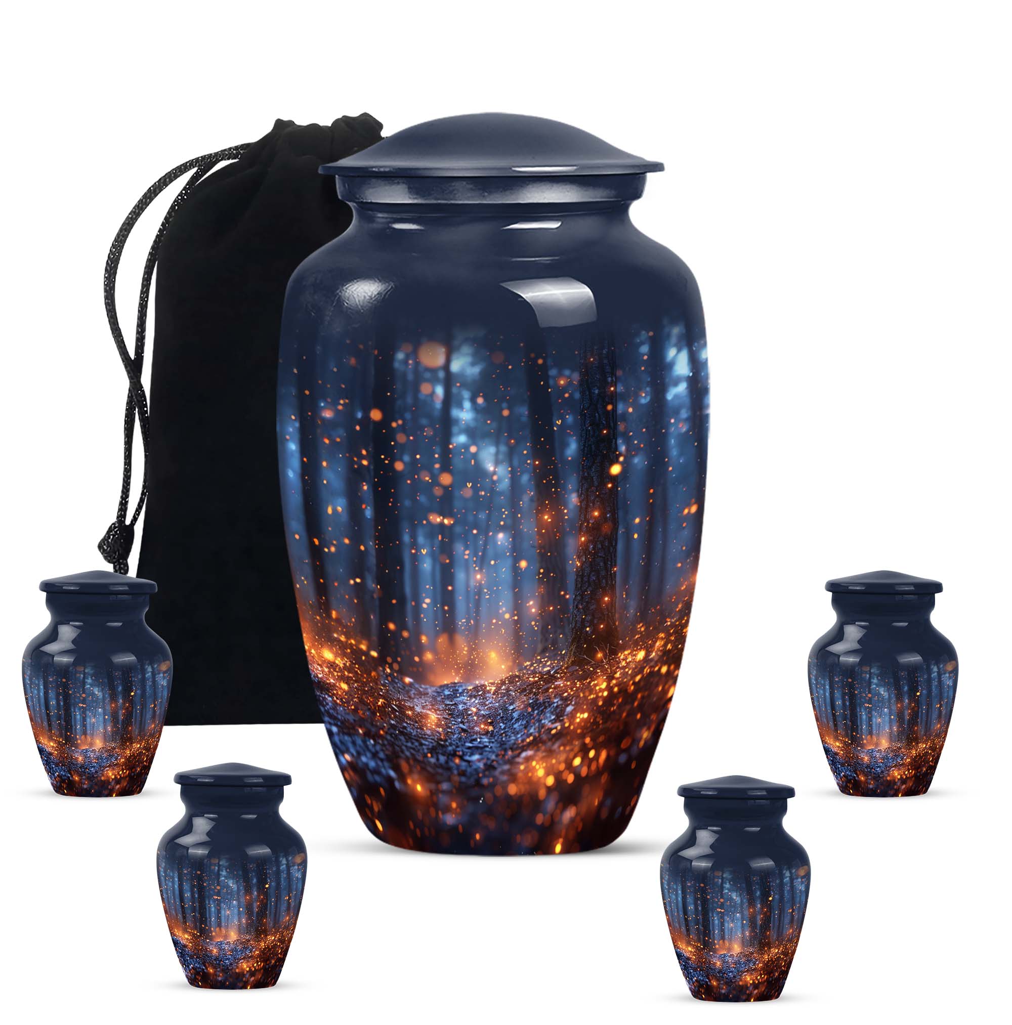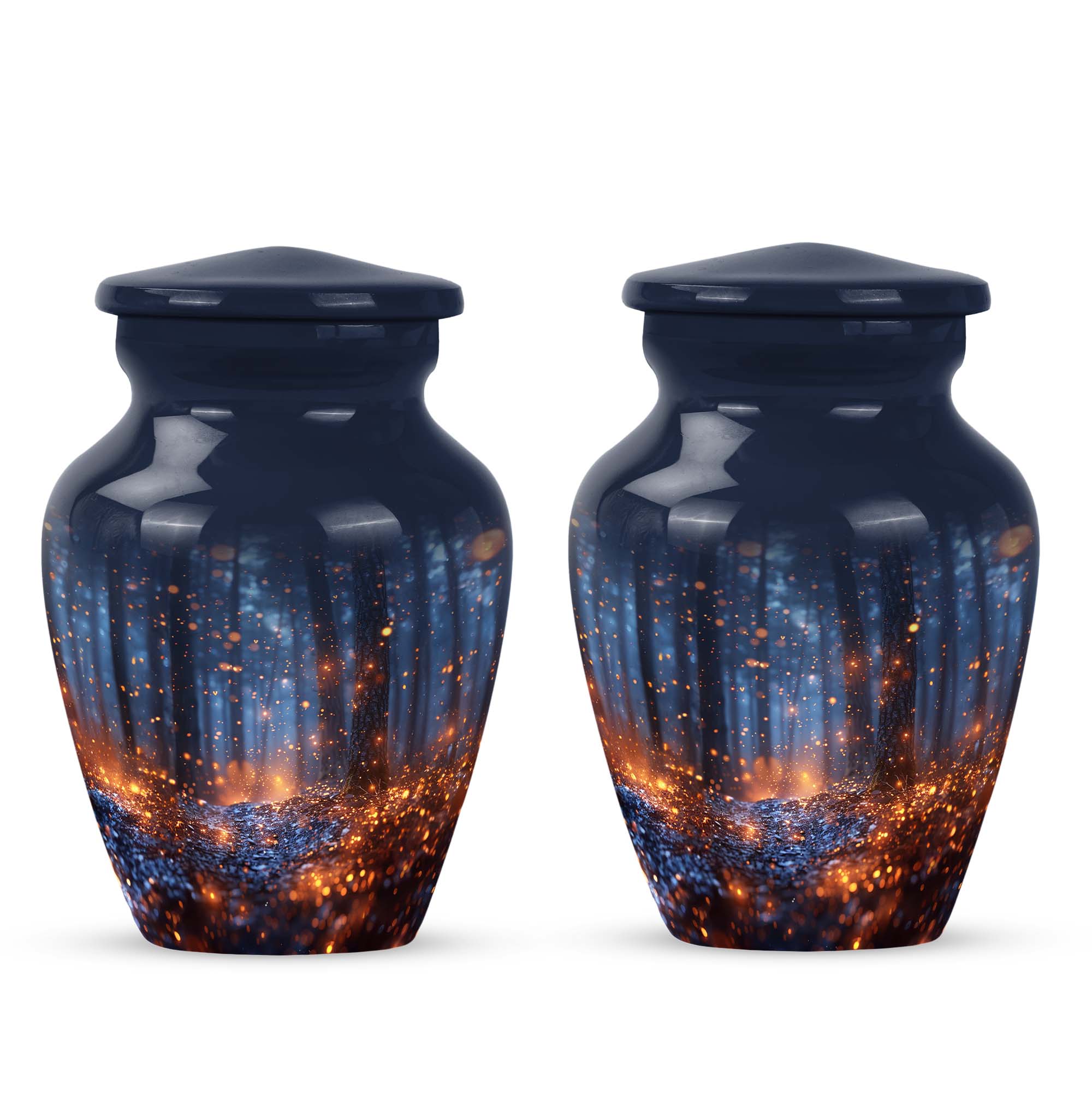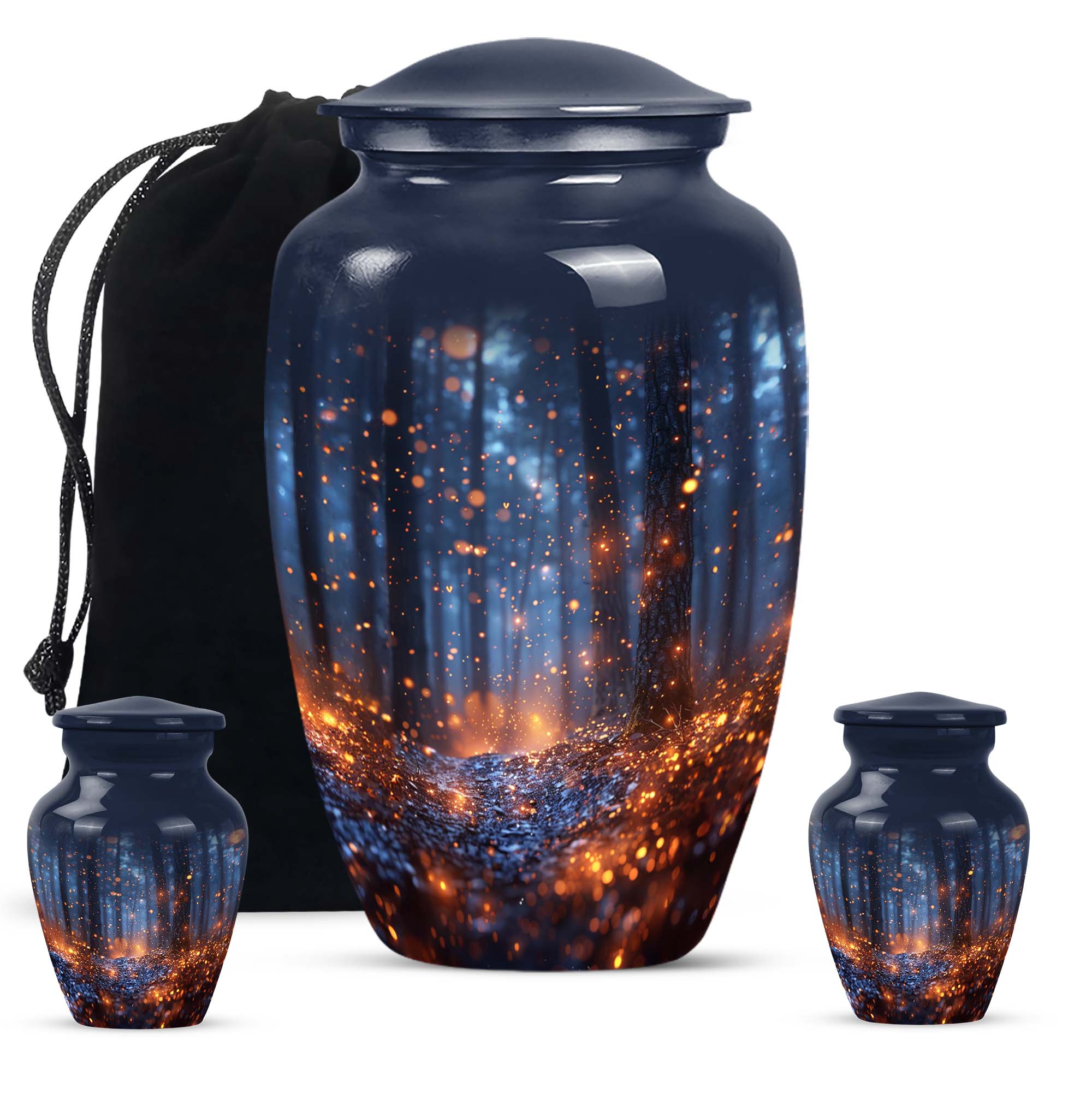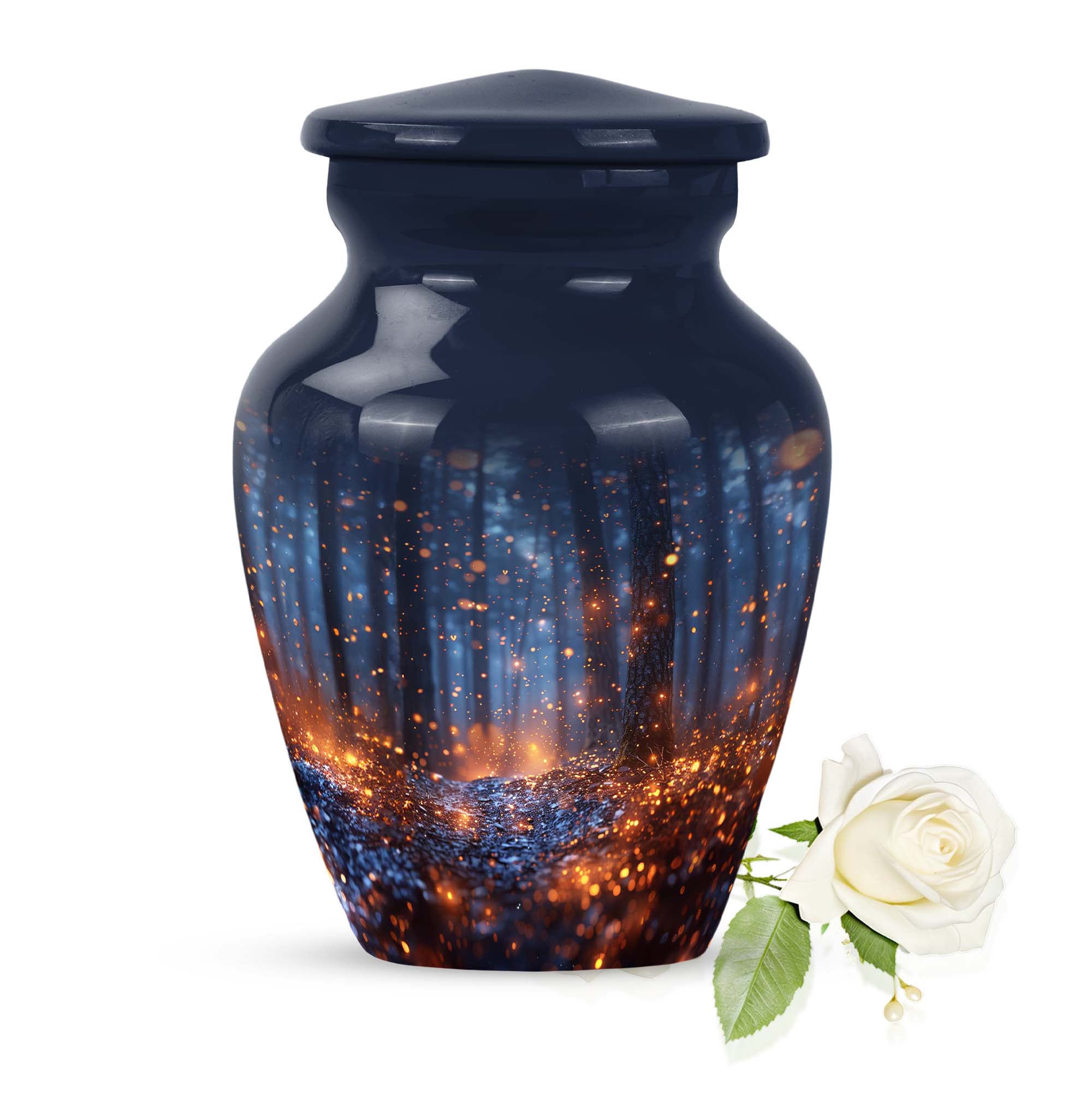 Discover our Twilight Forest Urn, a refined piece from our selection of cremation urns for men. Skilfully crafted, this large urn stands 10 inches in height and weighs a sturdy 3.3 pounds. Made from high-grade aluminium for maximum durability, the urn exhibits an abstract theme echoing the eternal and the ethereal in its design. With its sizeable capacity of 200 cubic inches, this urn can comfortably hold ashes from either one or two adults. Included in the package is a velvet pouch to hold the ashes. Our customization option allows you to personalize the urn with engraved names, offering a unique way to remember your loved ones. This makes our Twilight Forest Urn an ideal choice for those searching for 'memorial urns' or 'urn for human ashes adult men'. It tastefully meets the needs of those who desire a more substantial conversation piece that peacefully commemorates their loved ones.