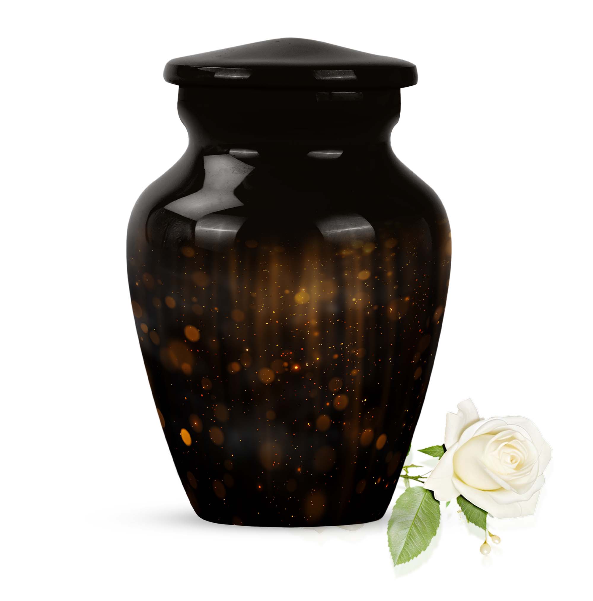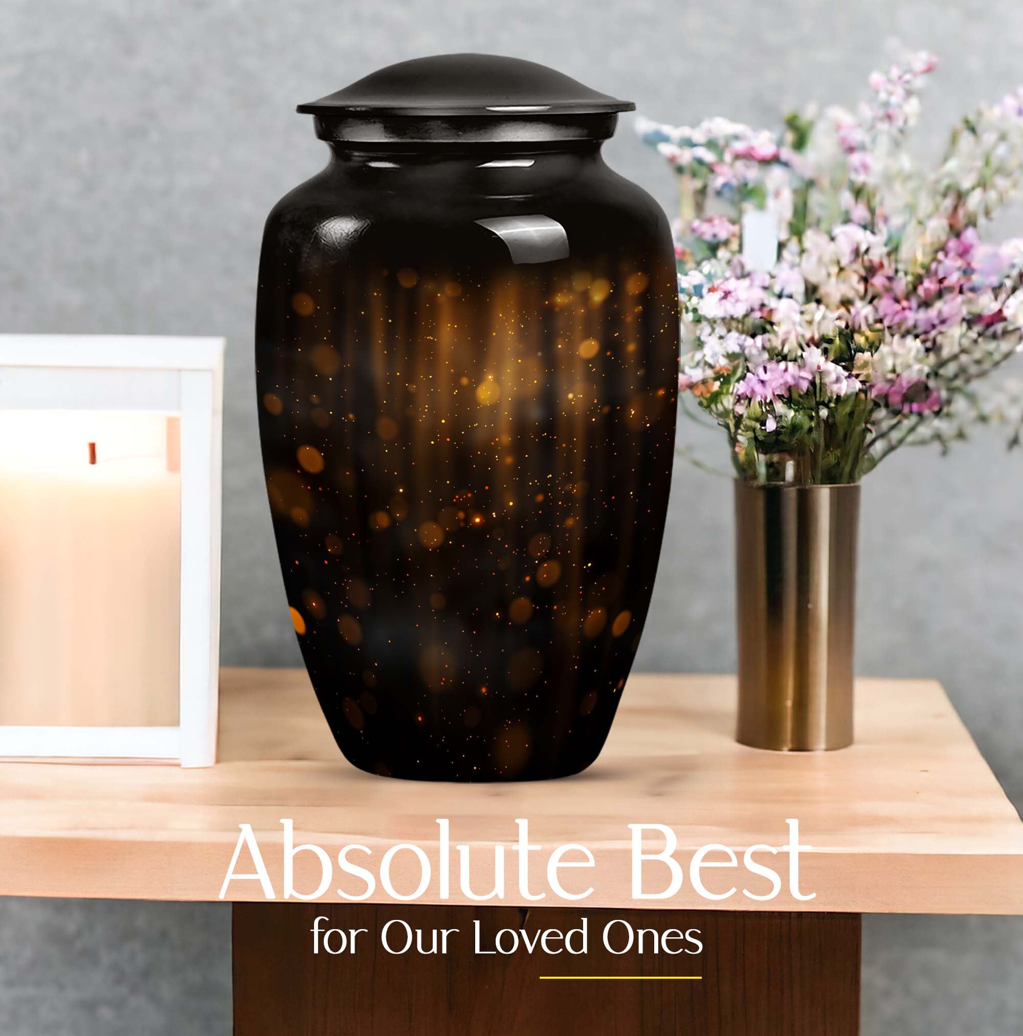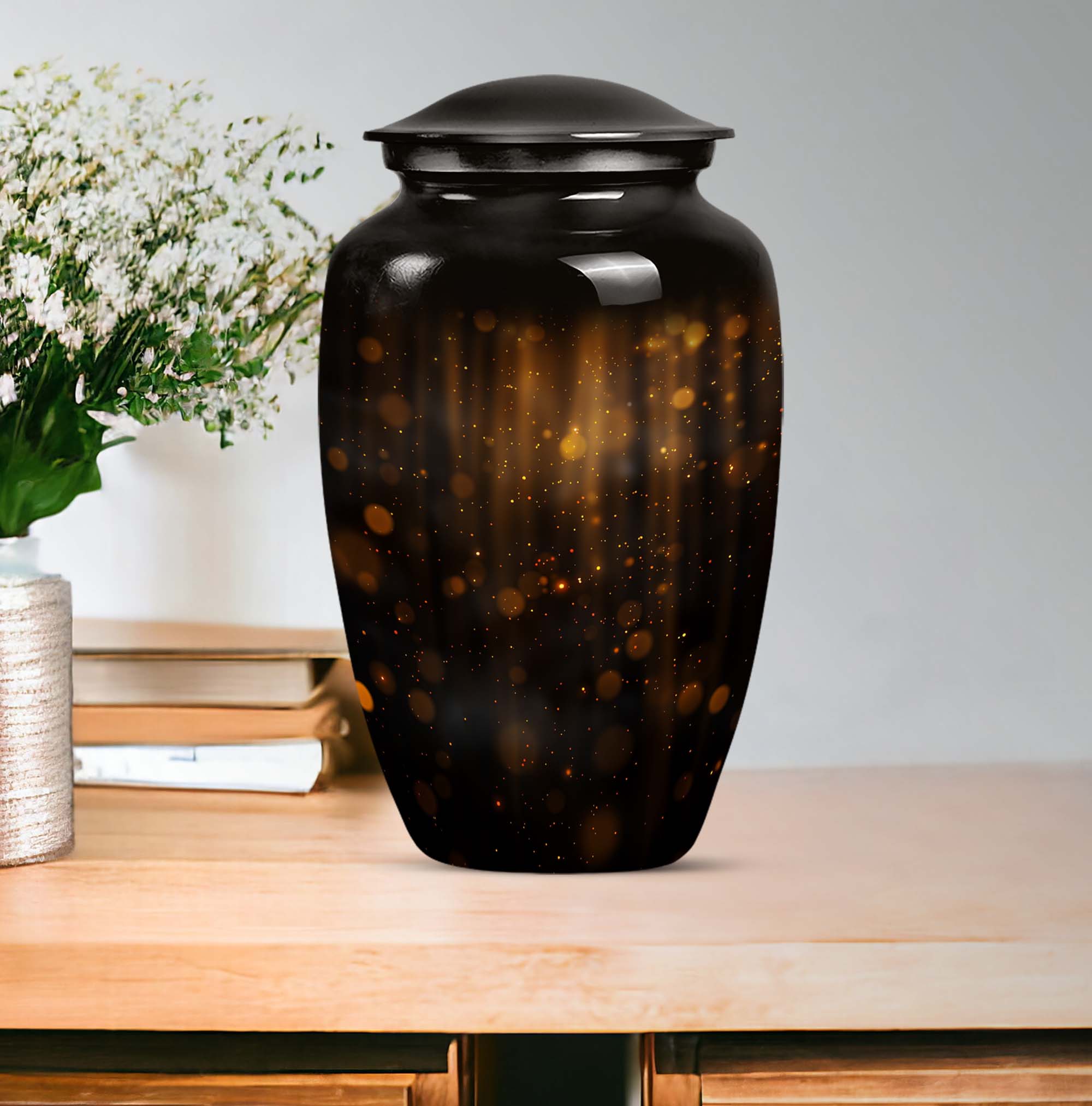 Preserve the memory of your loved ones with the Twilight Forest Urn, an exceptional choice in our collection of cremation memorial urns for human ashes. This 10-inch Classic urn stands as a true testament to subtlety and elegance, crafted from enduring aluminium enhancing its durability and shine. With a weight of just 3.3 pounds and an impressive capacity of 200 cubic inches, this large urn is designed to securely encase the ashes. For a further touch of refinement and personal respect, we offer to engrave names onto the urn, making it ever so unique and close to your heart. It is shipped with a beautifully designed velvet pouch that provides an additional layer of safeguard to encase the urn and the memories it holds. Highlighting an appealing abstract theme, this urn has been designed as a thoughtful and respectful tribute to those we hold dear. Ideal for men and women alike, the Twilight Forest Urn is a popular selection in burial urns for human ashes, irrespective of the locale. The combination of craftsmanship, functional design, and aesthetic appeal make this large cremation urn an ideal choice for memorial purposes.