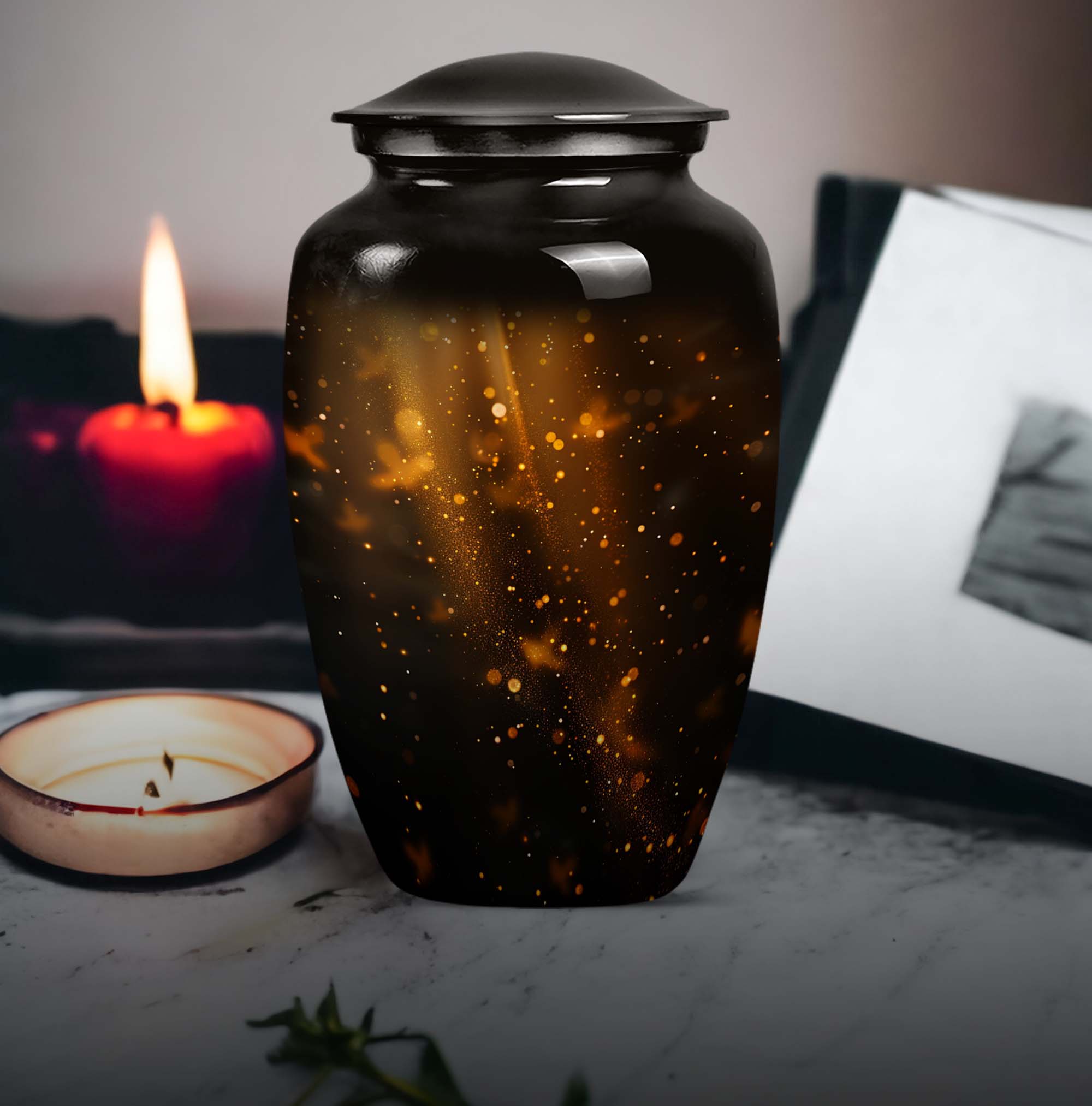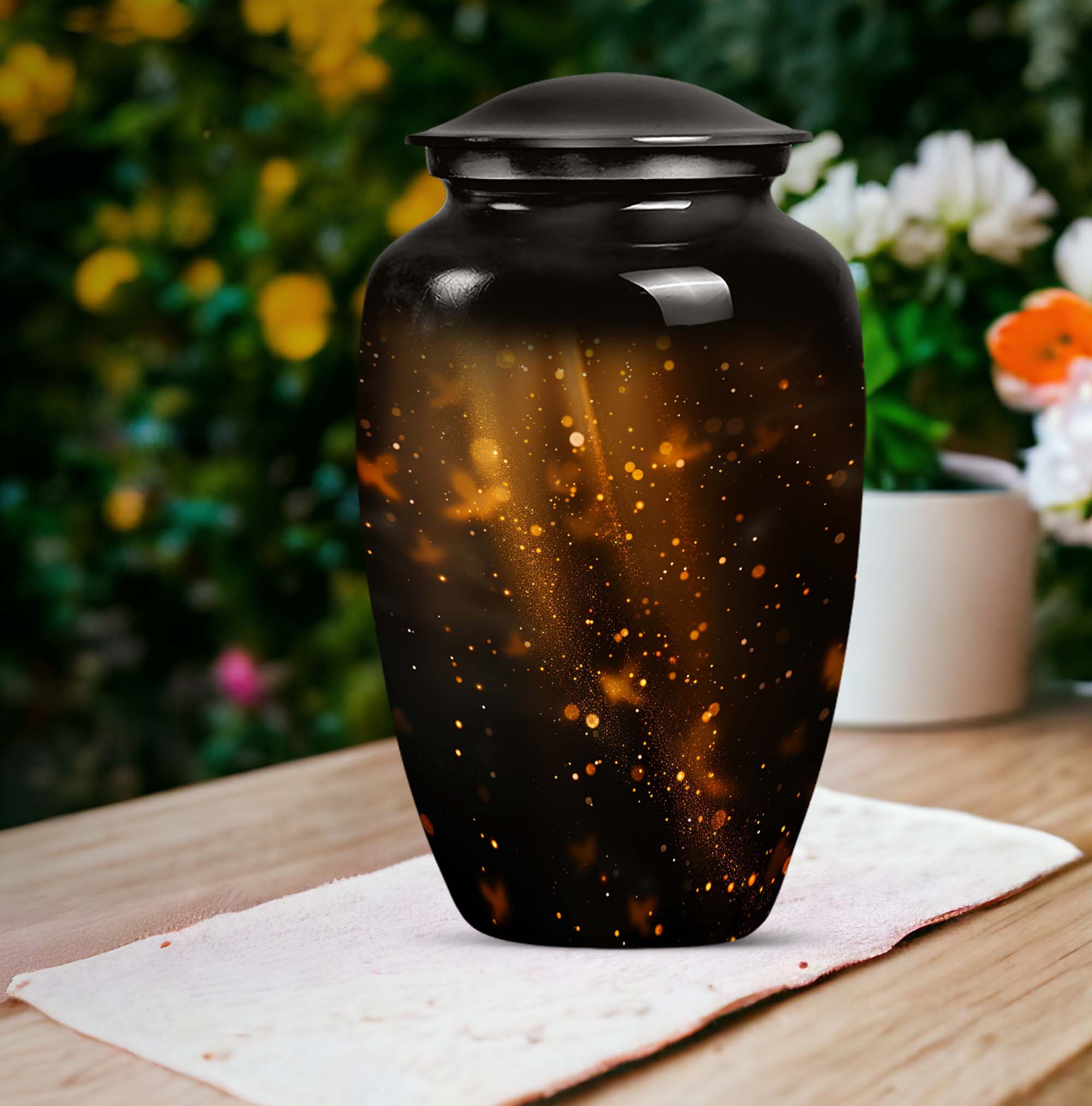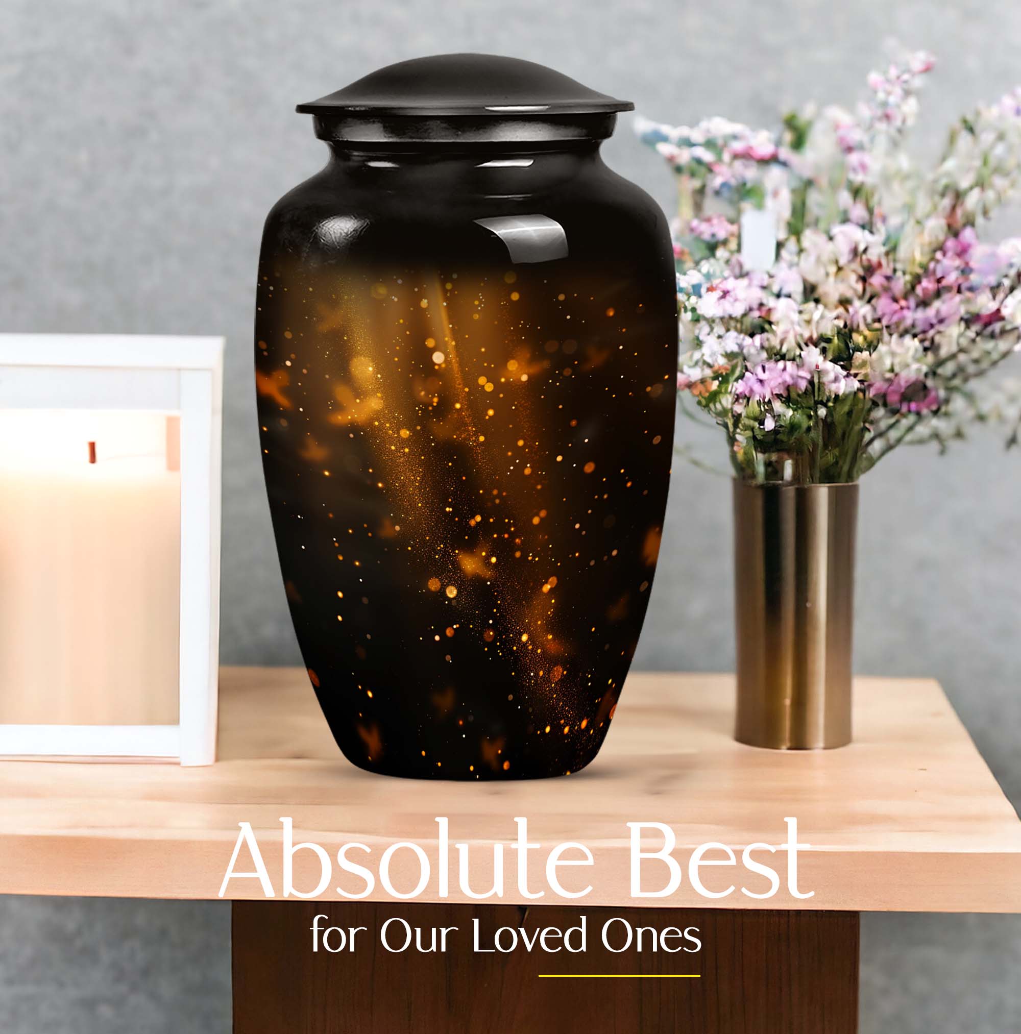 When it comes to honoring a loved one's memory, you can't go wrong with the Twilight Forest Urn. This funeral unique urn for human ashes, fundamentally different from others in the market, suits both adults and seniors who are looking for memorial ceremony supplies. Made from high-quality aluminum, this 10-inch cremation urn strikes an exquisite balance between weight and size at a merely 3.3 pounds. Its capacity of 200 cubic inches ensures it can properly and respectfully hold the remnants of your dear one. The package also includes a soft, velvet pouch specifically designed for the containment of ashes. Its abstract theme adds a touch of sophistication and elegance, allowing the urn to fit seamlessly into any decor. Furthermore, the urn can be personalized with engraved names, offering an intimate way to commemorate your loved one. Remember, the Twilight Forest Urn is more than just a 'large urn'; it's a symbol of love and tribute.