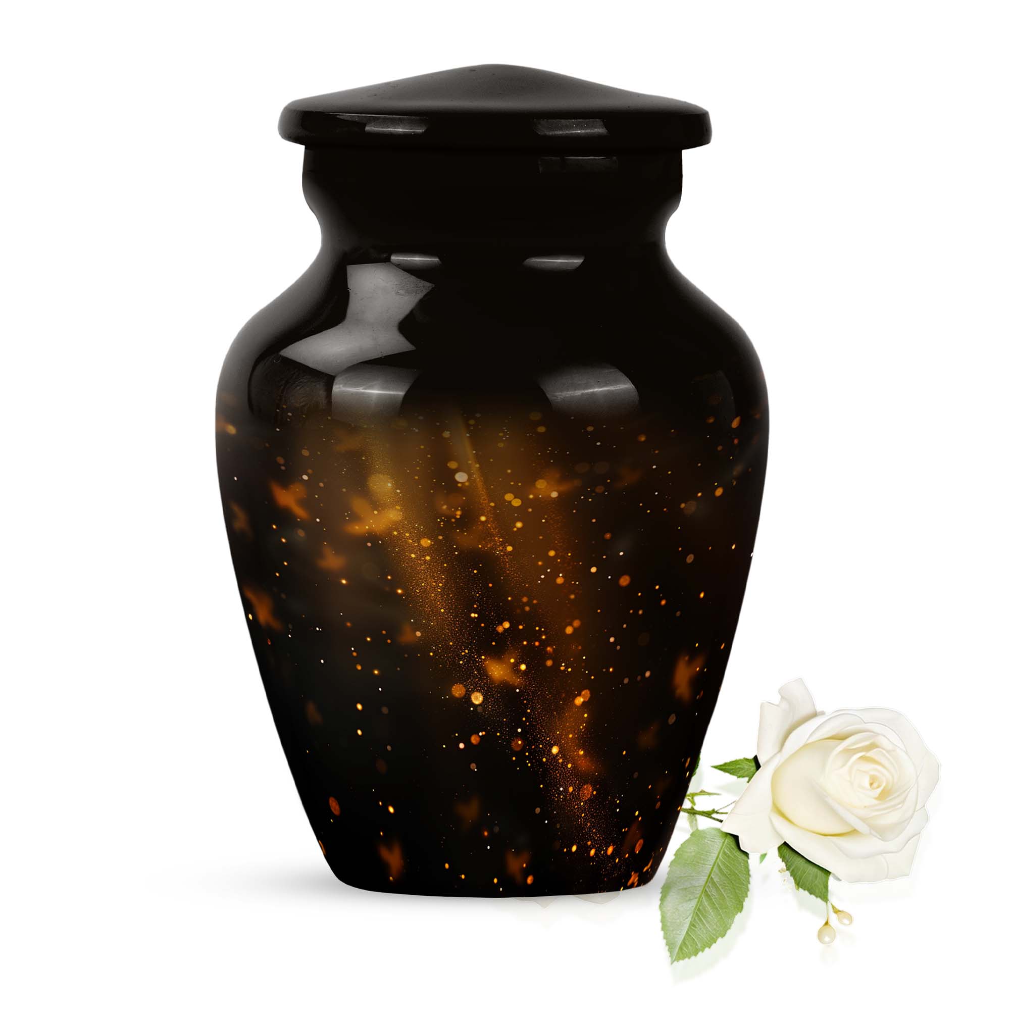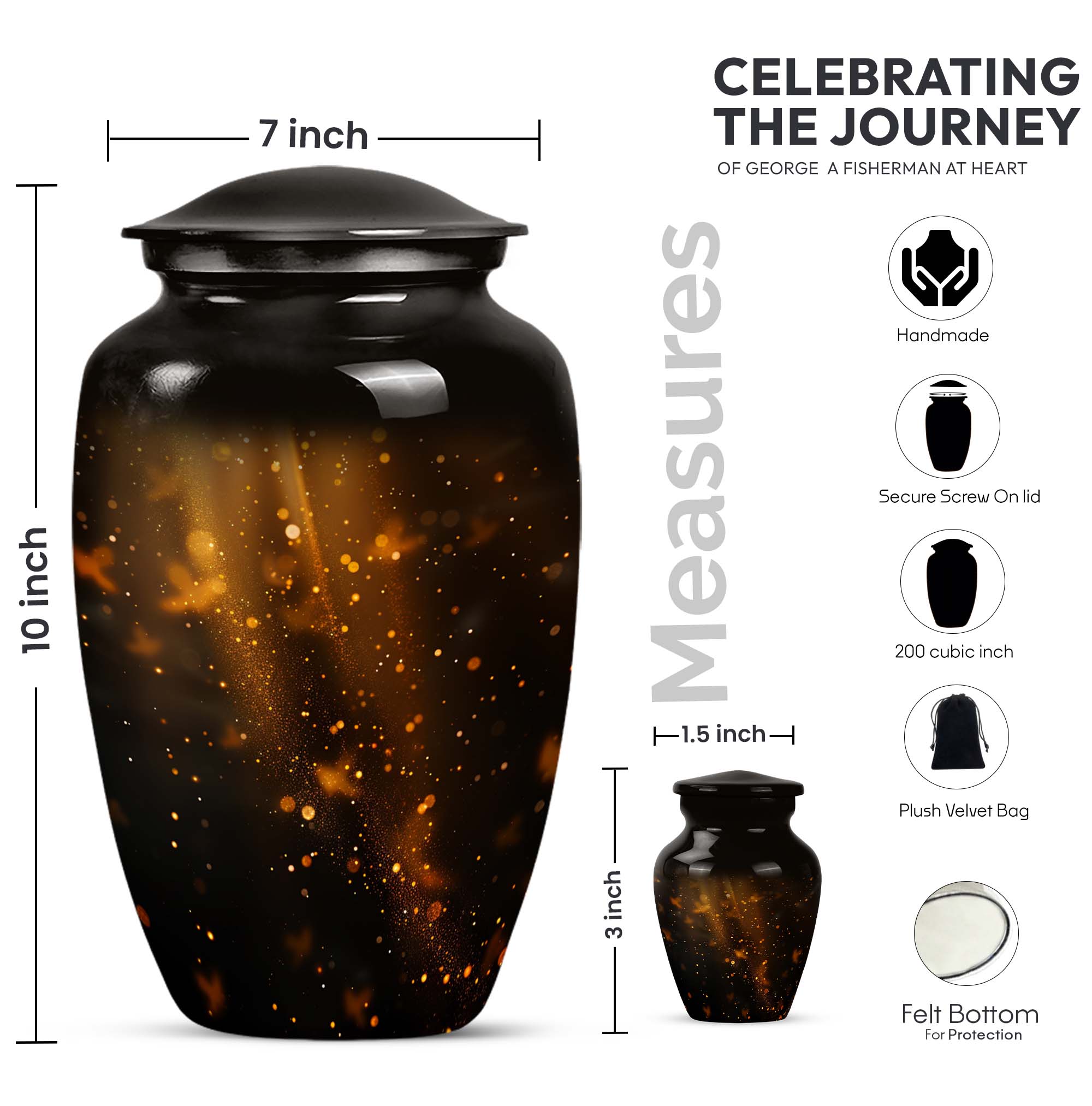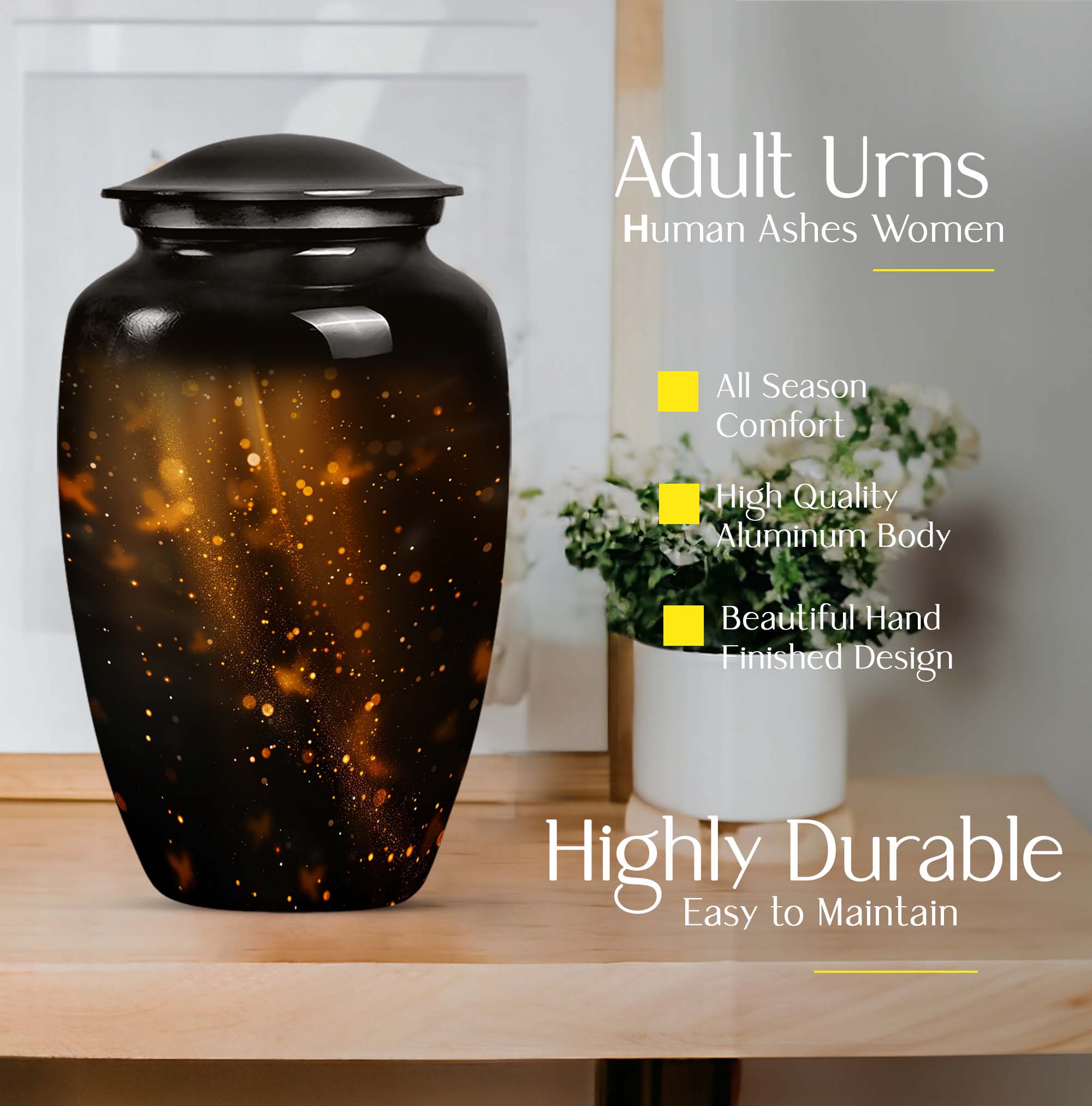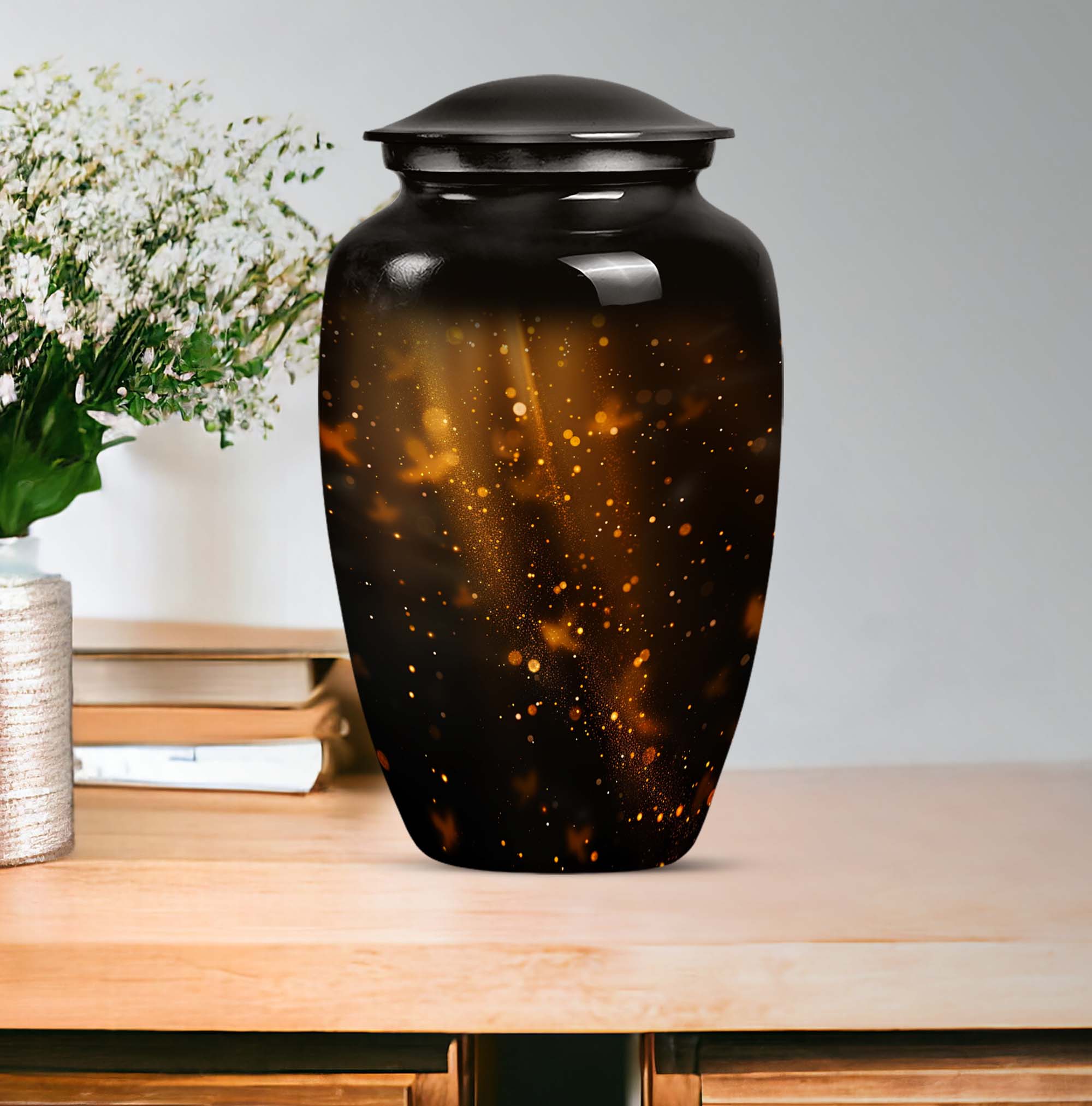When it comes to honoring a loved one's memory, you can't go wrong with the Twilight Forest Urn. This funeral unique urn for human ashes, fundamentally different from others in the market, suits both adults and seniors who are looking for memorial ceremony supplies. Made from high-quality aluminum, this 10-inch cremation urn strikes an exquisite balance between weight and size at a merely 3.3 pounds. Its capacity of 200 cubic inches ensures it can properly and respectfully hold the remnants of your dear one. The package also includes a soft, velvet pouch specifically designed for the containment of ashes. Its abstract theme adds a touch of sophistication and elegance, allowing the urn to fit seamlessly into any decor. Furthermore, the urn can be personalized with engraved names, offering an intimate way to commemorate your loved one. Remember, the Twilight Forest Urn is more than just a 'large urn'; it's a symbol of love and tribute.
