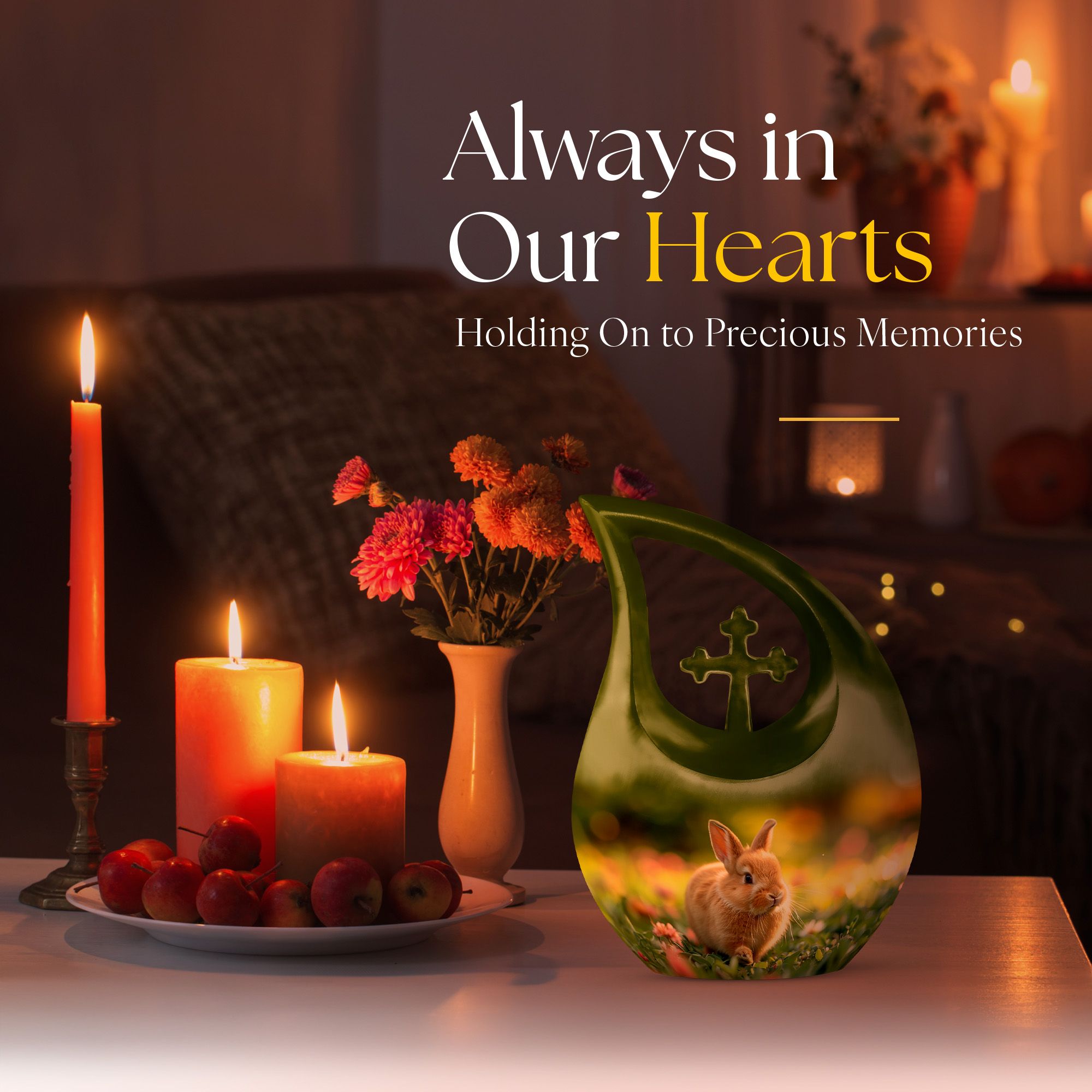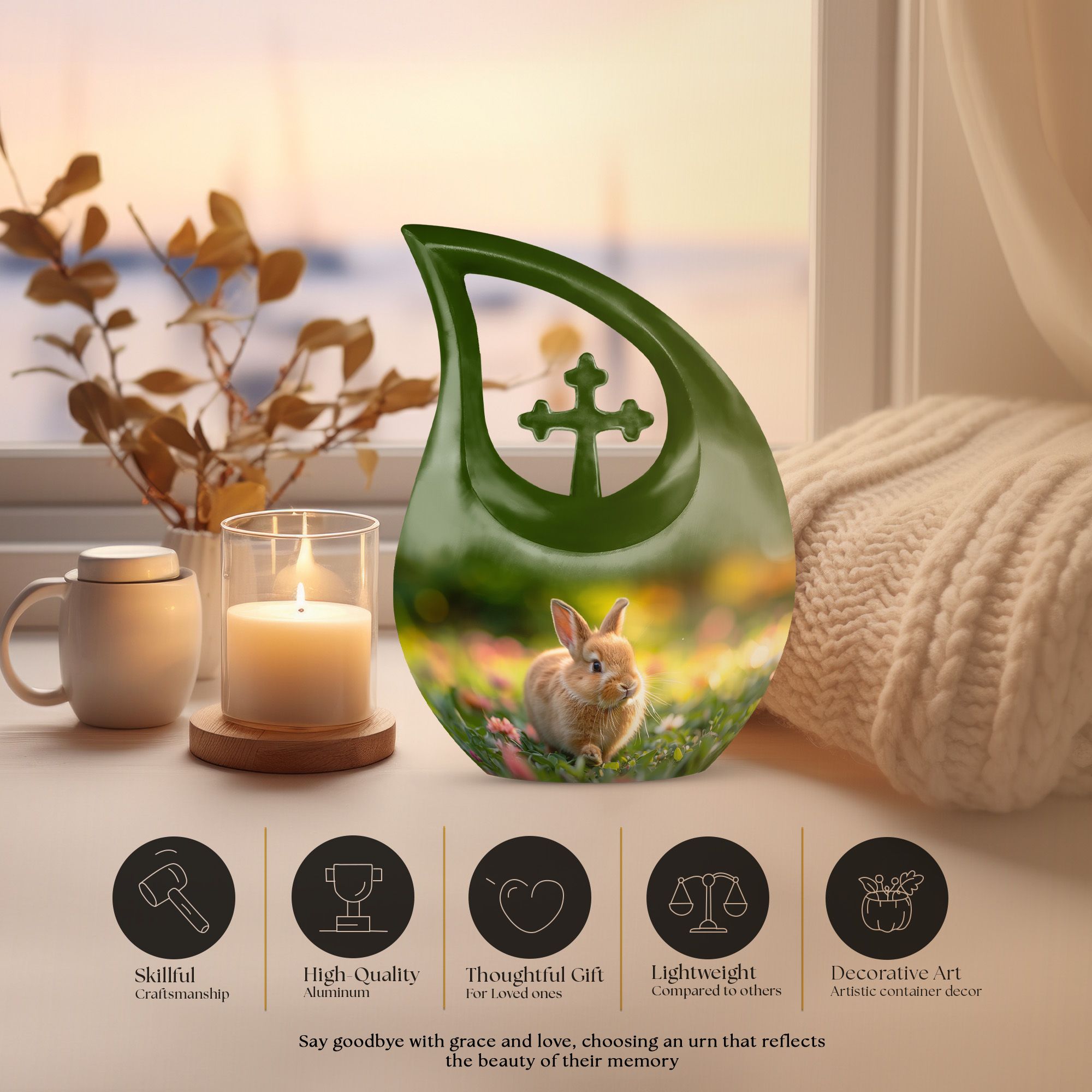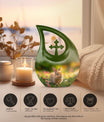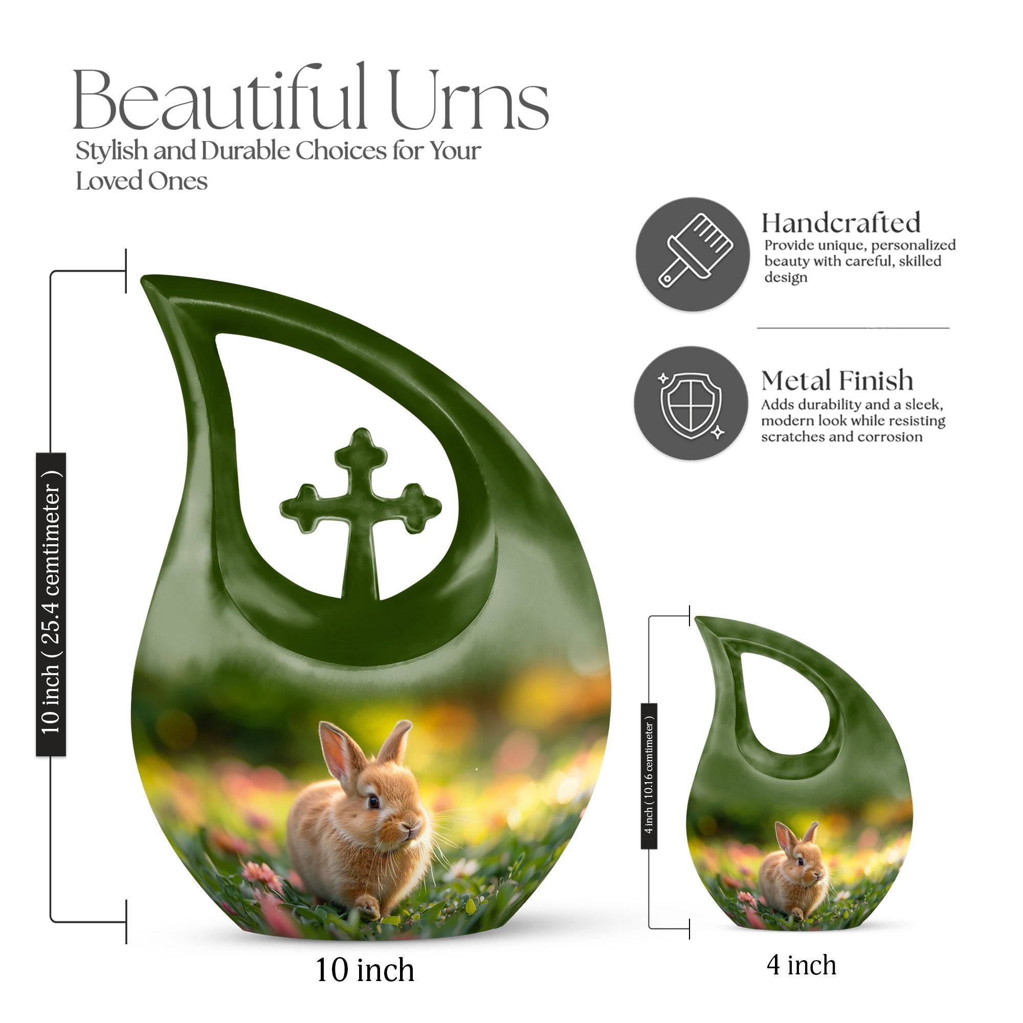Cherish the memory of your loved one with our Twilight Garden Bunny Urn. This beautiful relic, idolizing a Cross Drop urn design, makes a serene resting place for human ashes. This large urn, standing 10 inches high, sits comfortably at any sanctified spot in your home. Made with high-quality, resilient aluminium, it weighs just 3.3 pounds. Its spacious interior sports a capacity of 200 cubic inches, perfect for preserving the ashes securely, with utmost respect. The urn comes with an elegant velvet pouch, ensuring safe-keeping and protection of the memorial ashes. For a heart-touching reminder, customize our Twilight Garden Bunny Urn by engraving the name of your beloved. Widely searched as Mini Urns for Ashes or Urn Vaults, this urn serves the dual purpose of being emotionally satisfying and cost-effective. Coinciding with religious & ceremonial sentiments that our respected seniors hold dear, this urn serves as a beautiful element of respectful memorial ceremony supplies.