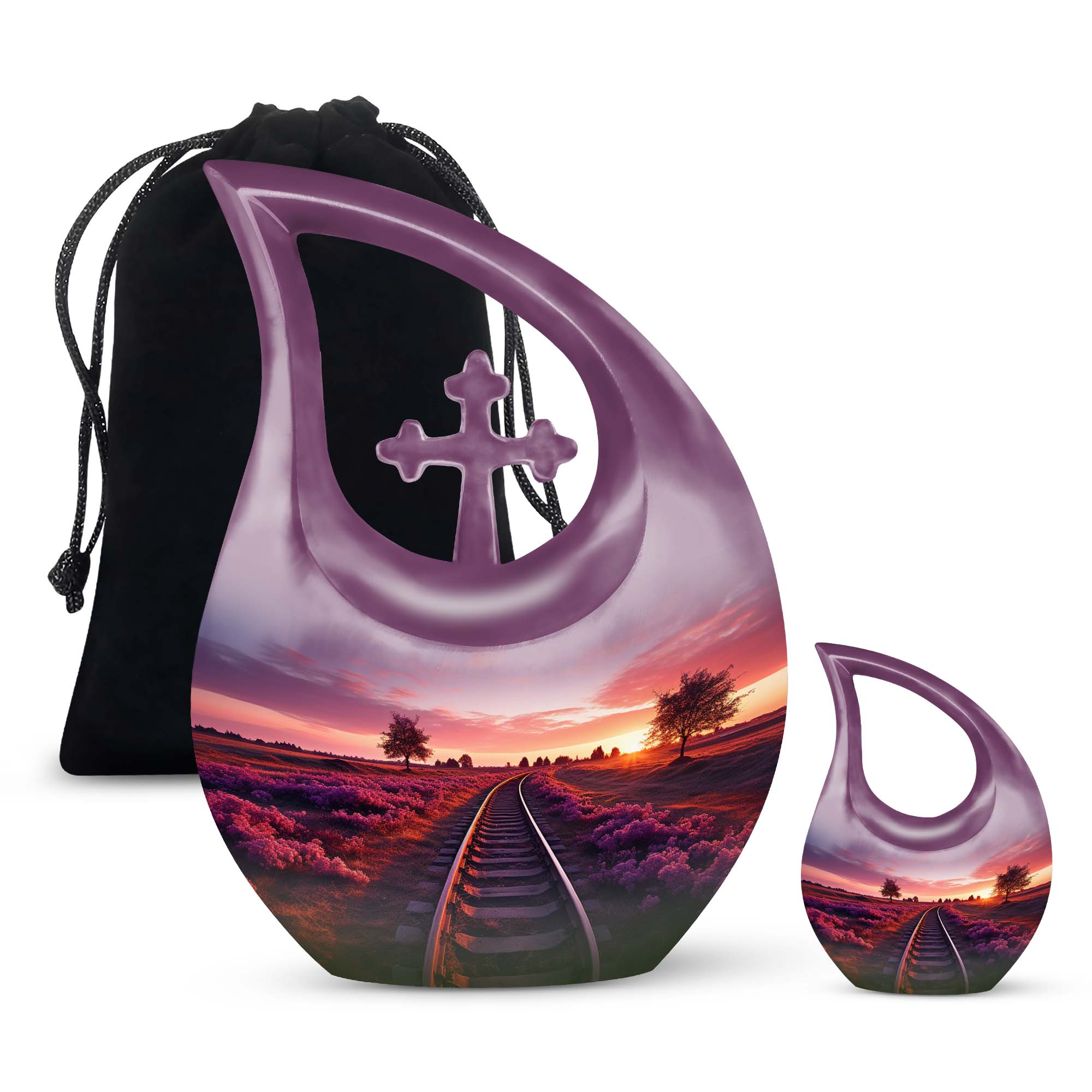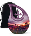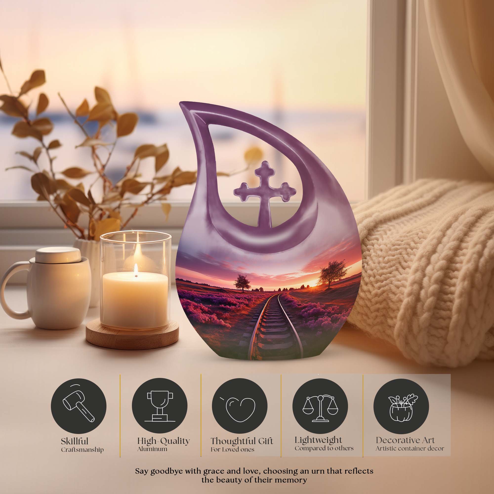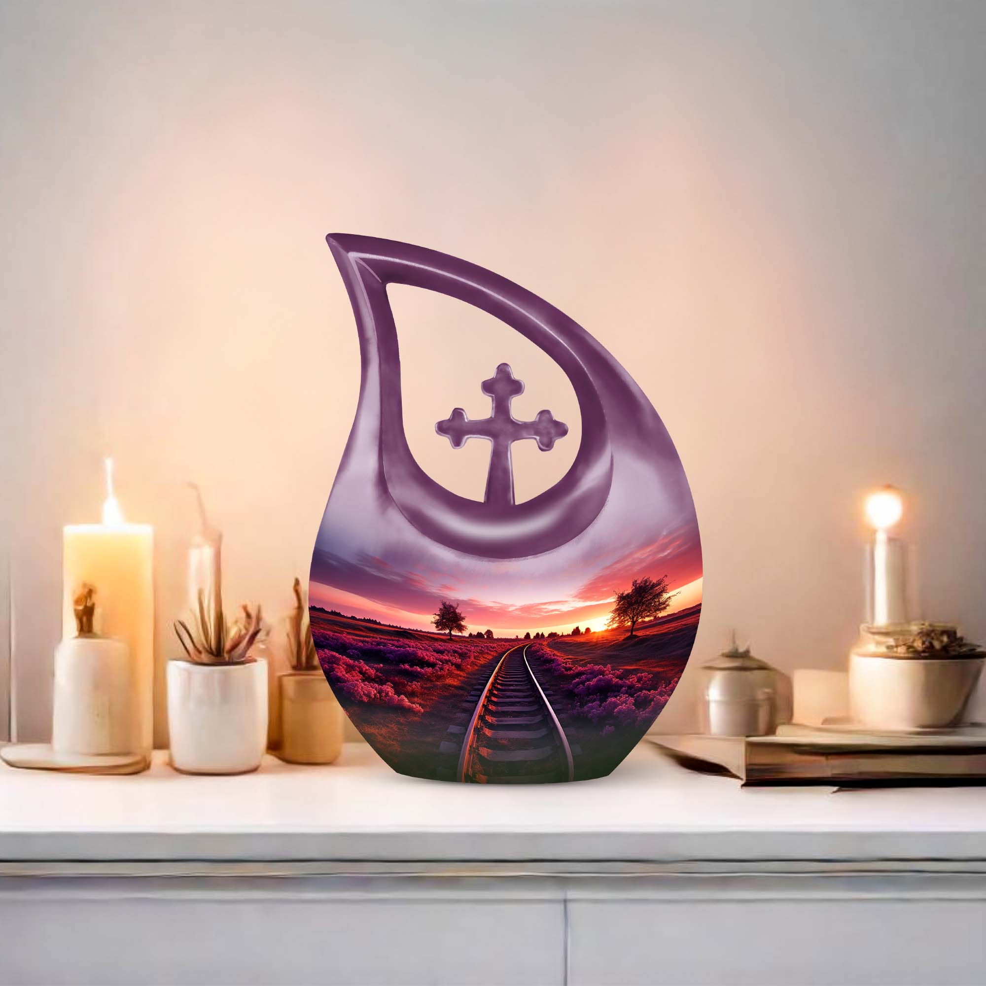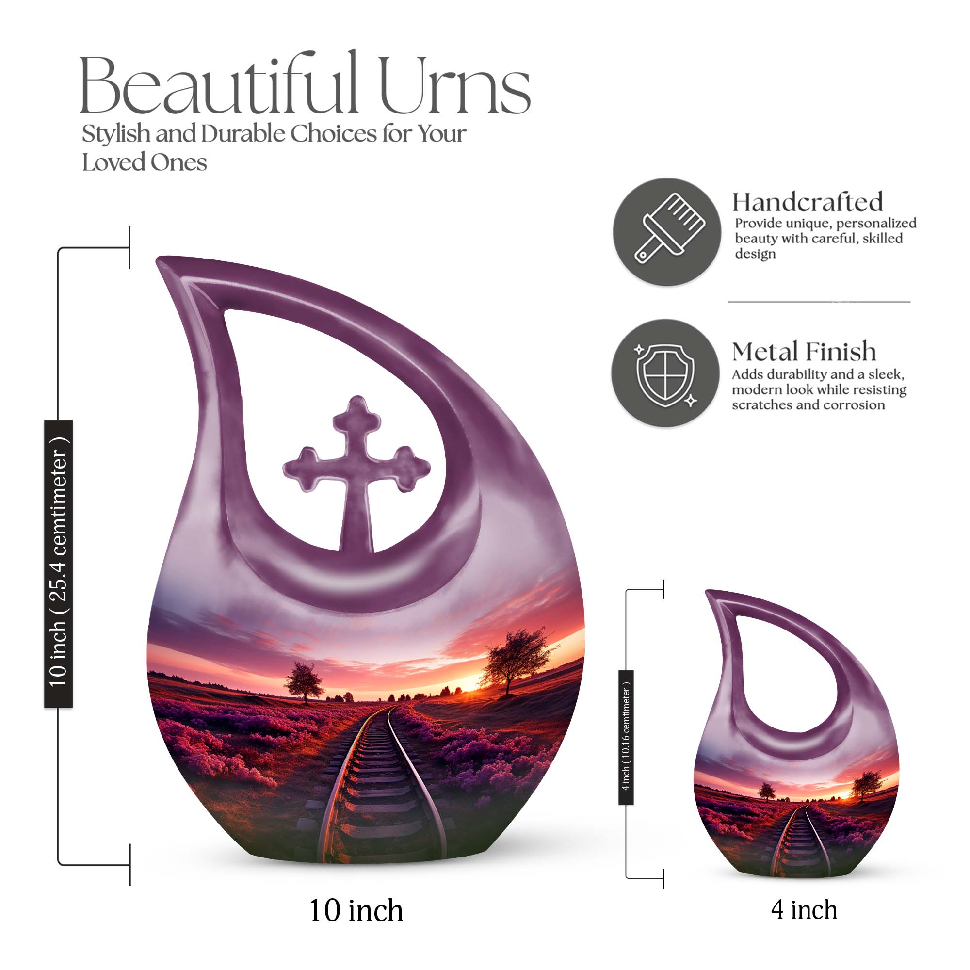Expertly crafted from durable aluminium, this 10 inch urn features a peaceful lavender floral motif blended with soft railtrack-style detailing, symbolizing life’s journey and the comforting path of remembrance. Its secure screw-top lid and elegant finish ensure long-lasting protection, making it a meaningful choice for cremation urns for large human ashes adult, large cremation urn, or families needing dependable large adult urns for human ashes. Its balanced shape and soft tones make it suitable for home display, memorial niches, or burial ceremonies.