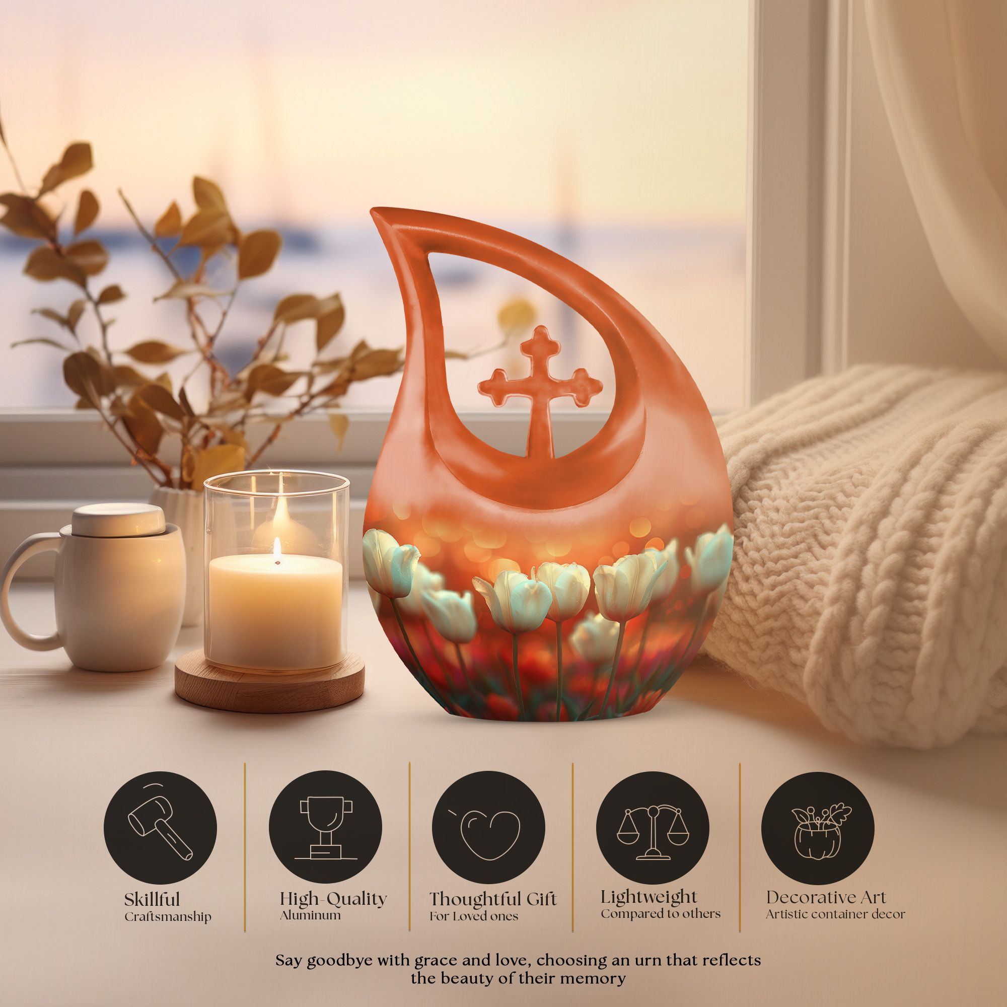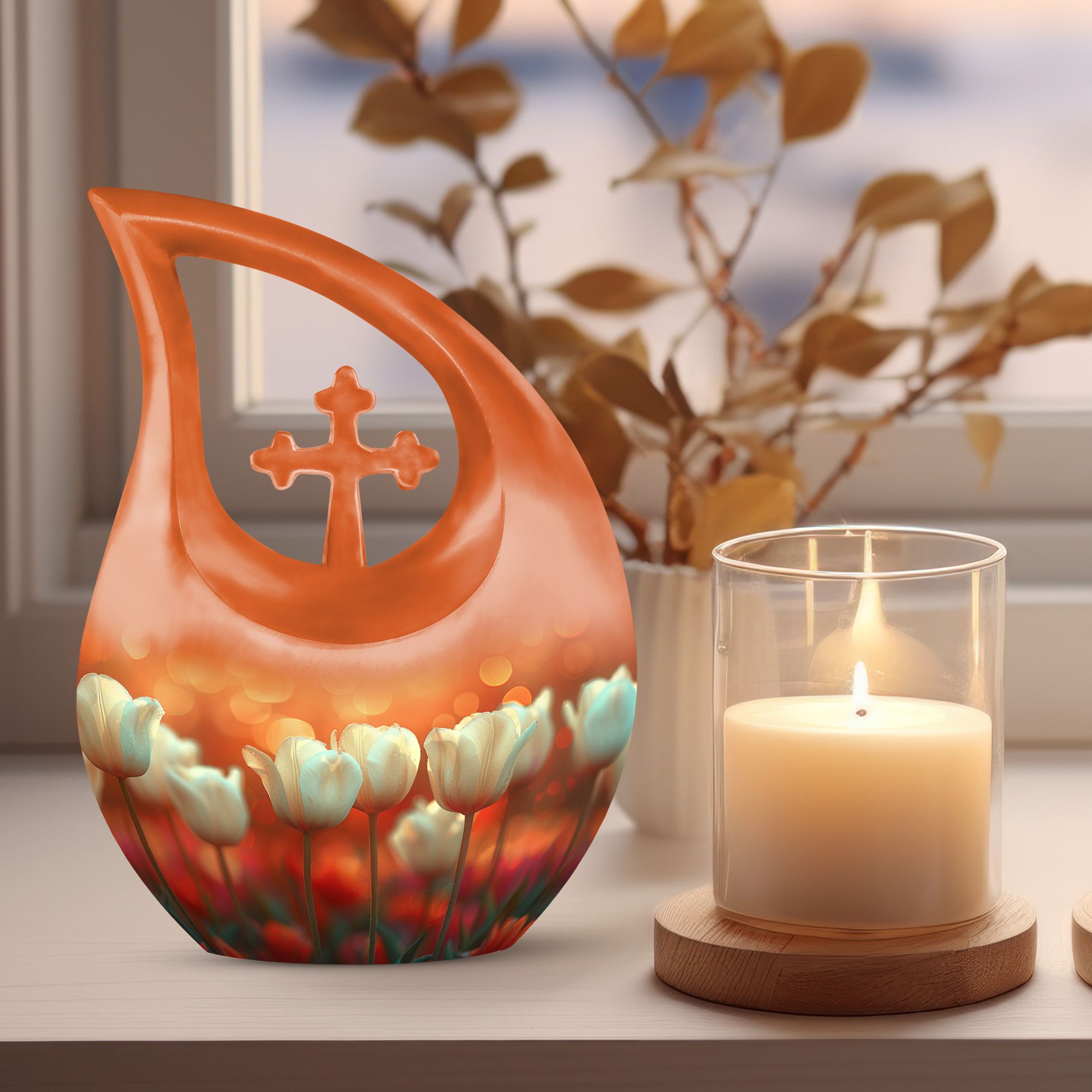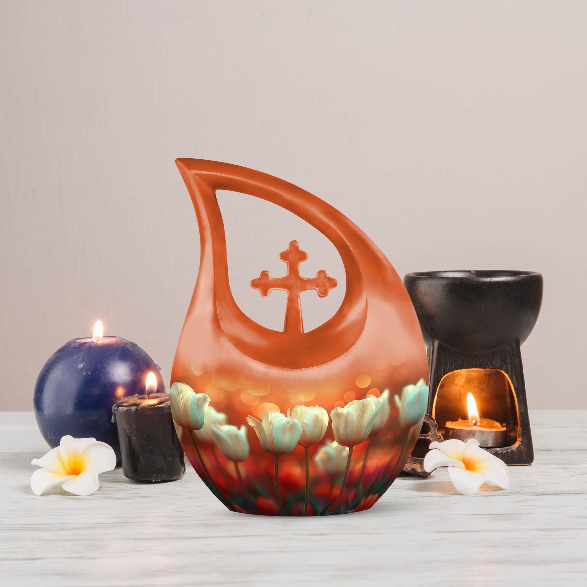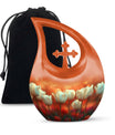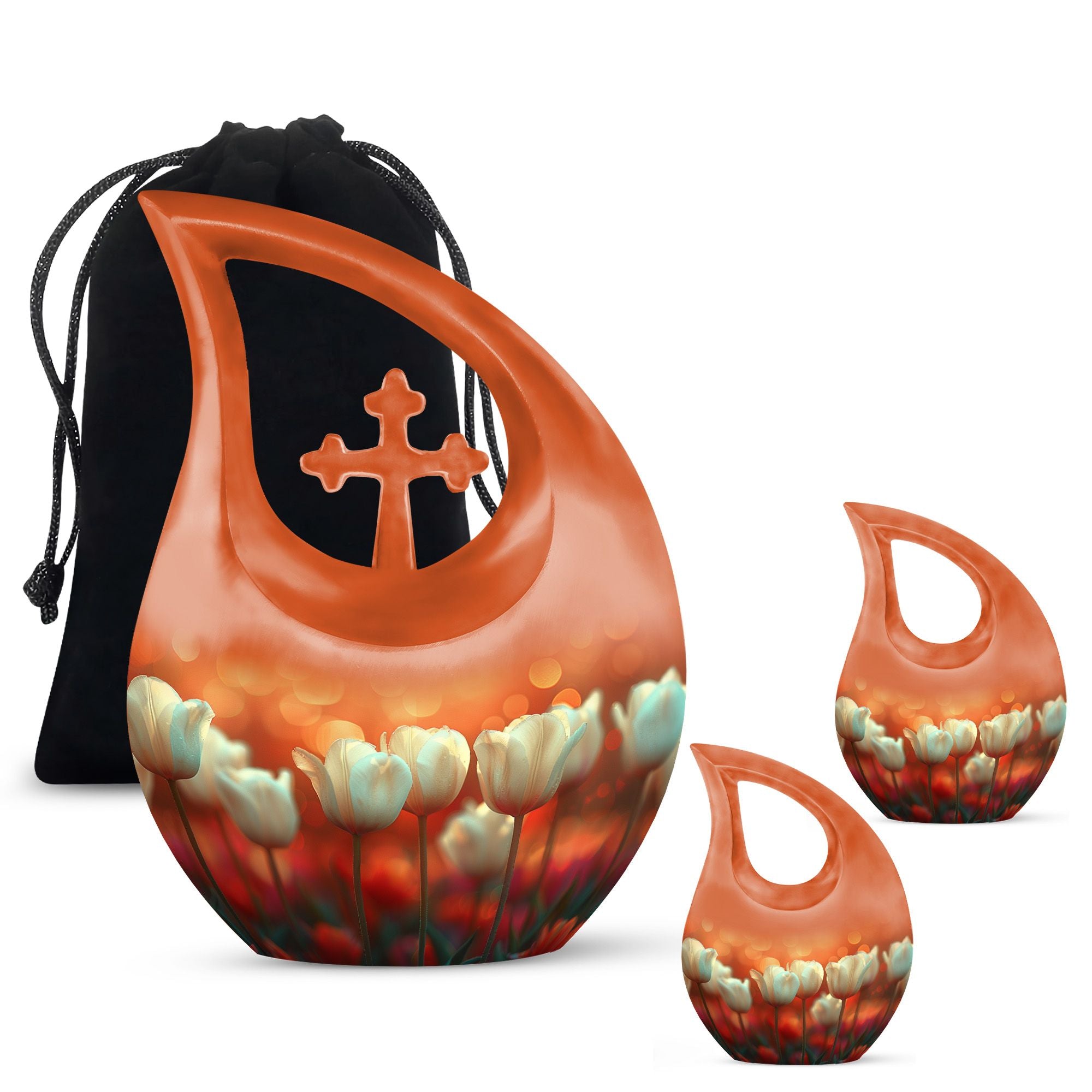 For a lasting tribute that combines beauty and solemnity, meet the 'Twilight's Tender Blooms' - a large, affectionately crafted memorial urn. Overshadowing conventional urns with its unique Cross Drop pattern, this 10-inch aluminium urn is a special resting place for our departed loved ones. Coming in at 3.3 pounds with dimensions of 10 inches in height and a capacity of 200 cubic inches, this urn can share safehaven to the ashes of two adults. Enhance the significance by personalizing the urn with engraved names, ensuring this memento remains an irreplaceable part of your home. The urn is well-accompanied by a velvet pouch, making the containment of ashes that much easier. 'Twilight's Tender Blooms' is much more than a simple urn, it’s a dignified tribute resonating with your heartfelt love and respect. Those searching for custom engraved urns or the most popular cremation urns will indeed consider this 'Twilight's Tender Blooms' Urn a superior choice with its unmatched aesthetic appeal and thoughtful capacity.