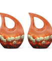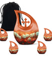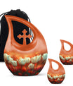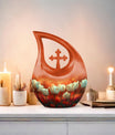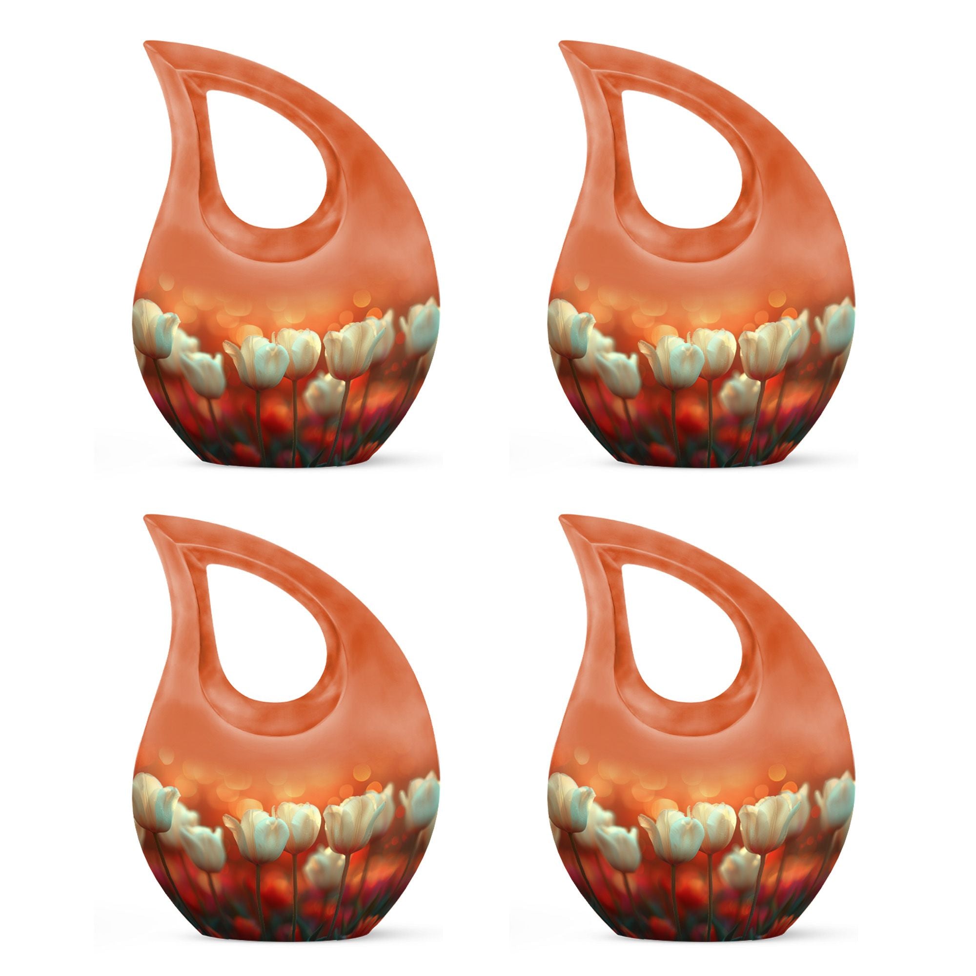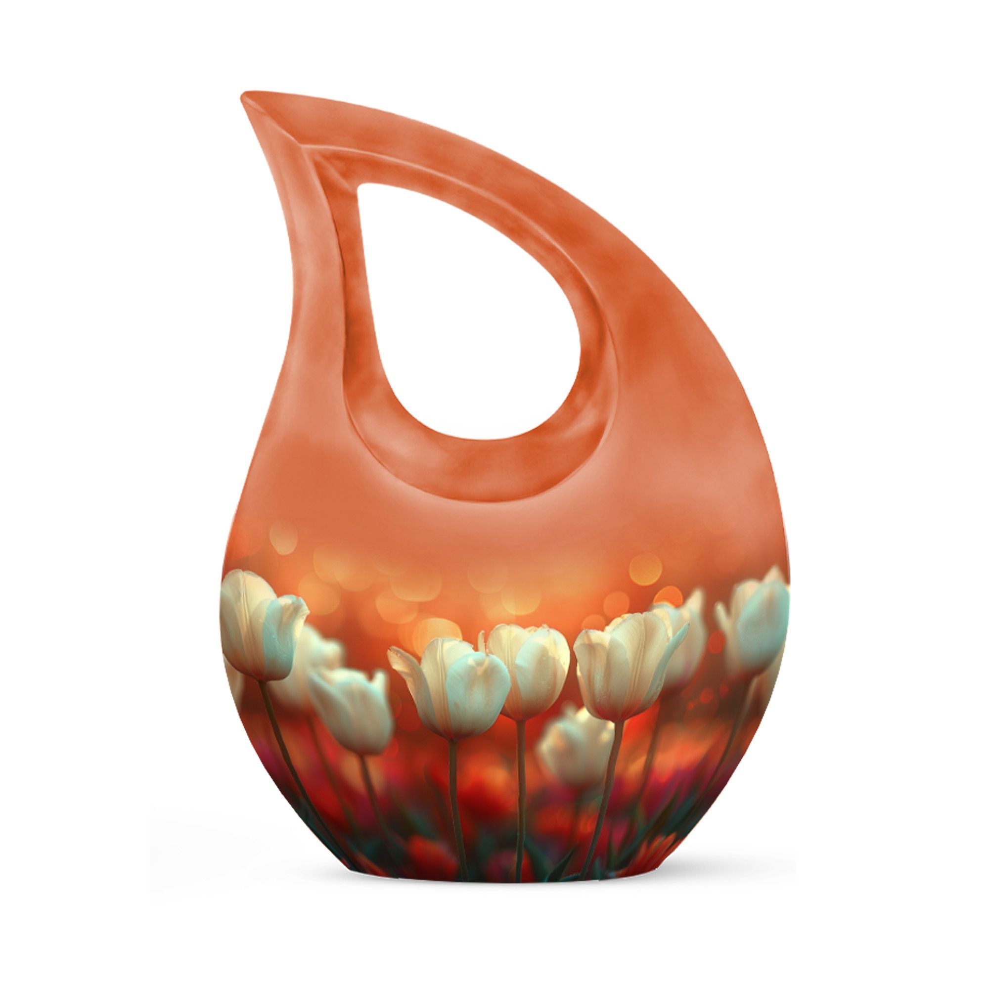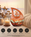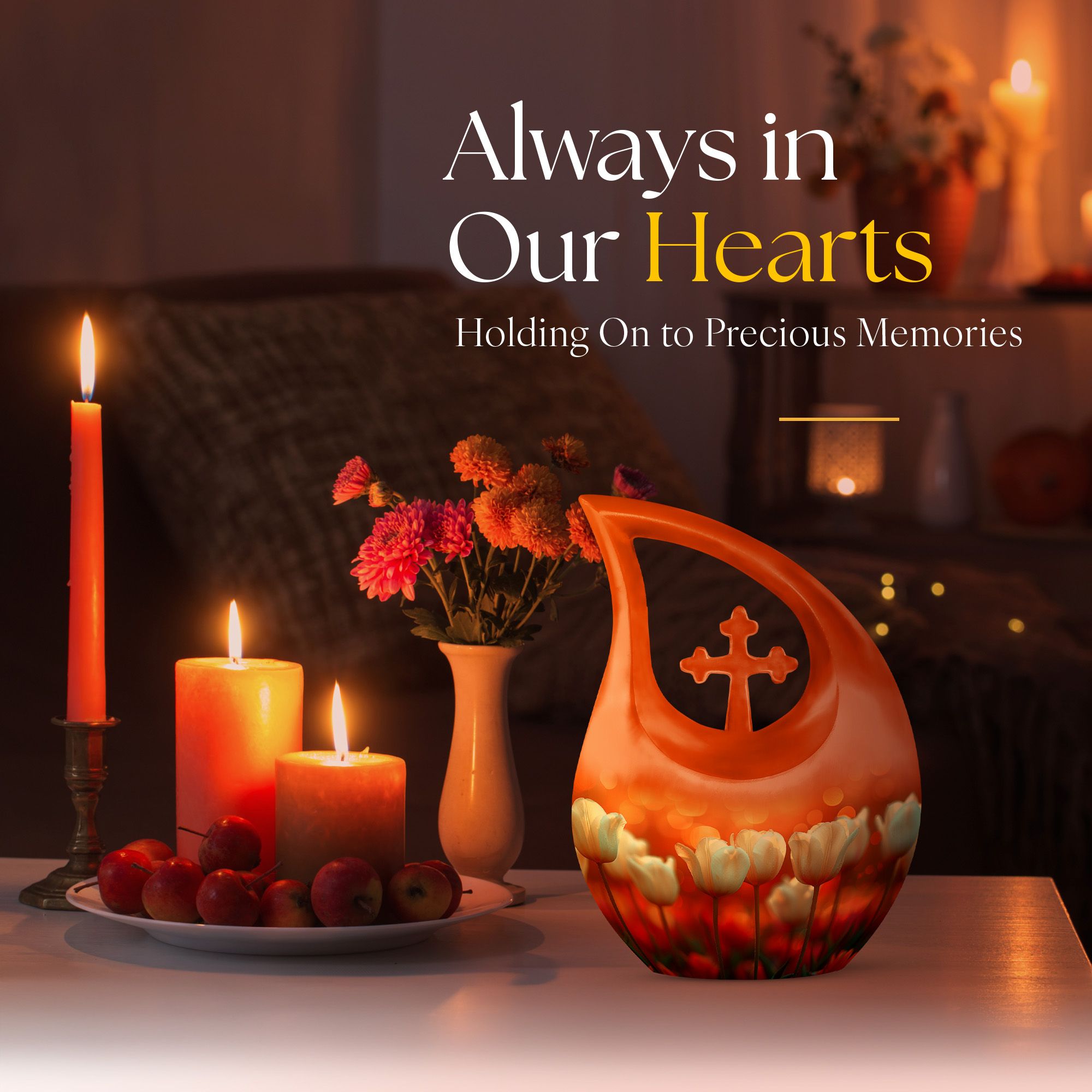 For a lasting tribute that combines beauty and solemnity, meet the 'Twilight's Tender Blooms' - a large, affectionately crafted memorial urn. Overshadowing conventional urns with its unique Cross Drop pattern, this 10-inch aluminium urn is a special resting place for our departed loved ones. Coming in at 3.3 pounds with dimensions of 10 inches in height and a capacity of 200 cubic inches, this urn can share safehaven to the ashes of two adults. Enhance the significance by personalizing the urn with engraved names, ensuring this memento remains an irreplaceable part of your home. The urn is well-accompanied by a velvet pouch, making the containment of ashes that much easier. 'Twilight's Tender Blooms' is much more than a simple urn, it’s a dignified tribute resonating with your heartfelt love and respect. Those searching for custom engraved urns or the most popular cremation urns will indeed consider this 'Twilight's Tender Blooms' Urn a superior choice with its unmatched aesthetic appeal and thoughtful capacity.