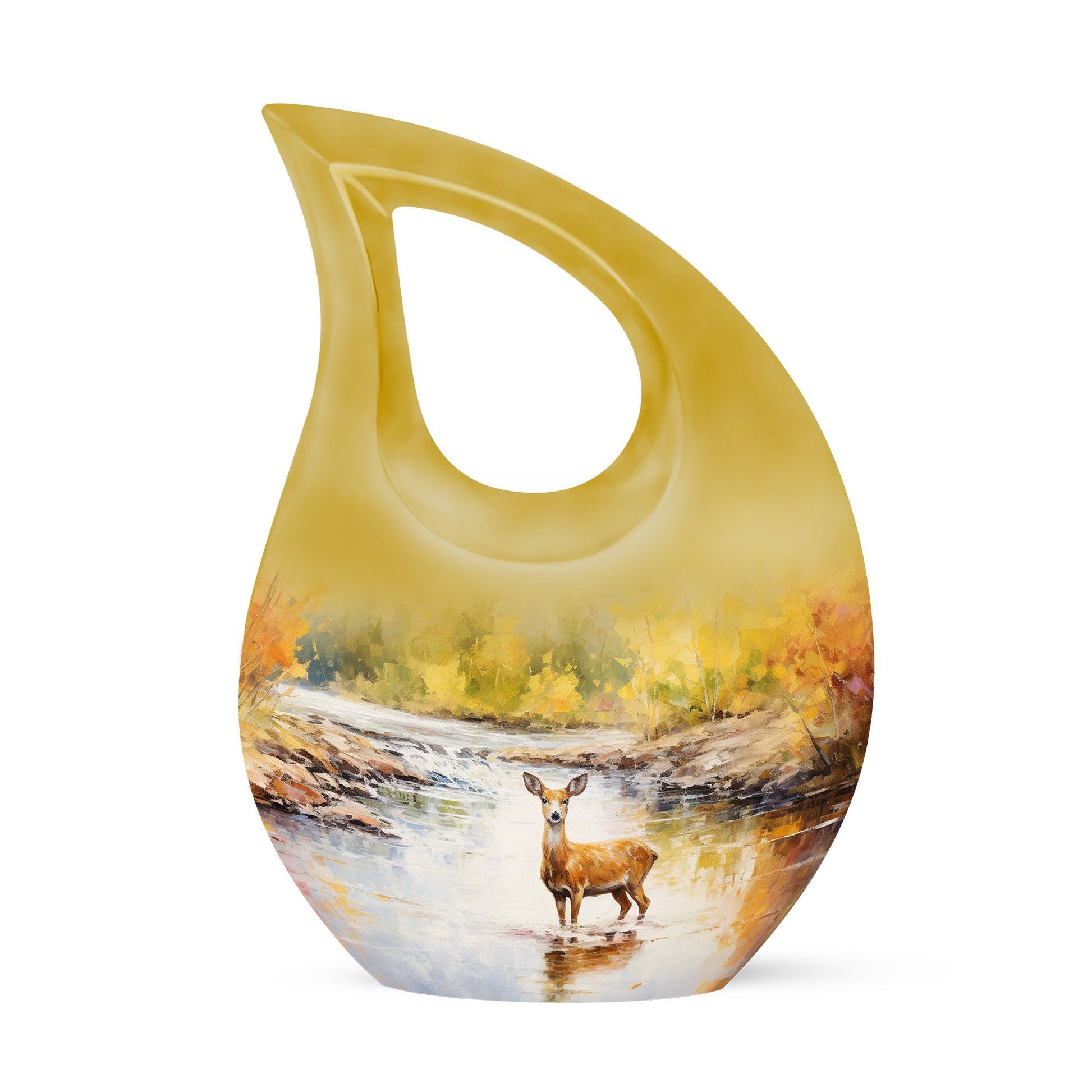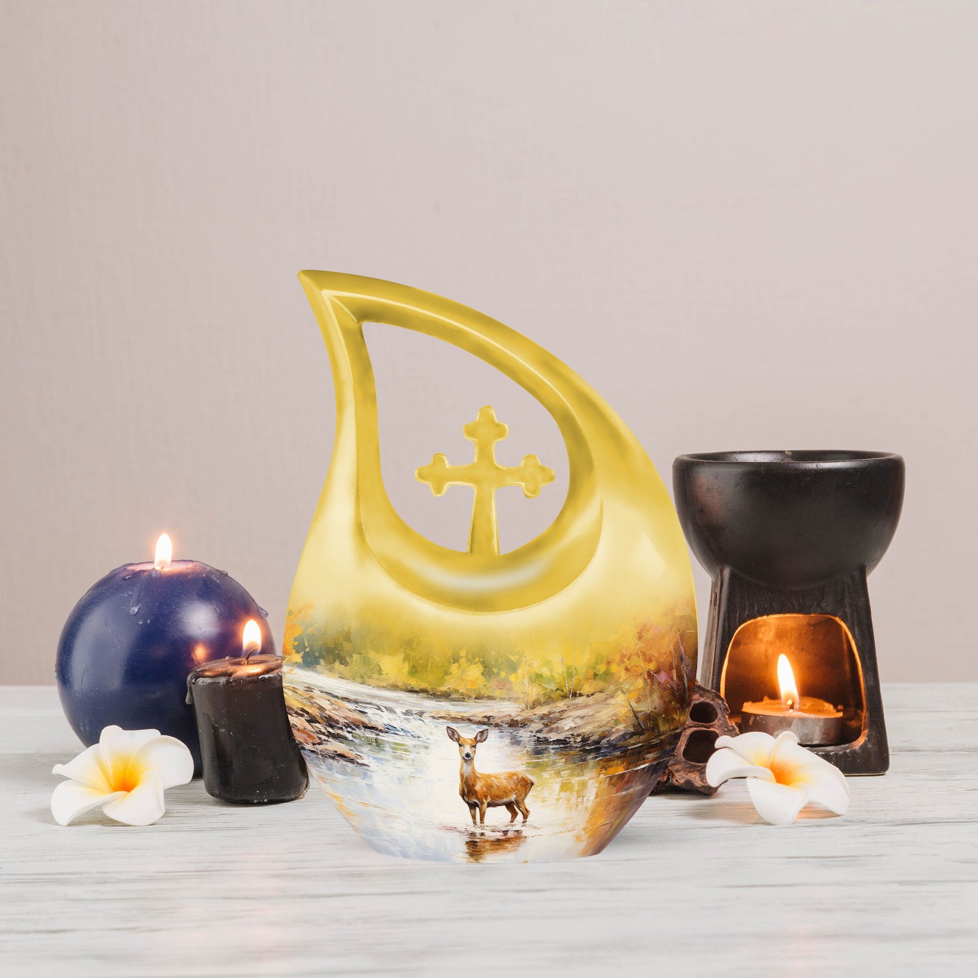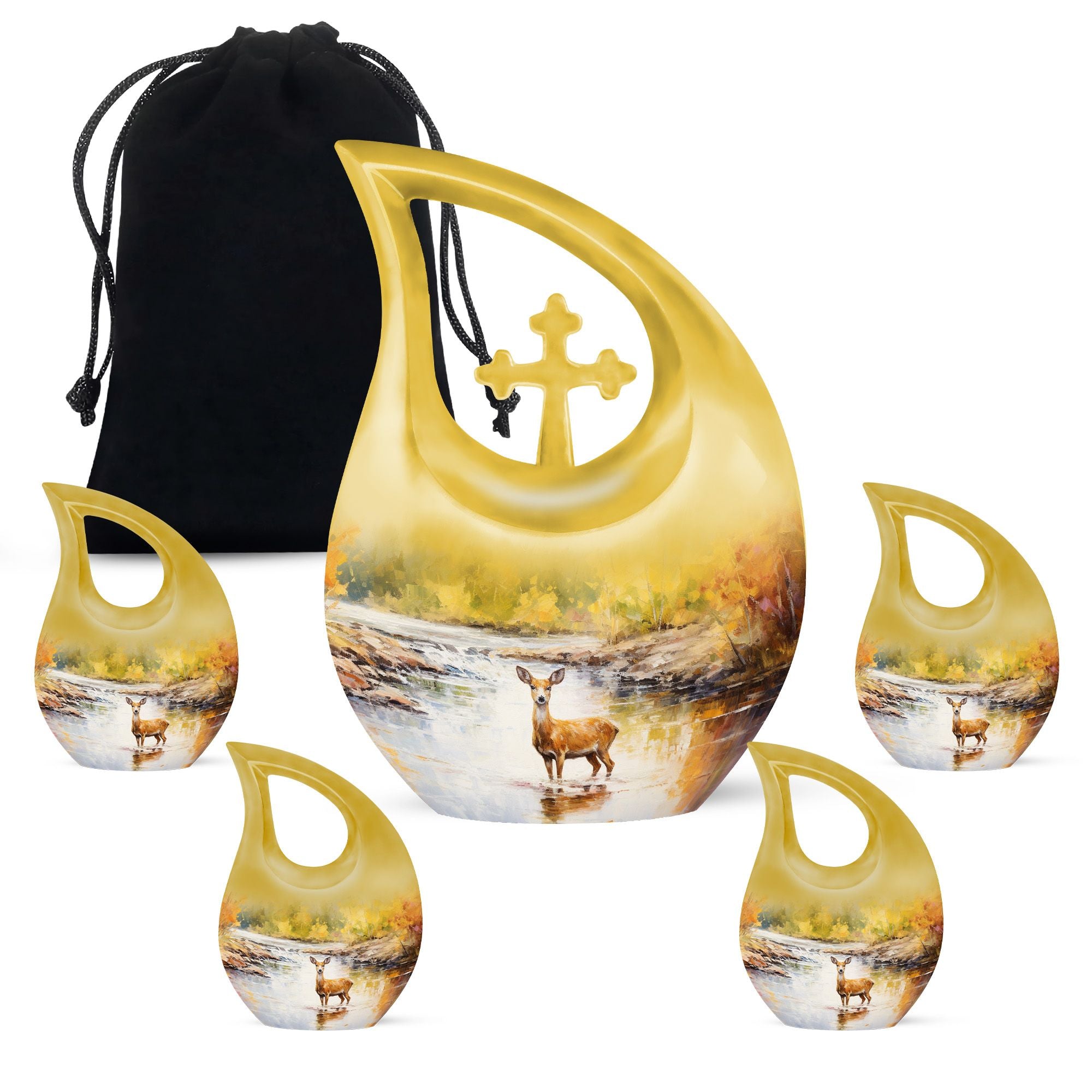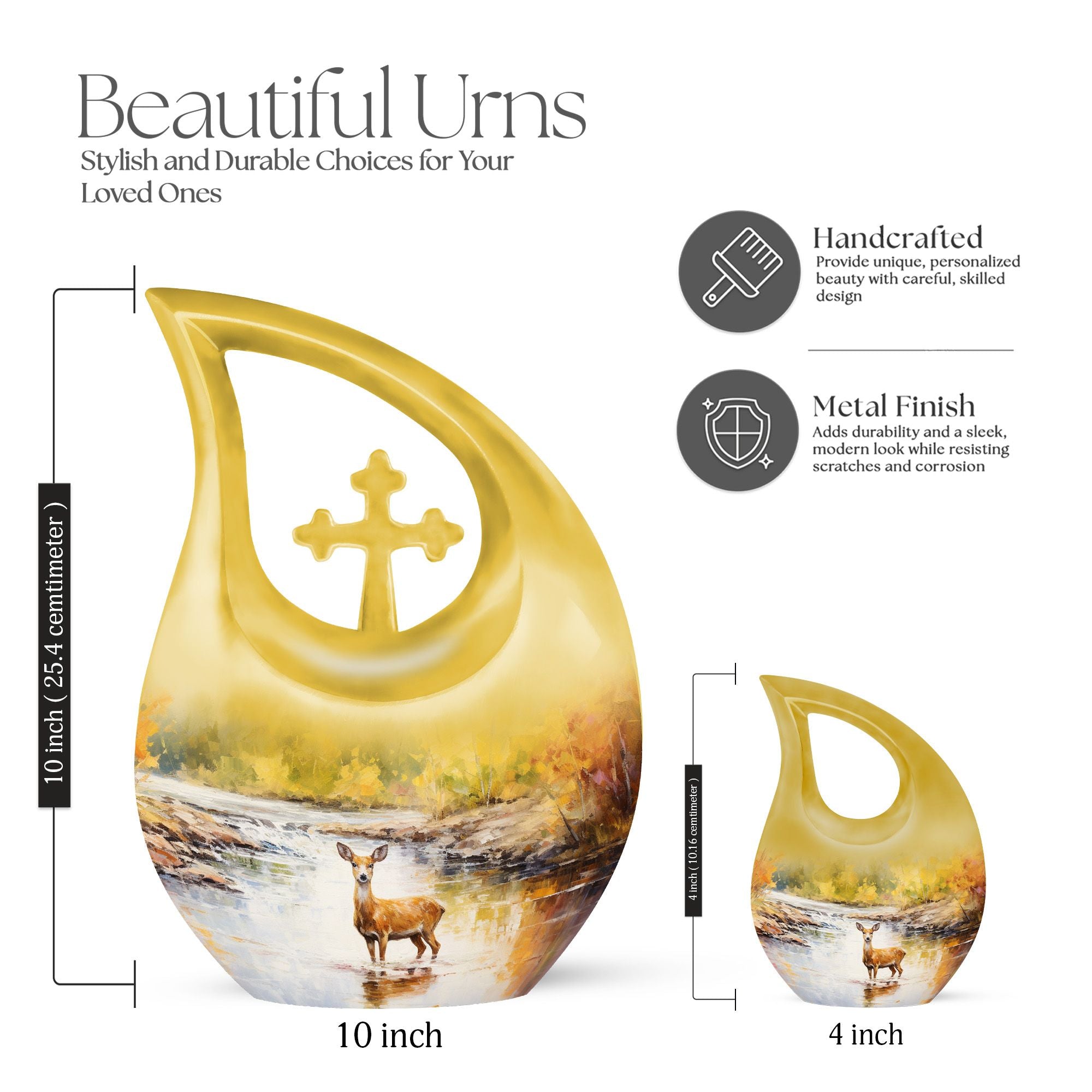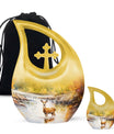 Surround your loved one's eternal resting place with gentle reverence using our Deer Urn. This sophisticated adornment is an ideal piece symbolizing eternal peace and tranquility. Handcrafted from aluminium, this large urn stands 10 inches tall and is capable of holding up to 200 cubic inches of ashes, ensuring a stately memorial for your cherished one. Not merely a burial urn, it can be a discreet addition to a garden or other sacred space, subtly soothing the raw wounds of loss with its calming 'Cross Drop' theme. The package provides a soft velvet pouch for secure containment of remains, enhancing its value beyond ordinary cremation urns. Personalize this Garden Urn for Ashes with engraved names as a unique, enduring tribute to your loved one. Weighing just 3.3 pounds, it offers a light yet solid ceremonial memento. This lasting guardian of memory stands apart as a preferred choice amidst personalized urns for ashes.