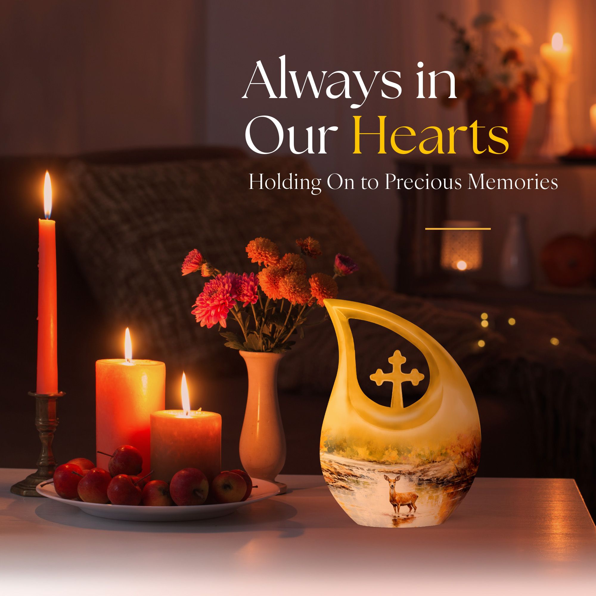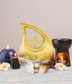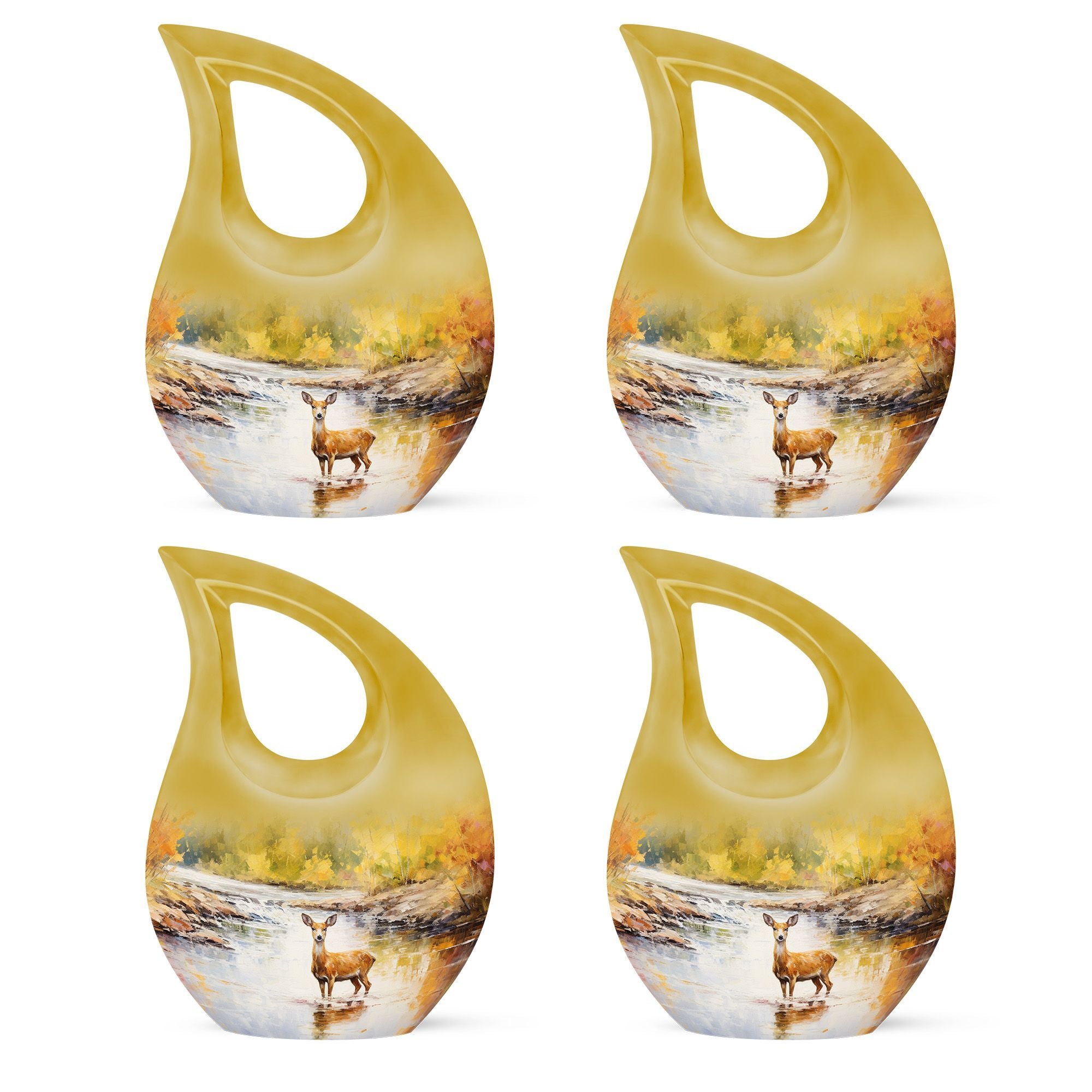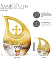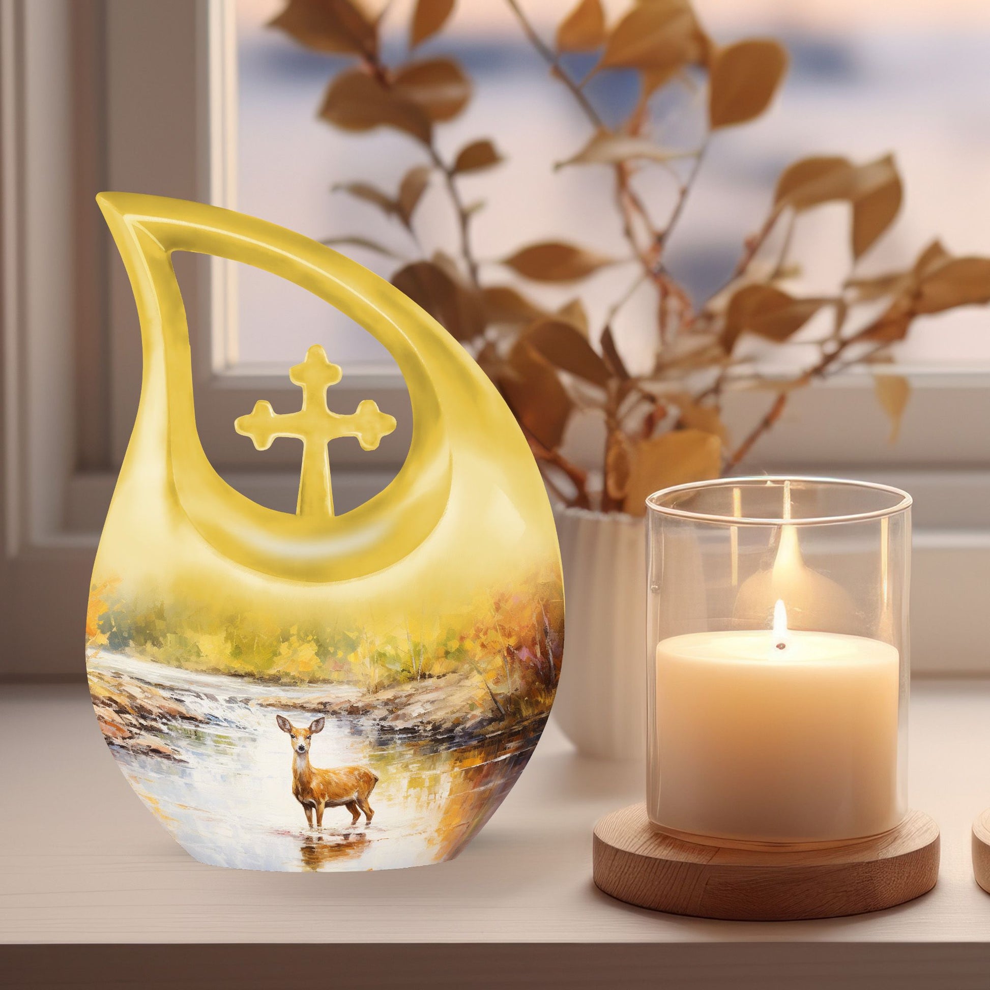 Surround your loved one's eternal resting place with gentle reverence using our Deer Urn. This sophisticated adornment is an ideal piece symbolizing eternal peace and tranquility. Handcrafted from aluminium, this large urn stands 10 inches tall and is capable of holding up to 200 cubic inches of ashes, ensuring a stately memorial for your cherished one. Not merely a burial urn, it can be a discreet addition to a garden or other sacred space, subtly soothing the raw wounds of loss with its calming 'Cross Drop' theme. The package provides a soft velvet pouch for secure containment of remains, enhancing its value beyond ordinary cremation urns. Personalize this Garden Urn for Ashes with engraved names as a unique, enduring tribute to your loved one. Weighing just 3.3 pounds, it offers a light yet solid ceremonial memento. This lasting guardian of memory stands apart as a preferred choice amidst personalized urns for ashes.