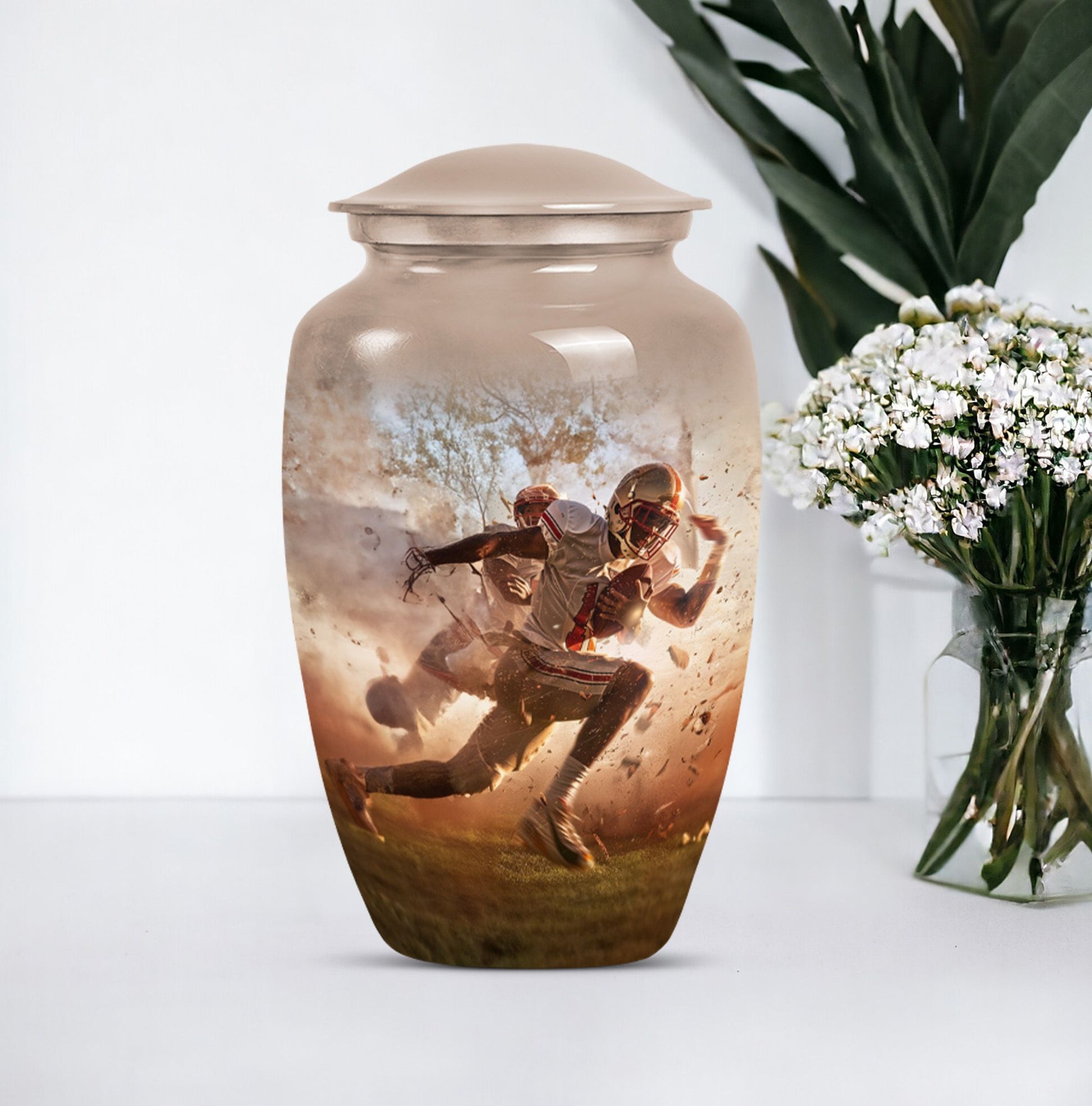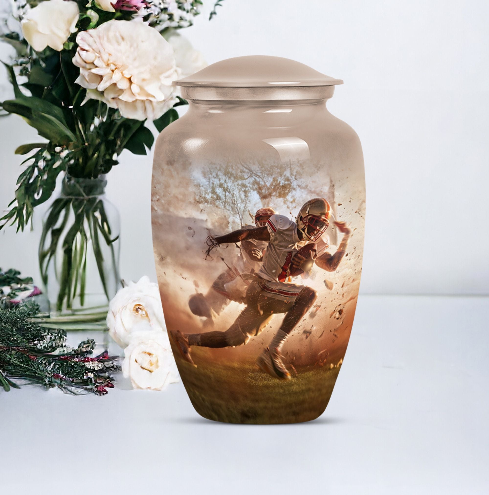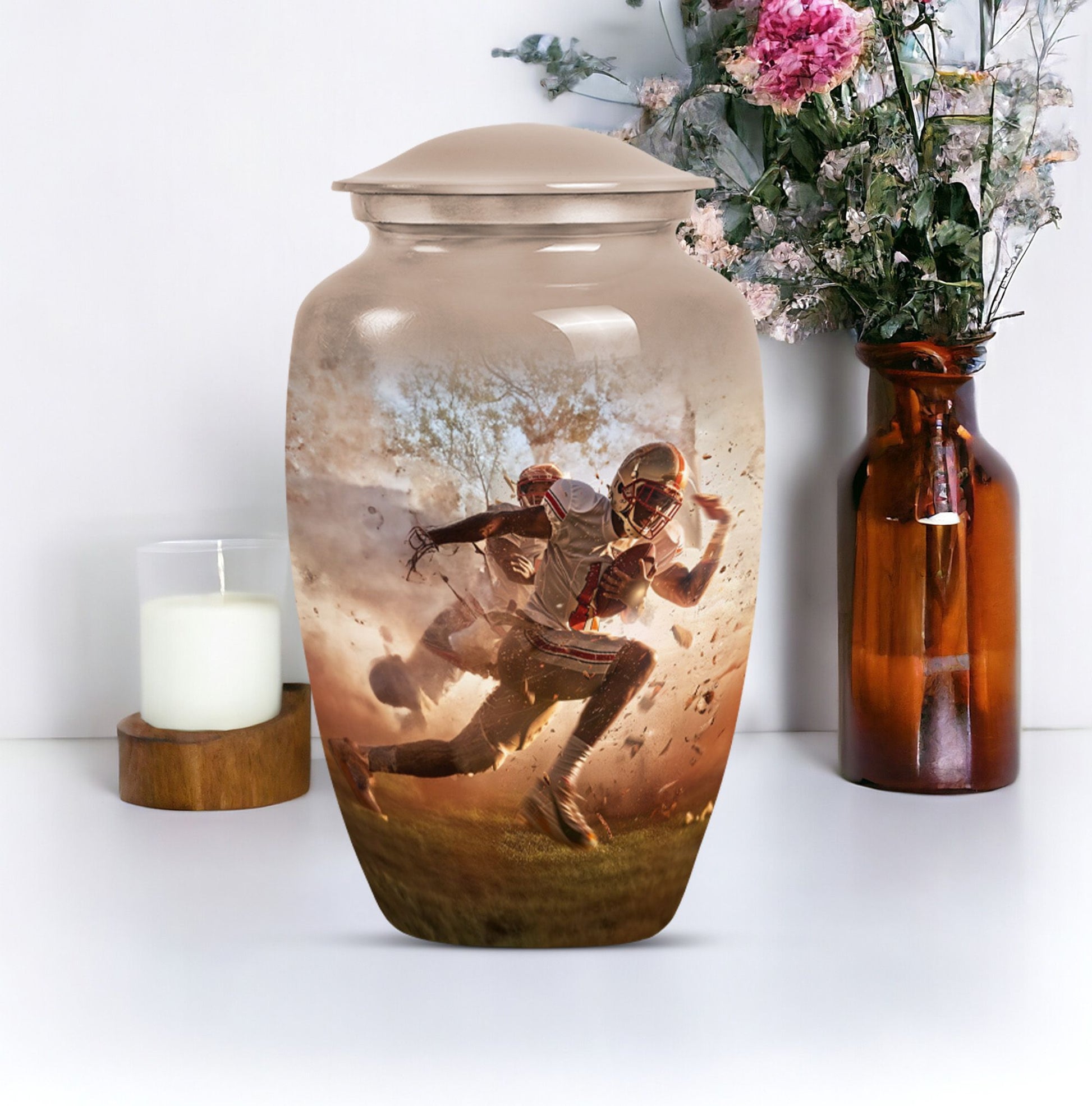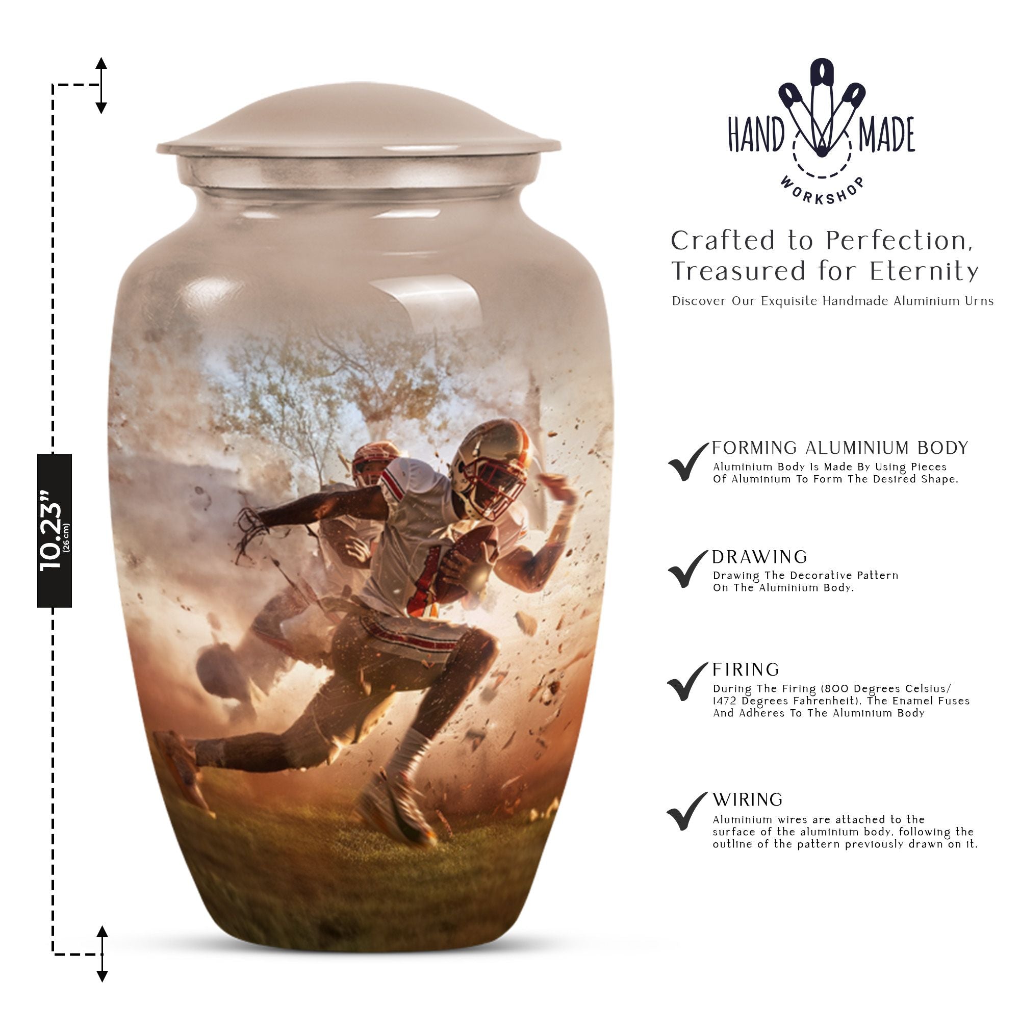 Discover a notable solution for your sacred memorial needs with our 10-inch classic football Urn. Swept in an abstract theme, this weighty, 3.3-pound large urn is skillfully crafted from durable Aluminium and has an impressive capacity of 200 cubic inches - suitable for adult cremation ashes. With dimensions standing at a dignified 10 inches in height, this funeral burial urn is an elegant yet practical tribute to your loved ones. To add a personal touch, there's also the option to tailor your urn with engraved names. You'll also receive a plush velvet pouch for tasteful containment of the ashes. Our football urn brings together the love for sport and the solemnity of life's inevitable finale. Providing a memorable receptacle for human ashes, this urn is truly a classic piece of ceremonial supplies. Recommended keywords for further search include 'memorial urns' and 'memorial large urns for human ashes.'