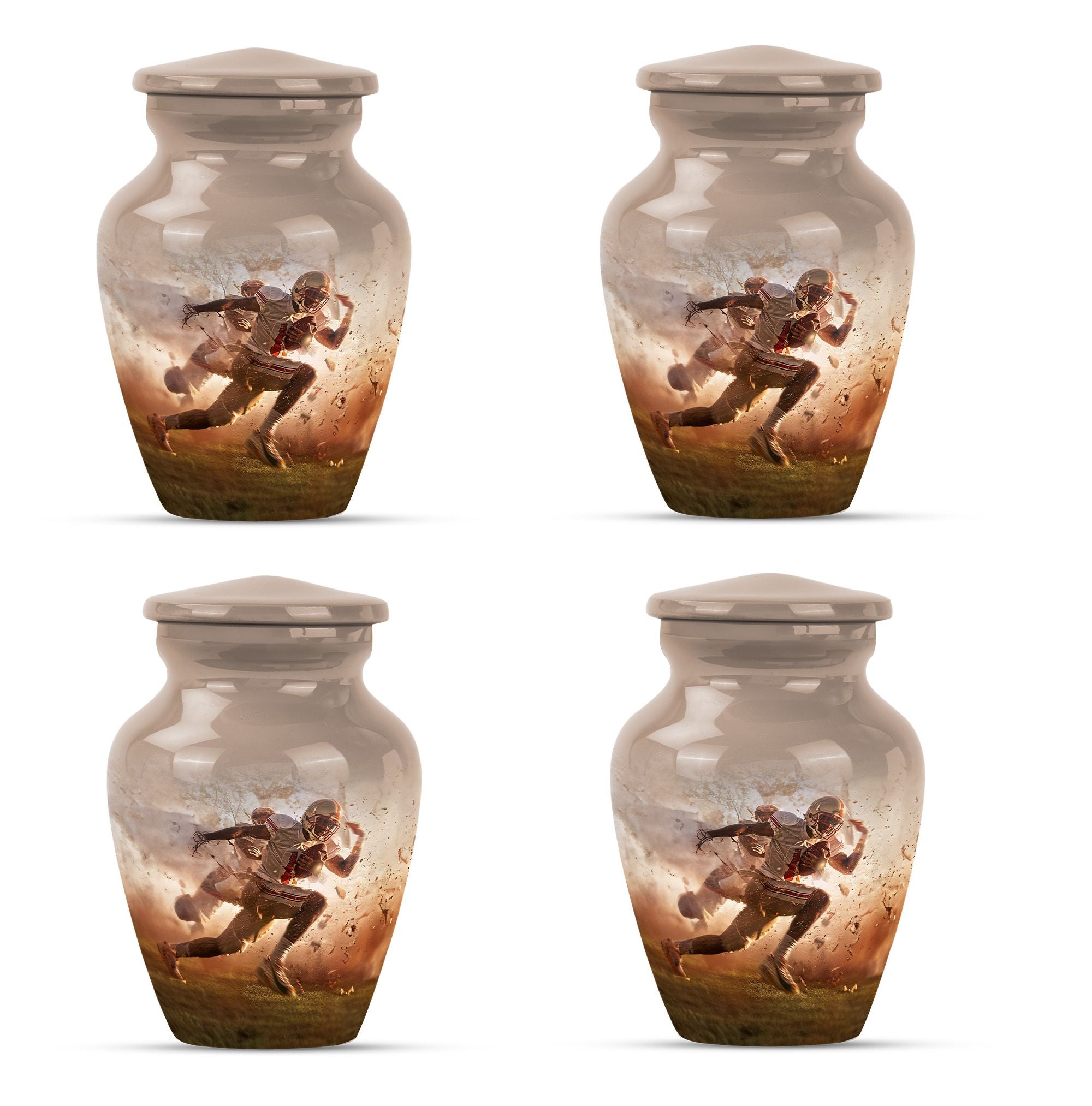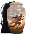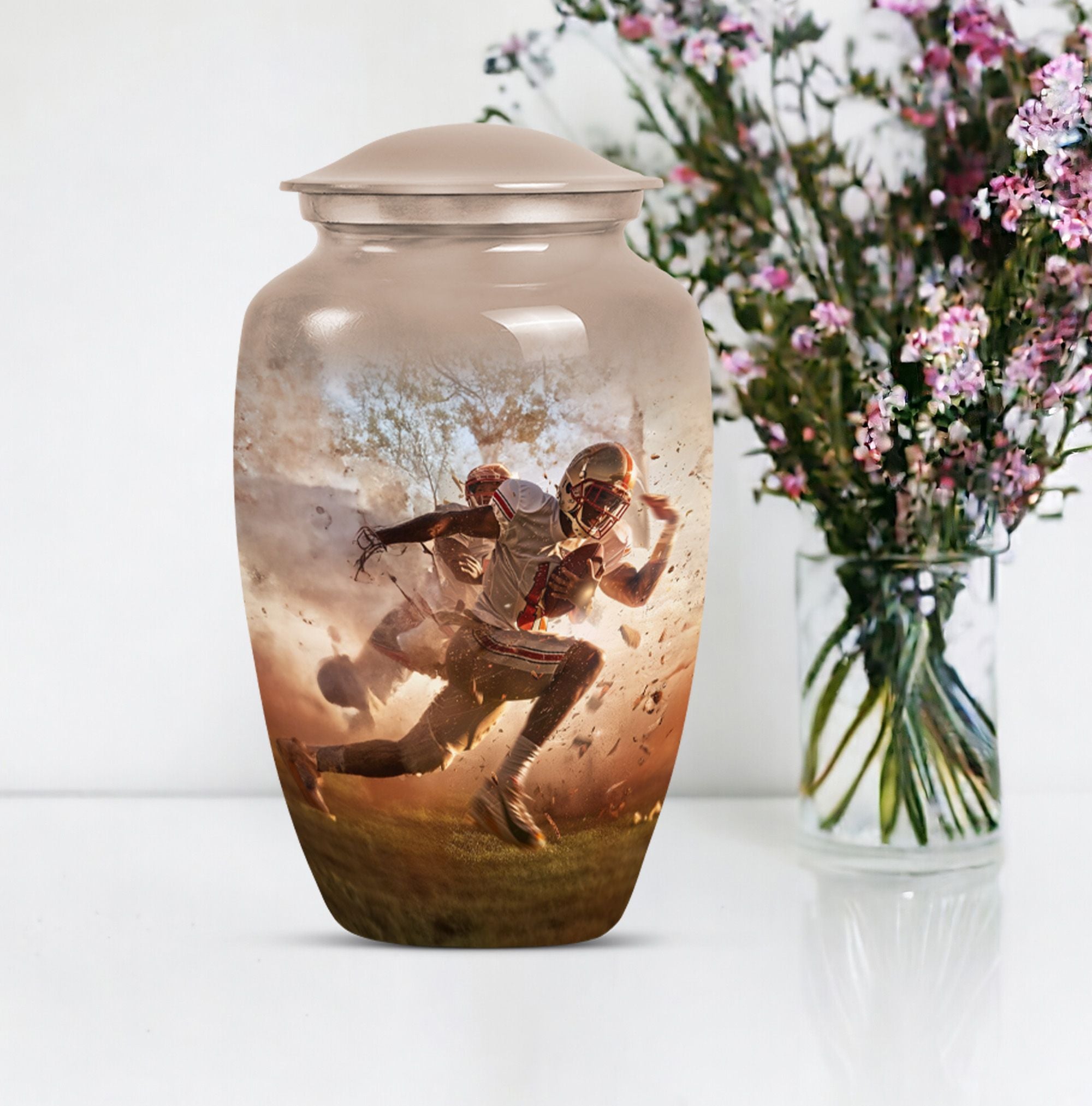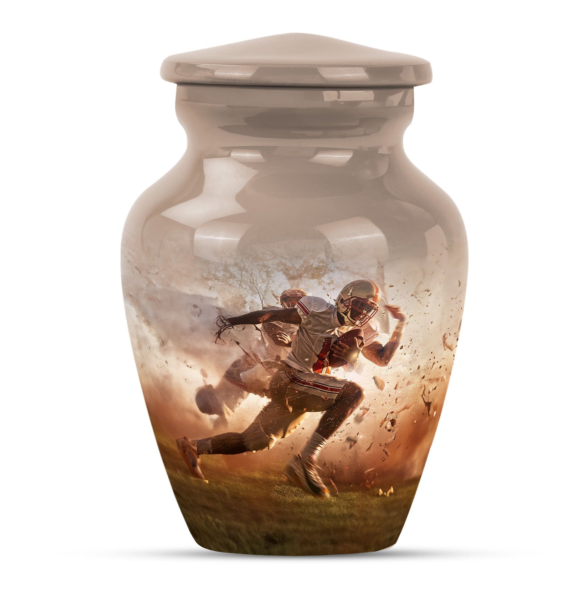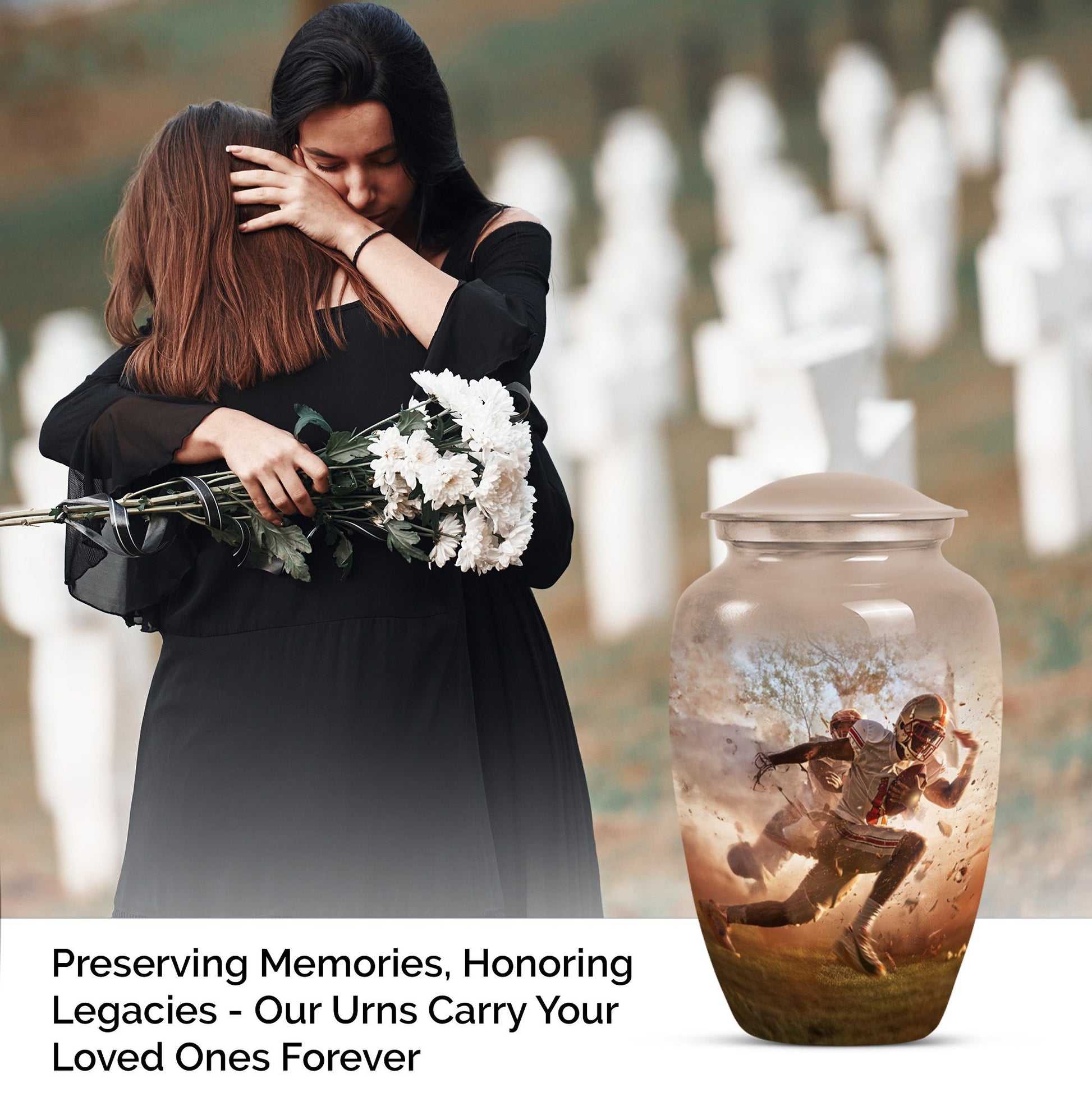 Discover a notable solution for your sacred memorial needs with our 10-inch classic football Urn. Swept in an abstract theme, this weighty, 3.3-pound large urn is skillfully crafted from durable Aluminium and has an impressive capacity of 200 cubic inches - suitable for adult cremation ashes. With dimensions standing at a dignified 10 inches in height, this funeral burial urn is an elegant yet practical tribute to your loved ones. To add a personal touch, there's also the option to tailor your urn with engraved names. You'll also receive a plush velvet pouch for tasteful containment of the ashes. Our football urn brings together the love for sport and the solemnity of life's inevitable finale. Providing a memorable receptacle for human ashes, this urn is truly a classic piece of ceremonial supplies. Recommended keywords for further search include 'memorial urns' and 'memorial large urns for human ashes.'