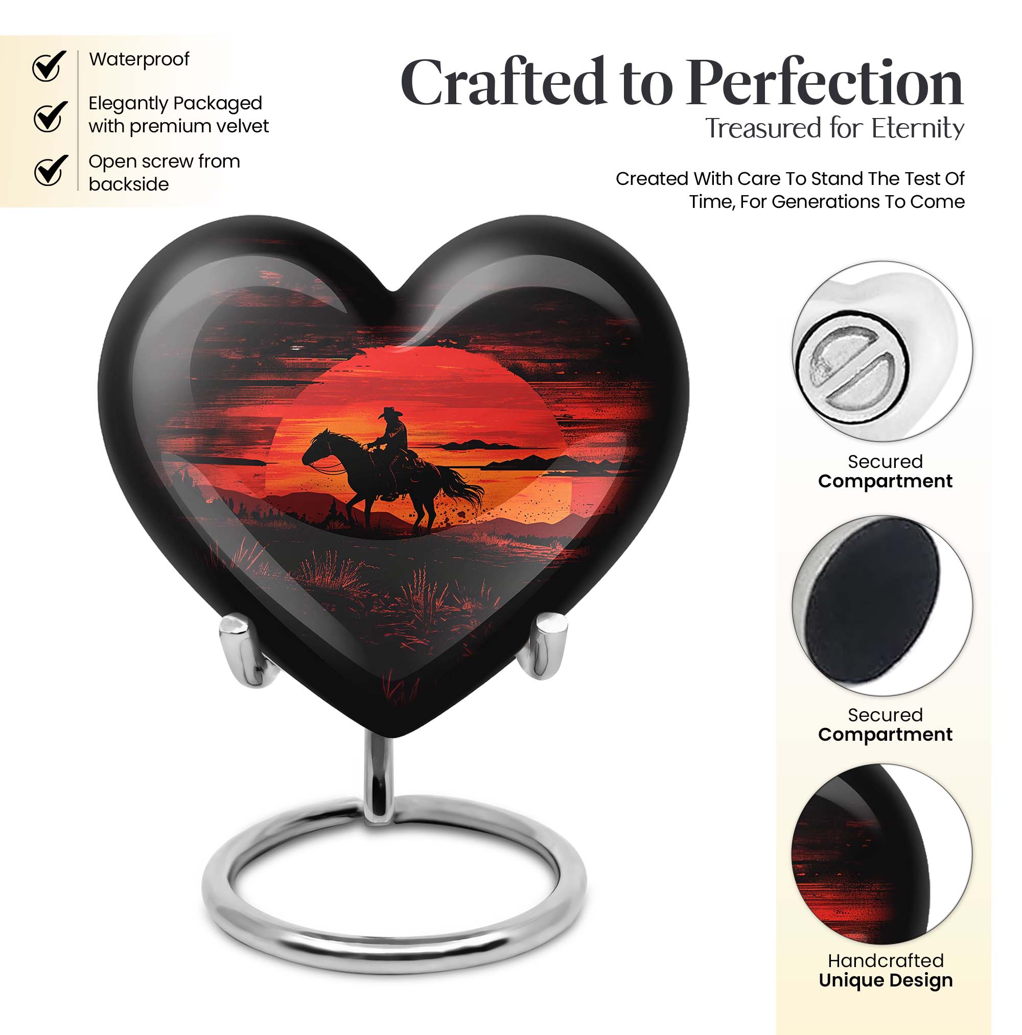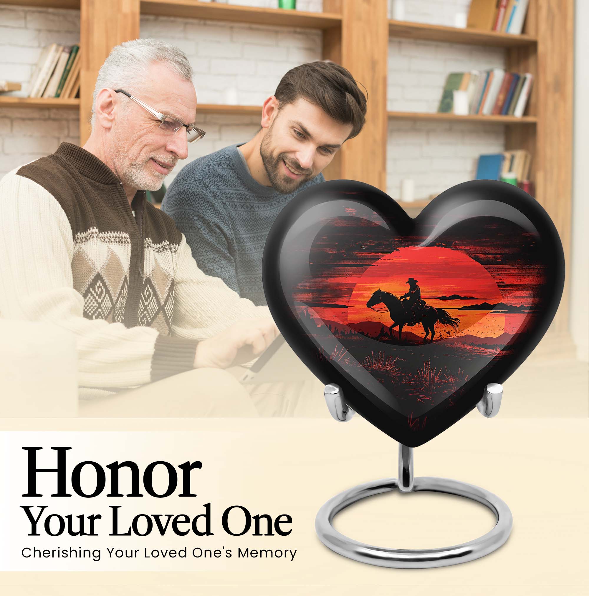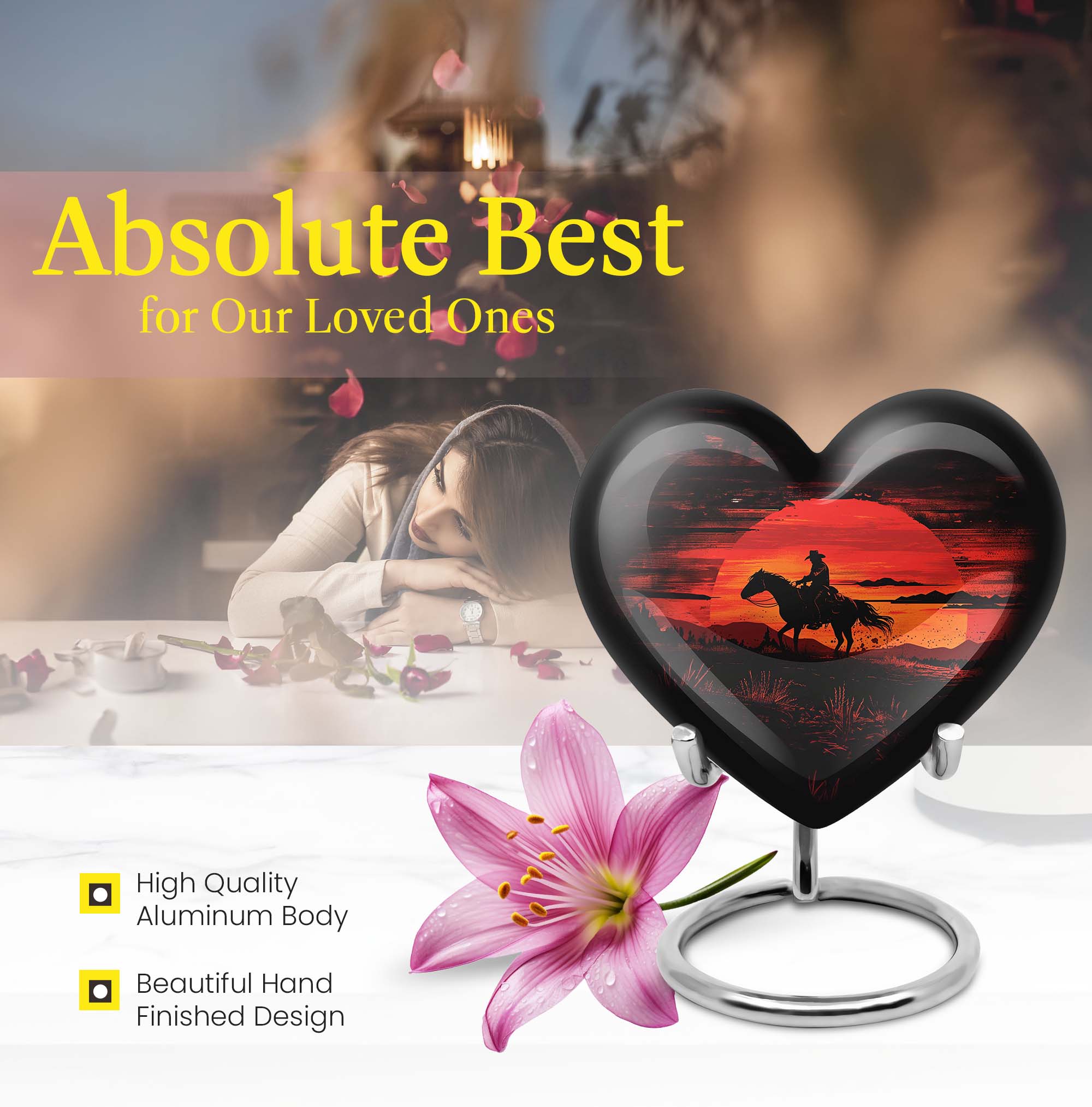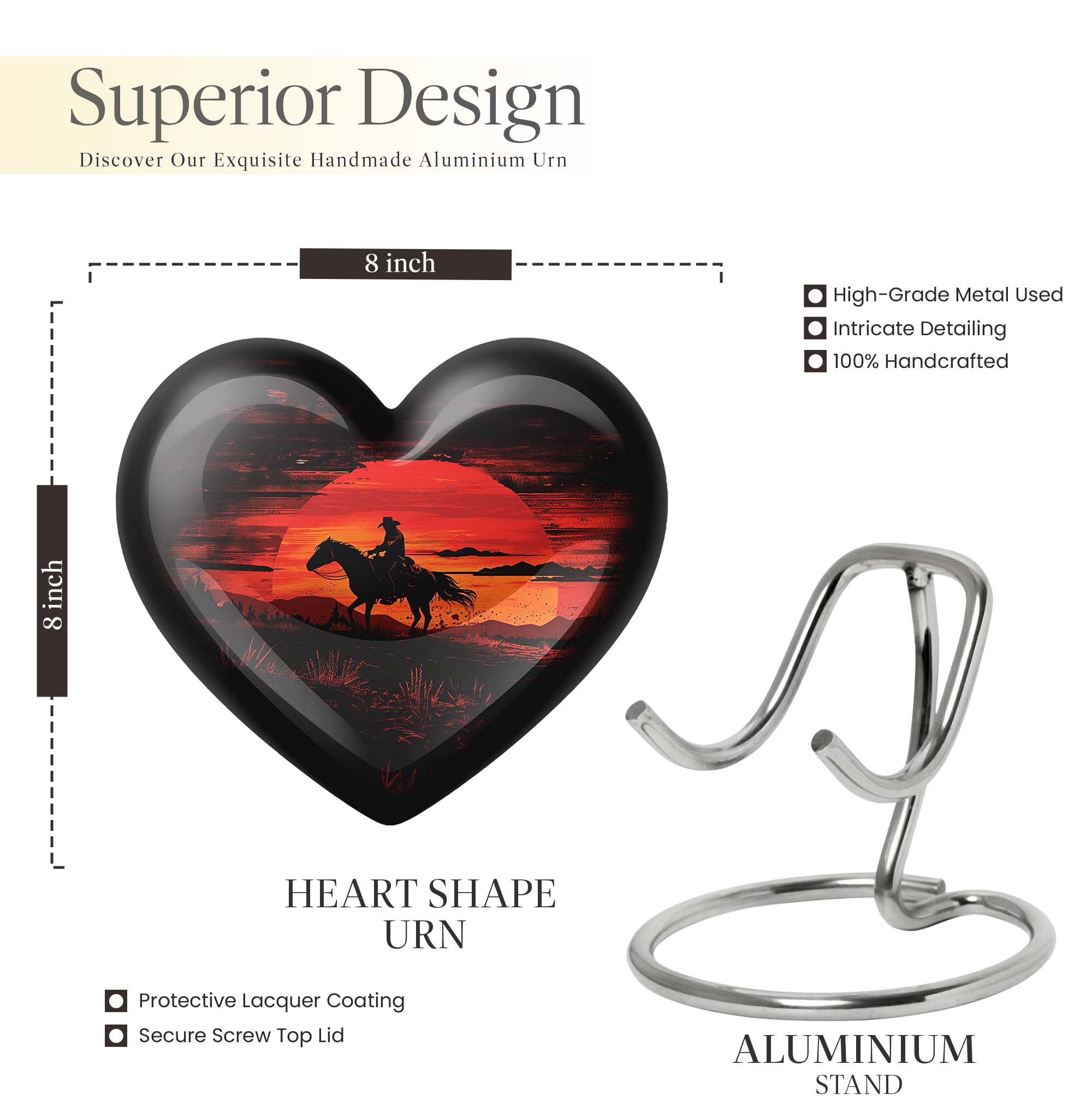Discover the supremely distinctive Heart Urn, an emblem of love and remembrance unlike anything else. This robust aluminium urn, measuring 10 inches with a weight of 3.3 pounds, can hold up to 200 cubic inches, making it suitable for adults. It's not just any 'large urn'; its unique 'butterfly' theme imbues it with grace, elegance, and profound symbolism. Versatile in its utility, this 'cowboy urn' can serve as a meaningful addition to funeral ceremonies or as a distinctive and respectful home for your loved one's ashes. The urn offers you the option for personalization, letting you engrave names to preserve your loved ones' memory uniquely. Along with the urn, you also receive a velvet pouch for safe containment of the ashes. This Heart urn also qualifies for 'memorial urns,' 'funeral unique urns for human ashes,' and 'cremation urn burial' categories.