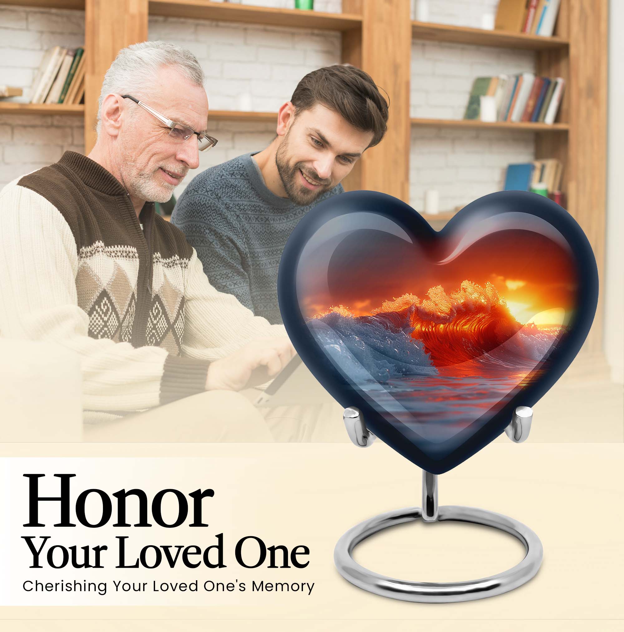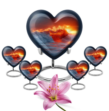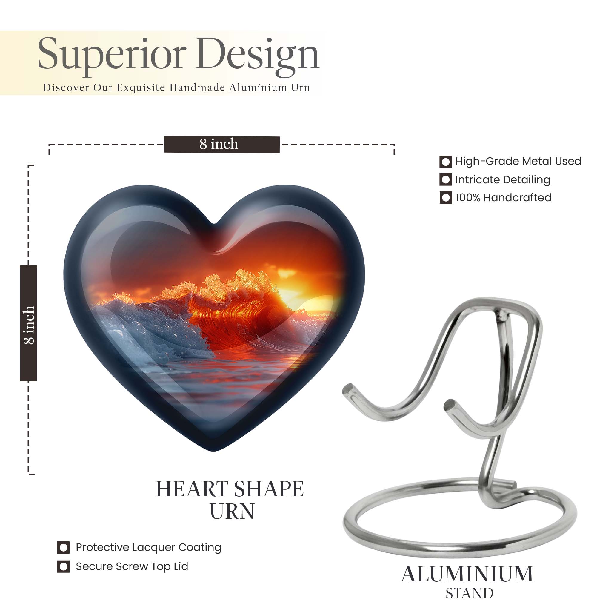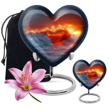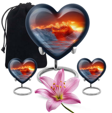 Presenting our meticulously crafted Ocean Waves Urn, an ideal choice for those seeking cremation urns in the Memorial Ceremony Supplies category. This large urn stands at 10 inches in height and weighs a sturdy 3.3 pounds - a fitting tribute for your beloved adult female. The ethereal ocean theme resonates with the transformative journey of life and ascends its aesthetic appeal. Made from high-quality aluminum, the urn possesses a capacity of 200 cubic inches, ensuring ample space for ashes. For those who seek a more personal touch, you can customize the urn with engraved names, making it genuinely unique. Your package will also include a velvet pouch, serving as a respectful container for the ashes. Whether you're searching for 'burial large urns', 'urn ash adult human ash', or 'cremation ashes containers', the versatility of our Ocean Waves Urn meets varied needs. This high-integrity urn is more than a product; it's a beloved memory.