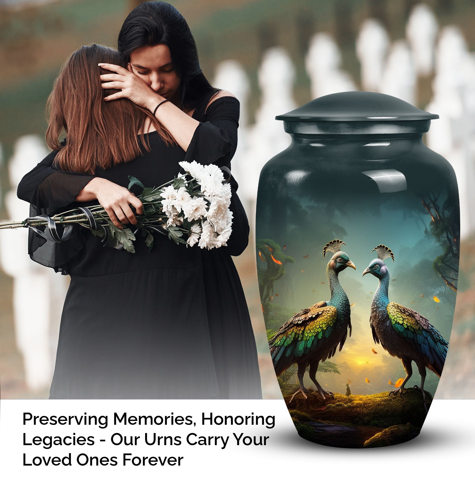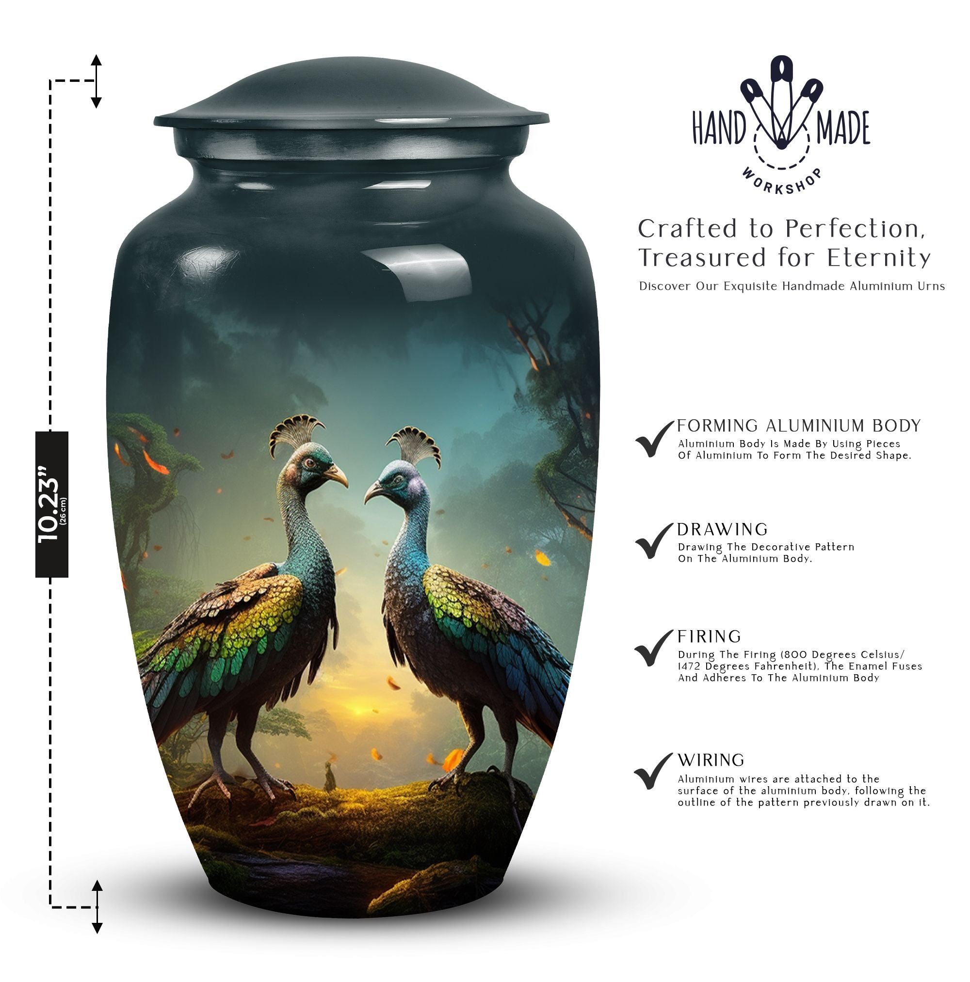 Discover our Peacock Medium-URNs, a unique, premium choice among cremation urns for human adult female ashes. Each metal urn showcases an exquisite, hand-crafted vision of grace and dignity. Perfect for the final resting place of your beloved one, our urns serve as a touching tribute and lasting memory. These custom urns are not only intricately designed but are also durable, promising to preserve cherished memories for ages. Ideal for adult ashes, they stand out with their remarkable beauty, symbolizing the majesty of life even in the face of death. Their timeless elegance is rarely found in other burial options, making them unparalleled funeral urns. Experience a new level of memorabilia with these unique urns designed for ages. Let your loved one's memory continue to shine bright like the Peacock Medium-URNs - a beacon of love in your heart.