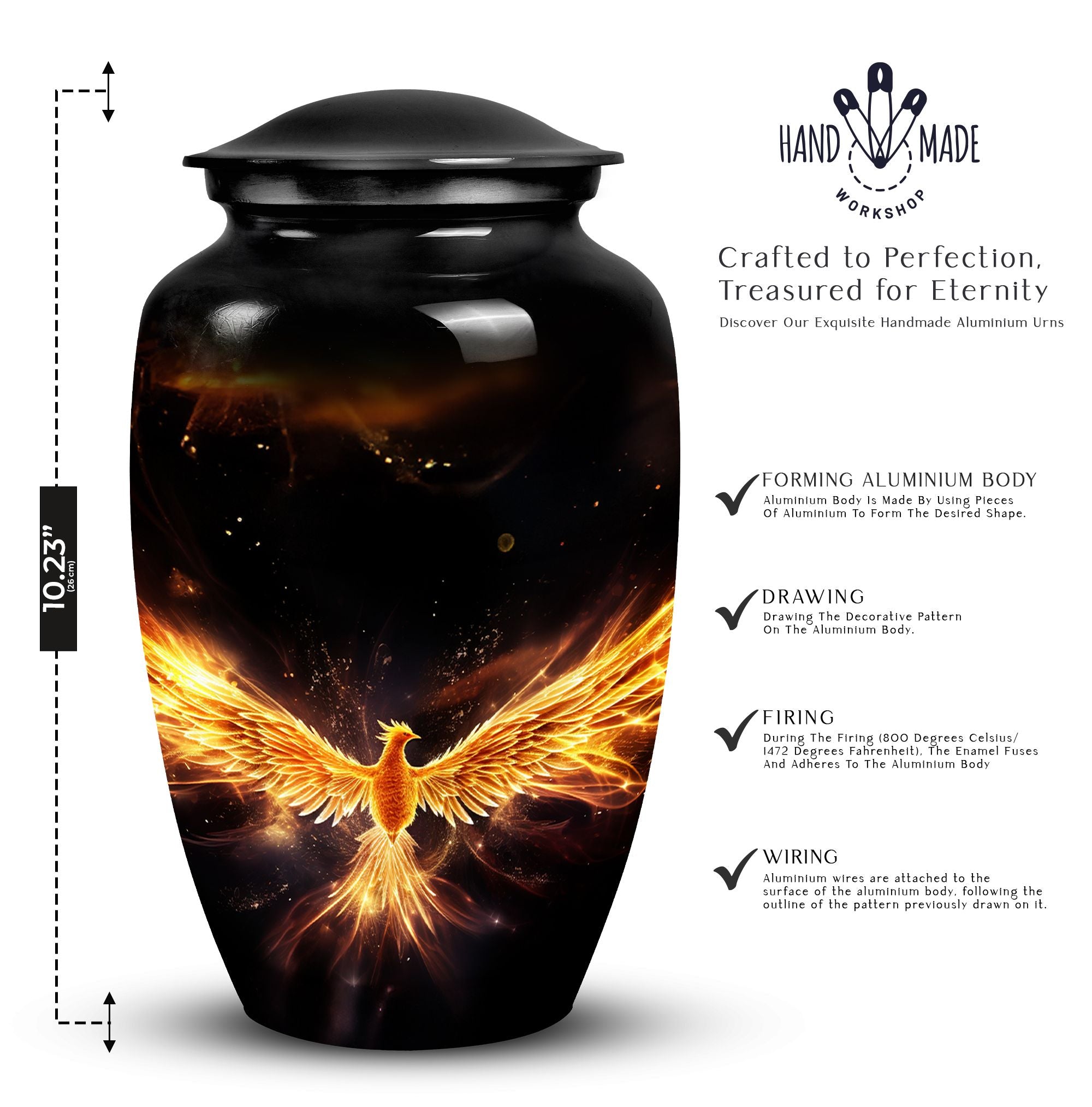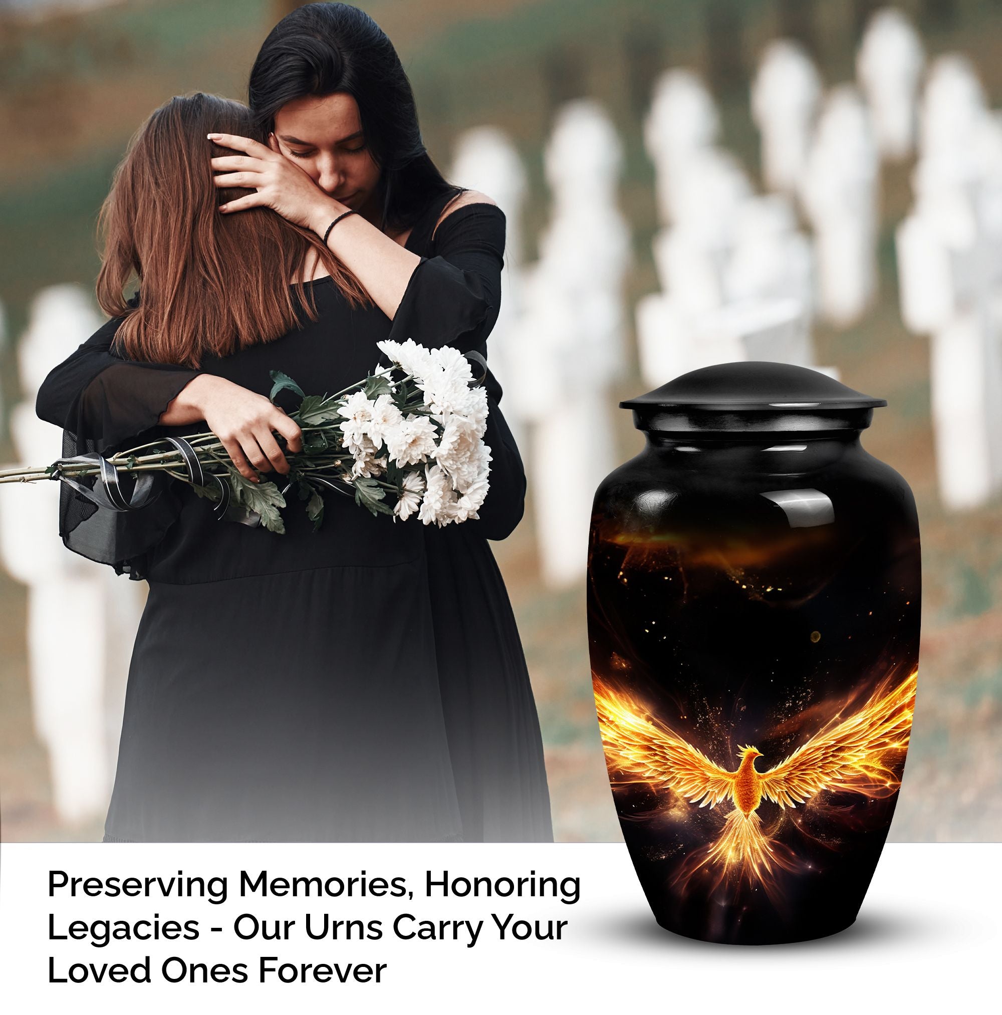 Imagine a beautiful Phoenix Urn being the resting place for your treasured memories. Designed to hold the remains of an adult man or woman with grace and respect, this urn displays a striking appearance that invokes a soothing and peaceful aura. Such unique urns for human ashes subtly reflect the character of your departed loved one, symbolizing their resilience and indomitable spirit, much like the legendary phoenix. This urn is elegant and secure, ensuring ashes are kept safely within its embrace. Ideal for mom's ashes or a cherished family member's remains, it serves as a poignant memorial and a touching ceremony supply. Important: customers often search for 'cremation container' when looking to procure this kind of product. Each interaction with this Phoenix Urn enriches the connection with your beloved and amplifies their enduring presence. Naturally flowing description punctuated by uncommon terms enhances the uniqueness and originality of this product. In loving memory, from ashes to beauty.