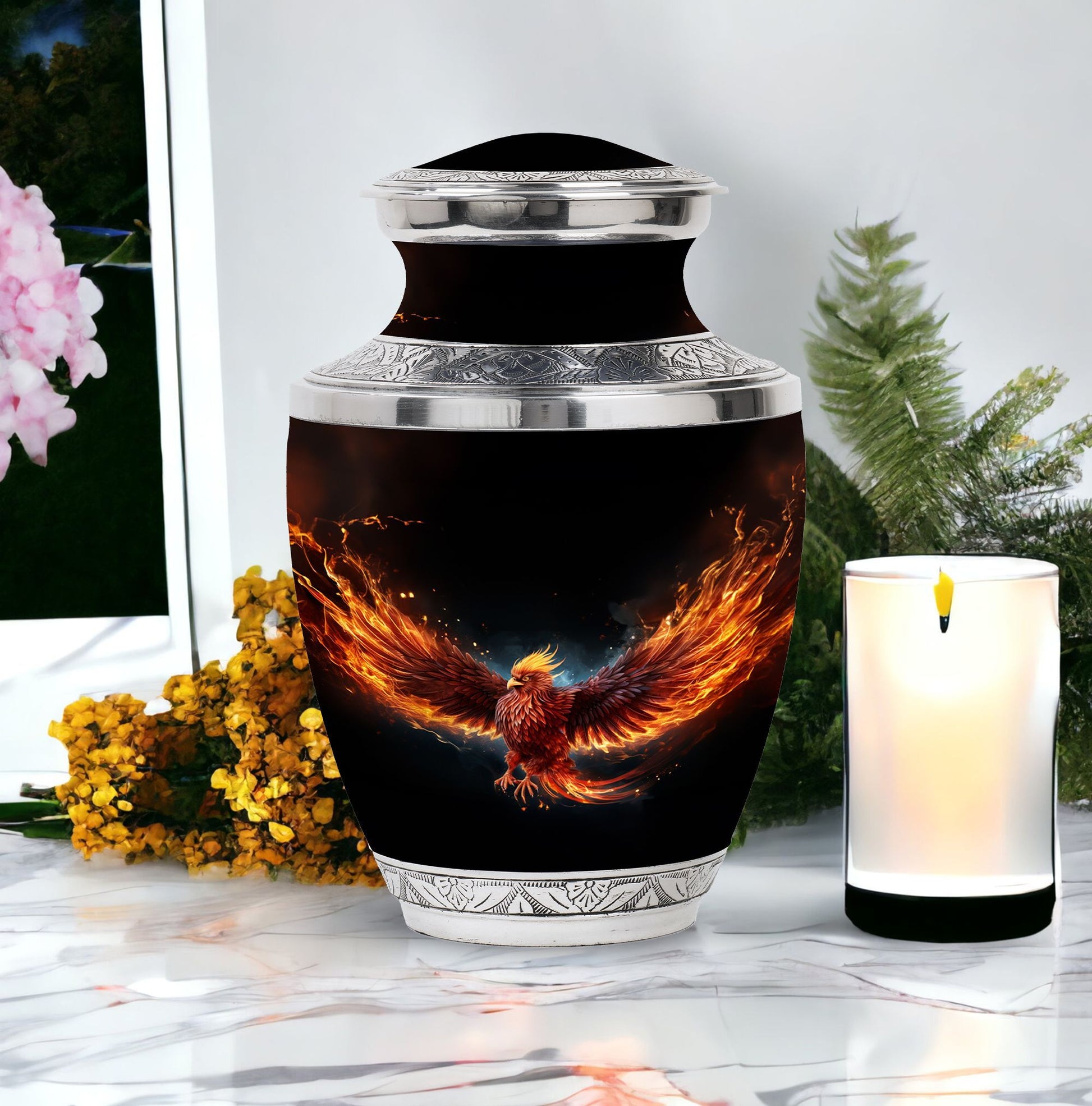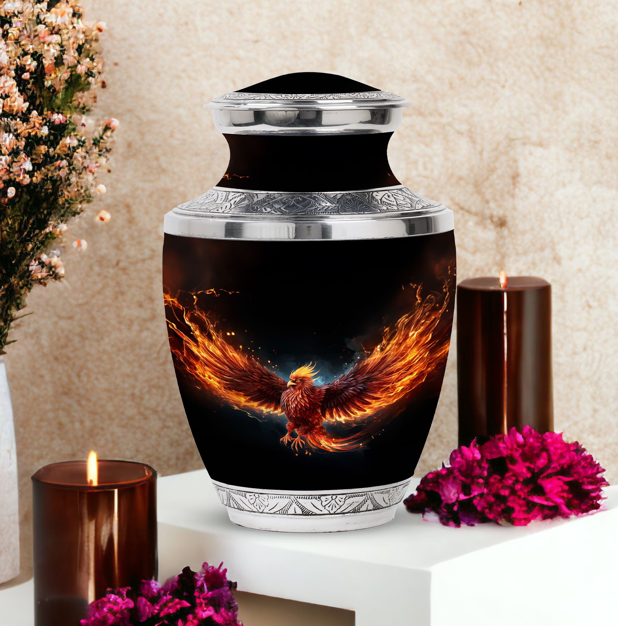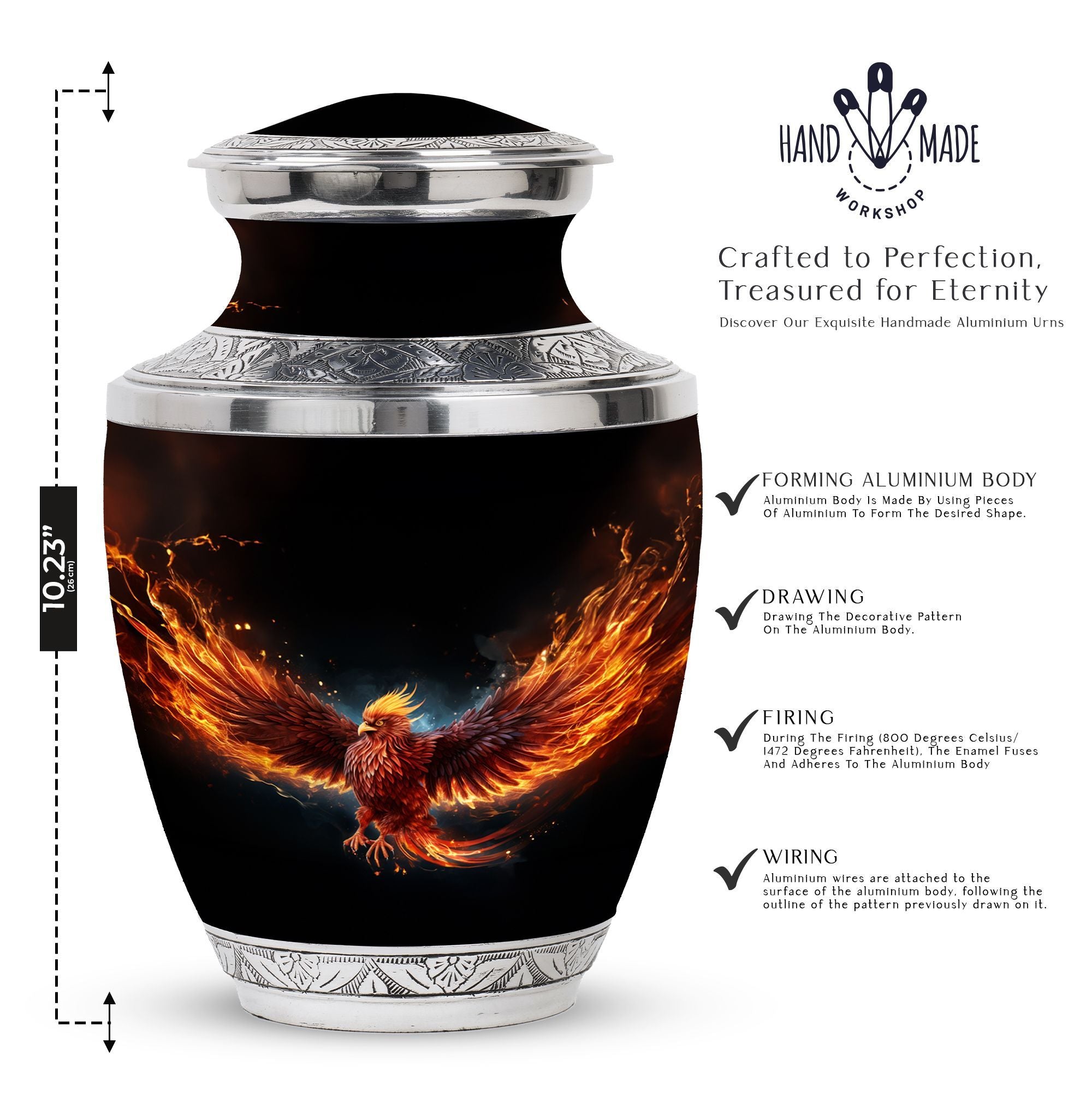 Treasure the memory of your loved ones with our Red Phoenix Urn. Exemplary in craftsmanship, this unique urn is a size of 3 inches, offering a large capacity of up to 200 cubic inches, ideal for containing ashes of an adult. Delicately crafted from resilient Aluminium, it boasts a grandiose height of 10 inches and weighs 3.3 pounds. The urn's classic style perfectly epitomizes eternal beauty and remembrance every time it's viewed. It includes a soft velvet pouch that provides consolidated containment for the ashes. For a more touching tribute, you can personalize it with engraved names. Our beautifully personalized including the Red Phoenix Urn is meticulously designed for adults, proving itself as one of the most unique, large cremation urns in the market.