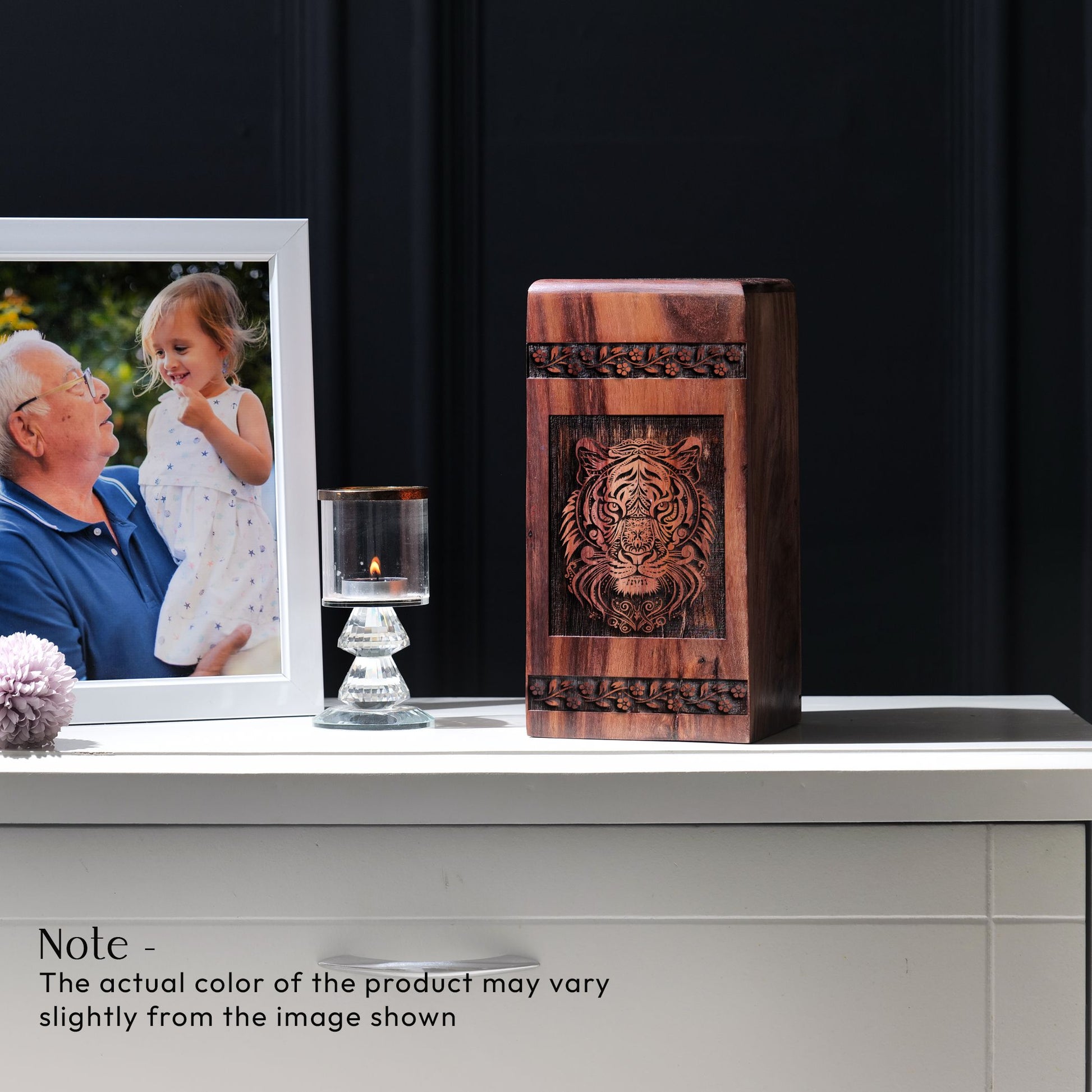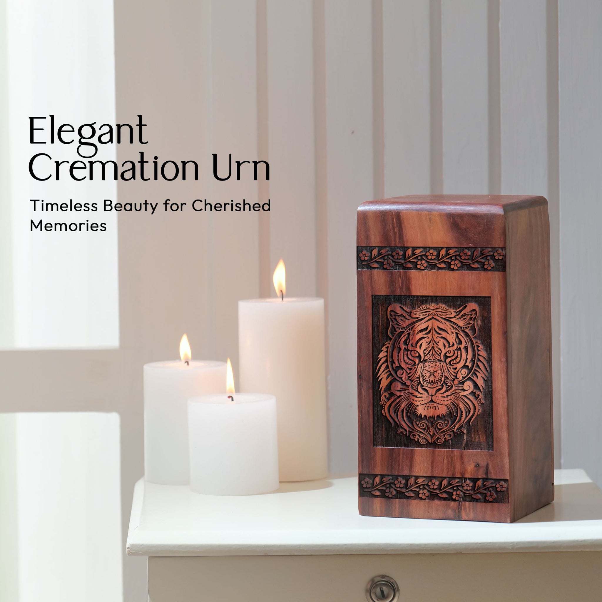 Cherish your loved one with our exquisitely carved Tiger Urn. This unique, masterfully crafted wooden cremation urn embodies elegance and place of solace that offers a symbolic tribute to honor the memory of your loved one. Our painstakingly designed urn is a timeless masterpiece, offering a balance of sophistication and sentimentality that makes it one of a kind in our collection. Specifically tailored for adults and seniors, this medium-sized urn can comfortably hold human ashes and can be easily ported around, offering you the chance to keep a cherished part of your loved one close. Its unique design also makes it suitable for ground burial. With 'Urns For Burial In Ground', 'Unique Urns' and 'Portable Urns For Human Ashes' among the most searched terms in the memorial ceremonial supplies category, our Tiger Wood Cremation Urn stands head and shoulders above its counterparts in providing a dignified resting place for those who have passed on. It’s more than an urn, it’s a reverence for those we hold dear.