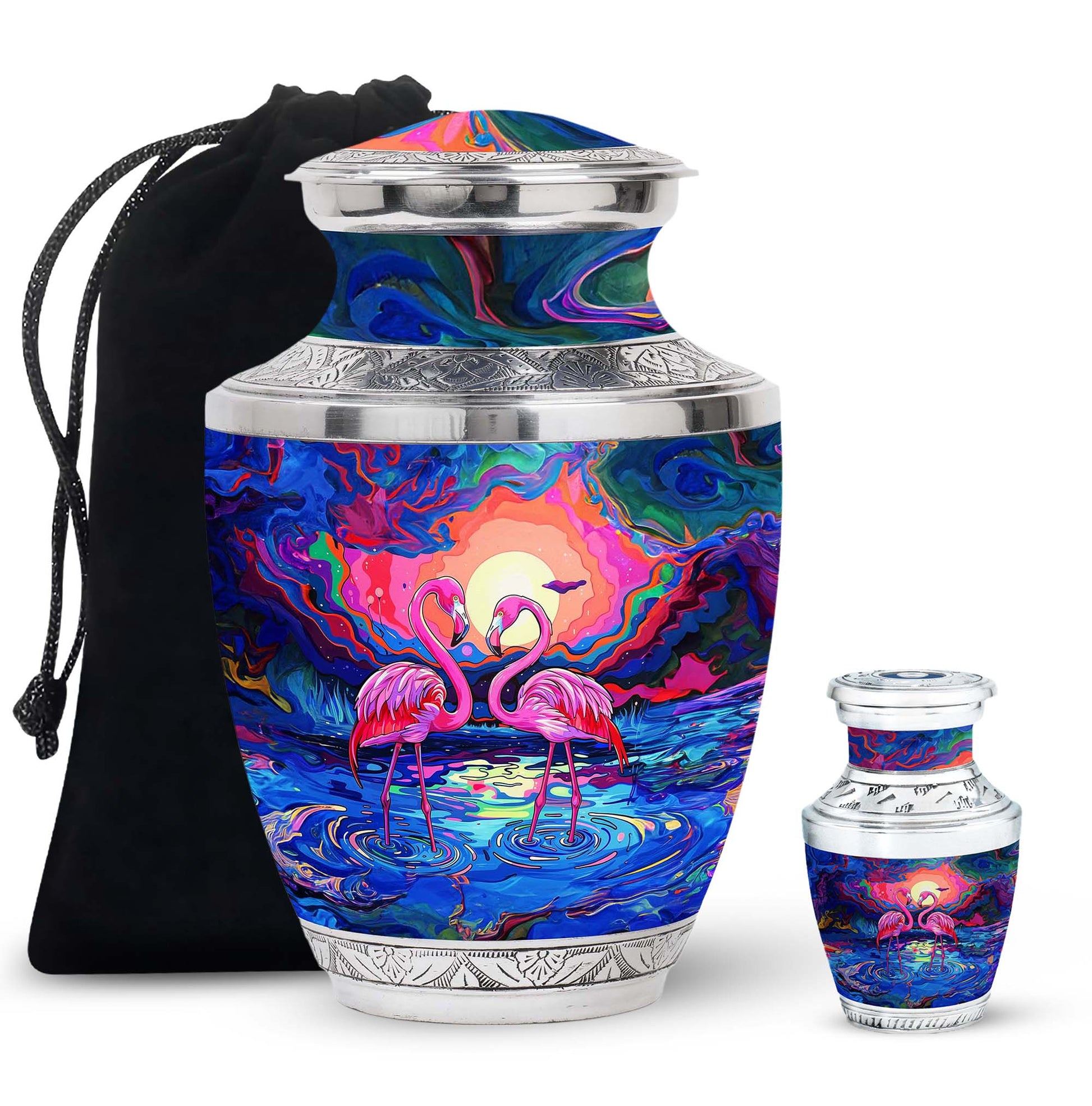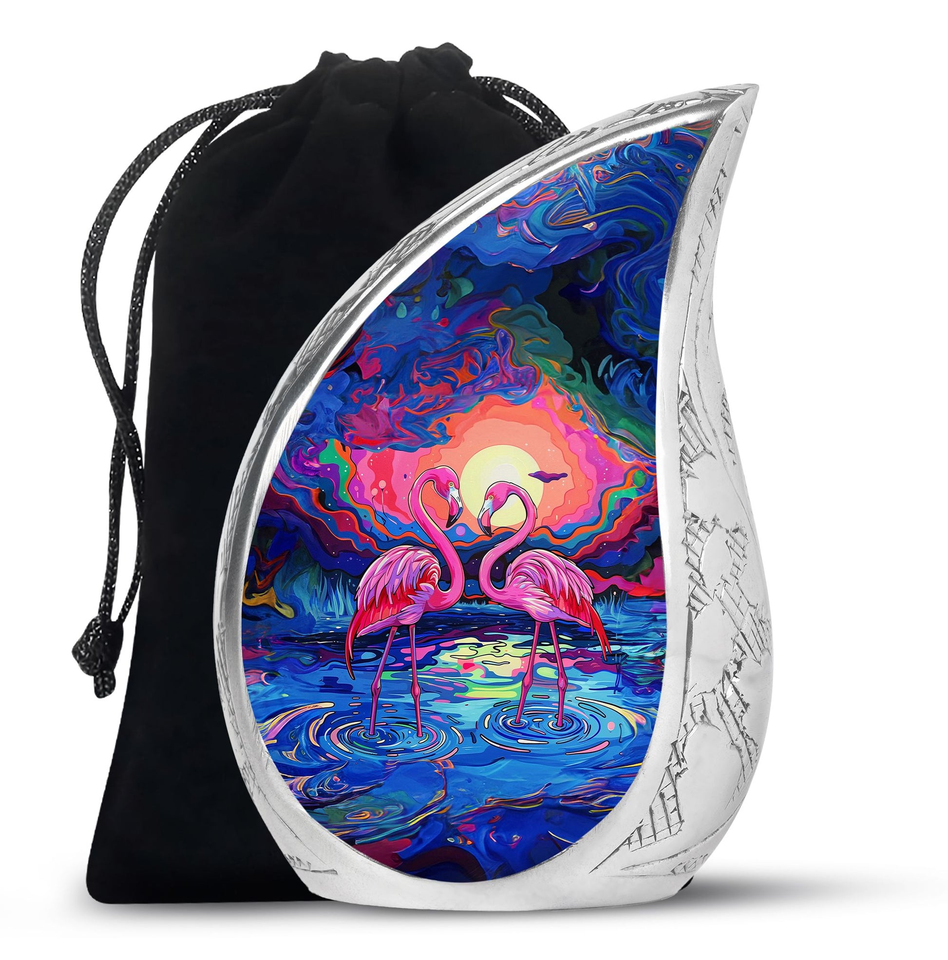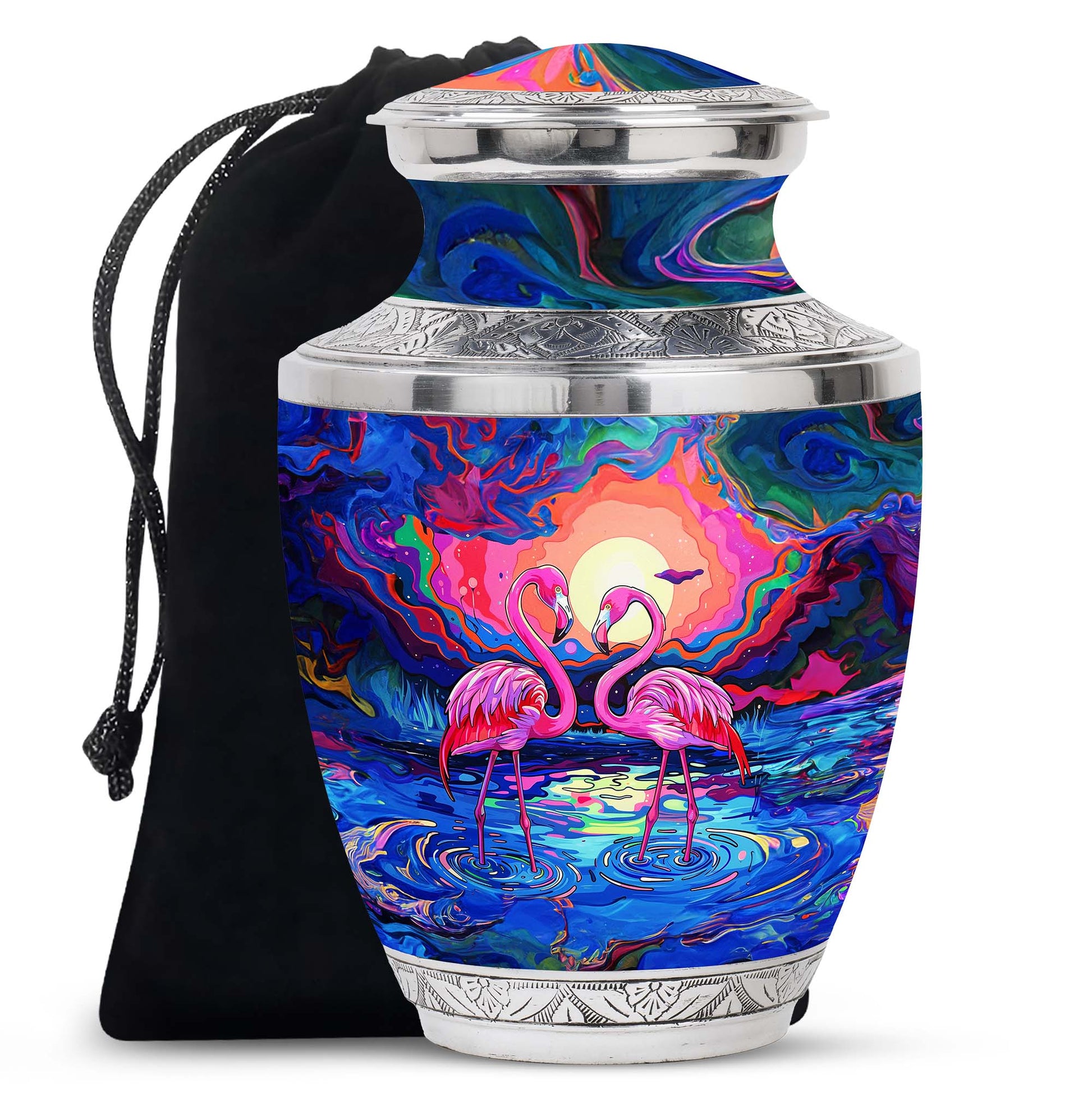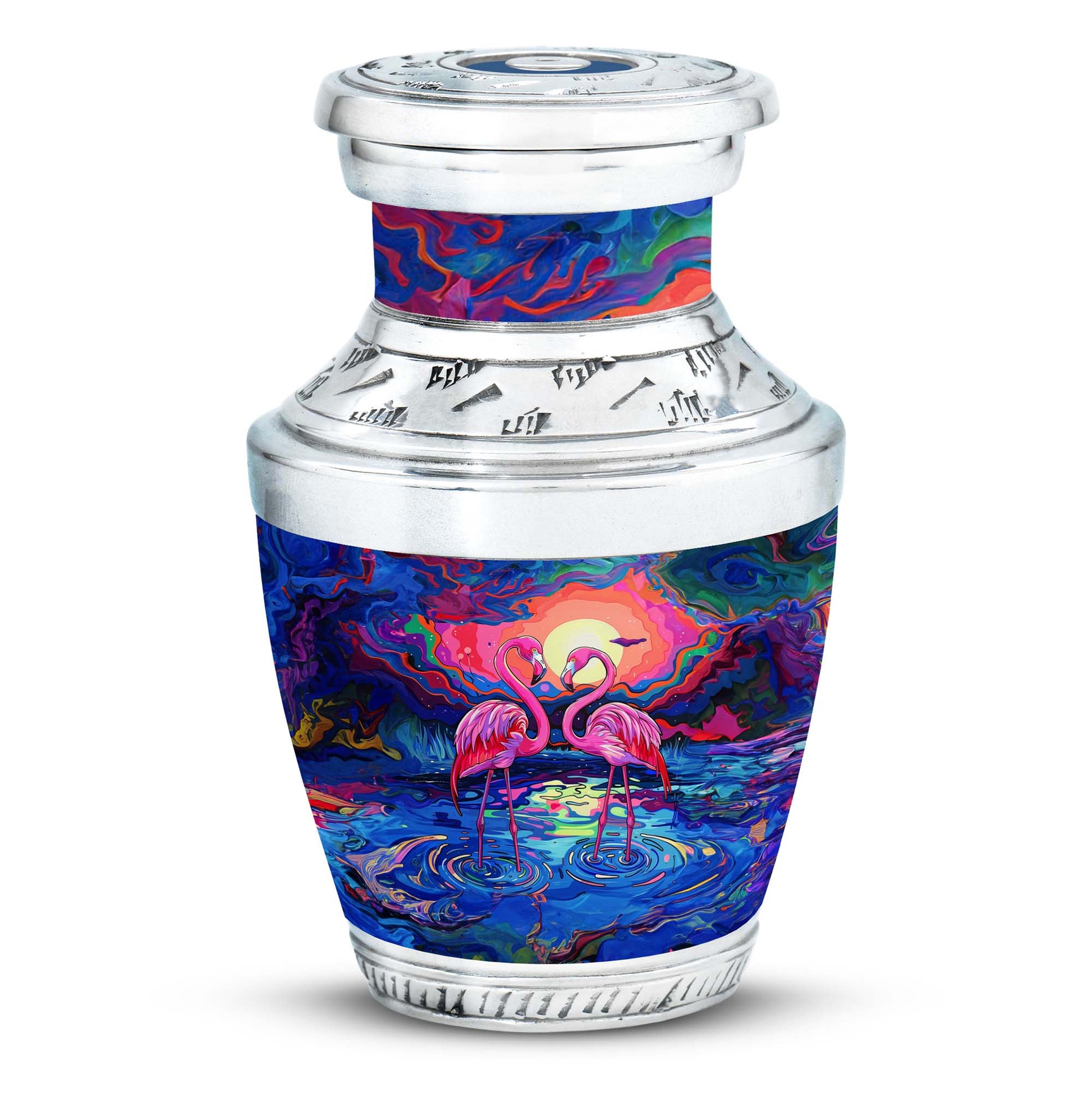 Crafted from durable aluminum, this urn is made to last while maintaining its artistic allure. Its polished finish and vivid flamingo artwork make it a perfect choice among burial urns for human ashes or cremation urns for burial. The secure screw-top lid ensures ashes are safely preserved, providing comfort and peace of mind. Ideal for use as a burial urn for ashes or urns for burial in ground, it offers elegance and protection when laid to rest. It can also be paired with small burial urns for adult human ashes for shared family memorials or companion tributes.