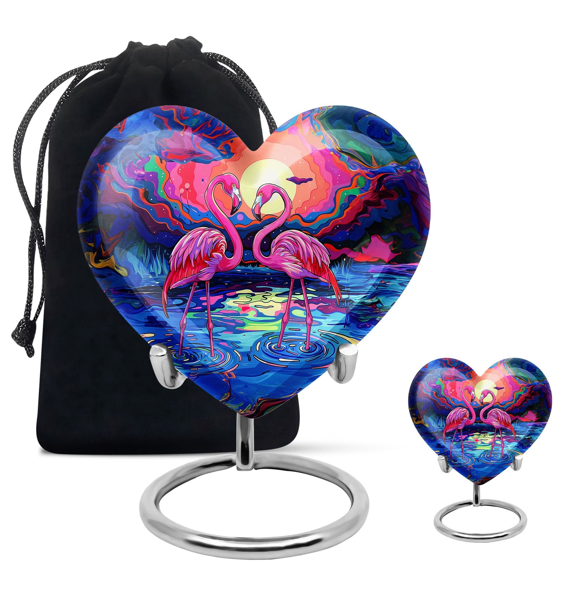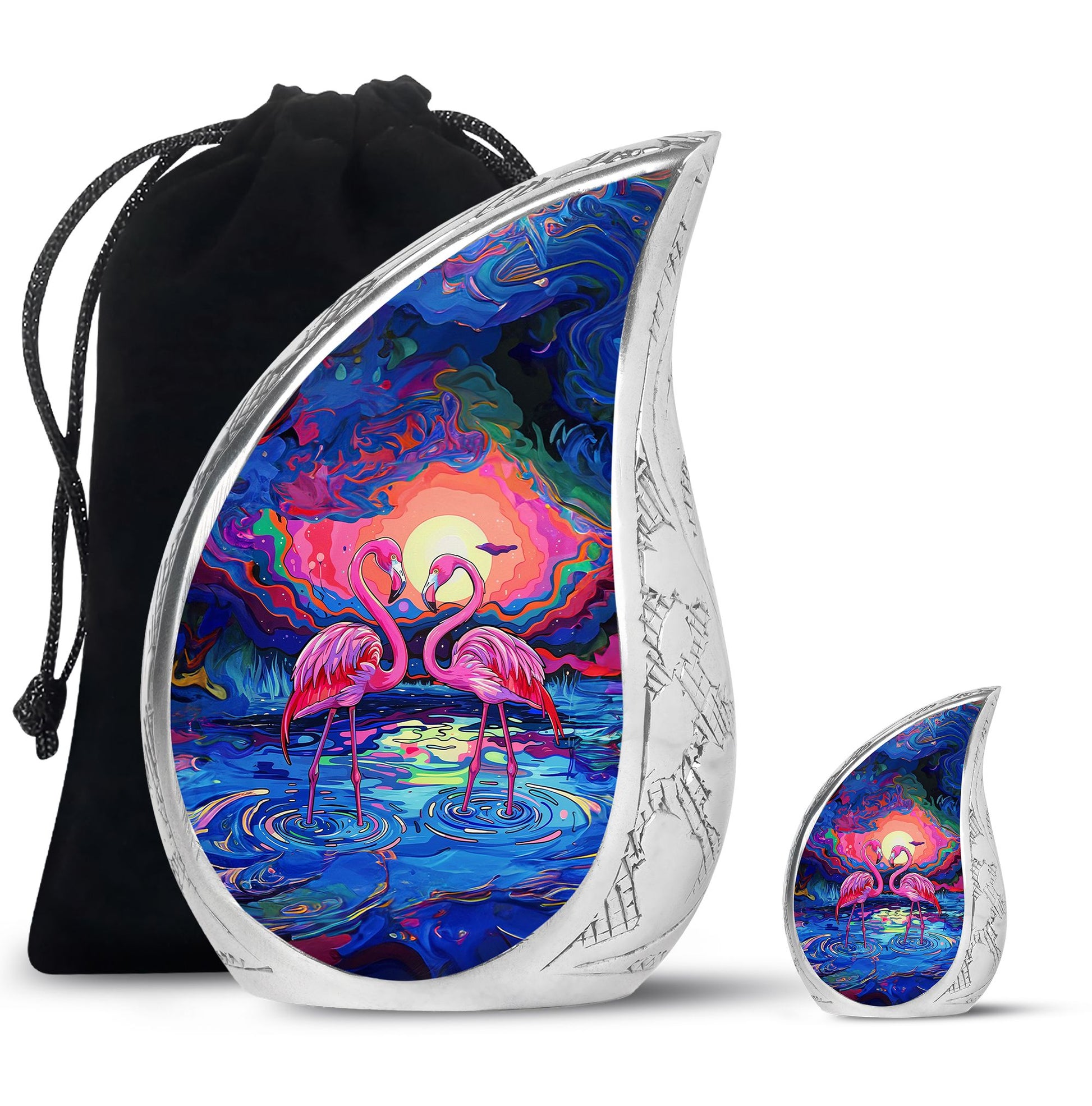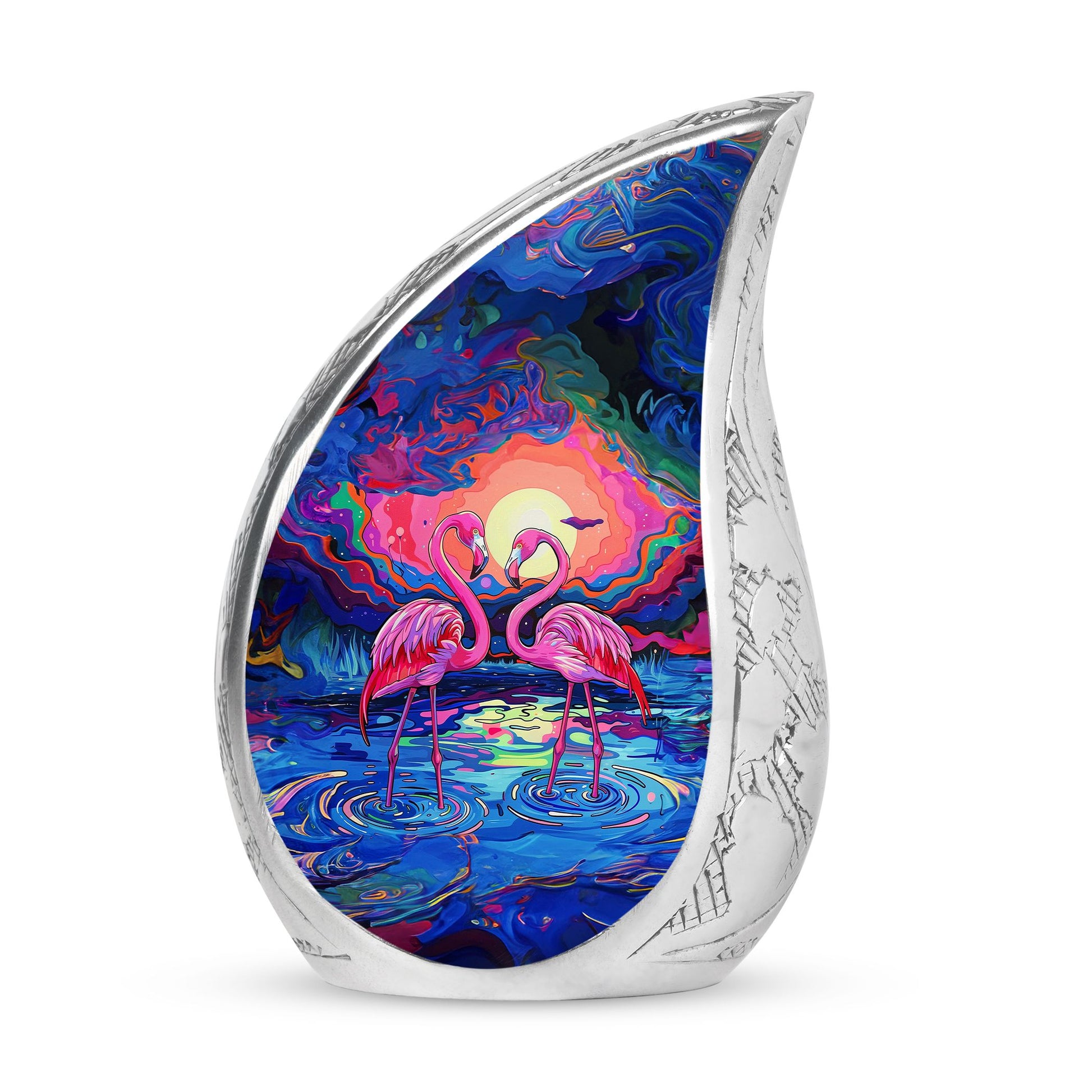 Crafted from durable aluminum, this urn is made to last while maintaining its artistic allure. Its polished finish and vivid flamingo artwork make it a perfect choice among burial urns for human ashes or cremation urns for burial. The secure screw-top lid ensures ashes are safely preserved, providing comfort and peace of mind. Ideal for use as a burial urn for ashes or urns for burial in ground, it offers elegance and protection when laid to rest. It can also be paired with small burial urns for adult human ashes for shared family memorials or companion tributes.