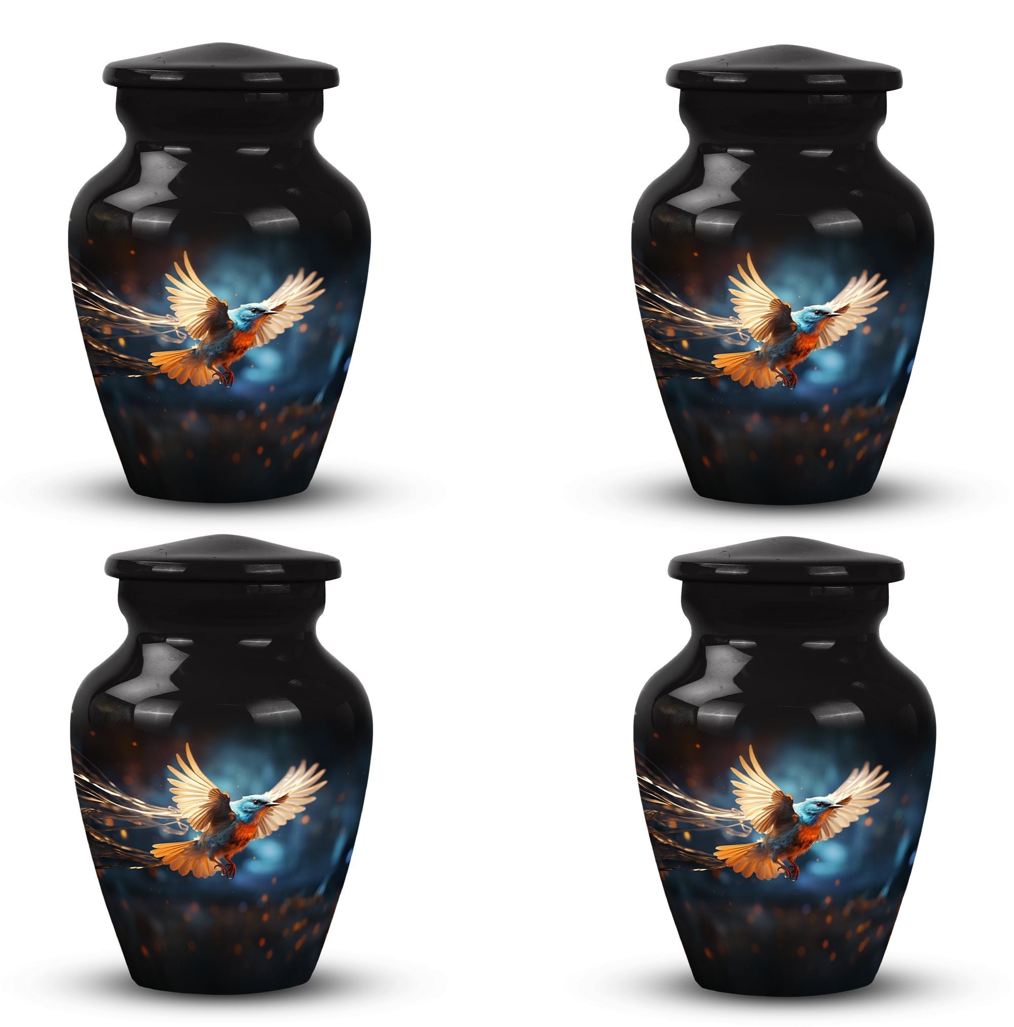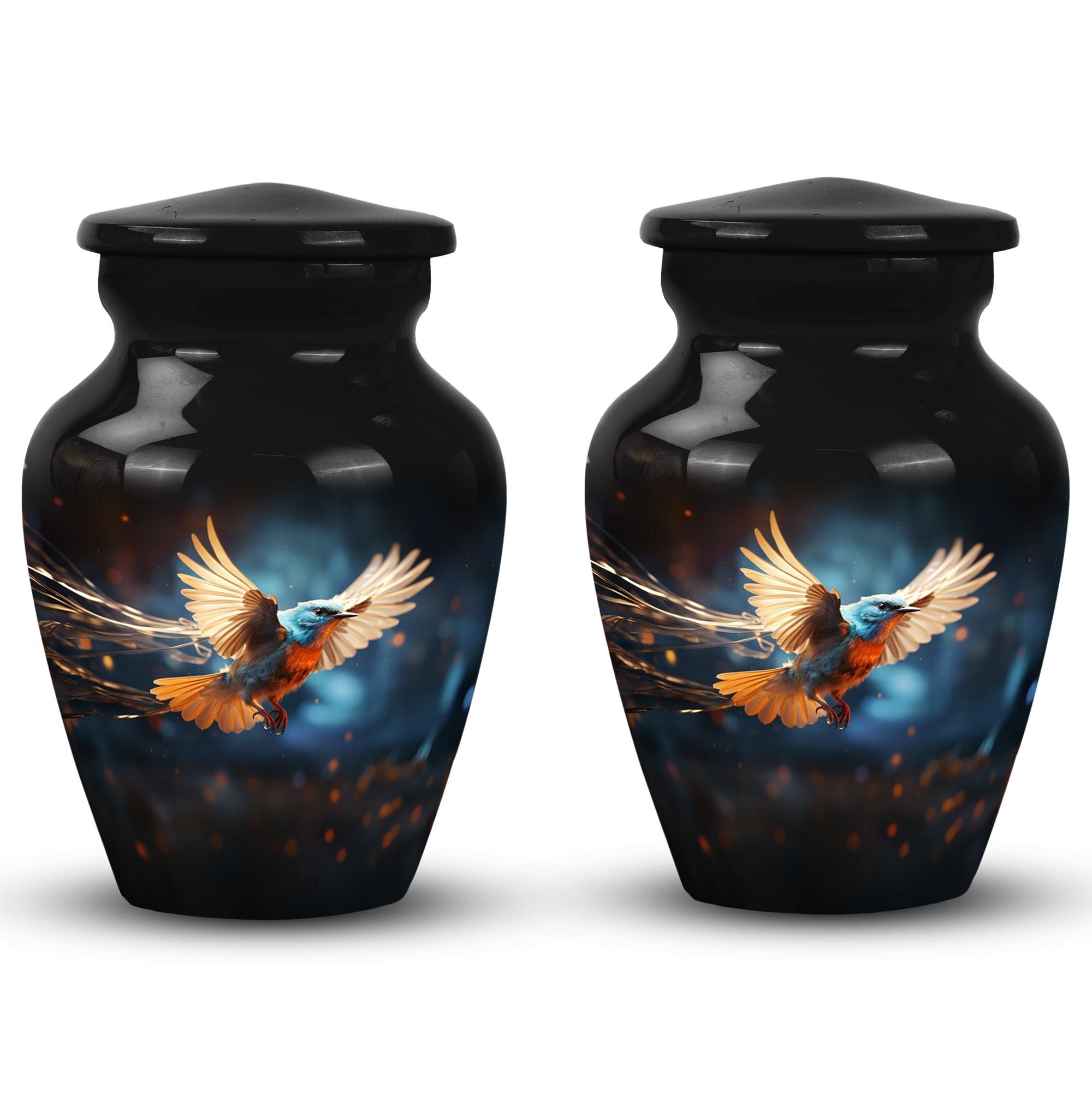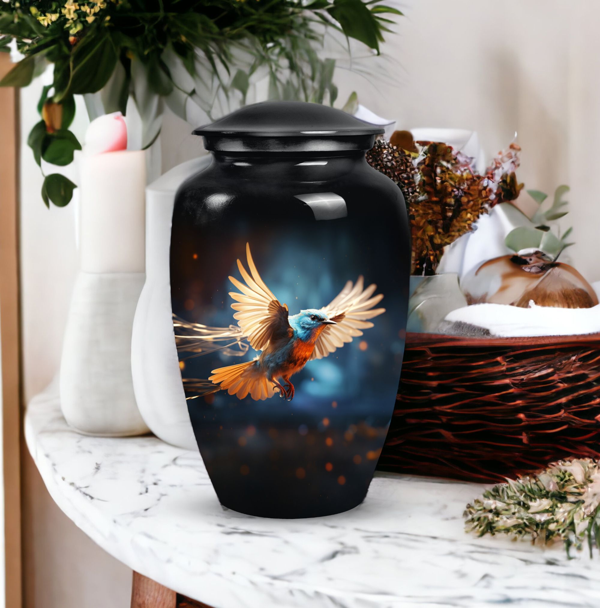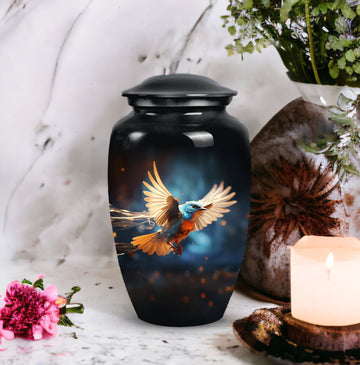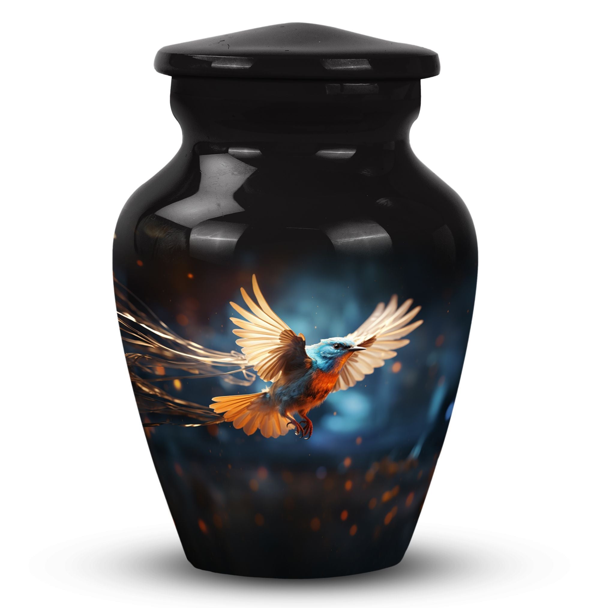 Experience a poignant tribute to a cherished life with our 'Red Sparrow Flying Urn.' Elegantly constructed from premium, durable Aluminium, this large urn stands tall at 10 inches, yet is compact with a size of 3 inches. Capable of holding up to 200 cubic inches of ashes, this small urn for ashes is designed to satisfy your memorial needs. With its classic urn style, it brings a sentimental touch to your remembrance, radiating beauty, and tranquility. The added velvet pouch enhances the function and delivery of this urn while providing a safe containment for the ashes. Personalize this cremation urn with engraved names to create a unique token of rememberance. This burial urn, at a weight of 3.3 pounds, is one of the exquisite modern urns you can find. Our 'Red Sparrow Flying Urn' sets itself apart in the league of personalised urns, redefining beauty in ashes.