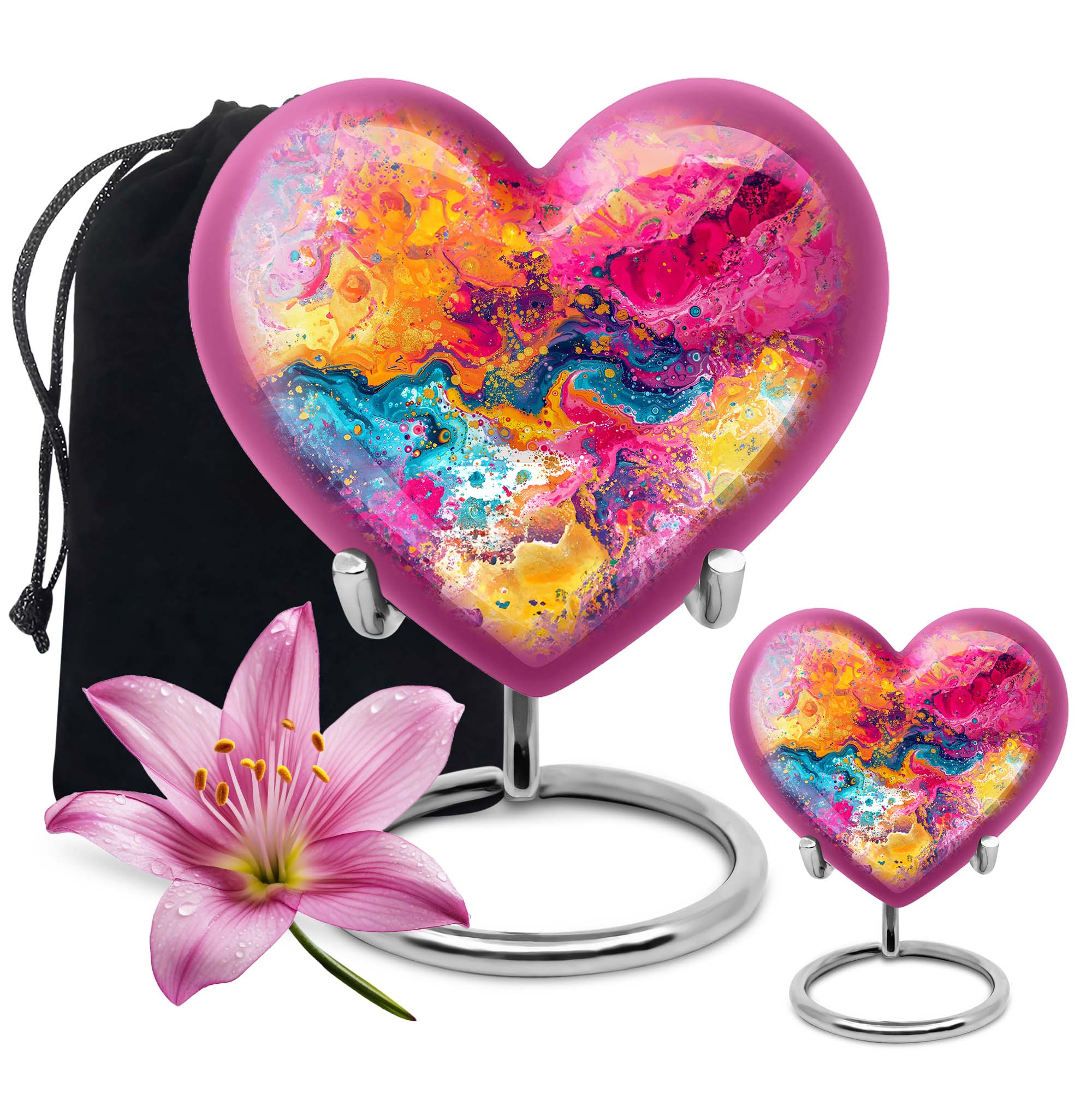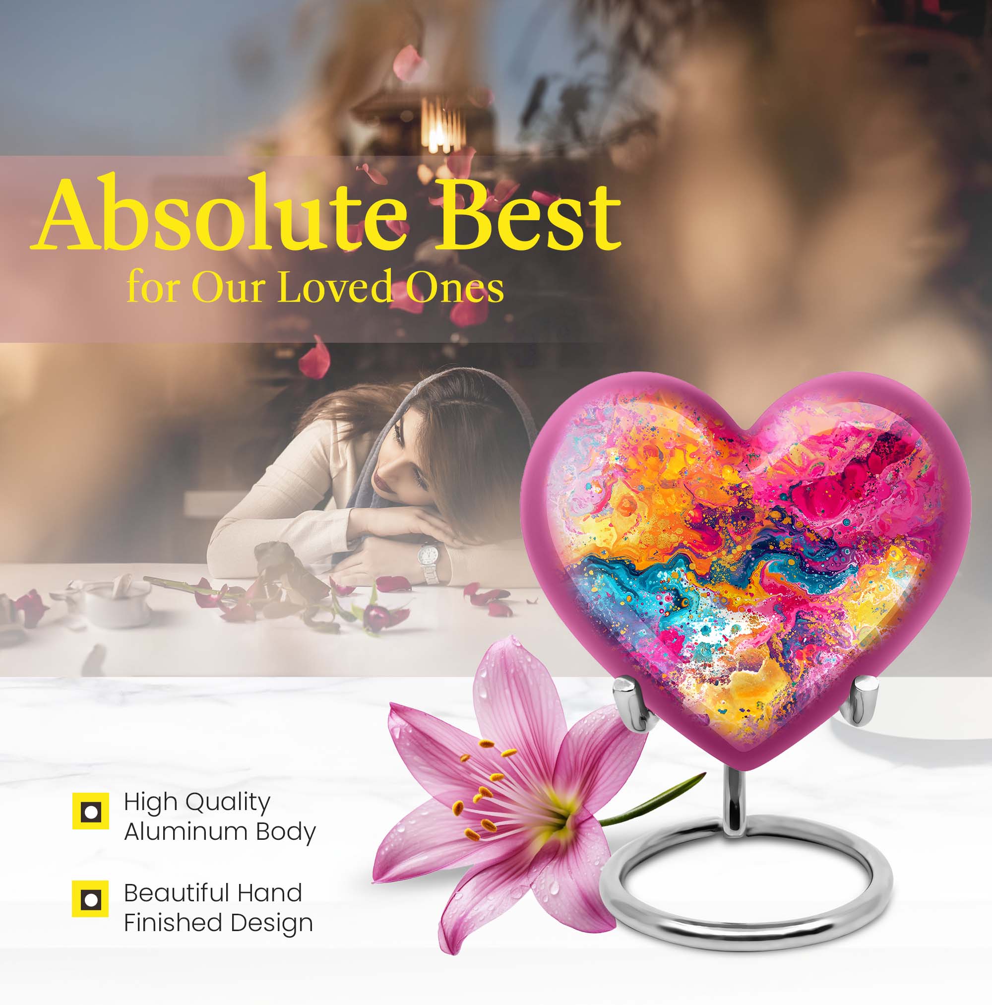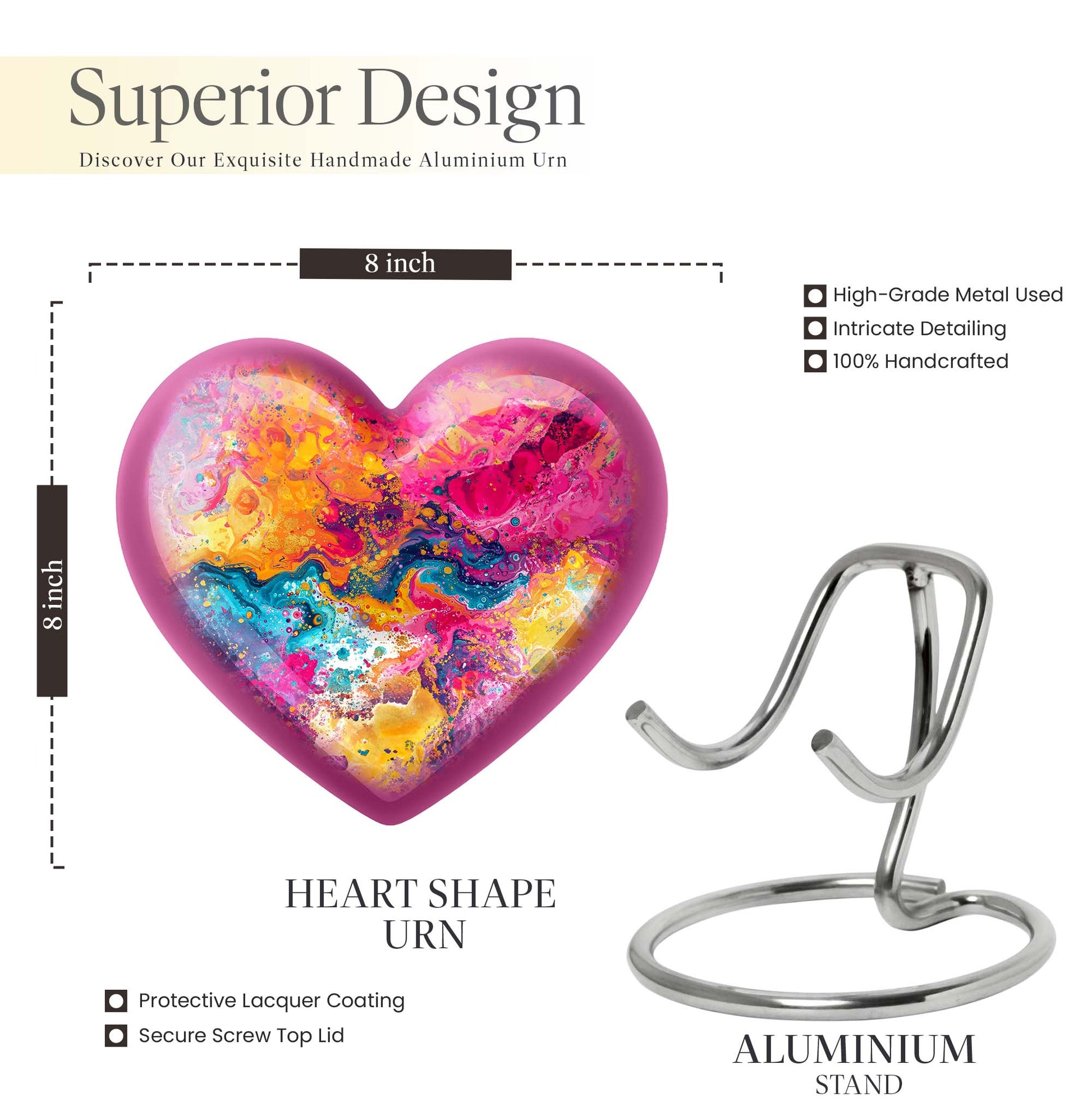 Discover a touching tribute to your departed loved ones with our Vibrant Swirl Urn, a beautiful alternative for adult ashes women to traditional burial funeral urns. Our 10-inch size 'Heart Urn' is meticulously designed with an engaging abstract theme, crafted from sturdy aluminium to ensure longevity. The urn possesses a weight of 3.3 pounds with dimensions measuring a total of 10 inches in height, providing a generous anxiety-easing capacity of 200 cubic inches. Along with the urn, you receive an elegant velvet pouch for secure containment of cherished ashes. Among many options of cremation boxes available, our Large Urns stand out due to their customization feature that allows you to personalize your selection with engraved names. This one-of-a-kind cremation urn serves as a fitting resting place for your loved ones, ensuring their memories prevail in the most resplendent manner.