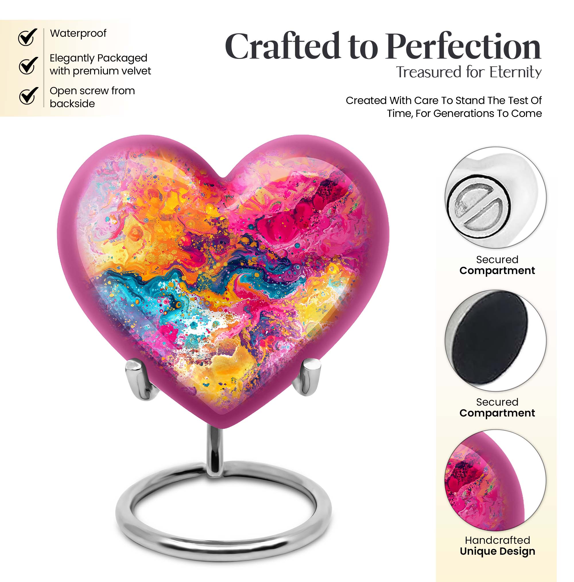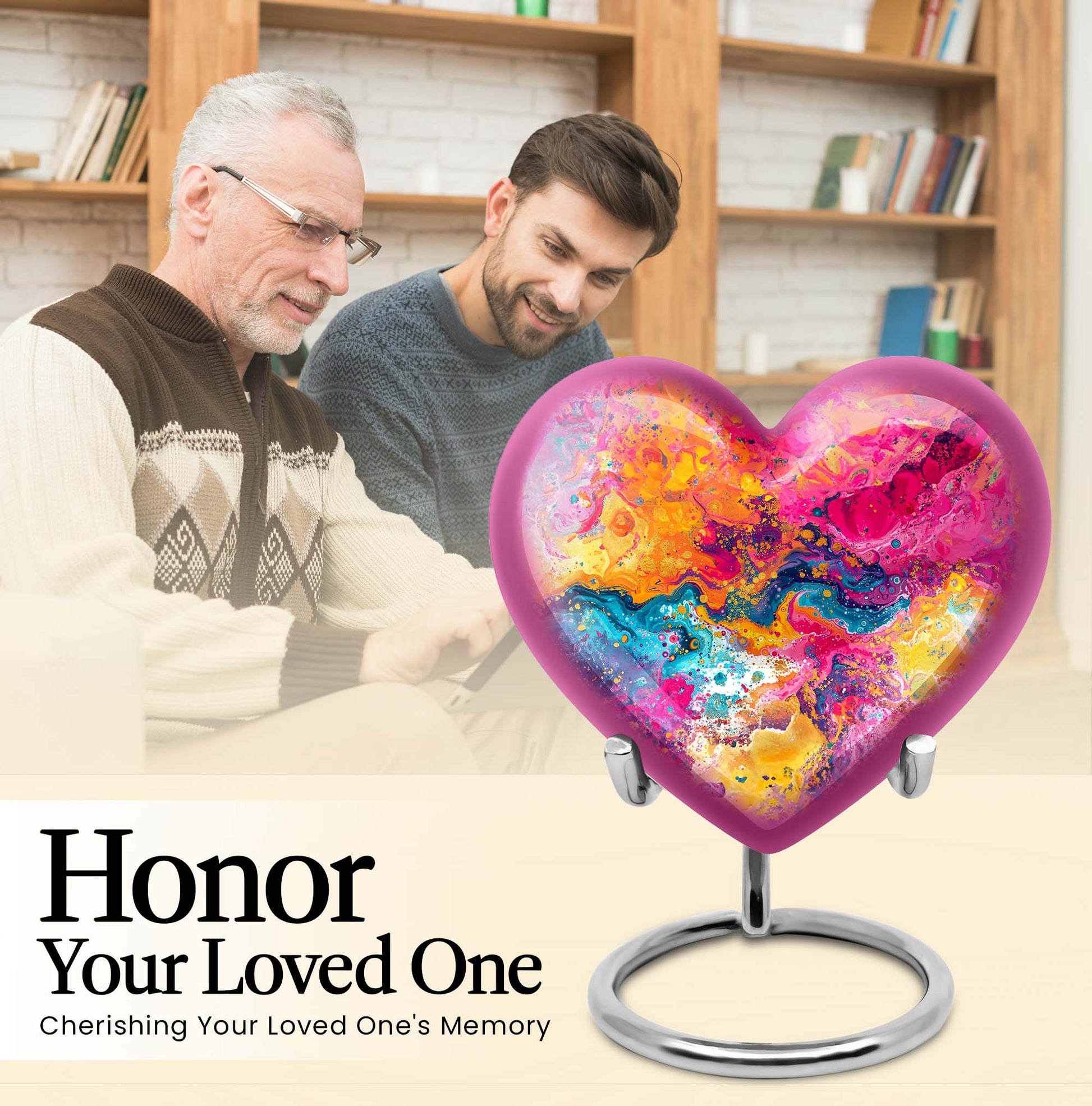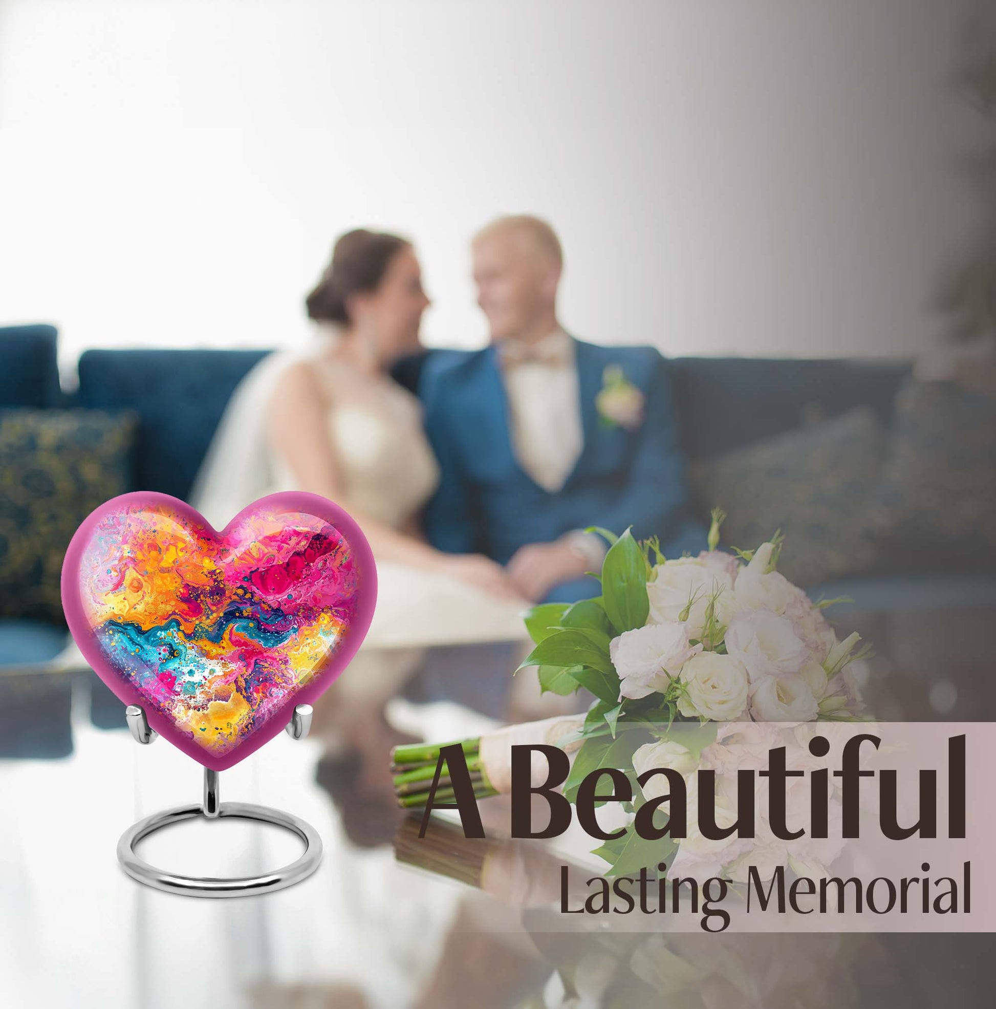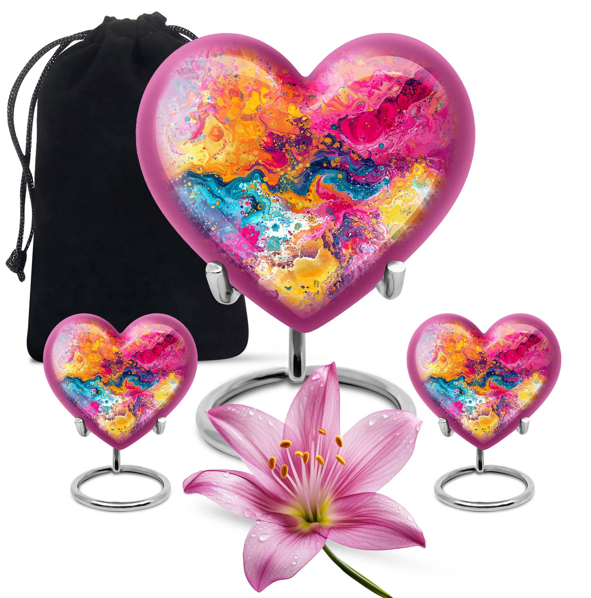 Discover a touching tribute to your departed loved ones with our Vibrant Swirl Urn, a beautiful alternative for adult ashes women to traditional burial funeral urns. Our 10-inch size 'Heart Urn' is meticulously designed with an engaging abstract theme, crafted from sturdy aluminium to ensure longevity. The urn possesses a weight of 3.3 pounds with dimensions measuring a total of 10 inches in height, providing a generous anxiety-easing capacity of 200 cubic inches. Along with the urn, you receive an elegant velvet pouch for secure containment of cherished ashes. Among many options of cremation boxes available, our Large Urns stand out due to their customization feature that allows you to personalize your selection with engraved names. This one-of-a-kind cremation urn serves as a fitting resting place for your loved ones, ensuring their memories prevail in the most resplendent manner.