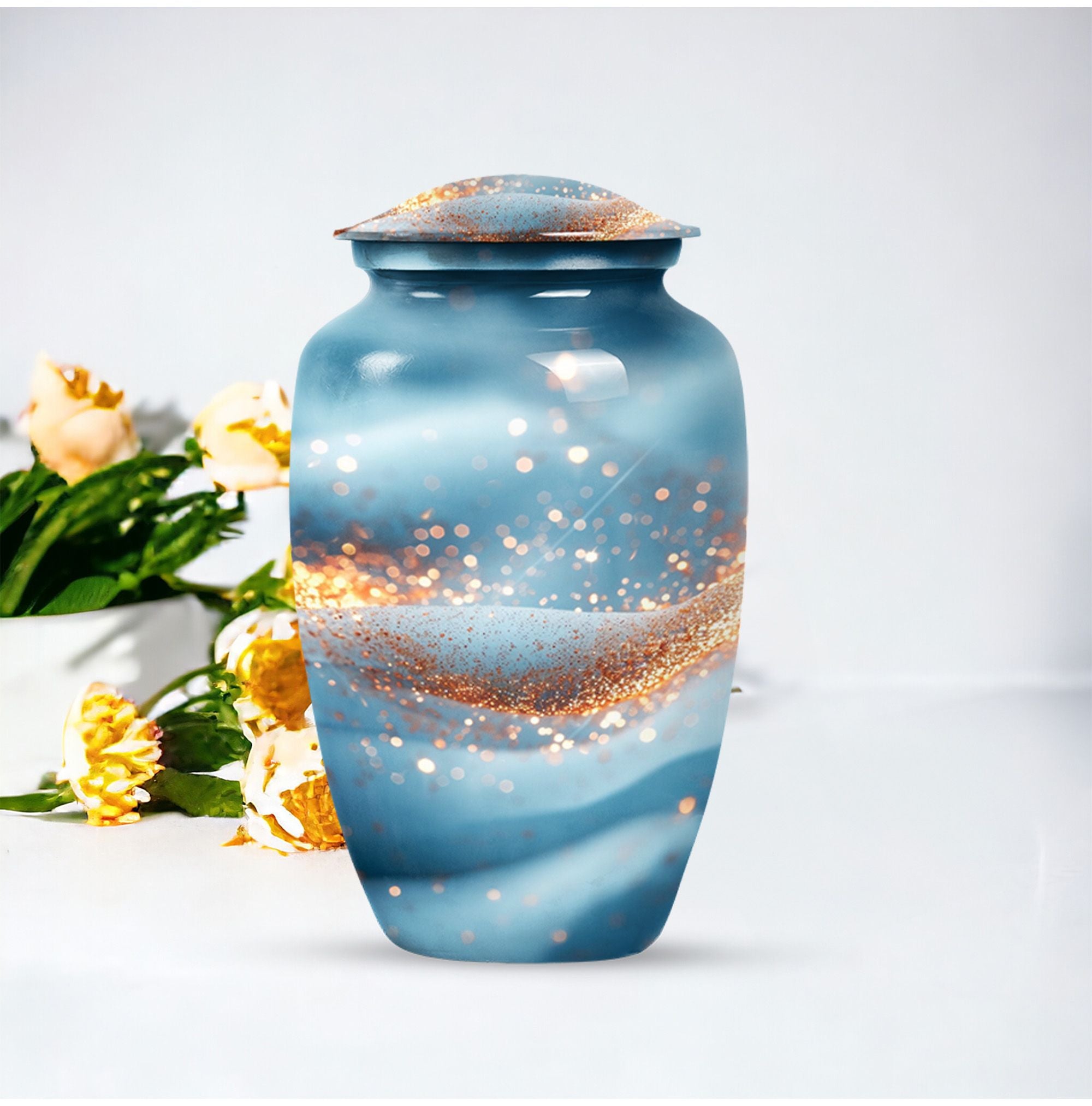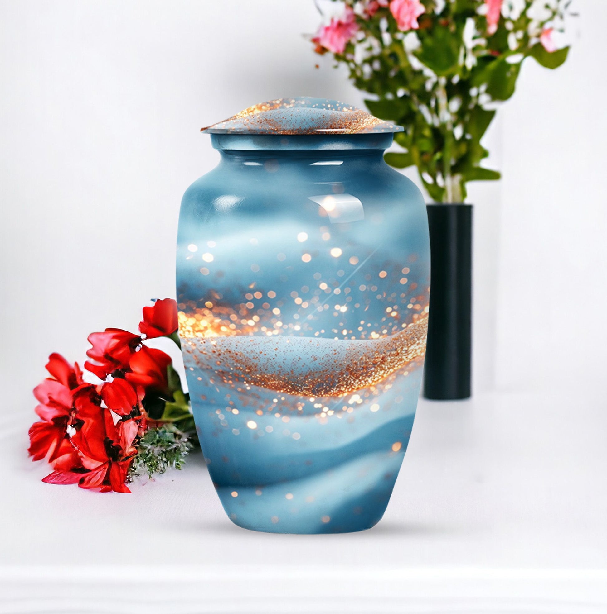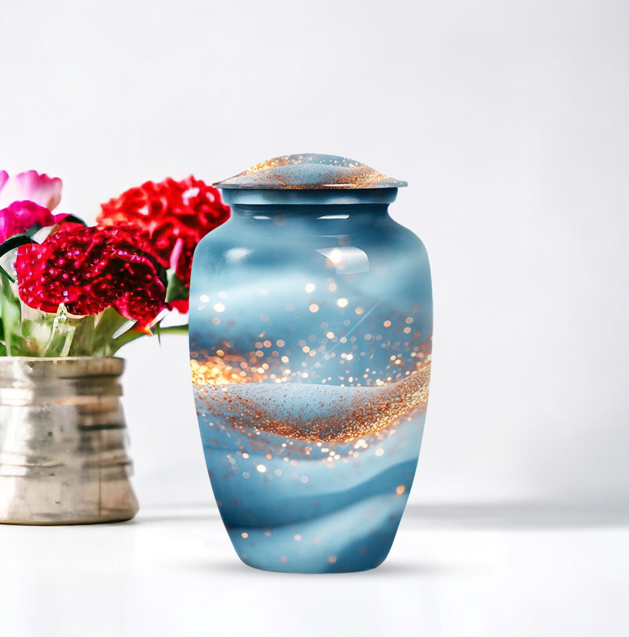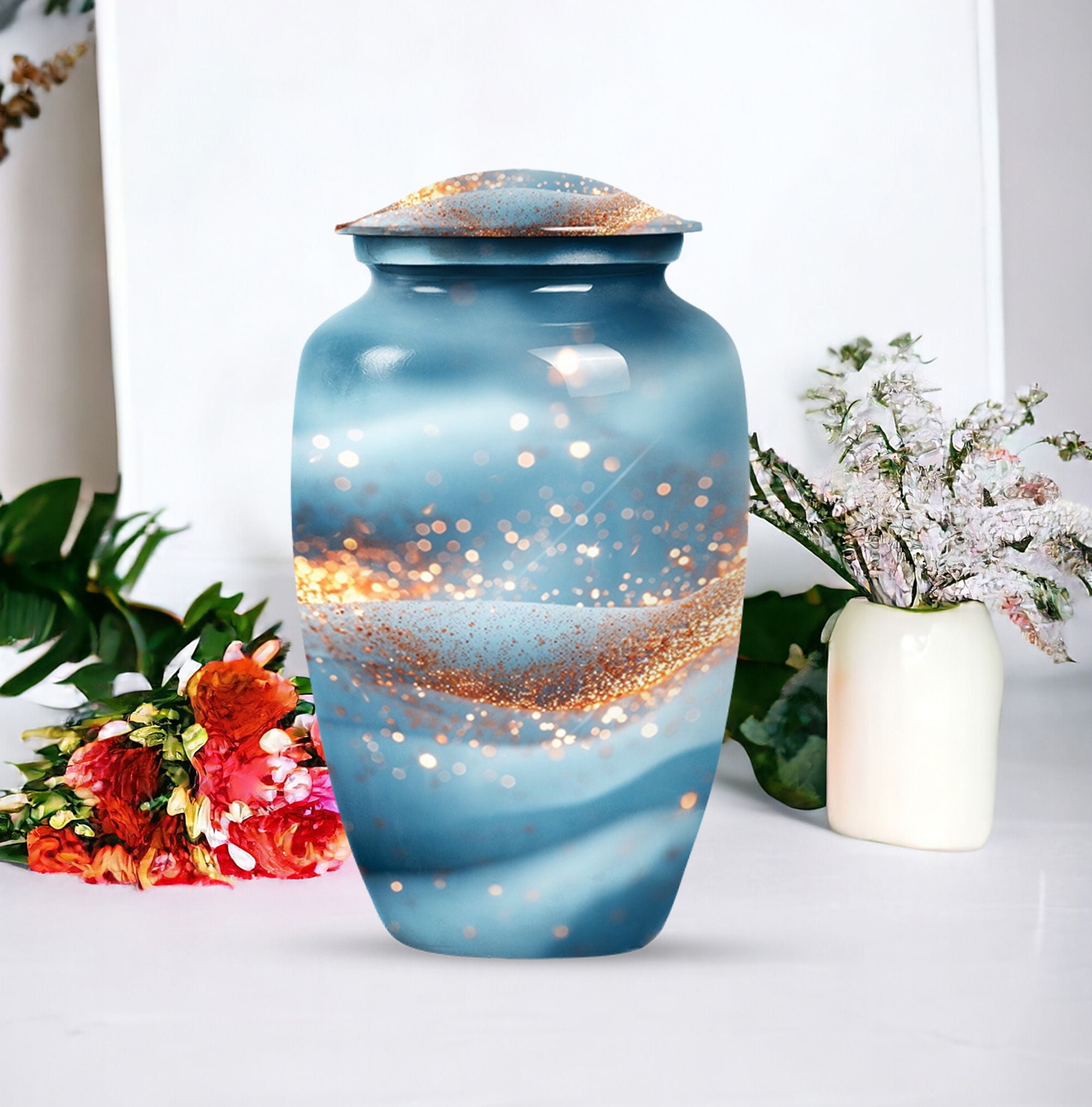 The Vibrant Swirl Urn is an elegant yet deeply comforting tribute to your loved one. This beautiful memorial urn is made from high-quality, durable aluminium. The design of this large urn is both abstract and classic, made evident in the tasteful and charming swirls. Its dimensions stand at 10 inches high, weighing about 3.3 pounds, thus making it perfect for adult male or father. The urn is sized at a spacious 200 cubic inches, being able to hold all the precious ashes securely. Moreover, it comes with a soft velvet pouch for the containment and protection of the remains. What sets this funeral urn apart is its personalization option: you can engrave names to give it a unique touch. This cremation urn is perfect for all, not just a cremation urn for an adult male or dad but also a wonderful memorial urn for mom or any other cherished family member or friend. The keywords ‘urns for cremation ashes’ & ‘cremation urn for mom’ are one to watch for. This Vibrant Swirl Urn is an poignant testament to the beauty of life well lived.