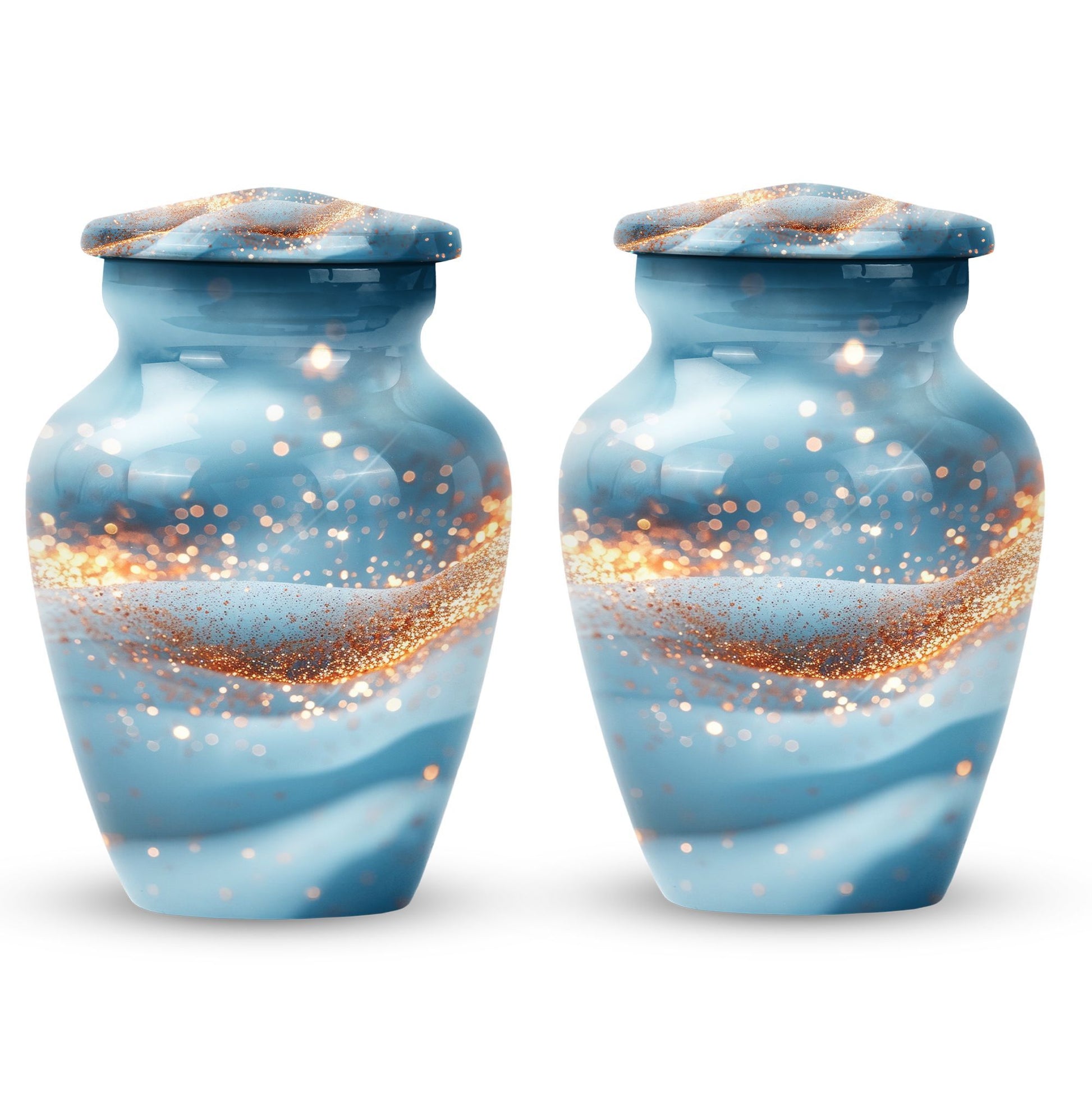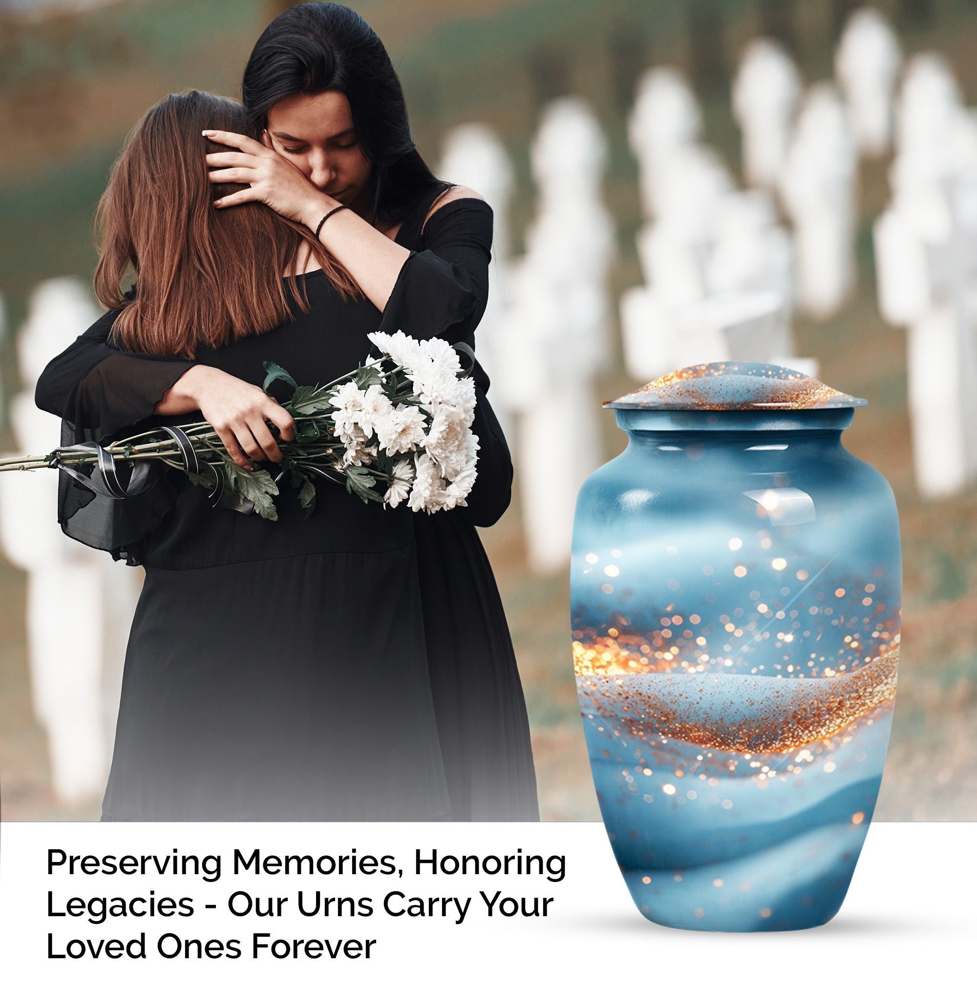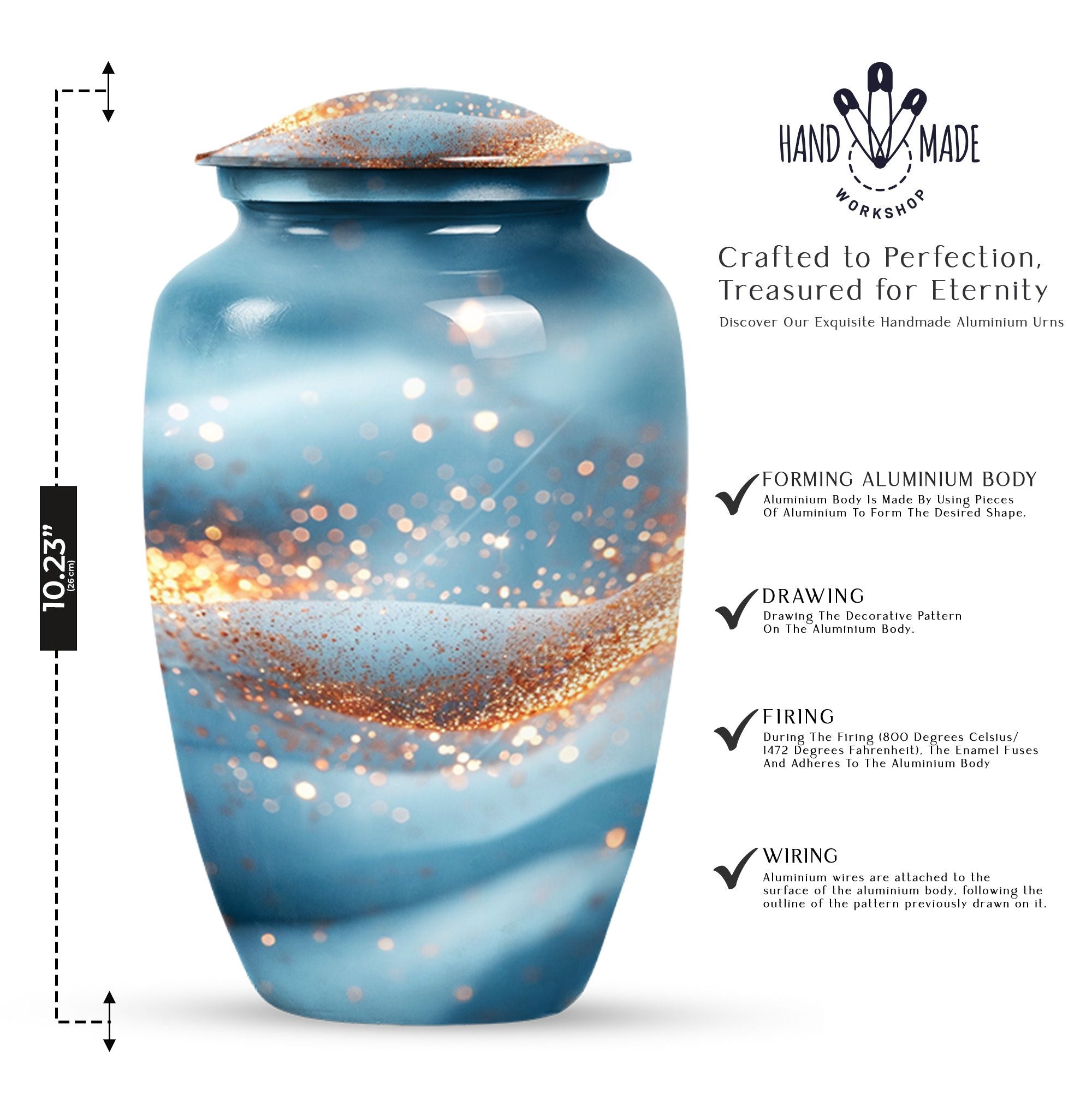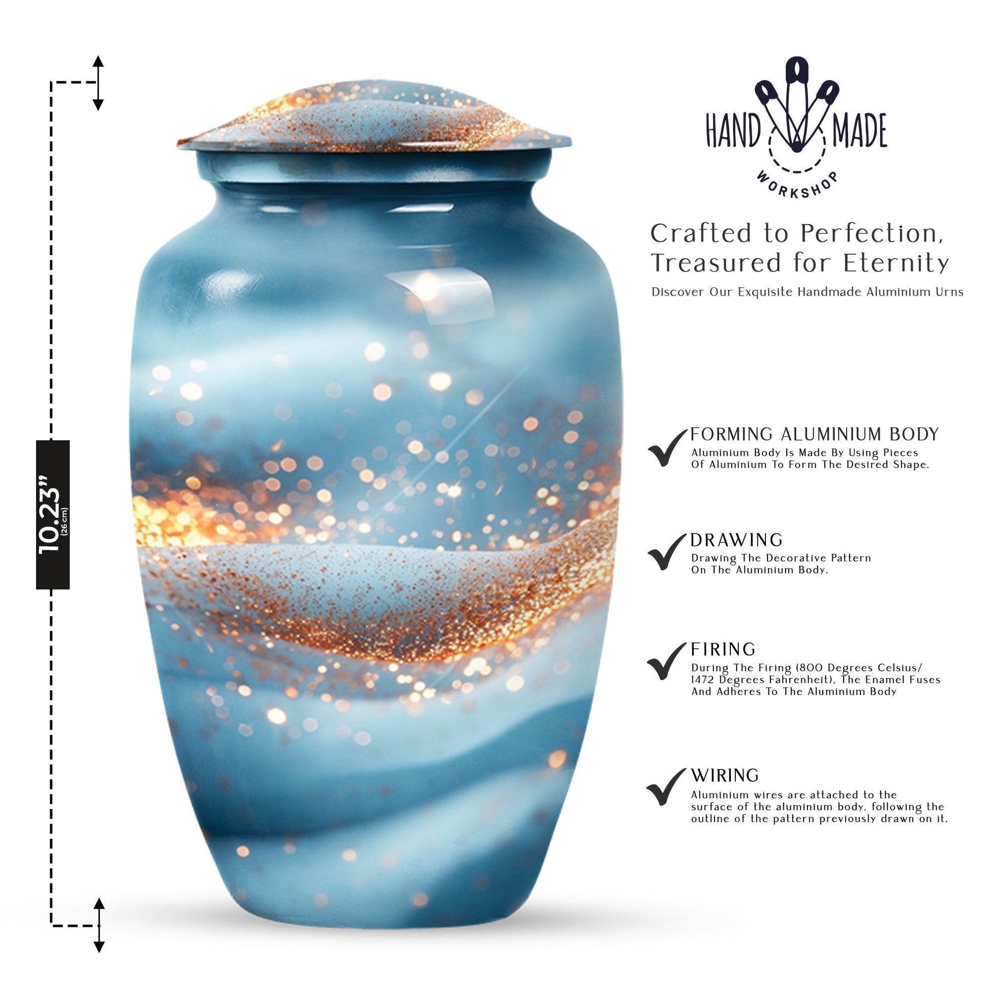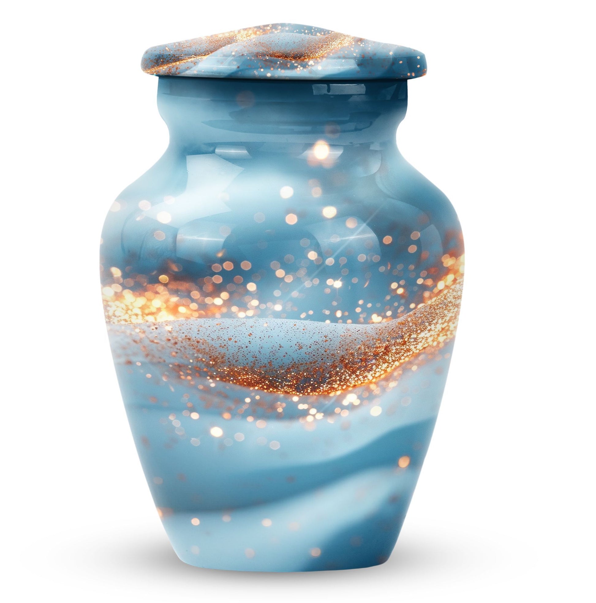 The Vibrant Swirl Urn is an elegant yet deeply comforting tribute to your loved one. This beautiful memorial urn is made from high-quality, durable aluminium. The design of this large urn is both abstract and classic, made evident in the tasteful and charming swirls. Its dimensions stand at 10 inches high, weighing about 3.3 pounds, thus making it perfect for adult male or father. The urn is sized at a spacious 200 cubic inches, being able to hold all the precious ashes securely. Moreover, it comes with a soft velvet pouch for the containment and protection of the remains. What sets this funeral urn apart is its personalization option: you can engrave names to give it a unique touch. This cremation urn is perfect for all, not just a cremation urn for an adult male or dad but also a wonderful memorial urn for mom or any other cherished family member or friend. The keywords ‘urns for cremation ashes’ & ‘cremation urn for mom’ are one to watch for. This Vibrant Swirl Urn is an poignant testament to the beauty of life well lived.
