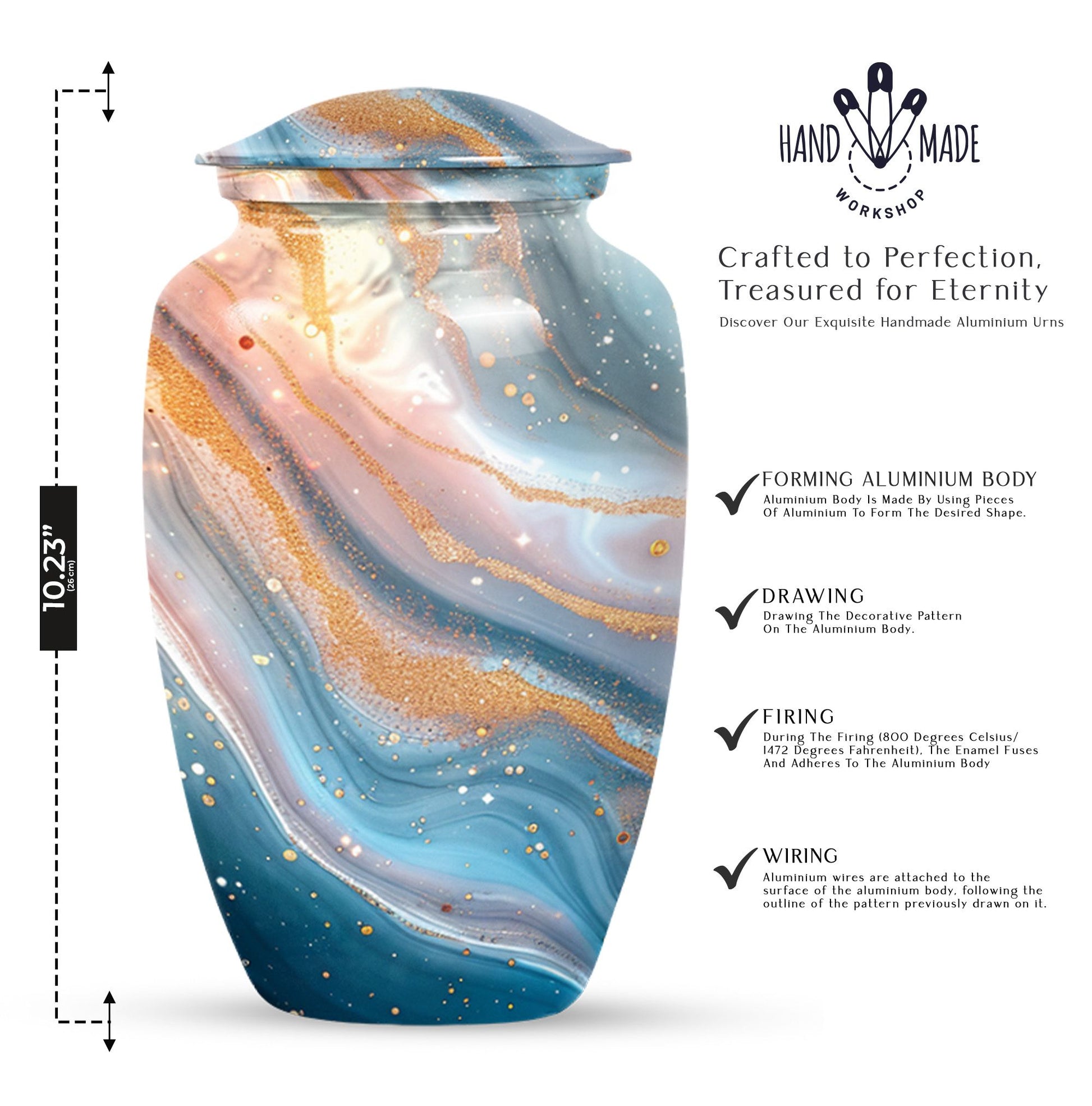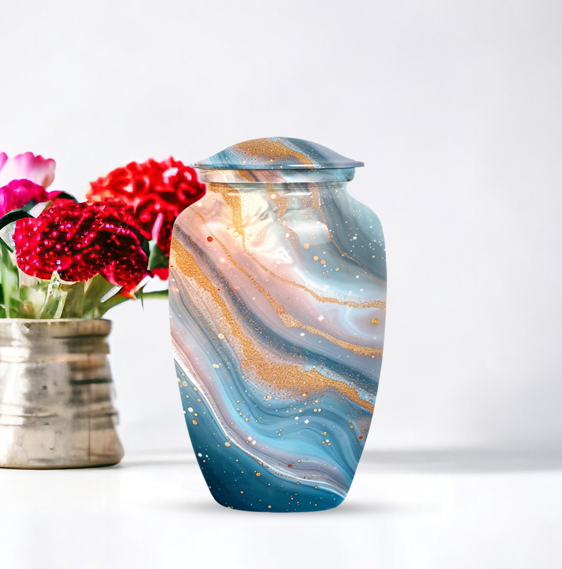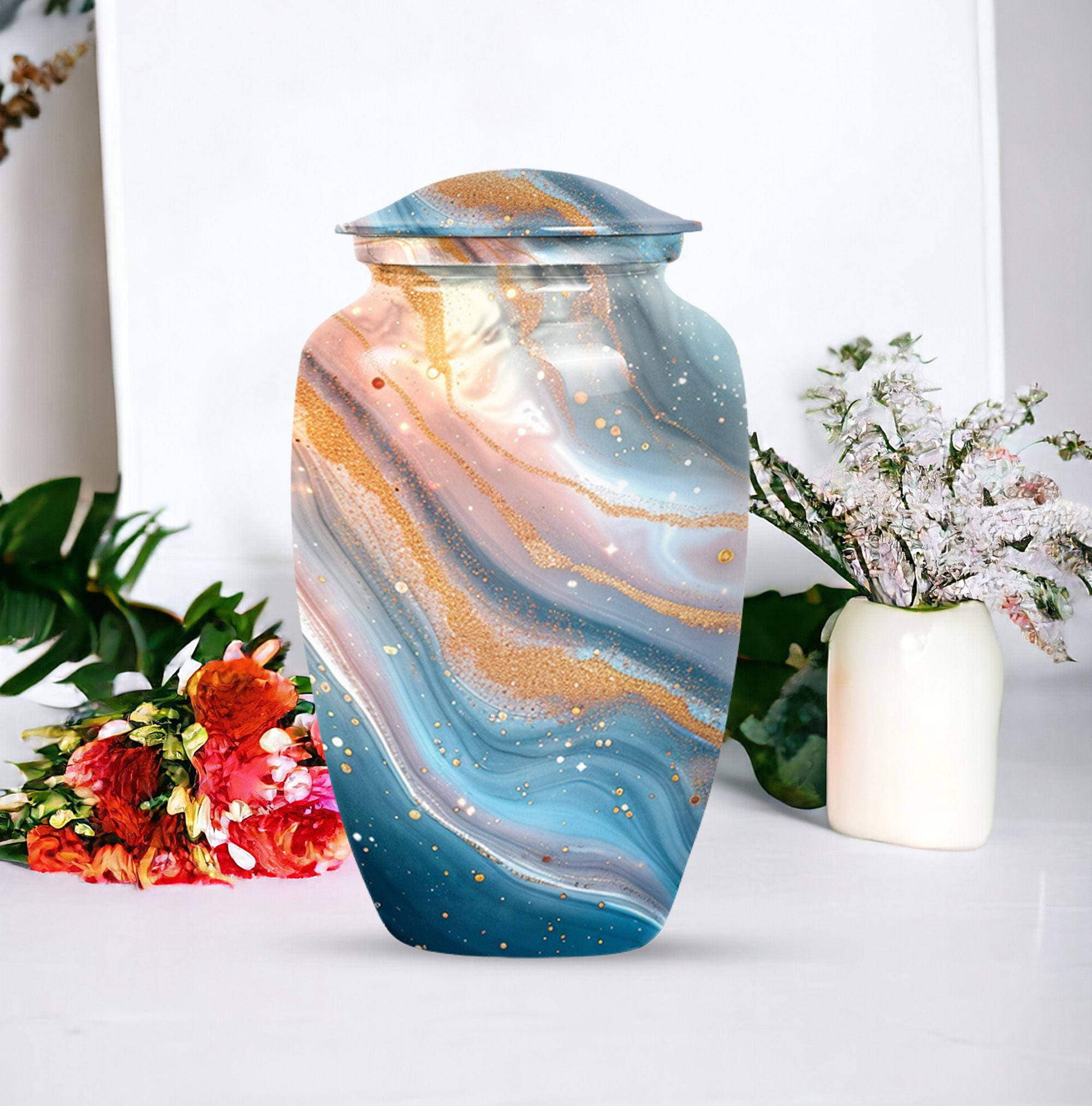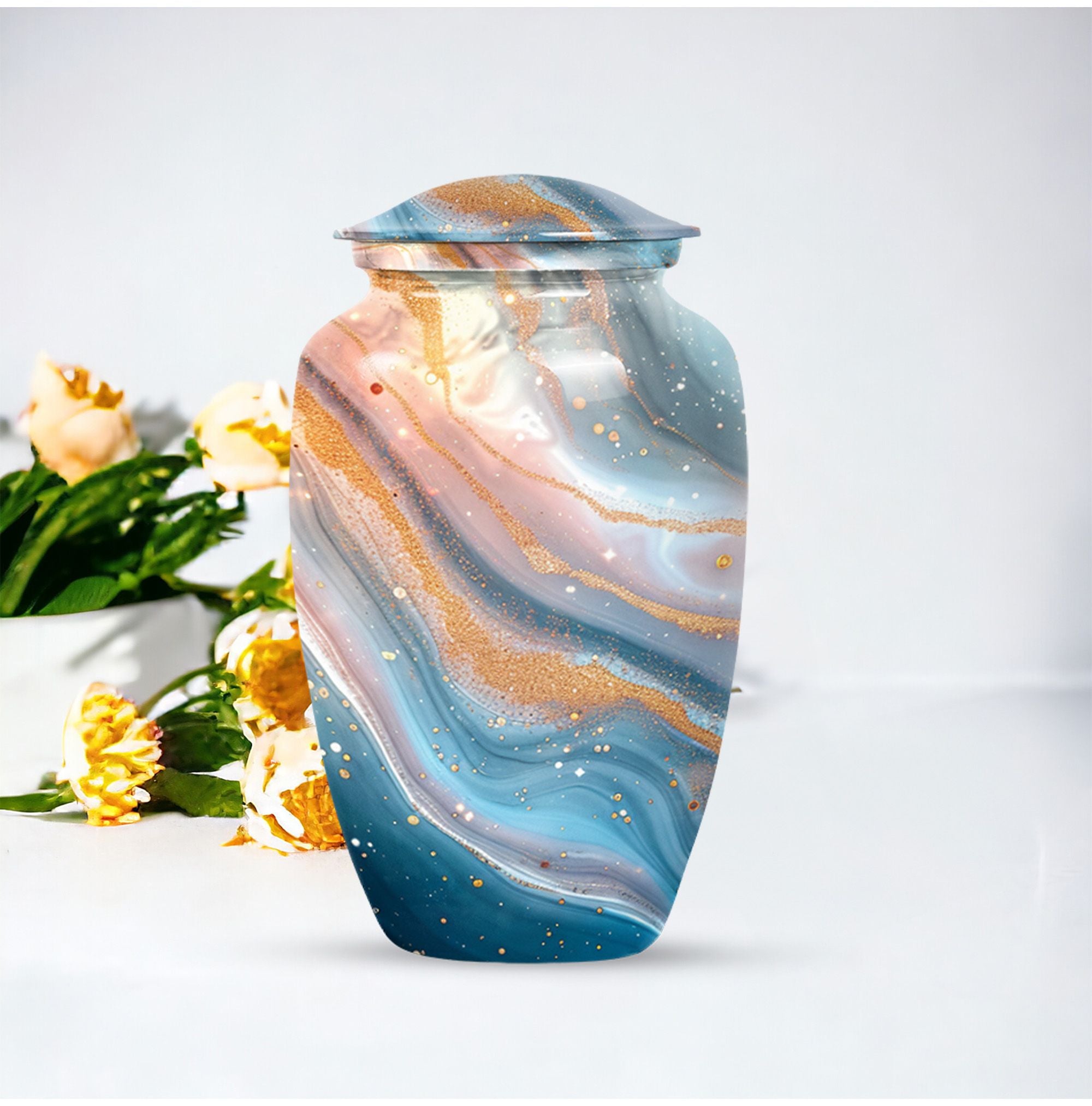 Presenting our Vibrant Swirl Urn, an epitome of abstract artistry that couples a timeless 'Classic Urn' design with a twist of vibrant radiance. This large urn, finely crafted from Aluminium, boasts of a robust weight of 3.3 pounds and an imposing height of 10 inches. More than just an ornamental centrepiece, this cremation urn serves as a dignified memorial container, with a substantial capacity of 200 cubic inches. It can confine the precious ashes securely wrapped in a lush velvet pouch, included in the package. For a personal touch etched in memory, you also have the option to customize it with engraved names. This burial urn, with its medium size and durable material, is perfectly suited for ground burial. Explore the uncharted terrain of our vibrant swirl urn, a fitting tribute to your beloved. It's not just a cremation urn; it's a tangible reflection of love, loss, and irreplaceable memories wrapped in mesmerising artistry. Ideal for seniors and adults seeking artistic urns or cremation urns for women.
