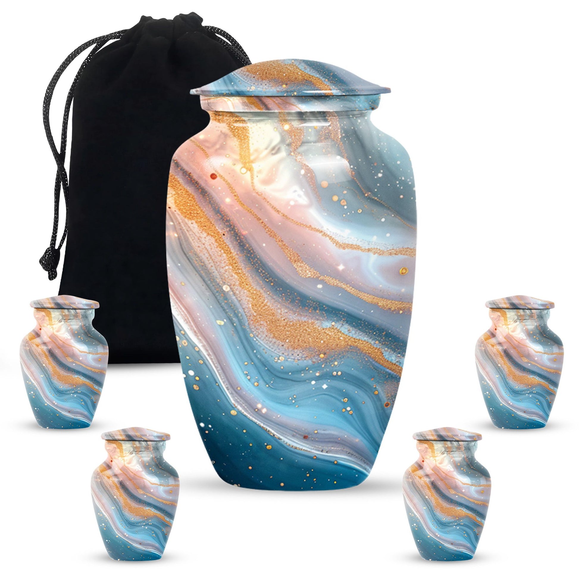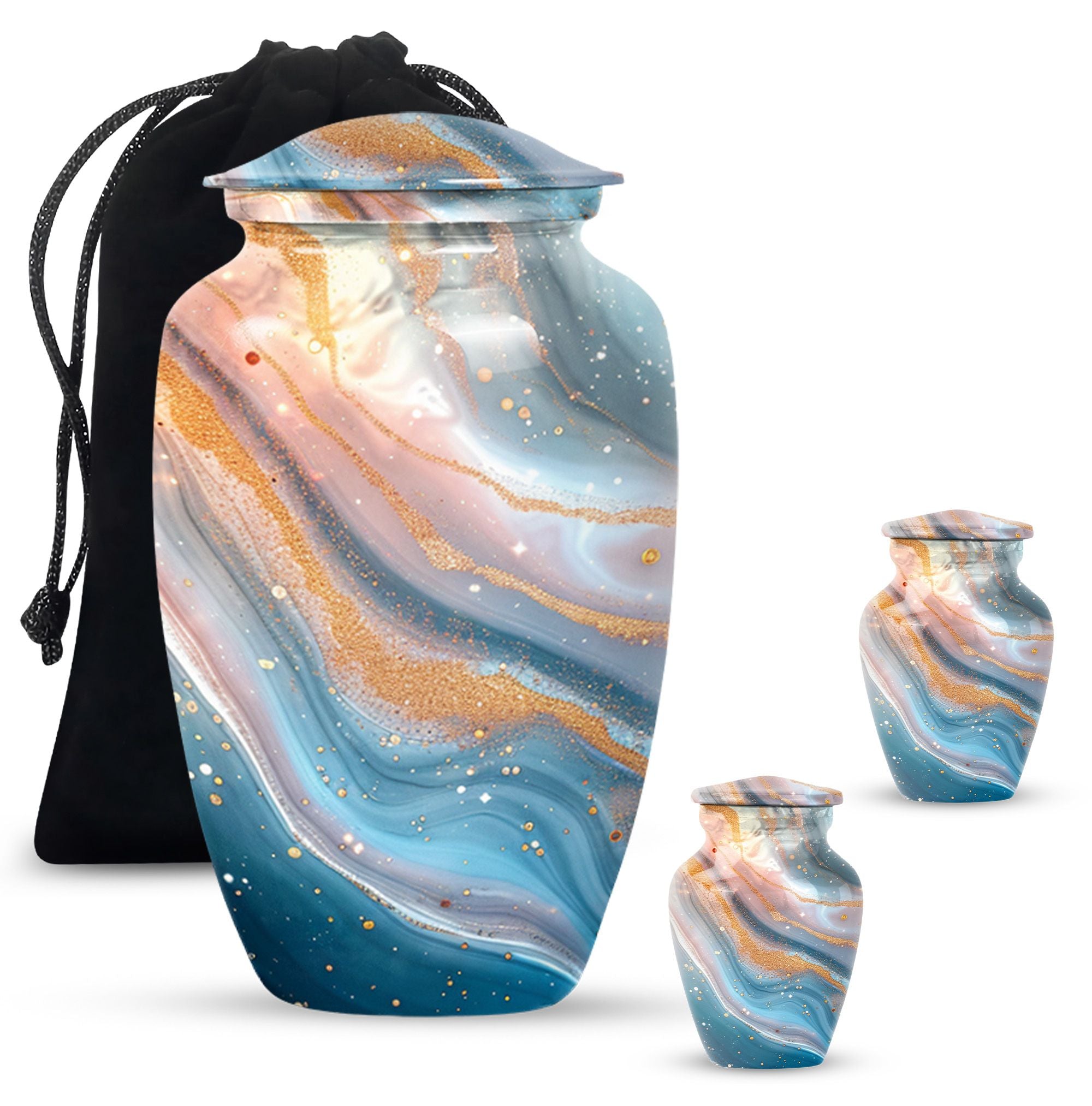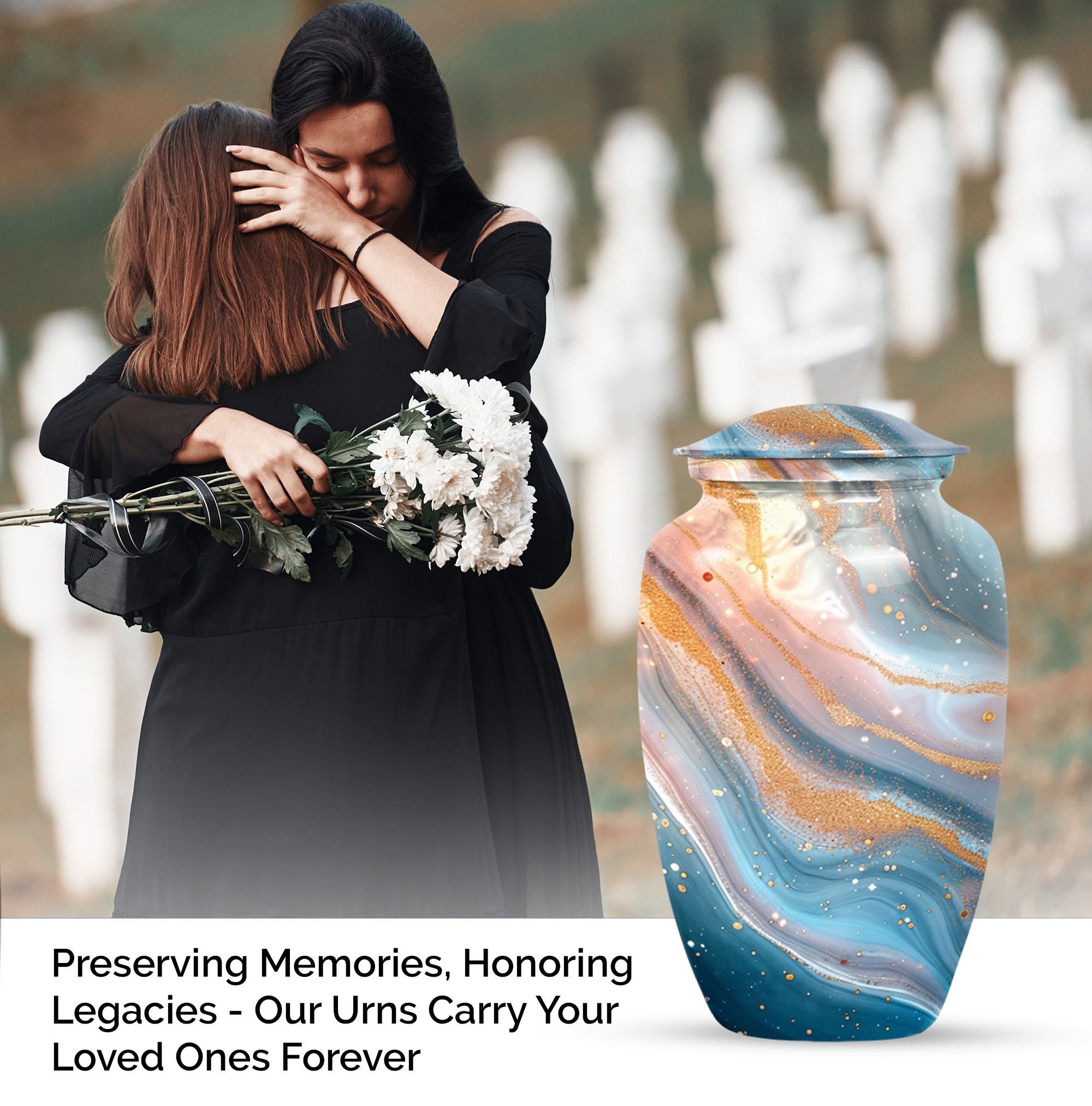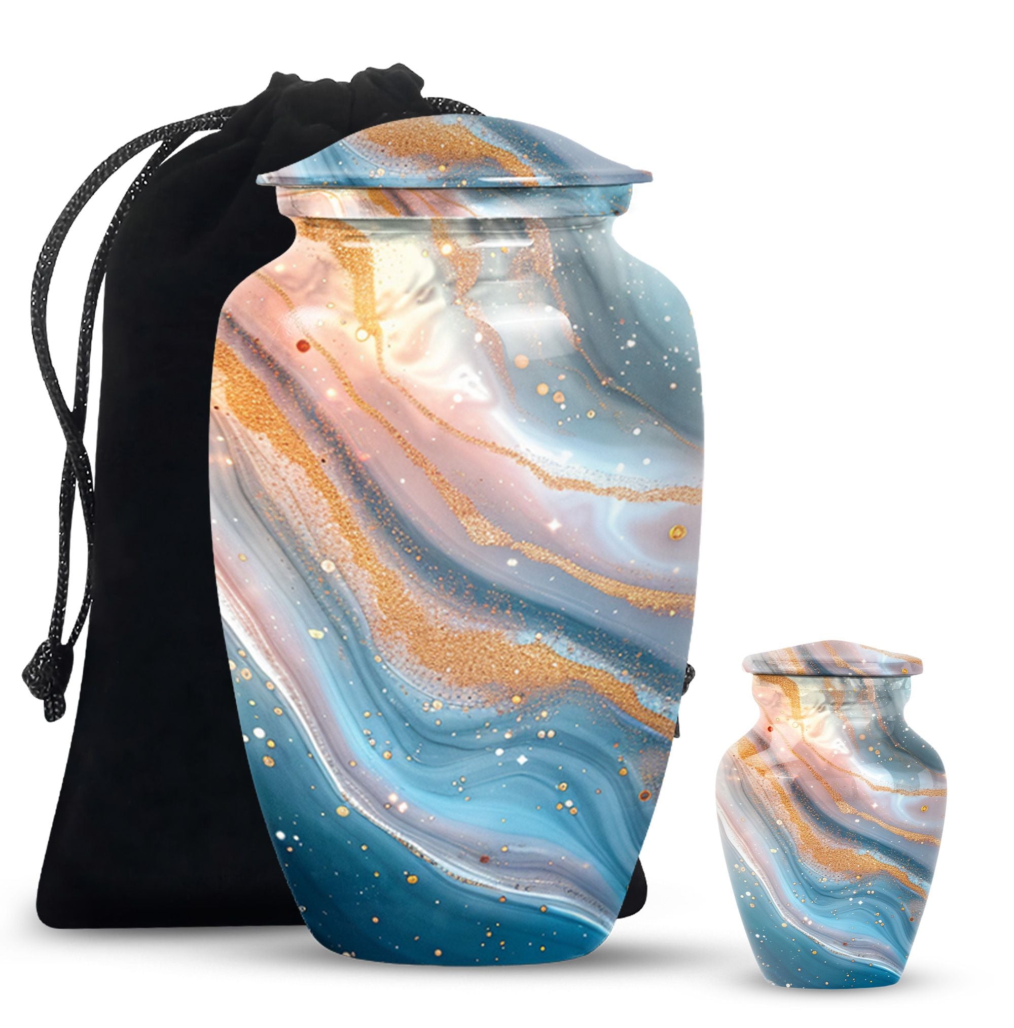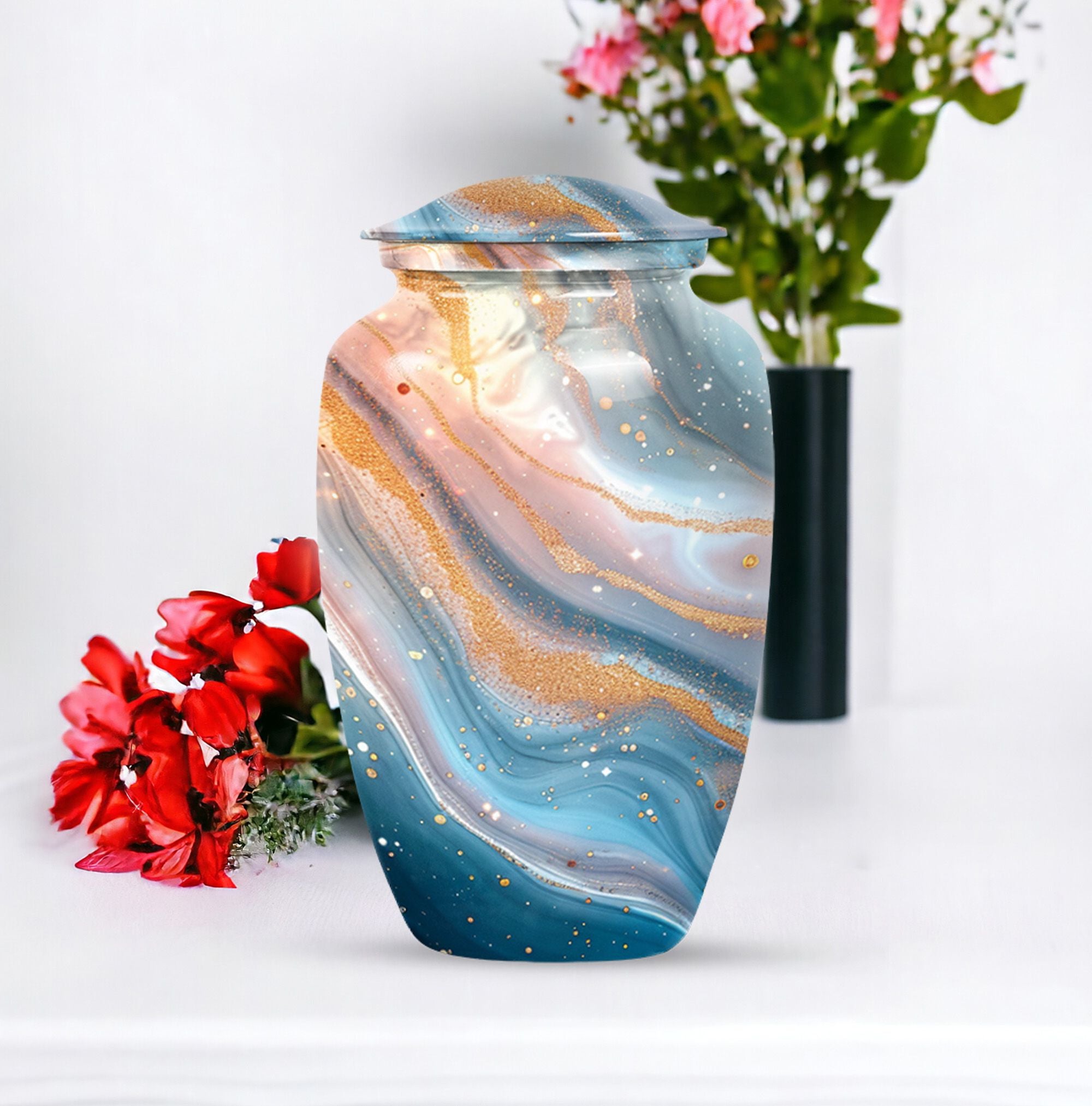 Presenting our Vibrant Swirl Urn, an epitome of abstract artistry that couples a timeless 'Classic Urn' design with a twist of vibrant radiance. This large urn, finely crafted from Aluminium, boasts of a robust weight of 3.3 pounds and an imposing height of 10 inches. More than just an ornamental centrepiece, this cremation urn serves as a dignified memorial container, with a substantial capacity of 200 cubic inches. It can confine the precious ashes securely wrapped in a lush velvet pouch, included in the package. For a personal touch etched in memory, you also have the option to customize it with engraved names. This burial urn, with its medium size and durable material, is perfectly suited for ground burial. Explore the uncharted terrain of our vibrant swirl urn, a fitting tribute to your beloved. It's not just a cremation urn; it's a tangible reflection of love, loss, and irreplaceable memories wrapped in mesmerising artistry. Ideal for seniors and adults seeking artistic urns or cremation urns for women.