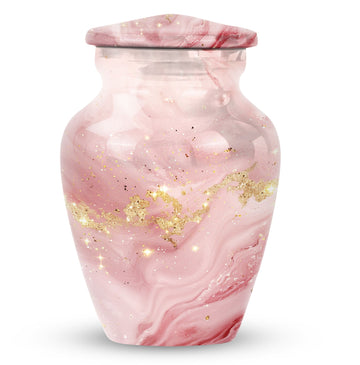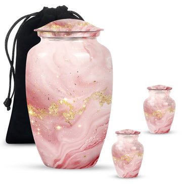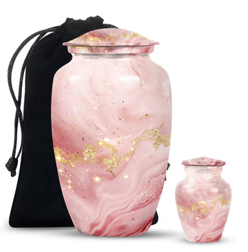 This Vibrant Swirl Urn is more than just a funeral urn for burial, it's a timeless memorial that exudes elegance and respect. Sized at 10 inches, its substantial stature testifies to its grandeur. Crafted from robust aluminium, this large urn showcases an alluring abstract theme that imparts a subtle artistic charm. It weighs a solid 3.3 pounds and can comfortably hold up to 200 cubic inches of cremated remains. Alongside the cremation urn, we include a tasteful velvet pouch, ideal for the safe containment of ashes. For that extra individual touch, personalize the Vibrant Swirl Urn with engraved names, adding an enduring loving tribute. Seek solace in this classic urn, tailoring a loving memorial of your beloved ones. It stands as a poignant reminder of your precious shared moments.