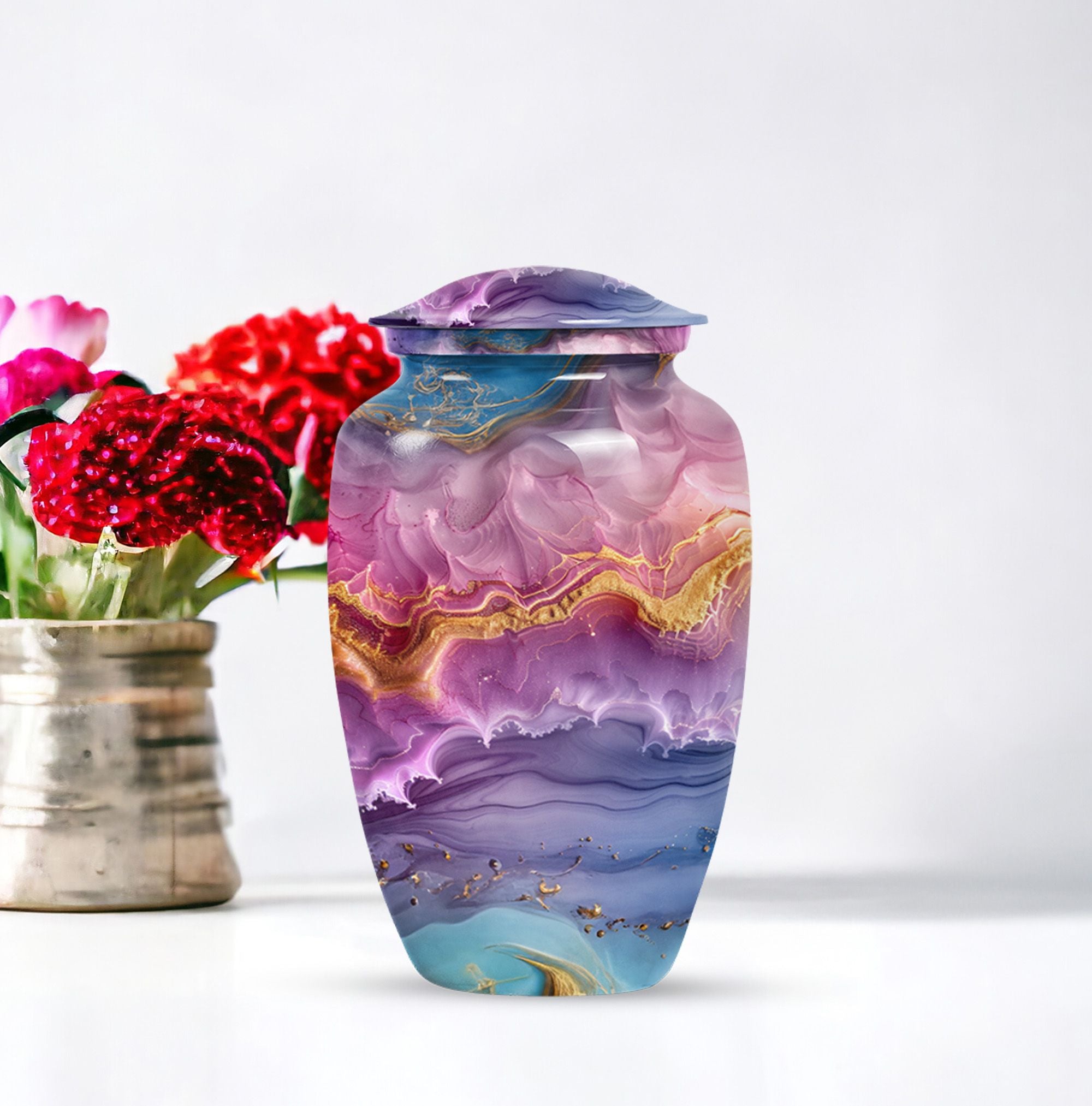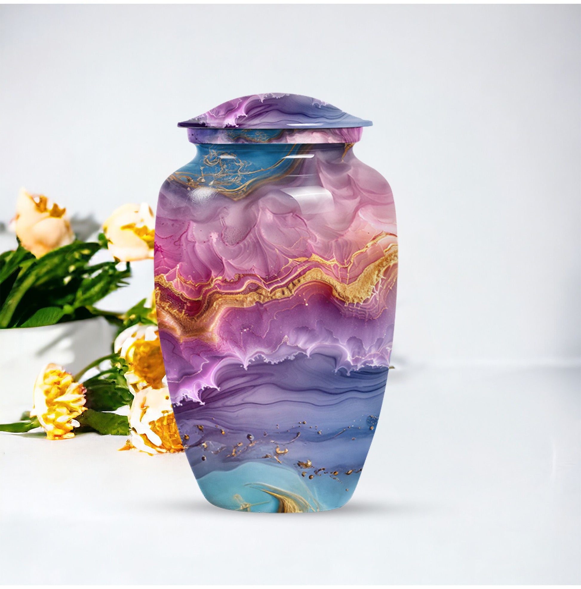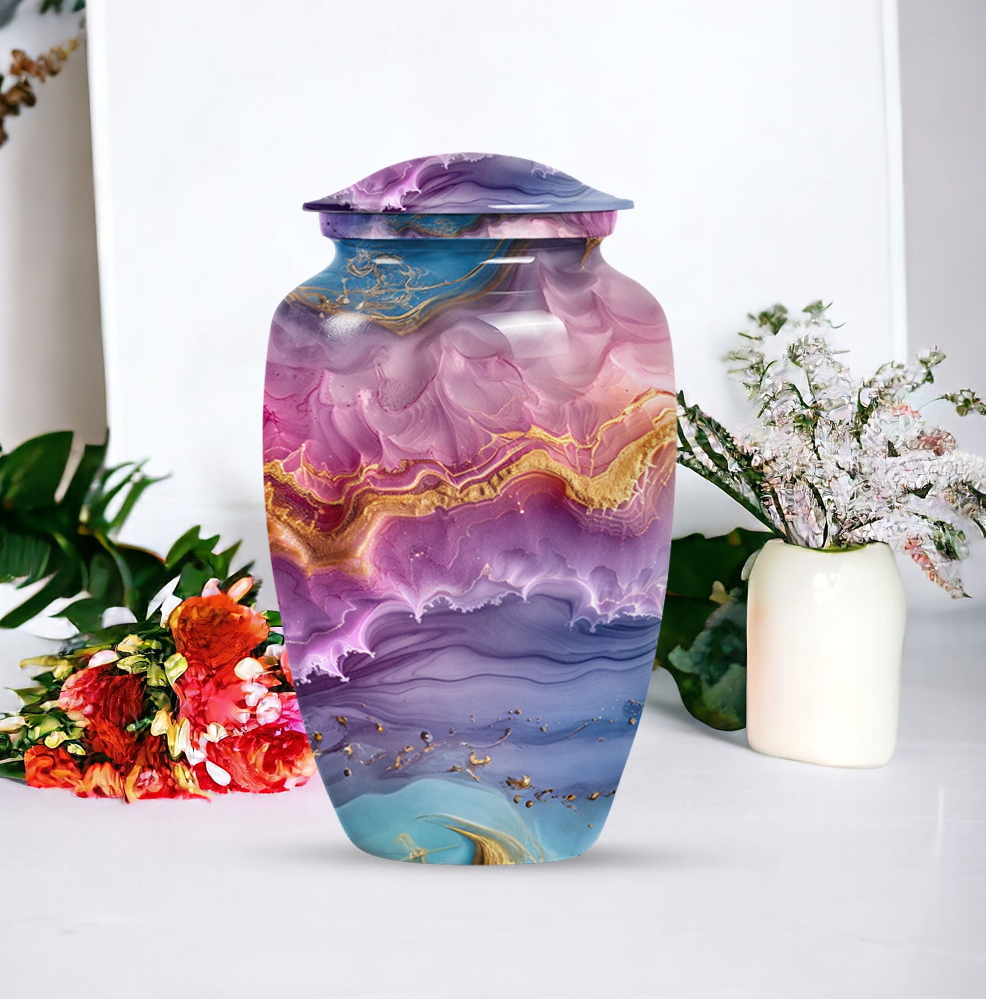 Show your reverent affection to your loved ones with this Vibrant Swirl Urn, masterfully crafted to serve as a reverential memorial urn for mom. Designed as a large urn, it demonstrates an abstract theme while providing a sizeable capacity of 200 cubic inches. This 10-inch cremation urn finds a delicate balance between style, dignity and lasting reminiscence. Weighing 3.3 pounds, the structure of this cremation component is constituted of robust aluminium – a testament to its durability. The urn comes in a classic form ensuring it adds a subtle touch of refinement to your environment without overtly curbing your existing decor. Personify the urn by engraving names, adding another layer of sentimental value. The urn is accompanied with a velvet pouch for dignified containment of ashes. The Vibrant Swirl Urn is not just an article for ashes; it's an elegant commemoration of the love and life shared. Its exclusive design amplifies its appeal, making it the perfect choice among cremation personalized urns for human ashes adult, ash adult urn human ash adult and burial cremation urns.