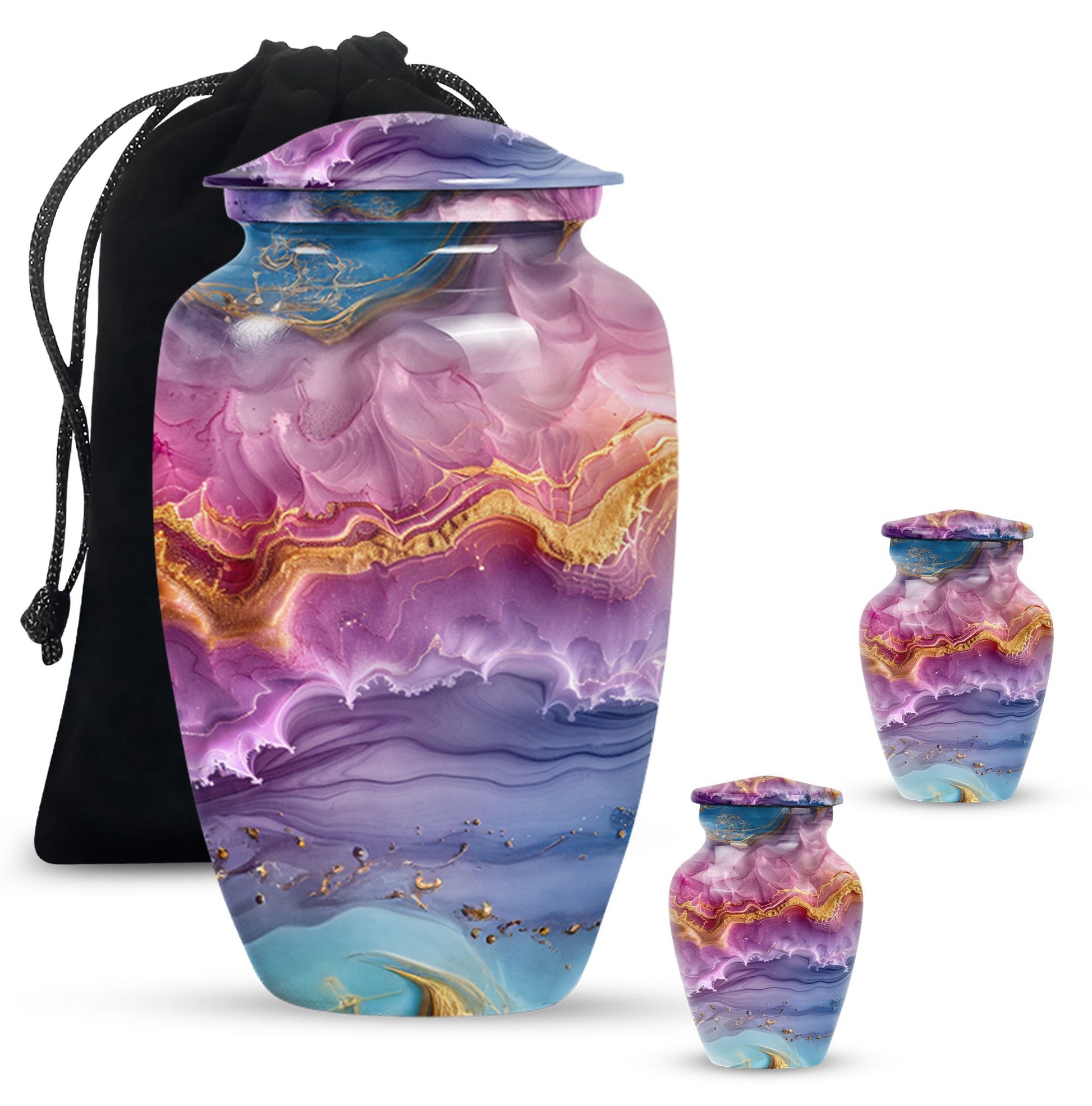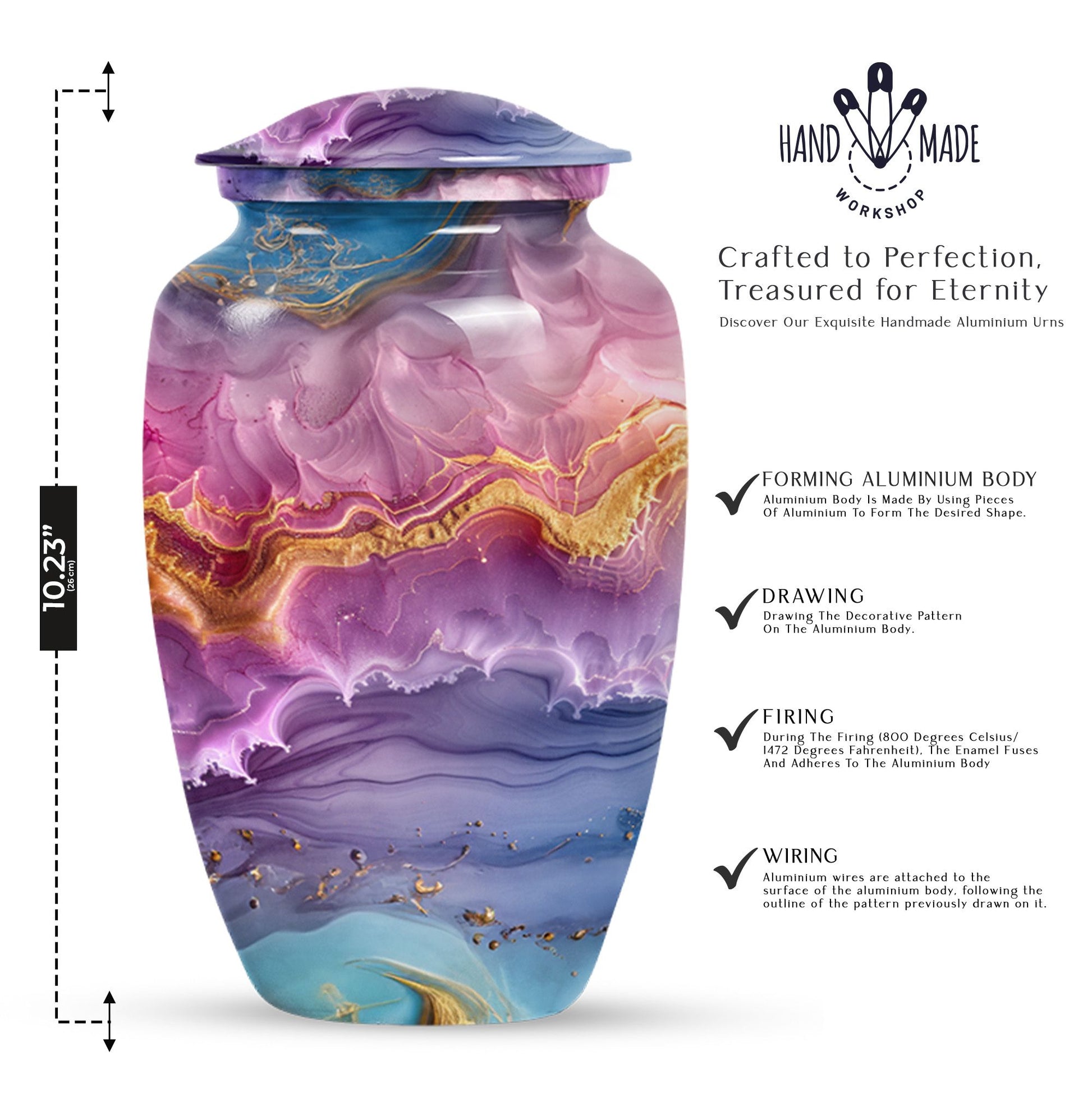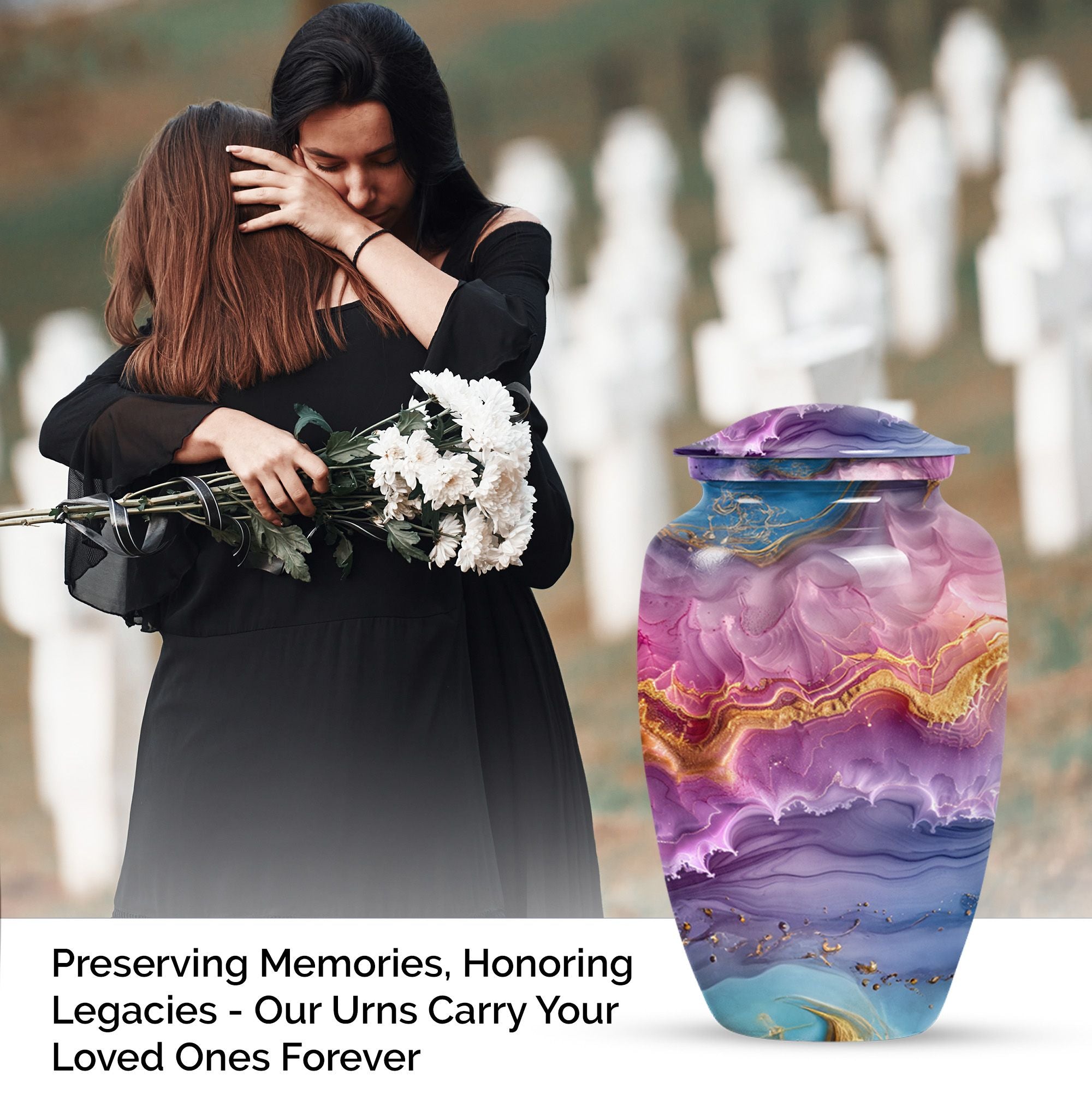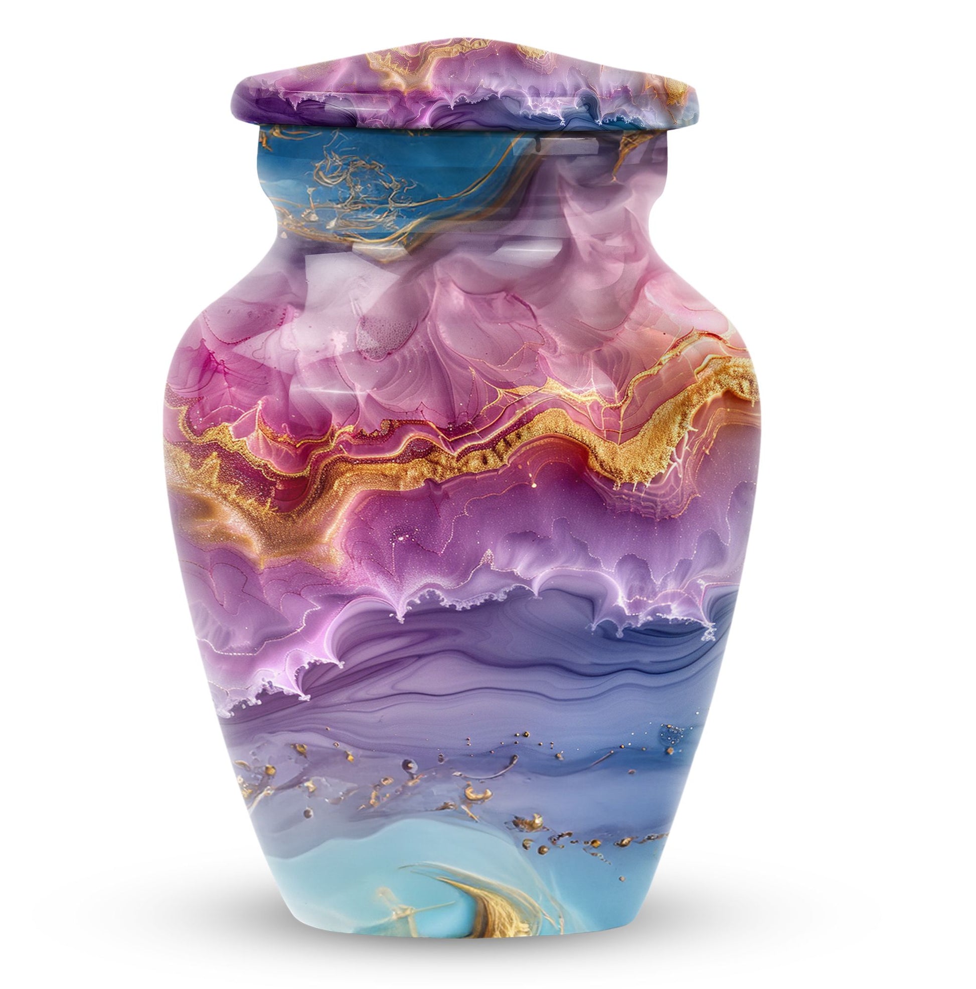 Show your reverent affection to your loved ones with this Vibrant Swirl Urn, masterfully crafted to serve as a reverential memorial urn for mom. Designed as a large urn, it demonstrates an abstract theme while providing a sizeable capacity of 200 cubic inches. This 10-inch cremation urn finds a delicate balance between style, dignity and lasting reminiscence. Weighing 3.3 pounds, the structure of this cremation component is constituted of robust aluminium – a testament to its durability. The urn comes in a classic form ensuring it adds a subtle touch of refinement to your environment without overtly curbing your existing decor. Personify the urn by engraving names, adding another layer of sentimental value. The urn is accompanied with a velvet pouch for dignified containment of ashes. The Vibrant Swirl Urn is not just an article for ashes; it's an elegant commemoration of the love and life shared. Its exclusive design amplifies its appeal, making it the perfect choice among cremation personalized urns for human ashes adult, ash adult urn human ash adult and burial cremation urns.