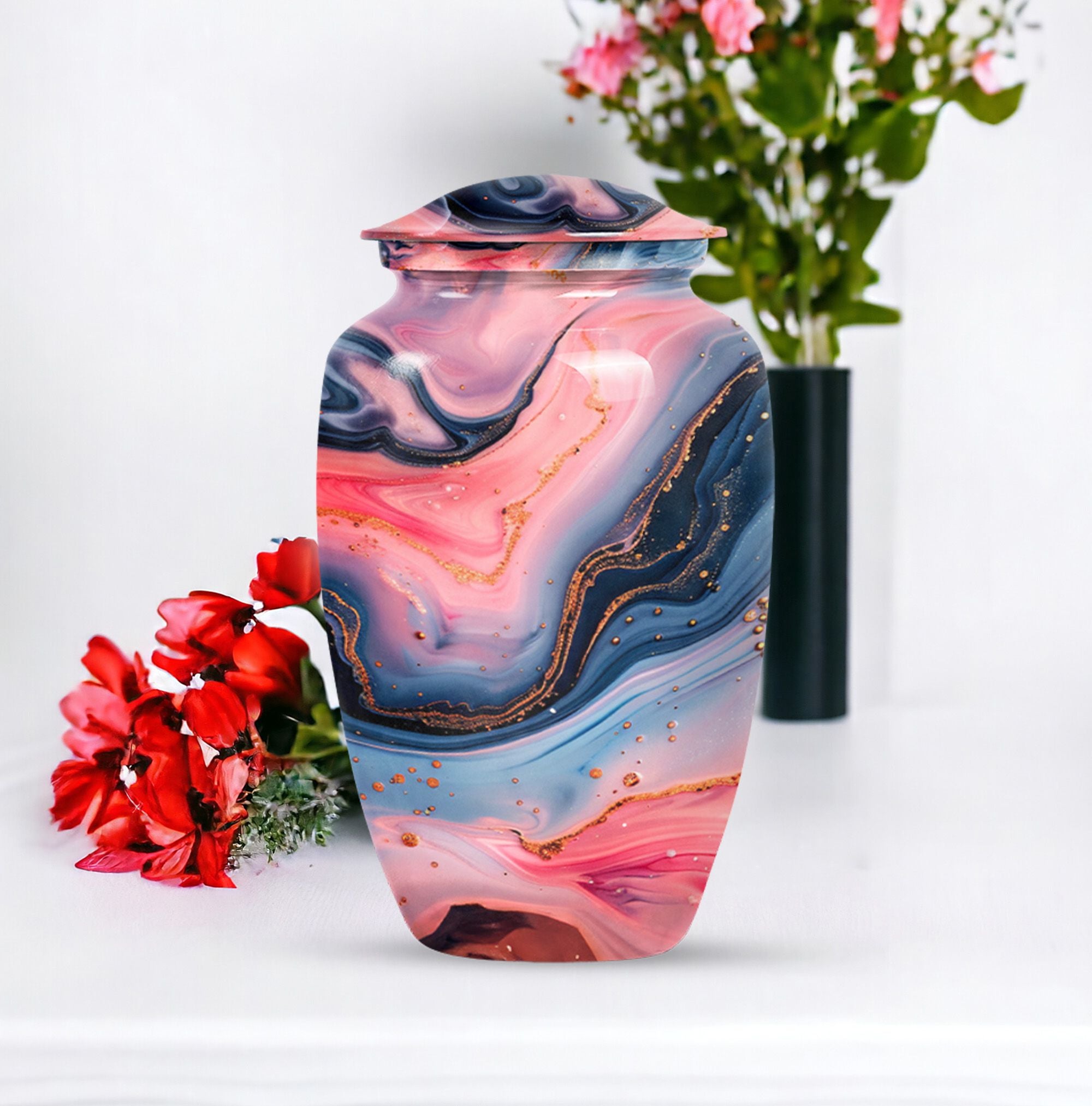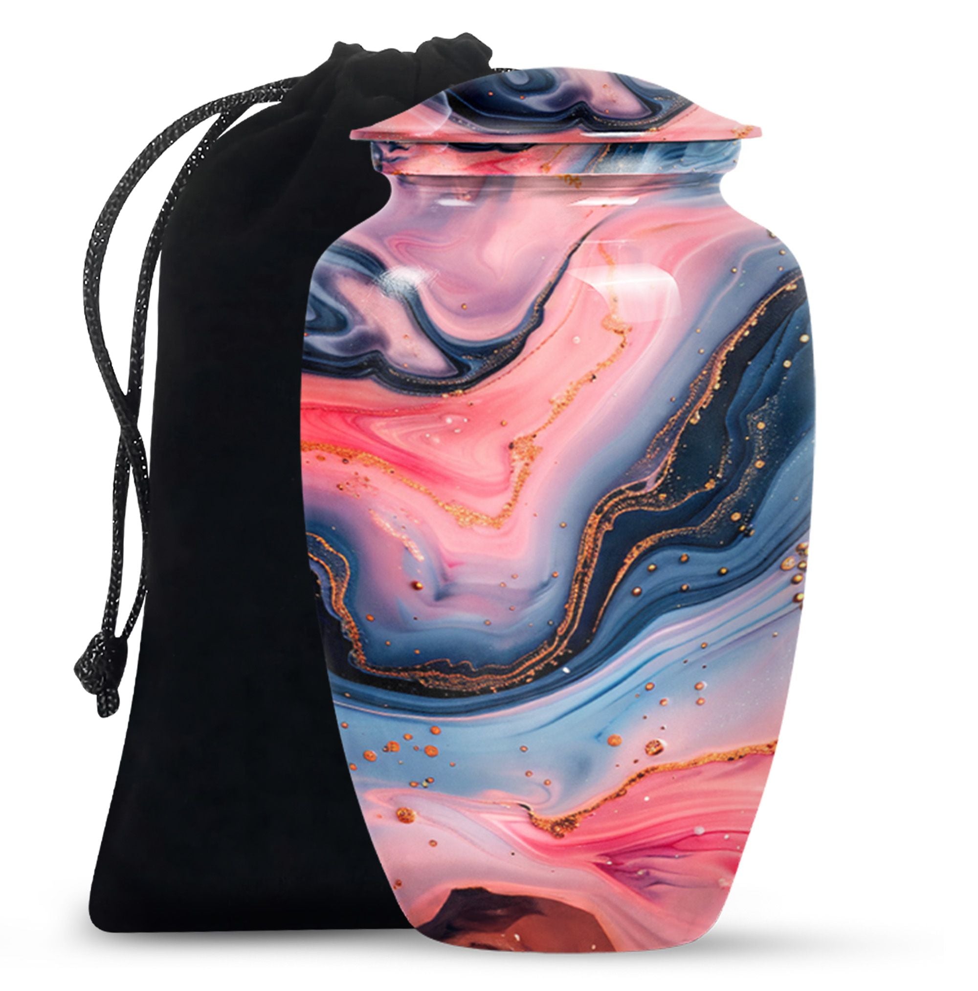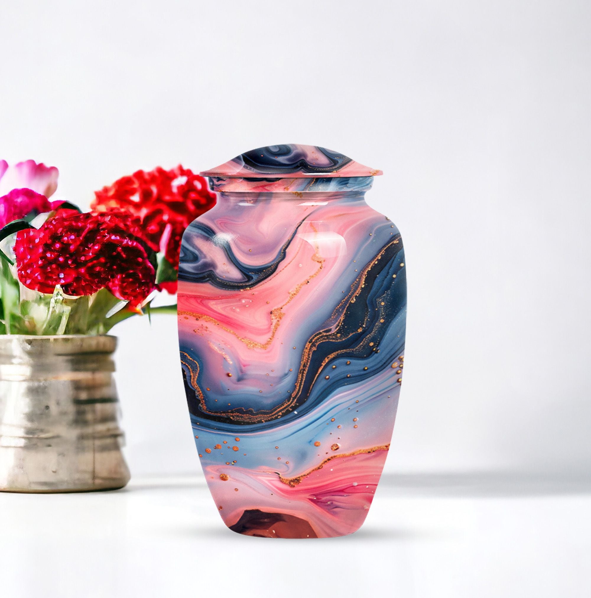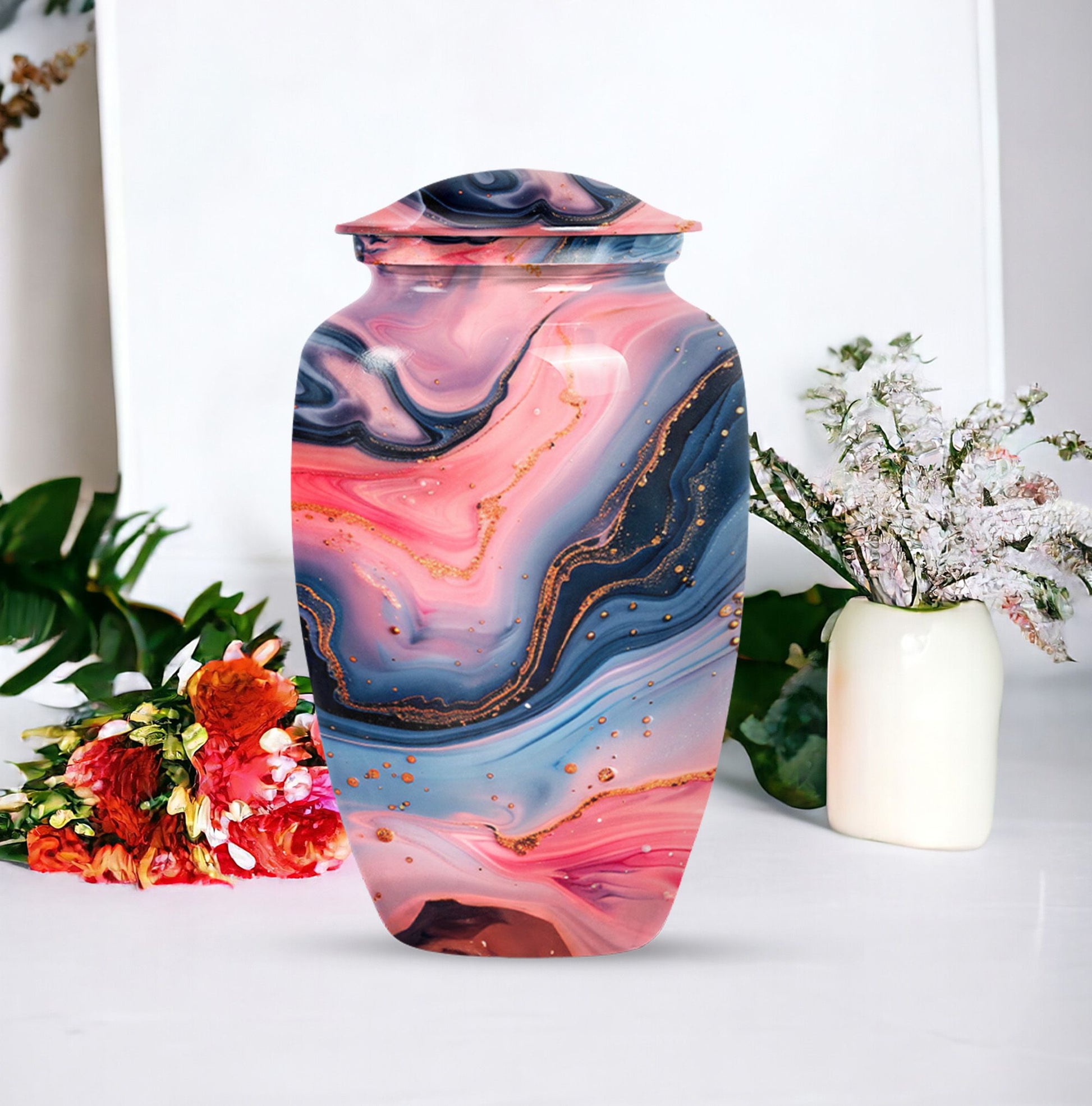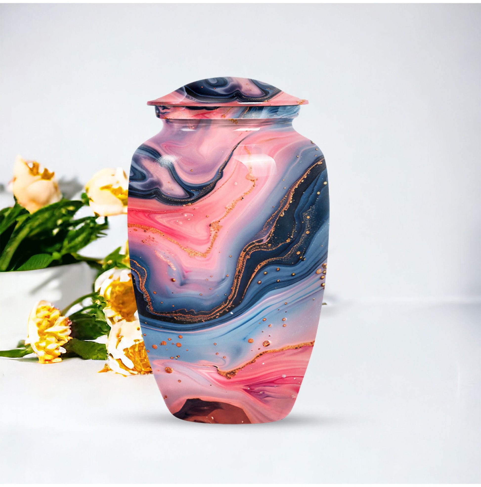 Eternize your loved one's memory with our Vibrant Swirl Urn, a high-quality memorial human urn for ashes. This urn, known for its abstract theme, seamlessly complements any decor, elevating a sacred space with grandeur and reverence. With a size of 10 inches and a weight of 3.3 pounds, it offers a nobly spacious capacity of 200 cubic inches. Thoughtfully constructed from Aluminium, this Large Urn is resilient and built to woo the times. Its timeless classic urn design spells minimalism, style, and grace, harnessing the everlasting essence of love. What's more, you can personalize this urn by engraving names, an intrinsic and meaningful layer to memorialization. The urn comes with a velvet pouch for containment and respectful safekeeping of ashes. A must-have from our memorial urns collection, this Vibrant Swirl Urn echoes serenity and everlasting care. This urn symbolizes ashes of love, forging an eternal bond with your departed loved one – an authentic yet warm way to store the sacred remains of the beloved.