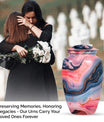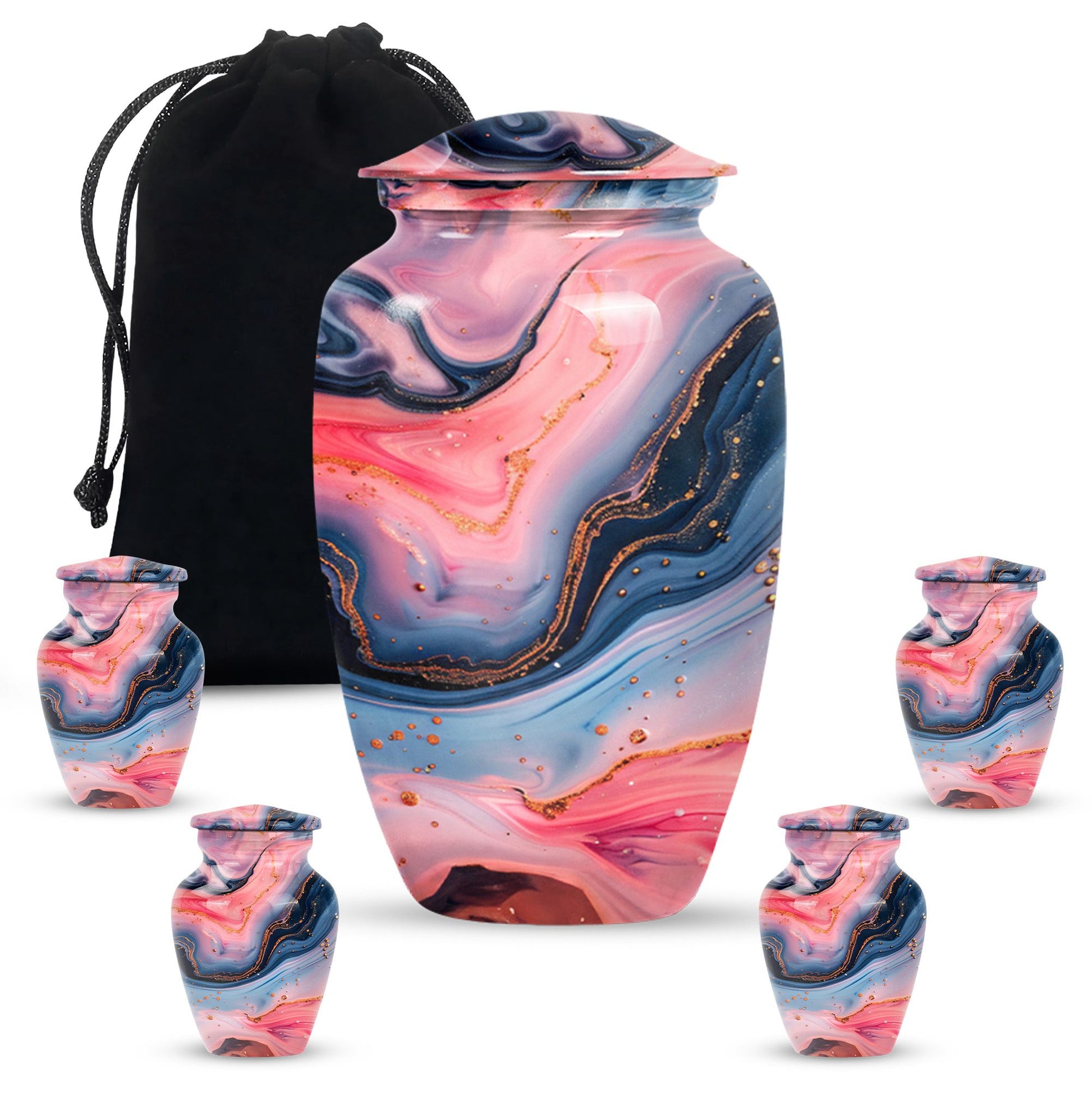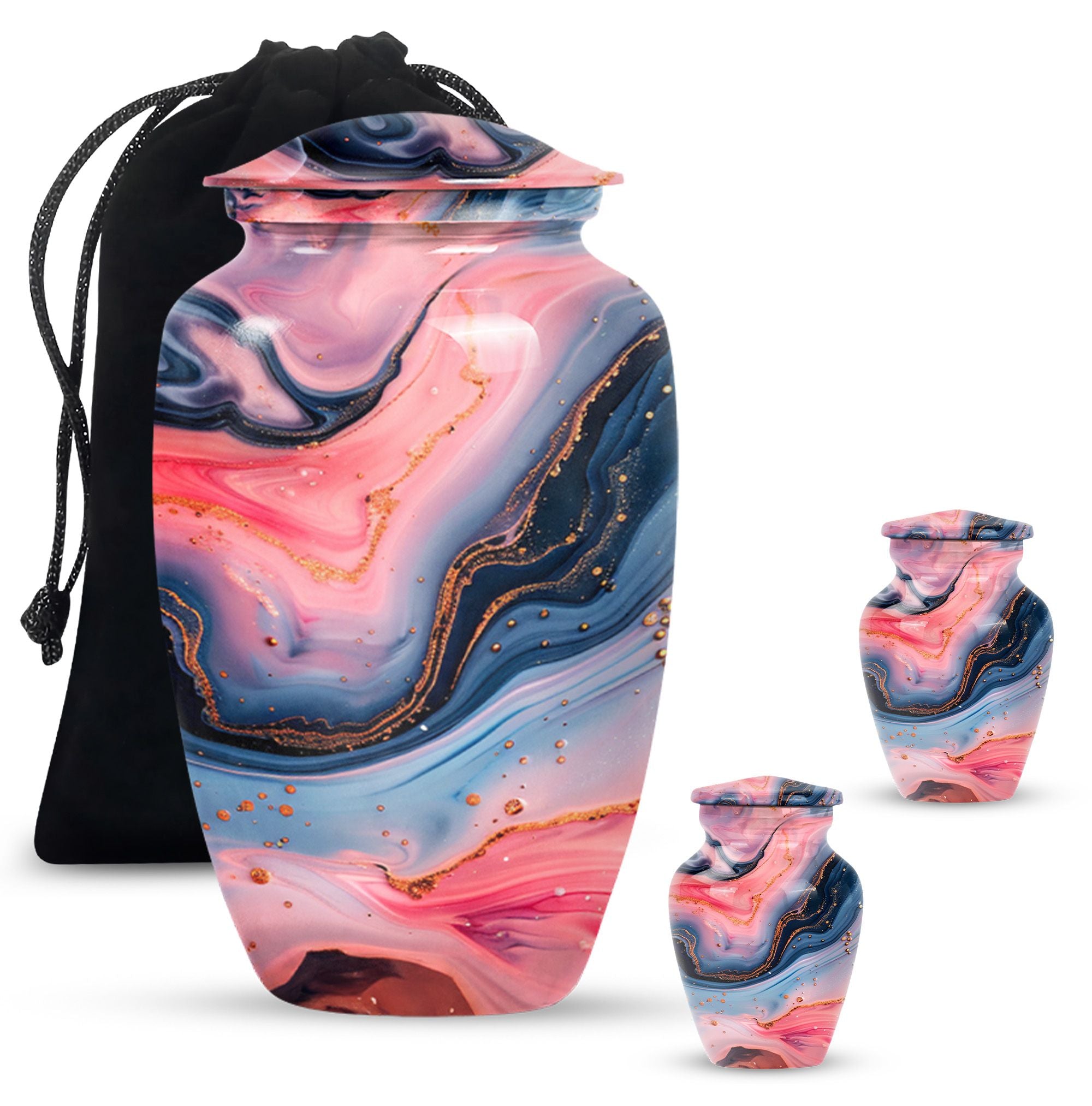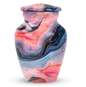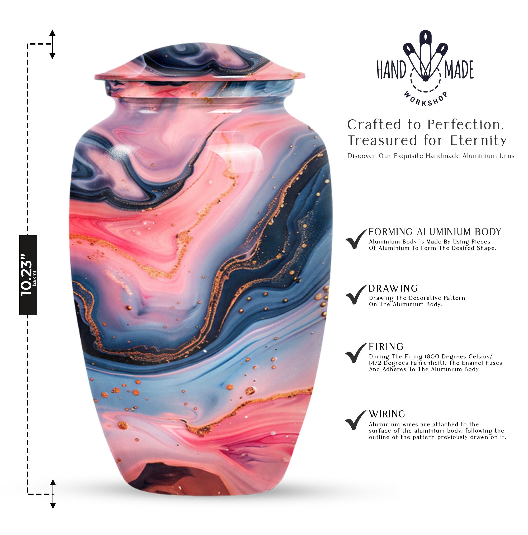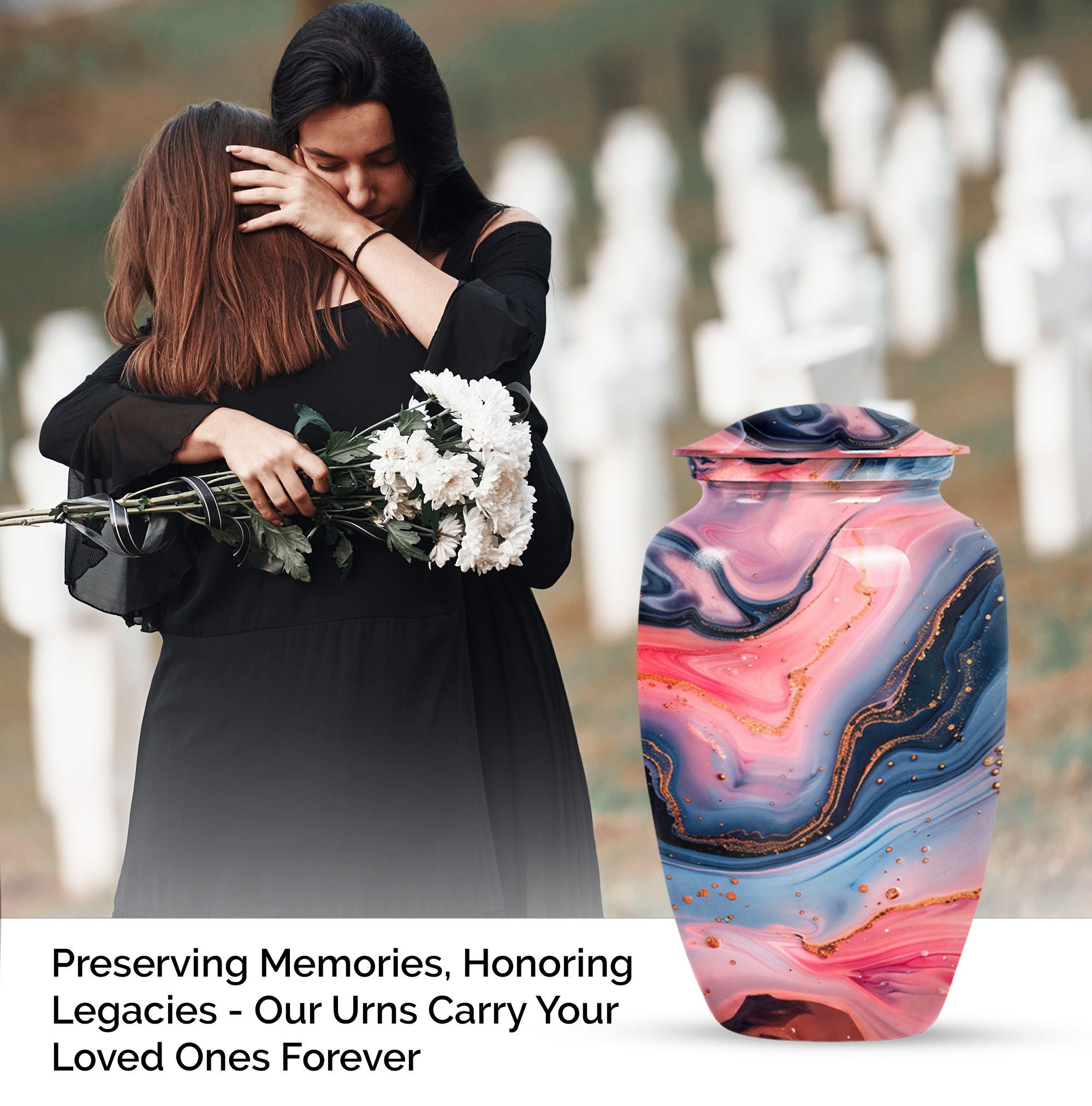 Eternize your loved one's memory with our Vibrant Swirl Urn, a high-quality memorial human urn for ashes. This urn, known for its abstract theme, seamlessly complements any decor, elevating a sacred space with grandeur and reverence. With a size of 10 inches and a weight of 3.3 pounds, it offers a nobly spacious capacity of 200 cubic inches. Thoughtfully constructed from Aluminium, this Large Urn is resilient and built to woo the times. Its timeless classic urn design spells minimalism, style, and grace, harnessing the everlasting essence of love. What's more, you can personalize this urn by engraving names, an intrinsic and meaningful layer to memorialization. The urn comes with a velvet pouch for containment and respectful safekeeping of ashes. A must-have from our memorial urns collection, this Vibrant Swirl Urn echoes serenity and everlasting care. This urn symbolizes ashes of love, forging an eternal bond with your departed loved one – an authentic yet warm way to store the sacred remains of the beloved.