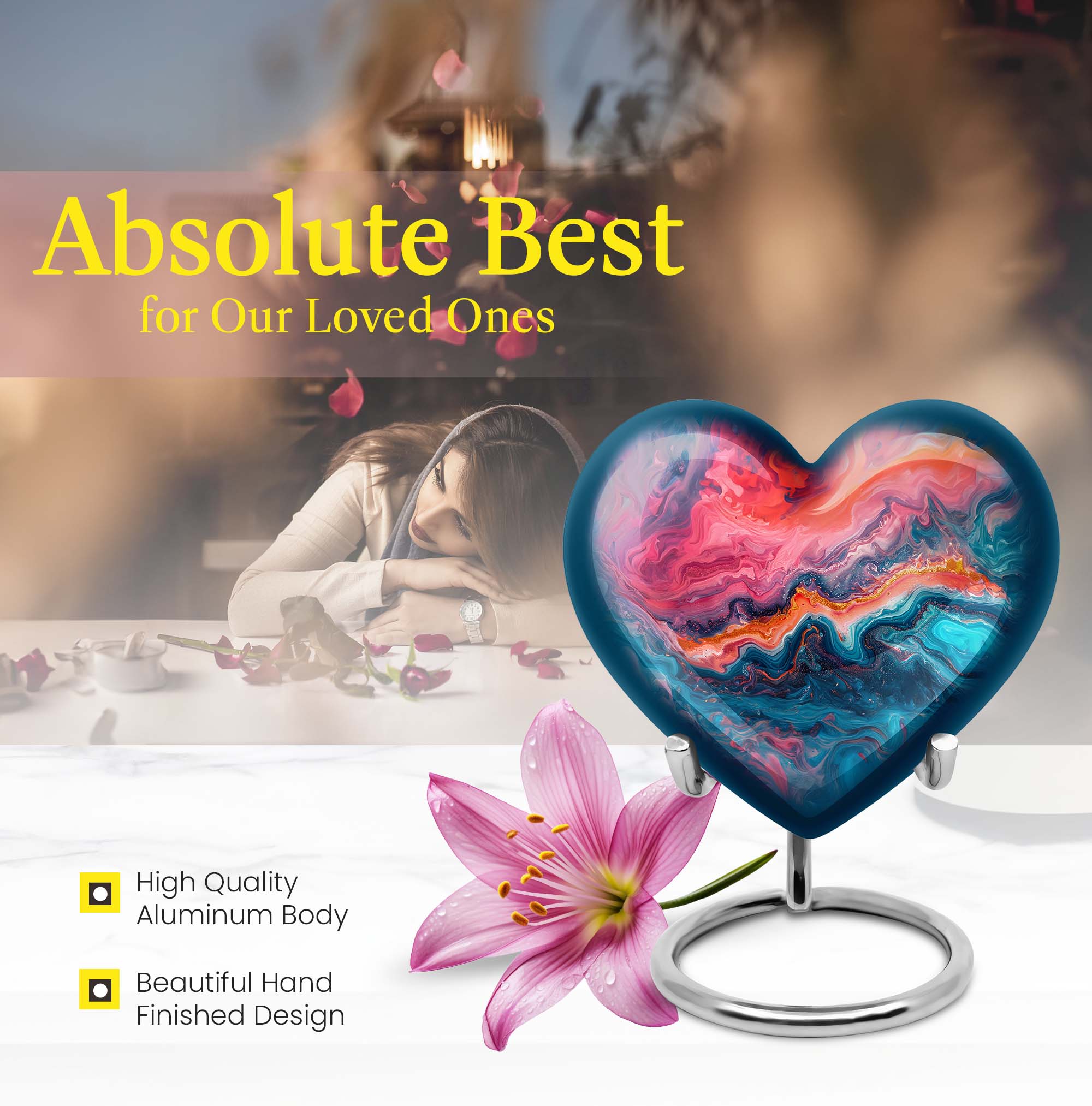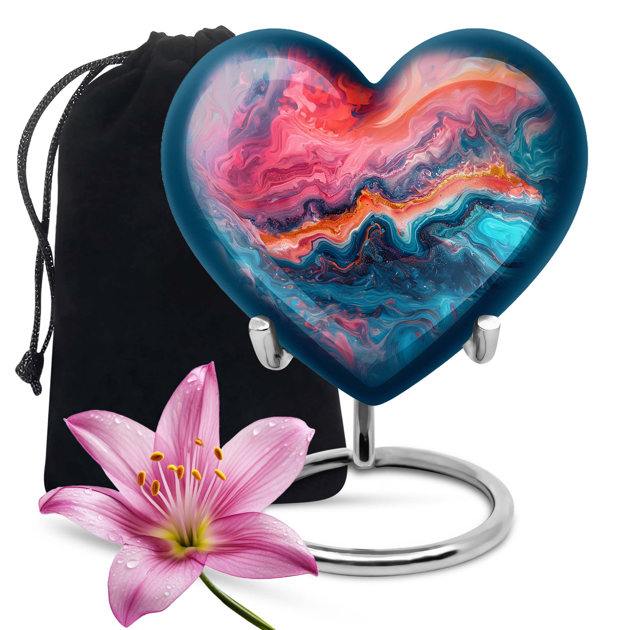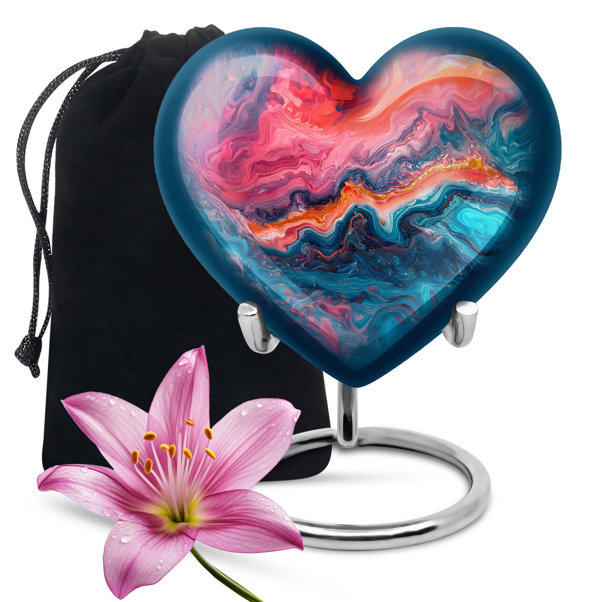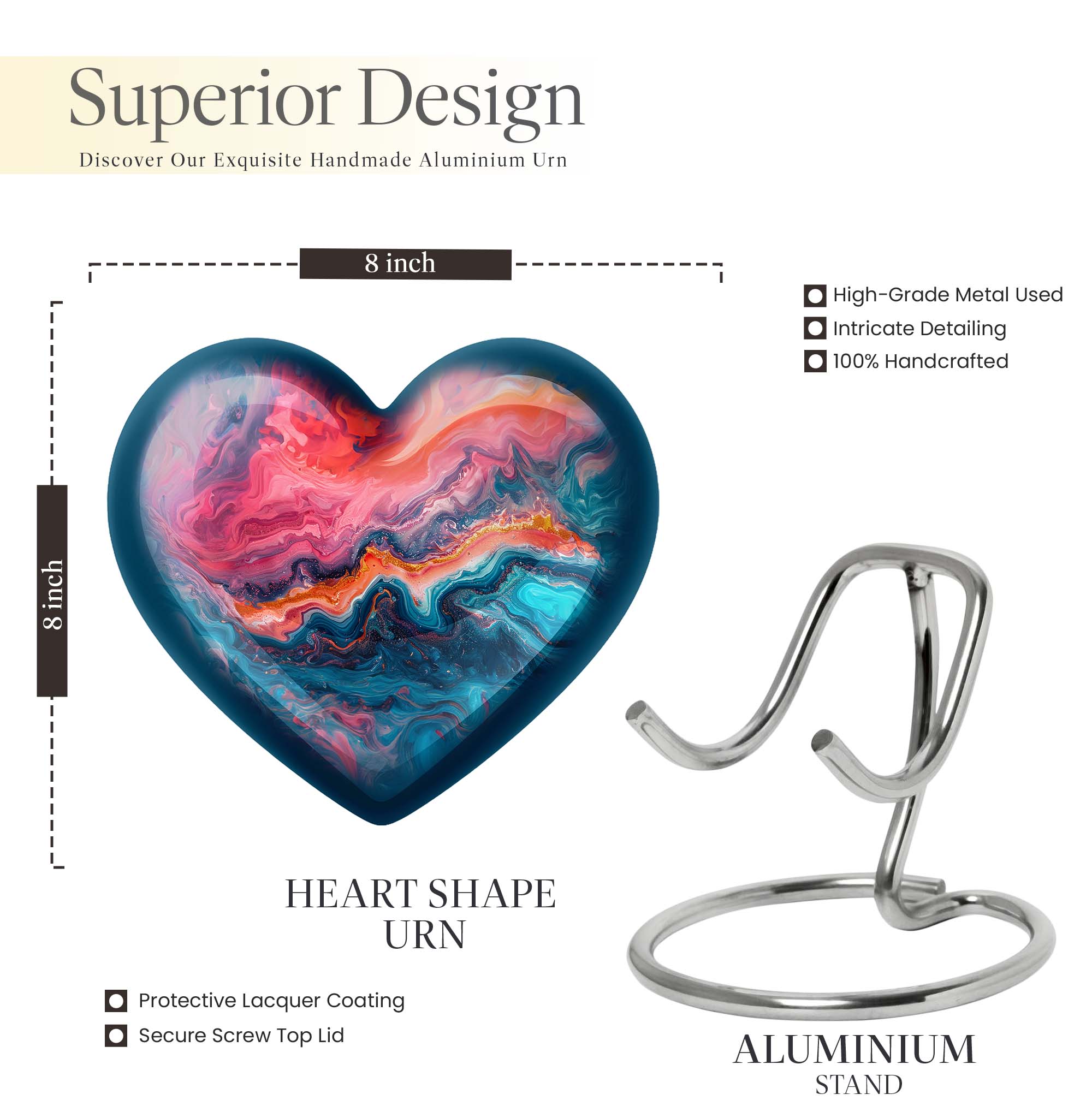 This Vibrant Swirl Urn is an eloquent solution to honor the life of a beloved adult woman. Crafted meticulously with high-grade aluminium, this burial cremation urn for adult ashes weighs a sturdy 3.3 pounds and stands proud at 10 inches in height. The abstract, heart-shaped design encapsulates a capacity of 200 cubic inches, providing adequate space for containment of commemorative ashes. Its accompanying velvet pouch offers additional convenience and respect for the ceremonial process. This large urn sports the option to personalize, you can effortlessly engrave names onto its vibrant surface, making it a meaningful keepsake or a vessel of remembrance. As one of our premium memorial urns offerings, it combines tradition and modernity, resulting in a unique expression of love and remembrance. Be it for men or women looking for urns for human ashes, this piece represents enduring respect for your cherished ones.