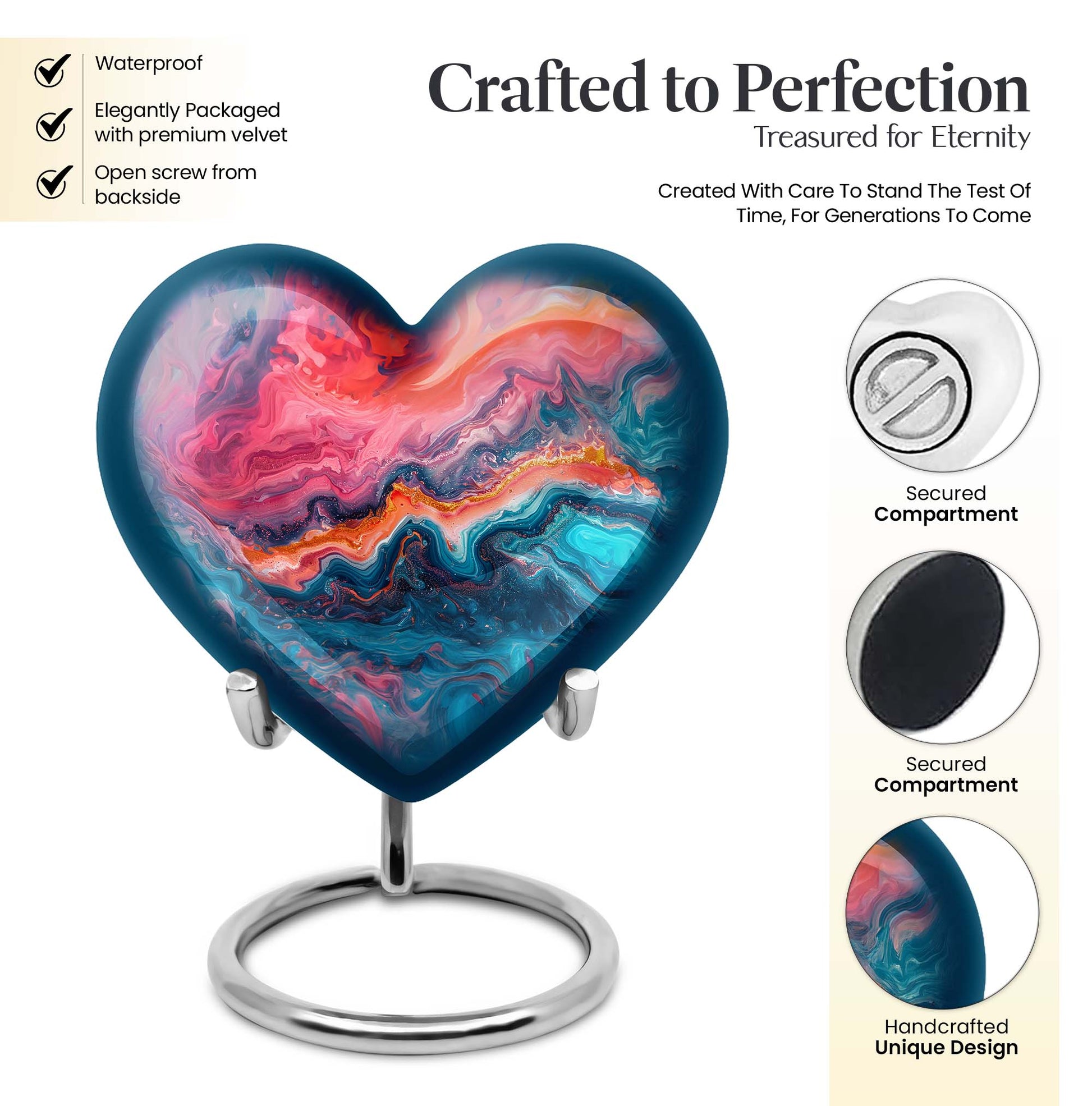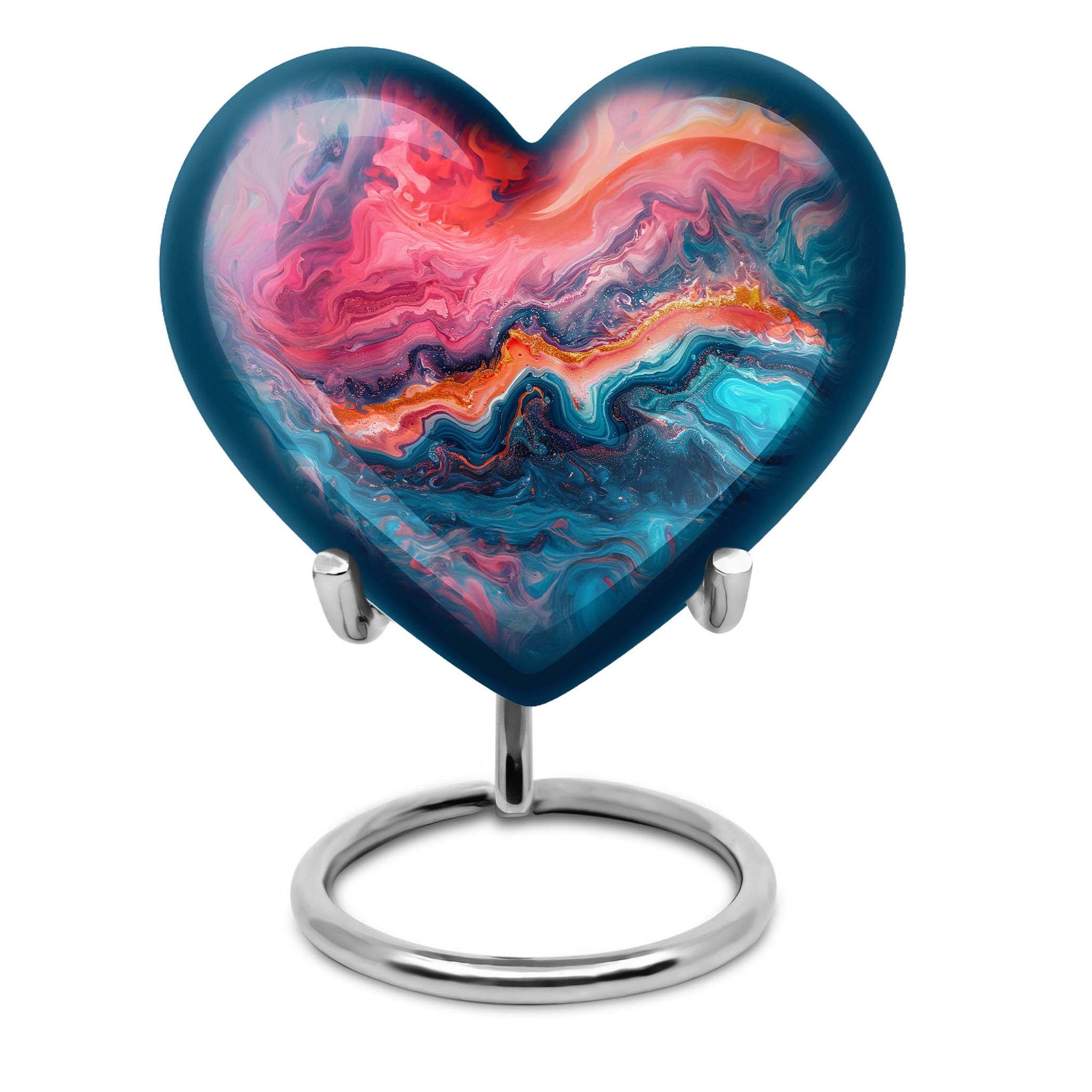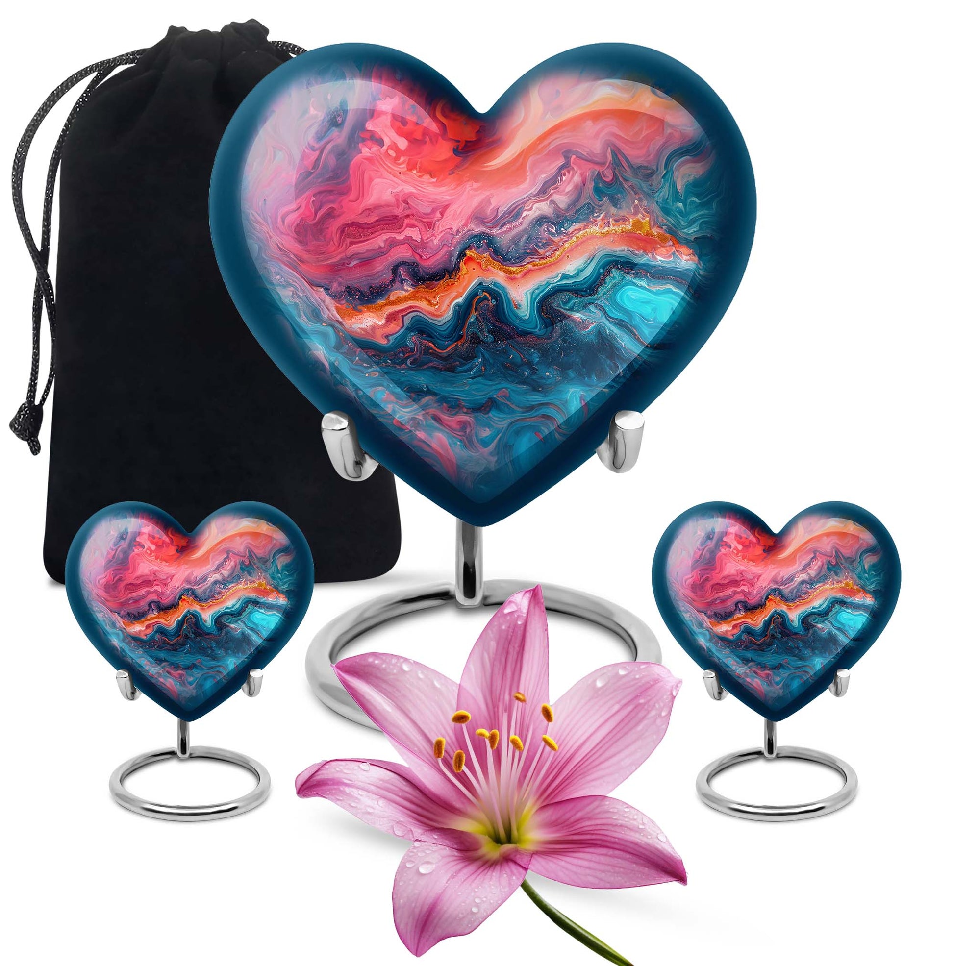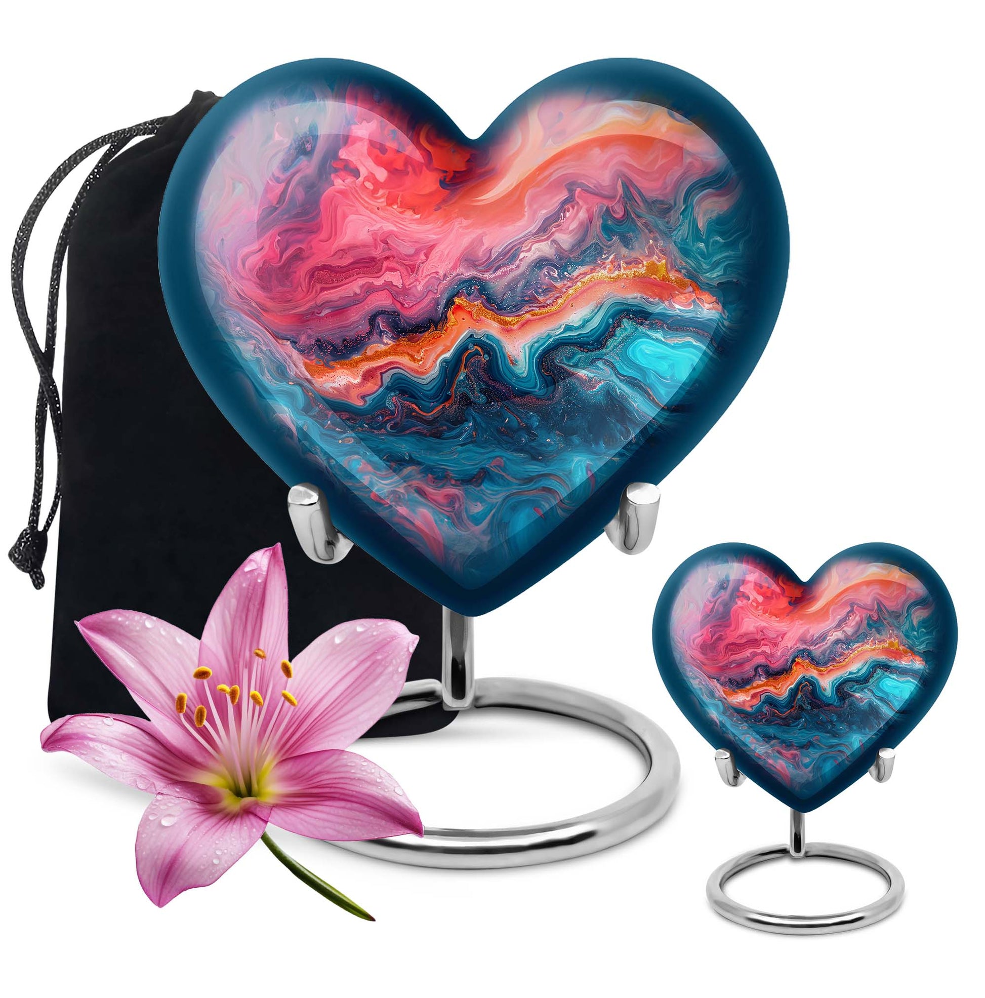This Vibrant Swirl Urn is an eloquent solution to honor the life of a beloved adult woman. Crafted meticulously with high-grade aluminium, this burial cremation urn for adult ashes weighs a sturdy 3.3 pounds and stands proud at 10 inches in height. The abstract, heart-shaped design encapsulates a capacity of 200 cubic inches, providing adequate space for containment of commemorative ashes. Its accompanying velvet pouch offers additional convenience and respect for the ceremonial process. This large urn sports the option to personalize, you can effortlessly engrave names onto its vibrant surface, making it a meaningful keepsake or a vessel of remembrance. As one of our premium memorial urns offerings, it combines tradition and modernity, resulting in a unique expression of love and remembrance. Be it for men or women looking for urns for human ashes, this piece represents enduring respect for your cherished ones.