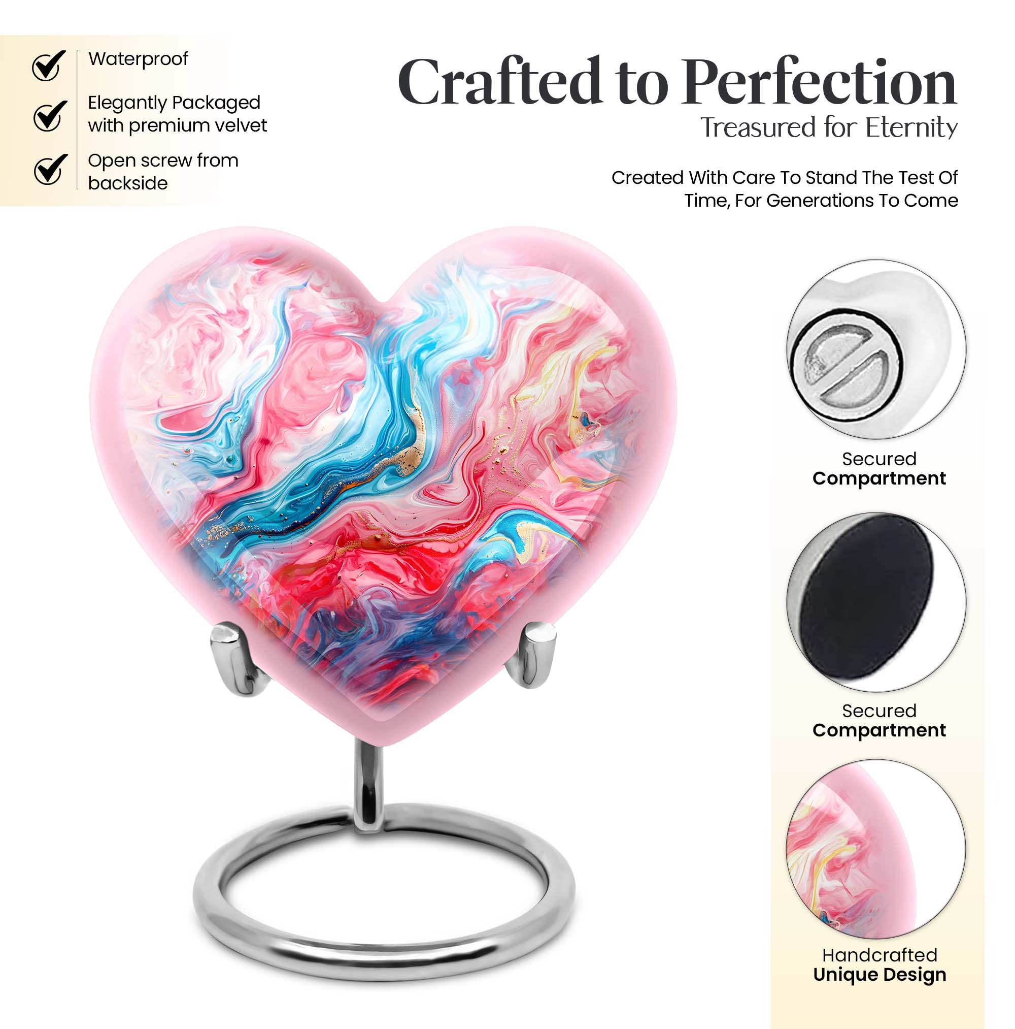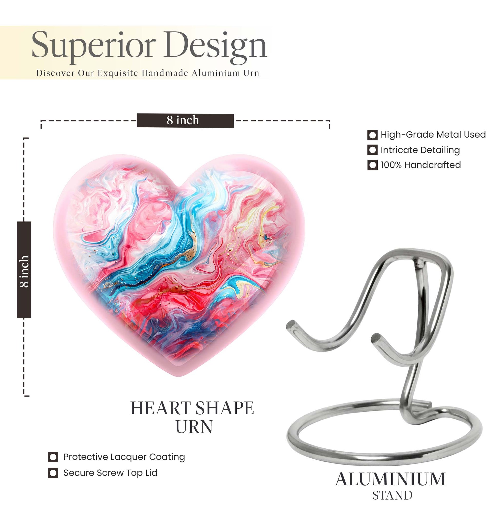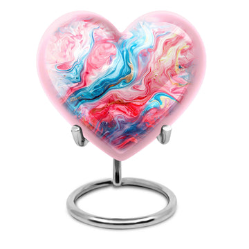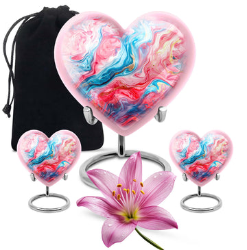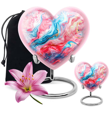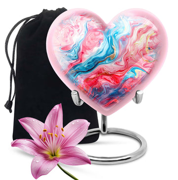 Gracefully crafted, our Vibrant Swirl Urn is a beautiful tribute designed to honor and remember your loved ones. This burial urn for human ashes is 10 inches in size, making it functional as a large urn. Worthy of the highest honor, it is a holdover from the abstract theme that breathes life, even in memories. Made with exquisite aluminium, the urn weighs merely 3.3 pounds, effortlessly carrying up to 200 cubic inches of ashes. The package arrives with a soft and plush velvet pouch, the perfect containment for ashes. The heart urn design adds an intimate touch to this piece, subtly encapsulating the essence of love. We also offer the ability to personalize these memorial urns with engraved names—a touching touchstone to keep your loved ones nearby. It's more than an urn—it's valuable memento designed to deliver solace in remembrance. Perfect as a funeral urn for mom, or any loved one. Keywords: Urn ash ashes adult, burial urns, cremation urn adult.