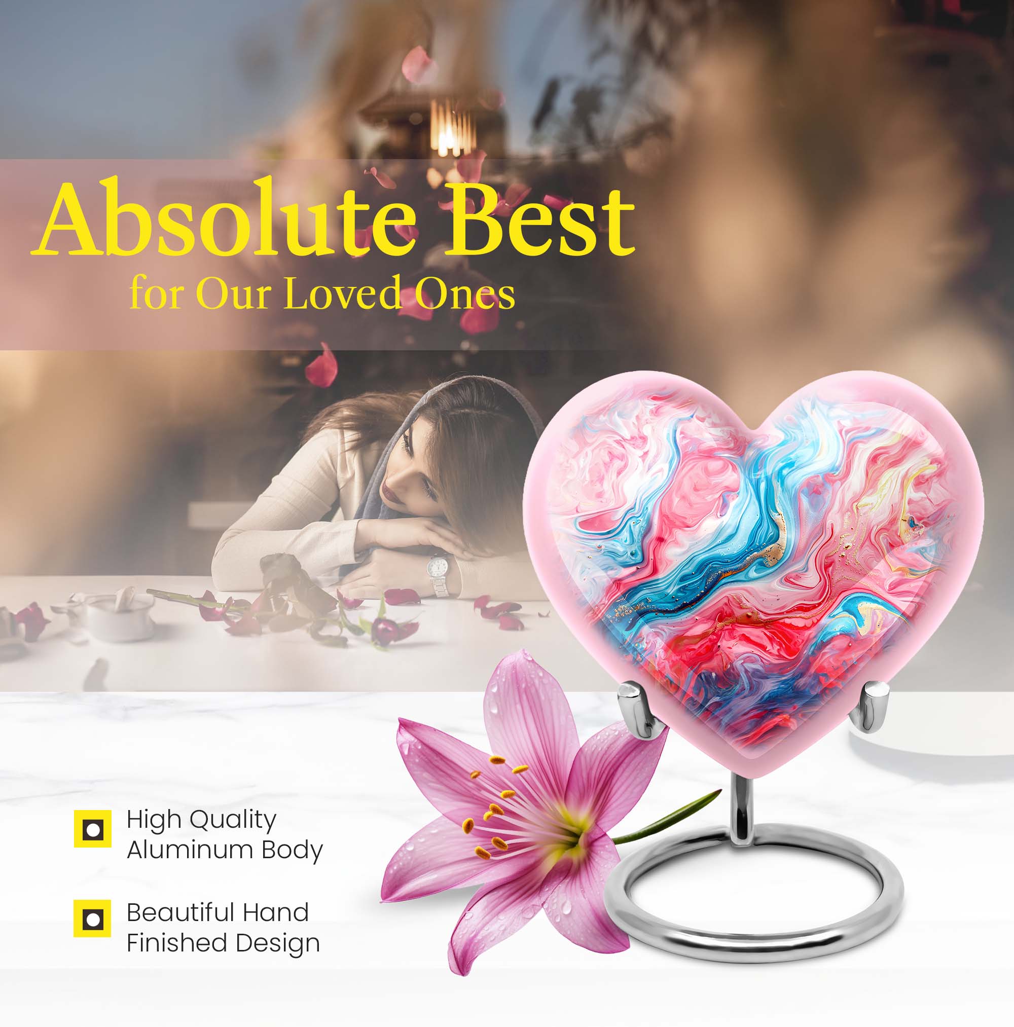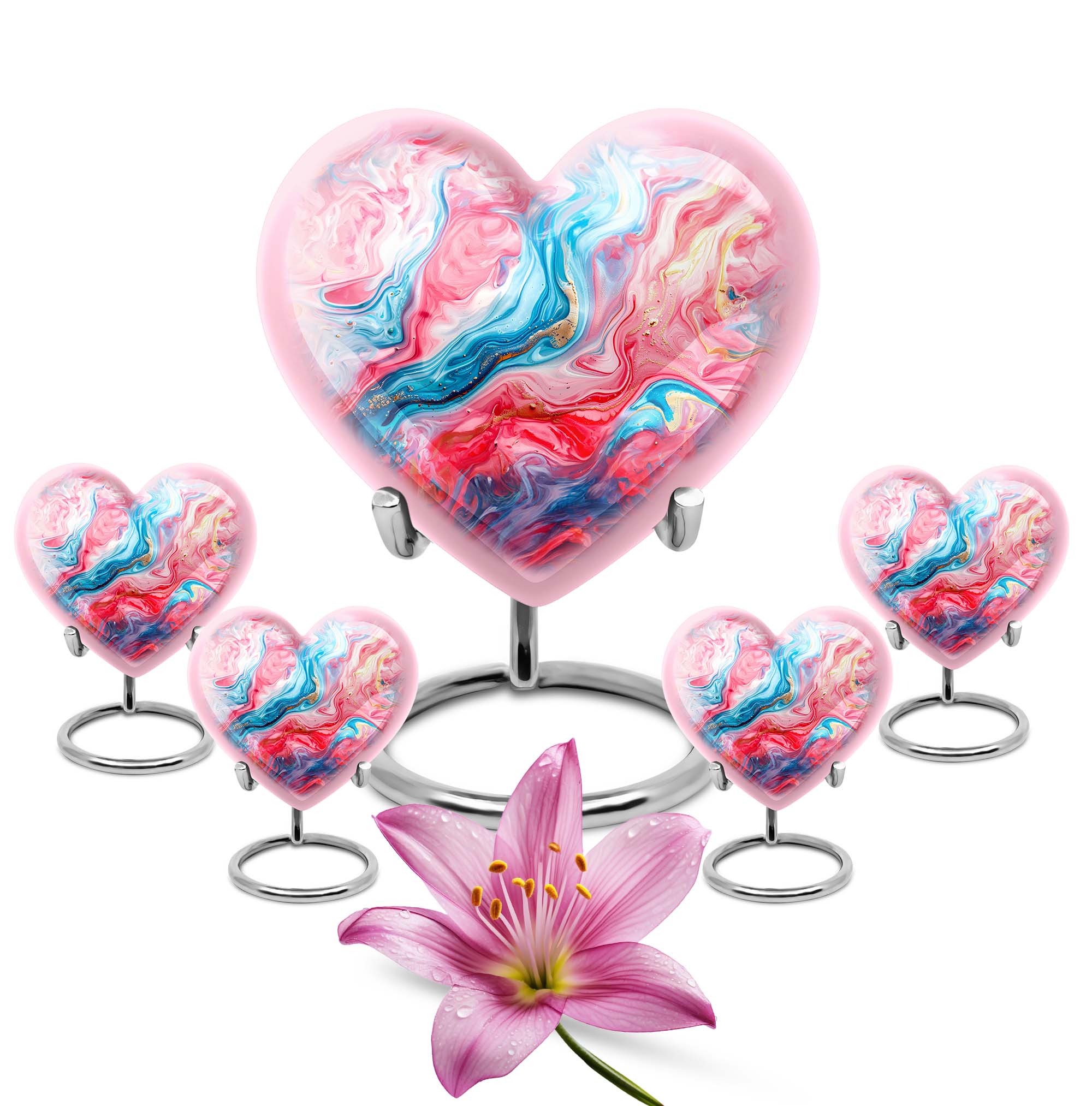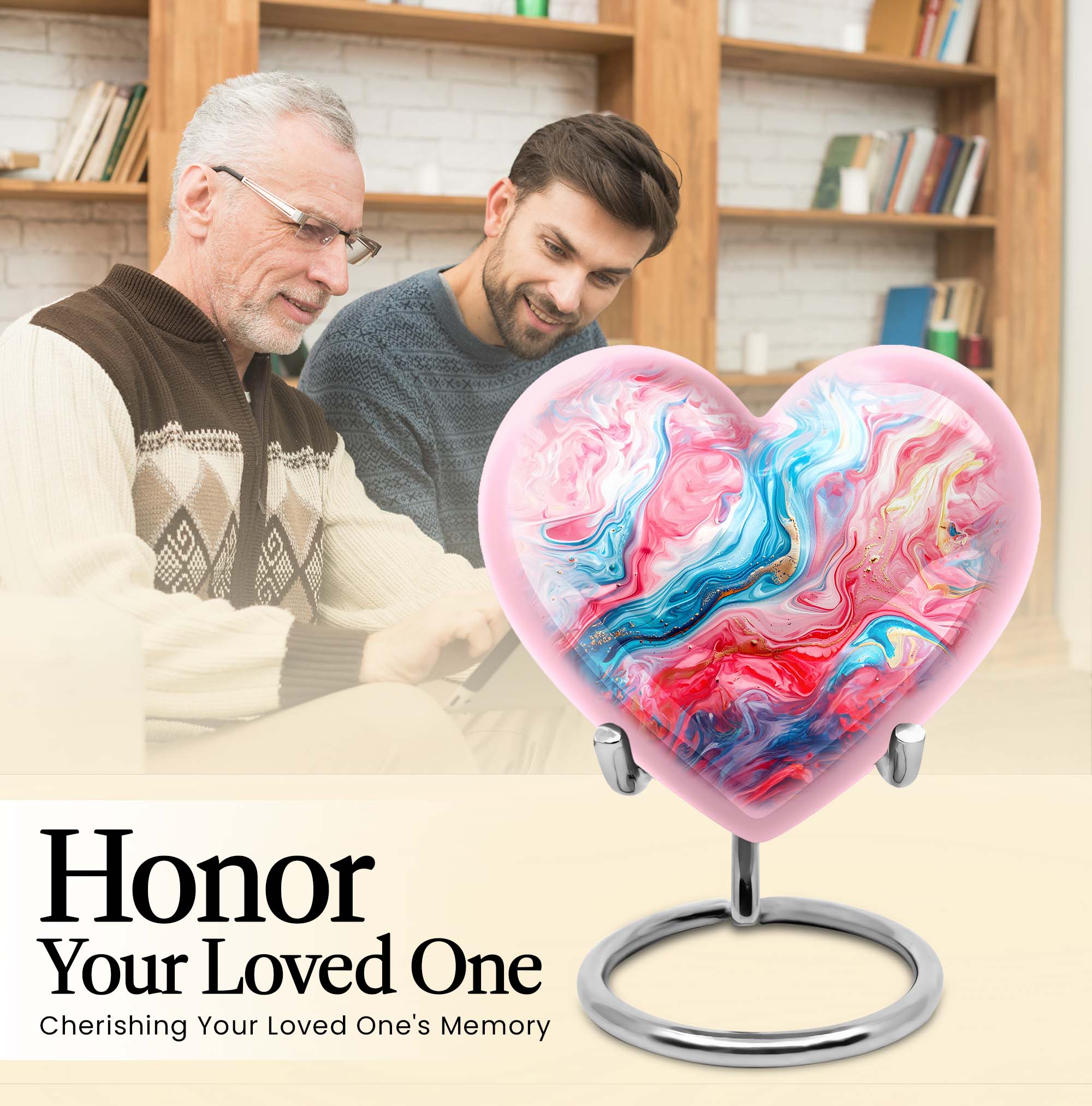 Gracefully crafted, our Vibrant Swirl Urn is a beautiful tribute designed to honor and remember your loved ones. This burial urn for human ashes is 10 inches in size, making it functional as a large urn. Worthy of the highest honor, it is a holdover from the abstract theme that breathes life, even in memories. Made with exquisite aluminium, the urn weighs merely 3.3 pounds, effortlessly carrying up to 200 cubic inches of ashes. The package arrives with a soft and plush velvet pouch, the perfect containment for ashes. The heart urn design adds an intimate touch to this piece, subtly encapsulating the essence of love. We also offer the ability to personalize these memorial urns with engraved names—a touching touchstone to keep your loved ones nearby. It's more than an urn—it's valuable memento designed to deliver solace in remembrance. Perfect as a funeral urn for mom, or any loved one. Keywords: Urn ash ashes adult, burial urns, cremation urn adult.