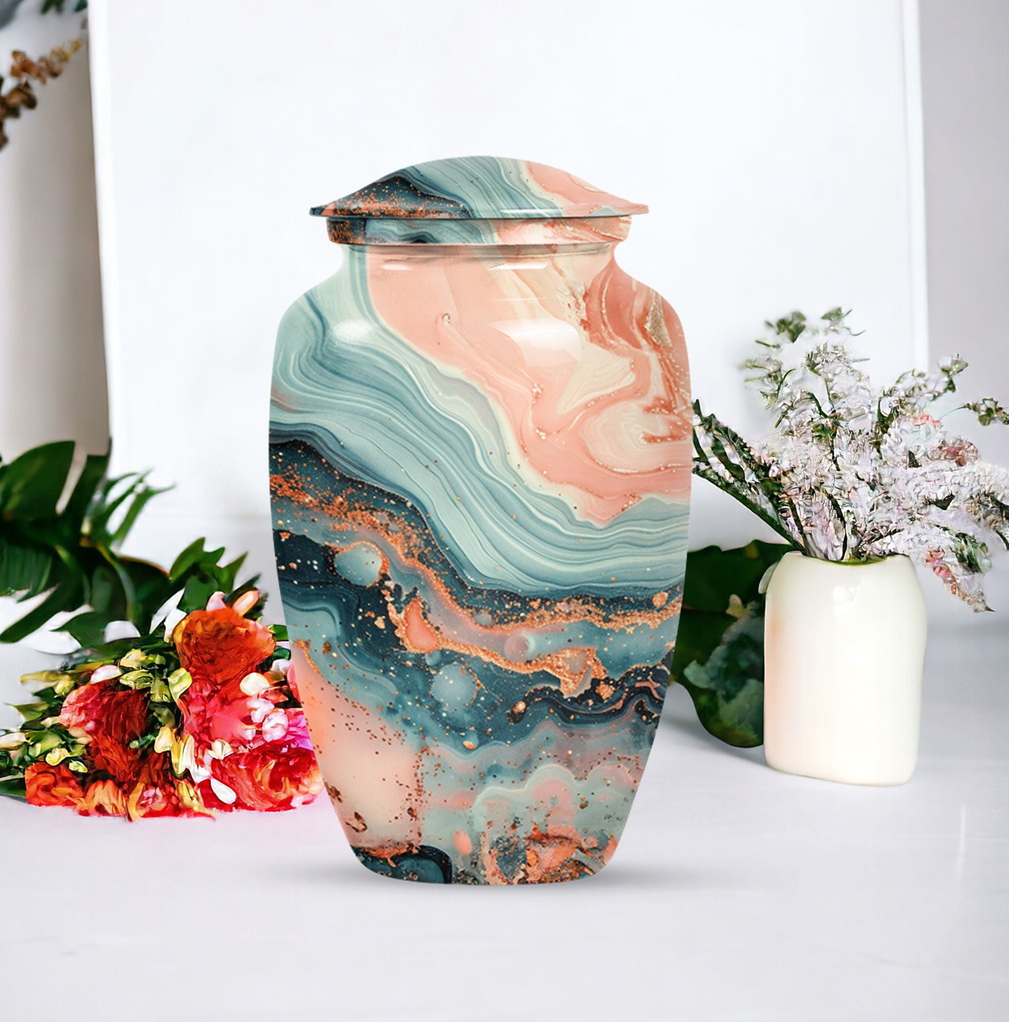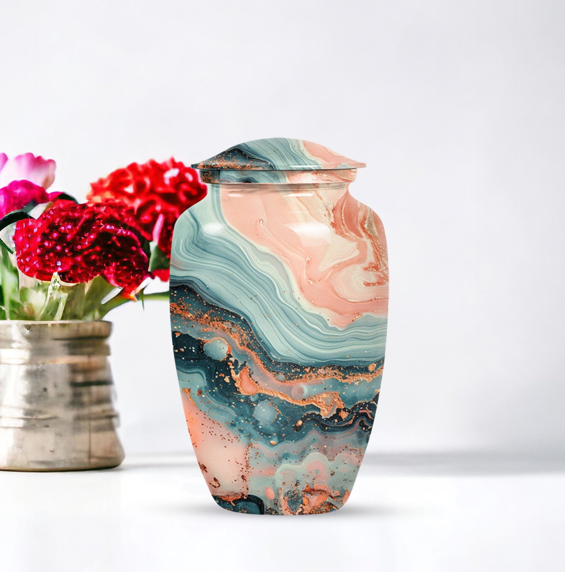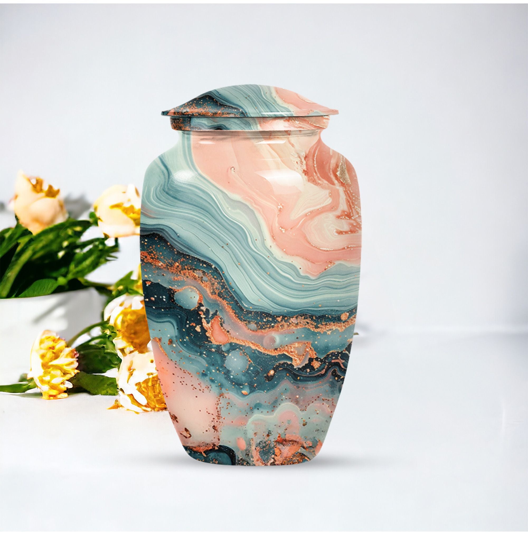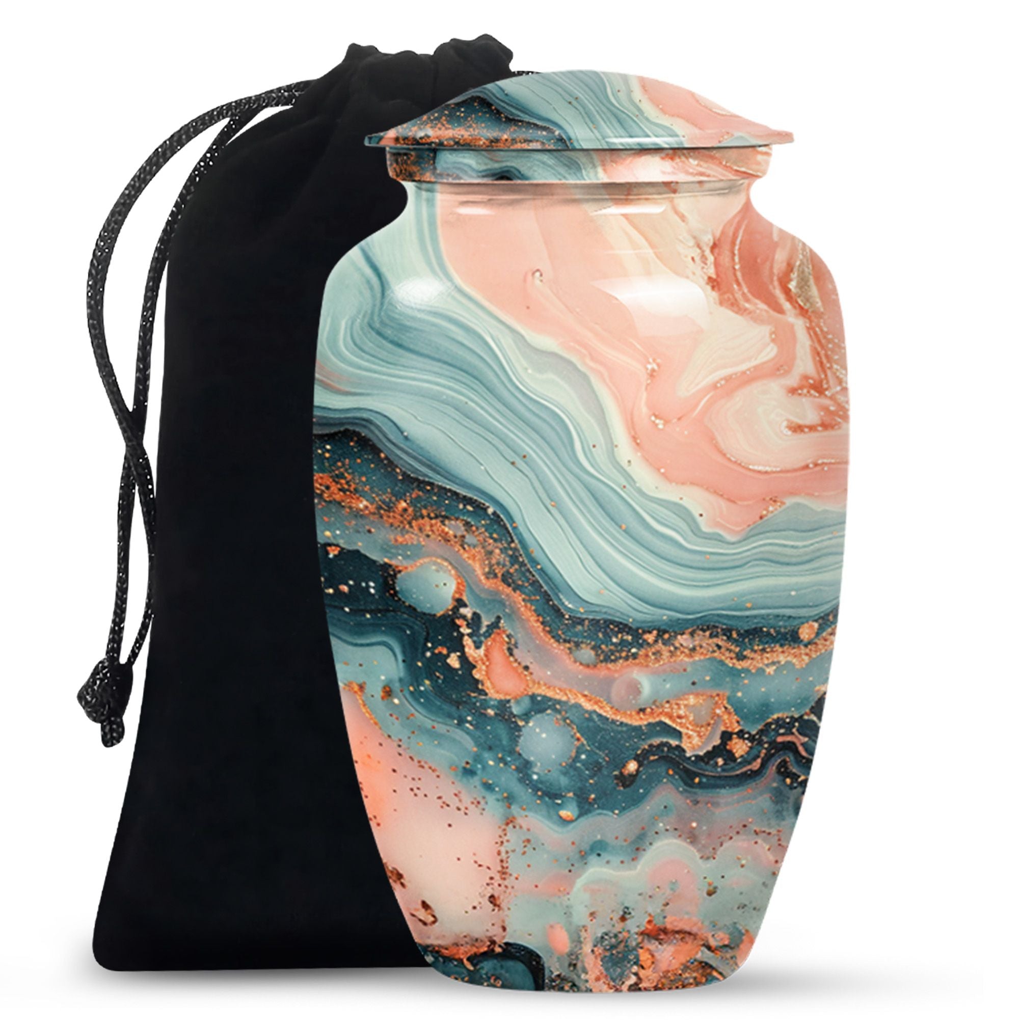 Emanate sublime solemnity with the Vibrant Swirl Urn. A distinct departure from ordinary urn designs, this item's abstract theme provides visual intrigue, making it a sophisticated choice in the range of cremation large urns for ashes. Made of sturdy aluminium, the urn measures 10 inches in height, flaunts an enviable 200 cubic inches capacity, making it ideal for adults, seniors planning memorial ceremonies. Weighing at a modest 3.3 pounds, it offers tangible permanence without being overly cumbersome. The urn's distinguished size contributes to its overall magnificence – embodying class and gravitas in a tangible manner. Usher in an element of personal charm with our customization offer: engrave names on this cremation urn for a touching memorabilia. Included in the package is a lovely velvet pouch, perfect for the dignified containment of ashes. Popularly searched terms linking to this exquisite artefact include 'funeral gifts', 'metal urns for human ashes', and 'cremation medium urns'. This urn effortlessly marries formality with a dash of creative wistfulness, becoming a sure centrepiece of quiet reflection during these times.