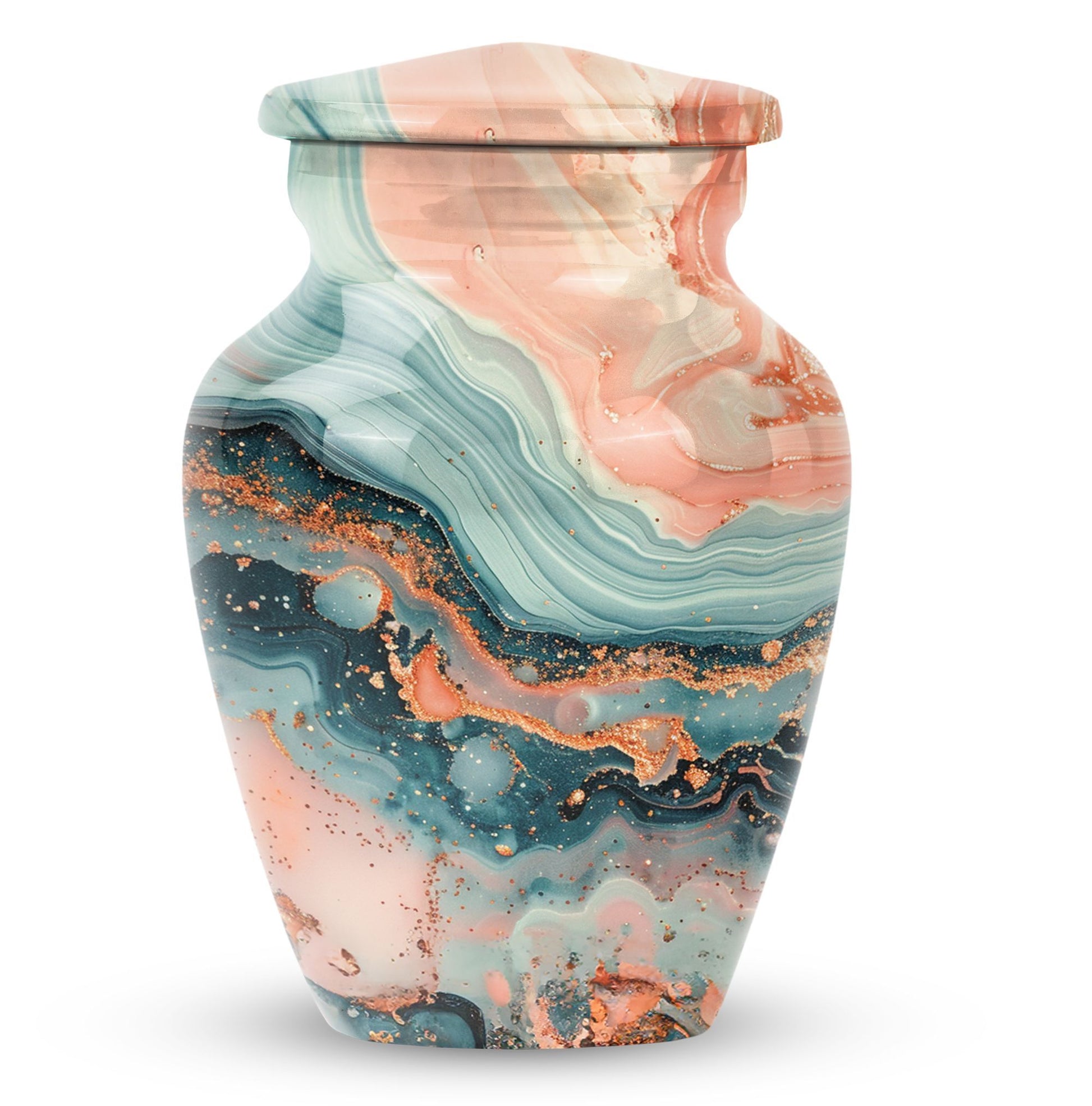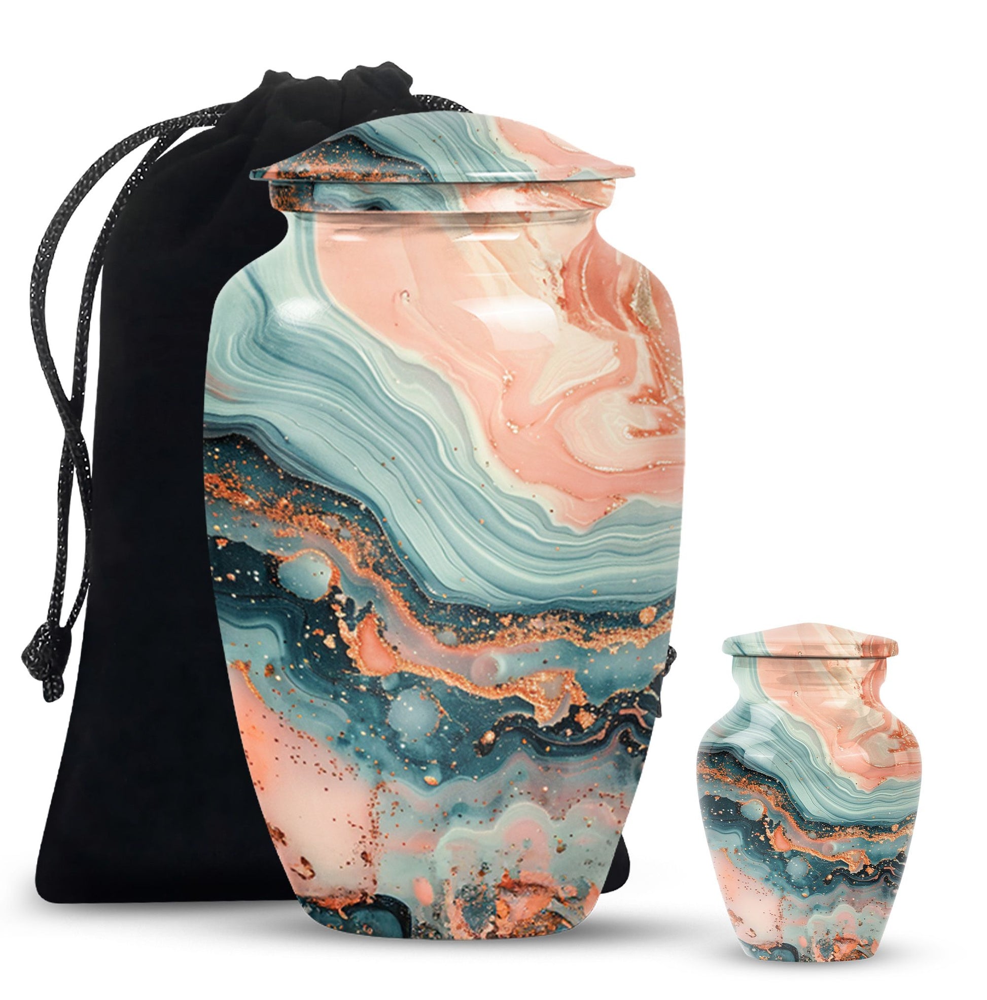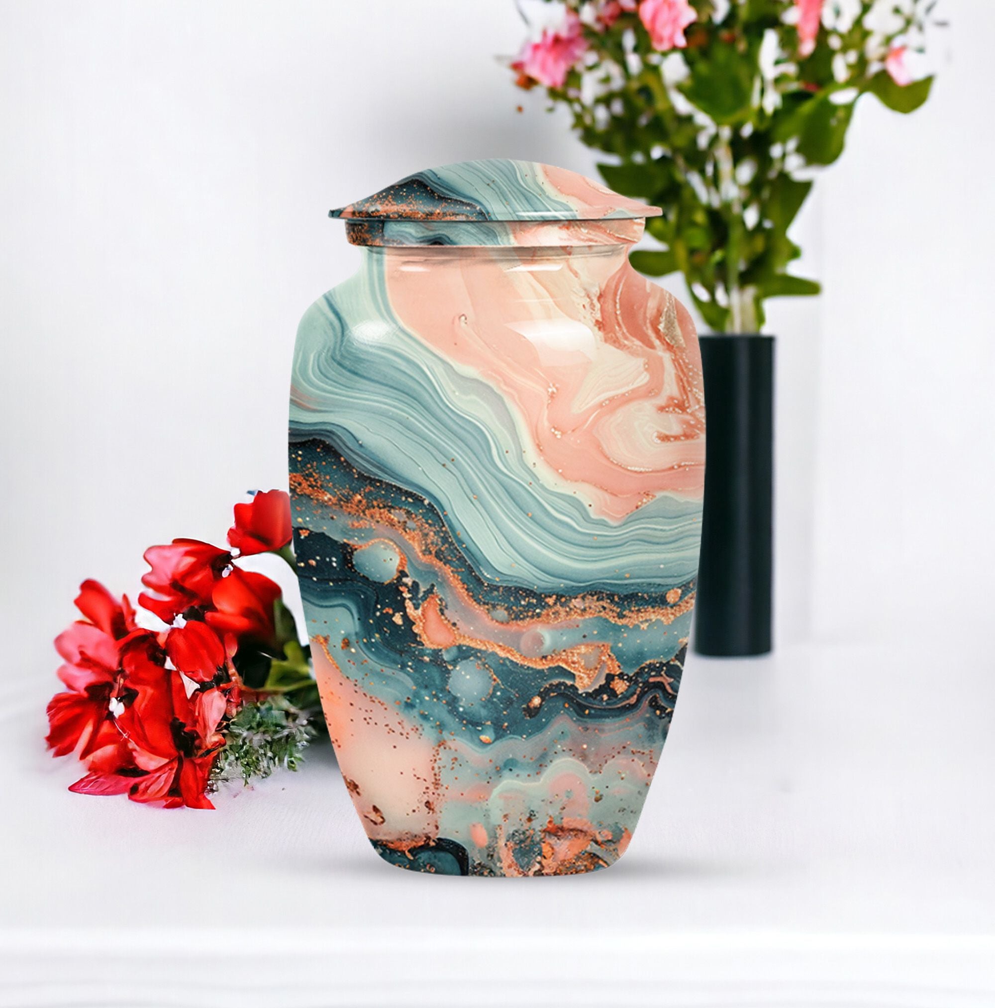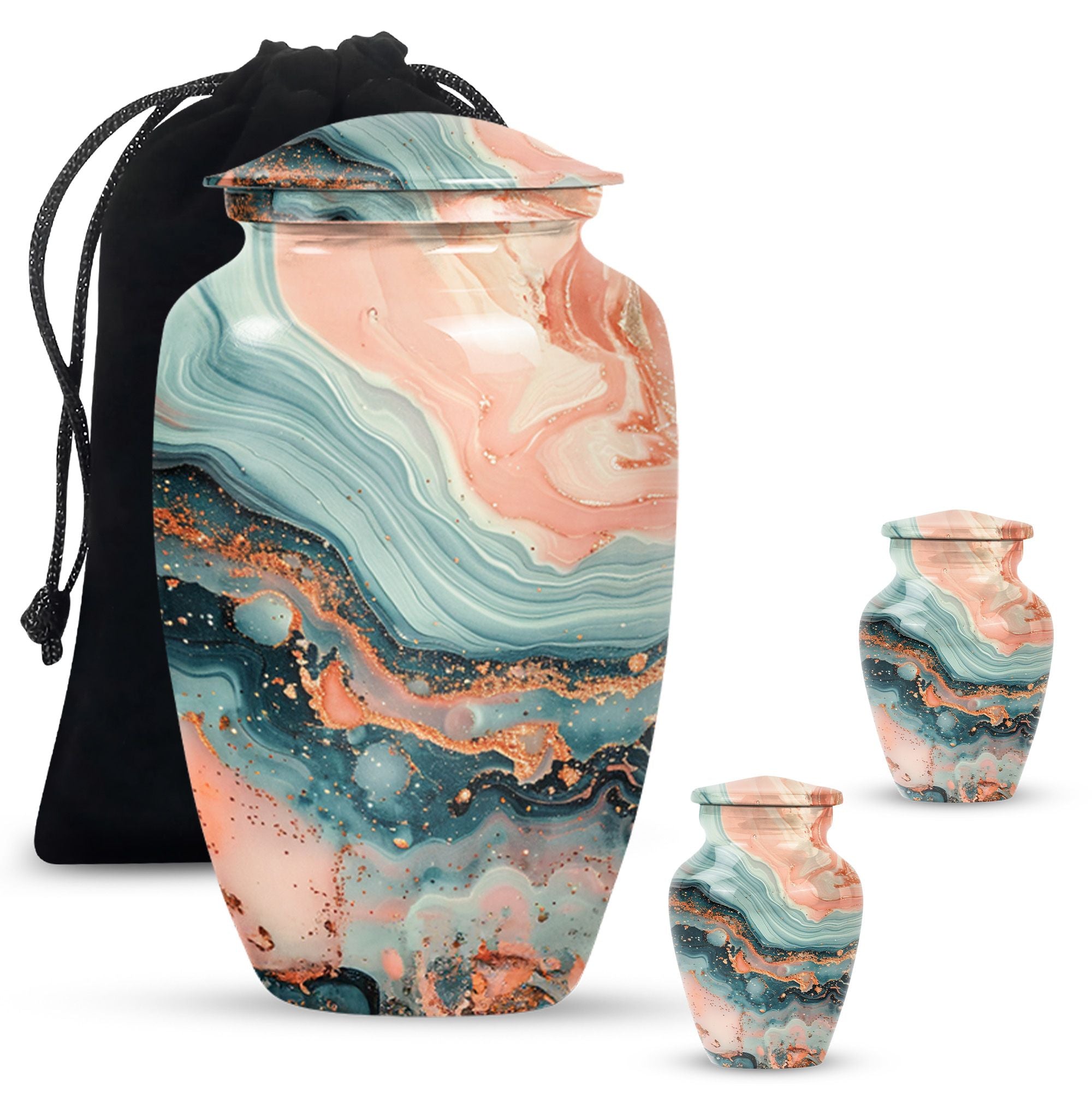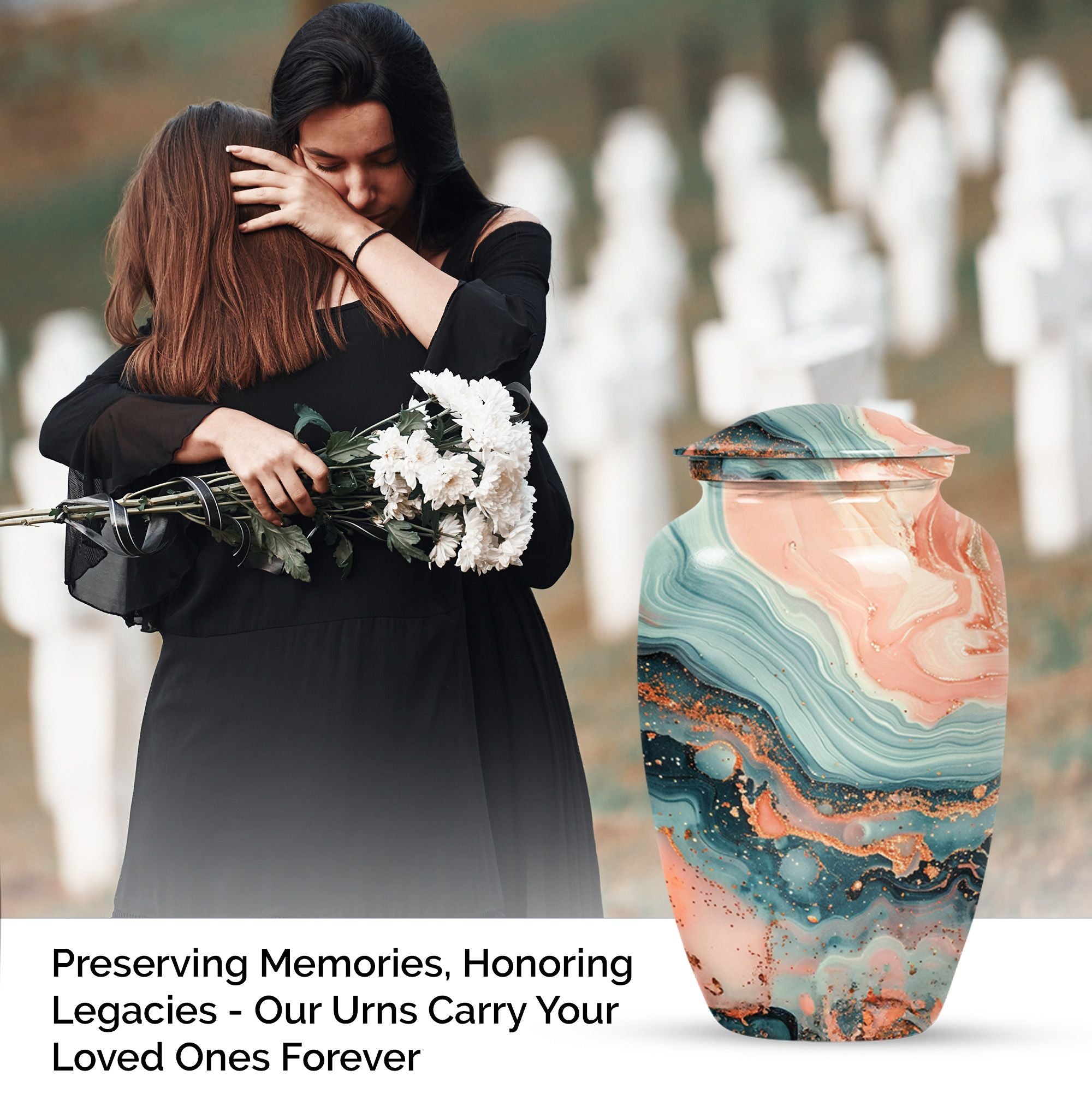 Emanate sublime solemnity with the Vibrant Swirl Urn. A distinct departure from ordinary urn designs, this item's abstract theme provides visual intrigue, making it a sophisticated choice in the range of cremation large urns for ashes. Made of sturdy aluminium, the urn measures 10 inches in height, flaunts an enviable 200 cubic inches capacity, making it ideal for adults, seniors planning memorial ceremonies. Weighing at a modest 3.3 pounds, it offers tangible permanence without being overly cumbersome. The urn's distinguished size contributes to its overall magnificence – embodying class and gravitas in a tangible manner. Usher in an element of personal charm with our customization offer: engrave names on this cremation urn for a touching memorabilia. Included in the package is a lovely velvet pouch, perfect for the dignified containment of ashes. Popularly searched terms linking to this exquisite artefact include 'funeral gifts', 'metal urns for human ashes', and 'cremation medium urns'. This urn effortlessly marries formality with a dash of creative wistfulness, becoming a sure centrepiece of quiet reflection during these times.