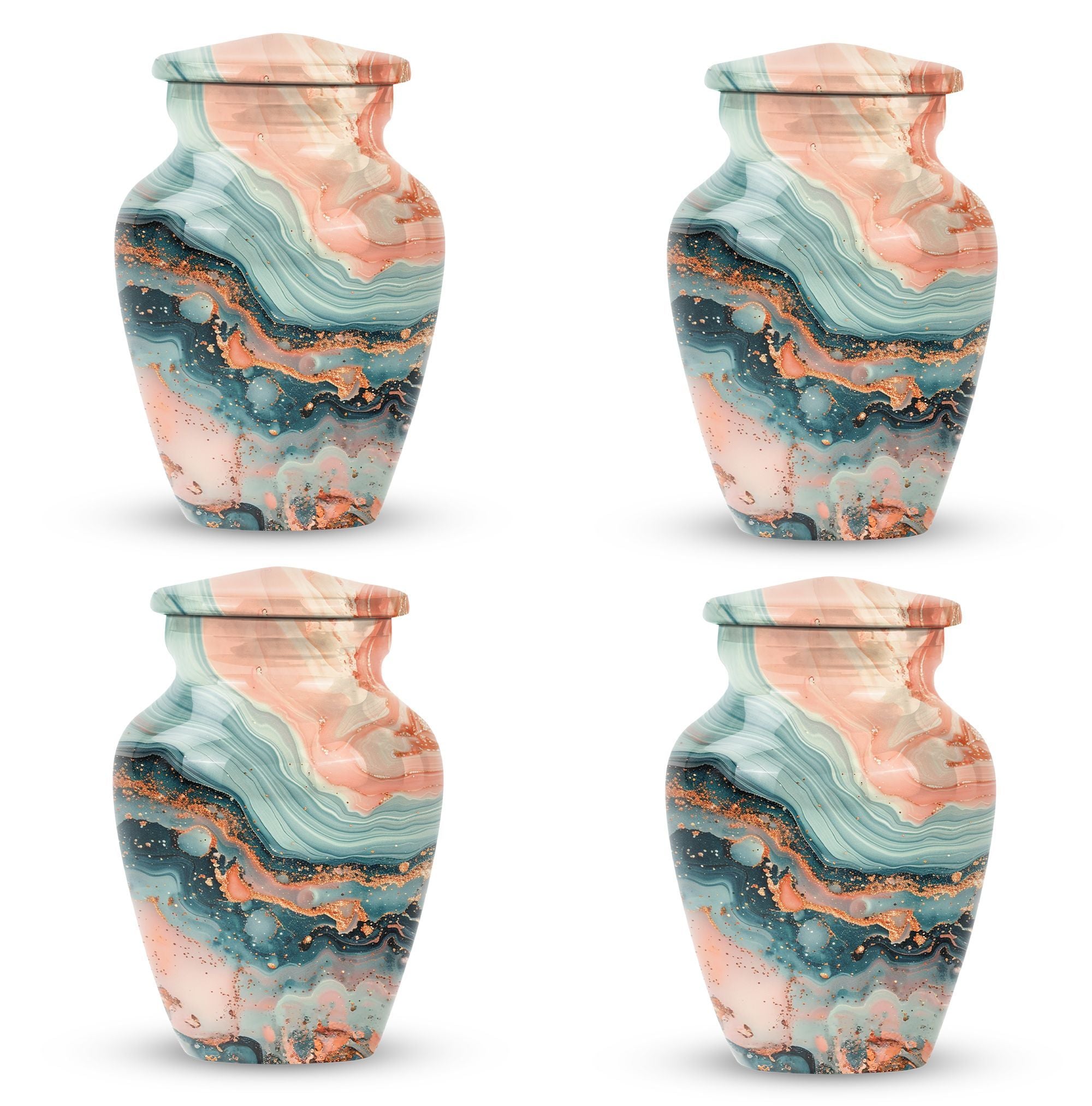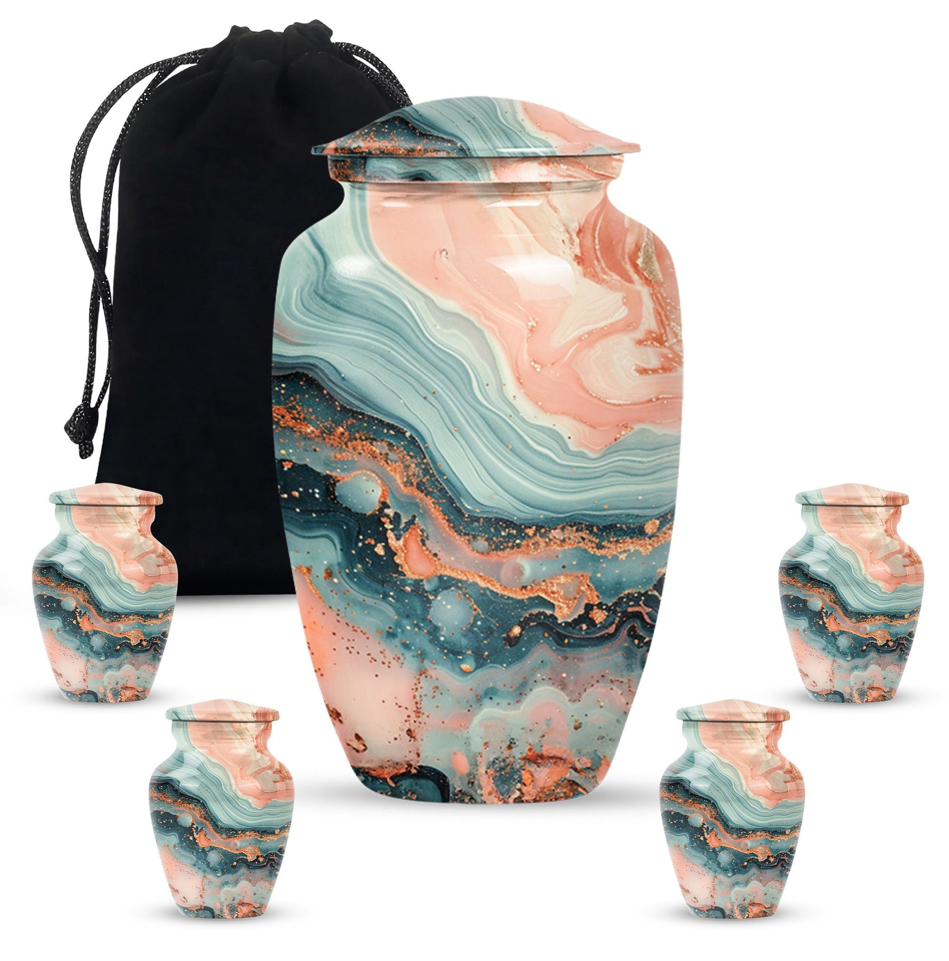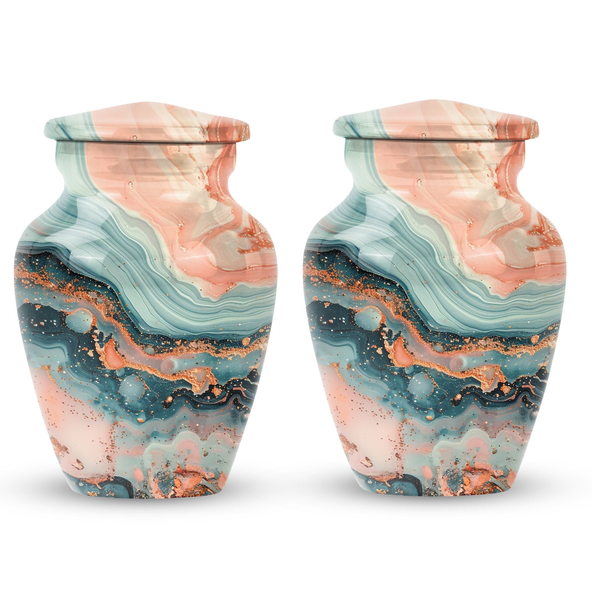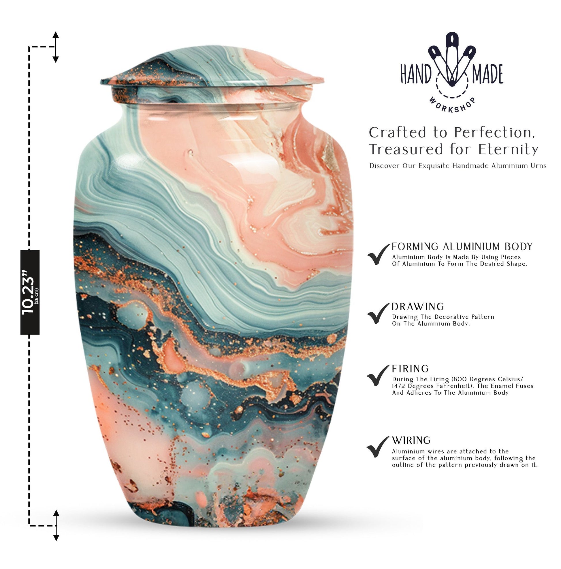 Emanate sublime solemnity with the Vibrant Swirl Urn. A distinct departure from ordinary urn designs, this item's abstract theme provides visual intrigue, making it a sophisticated choice in the range of cremation large urns for ashes. Made of sturdy aluminium, the urn measures 10 inches in height, flaunts an enviable 200 cubic inches capacity, making it ideal for adults, seniors planning memorial ceremonies. Weighing at a modest 3.3 pounds, it offers tangible permanence without being overly cumbersome. The urn's distinguished size contributes to its overall magnificence – embodying class and gravitas in a tangible manner. Usher in an element of personal charm with our customization offer: engrave names on this cremation urn for a touching memorabilia. Included in the package is a lovely velvet pouch, perfect for the dignified containment of ashes. Popularly searched terms linking to this exquisite artefact include 'funeral gifts', 'metal urns for human ashes', and 'cremation medium urns'. This urn effortlessly marries formality with a dash of creative wistfulness, becoming a sure centrepiece of quiet reflection during these times.