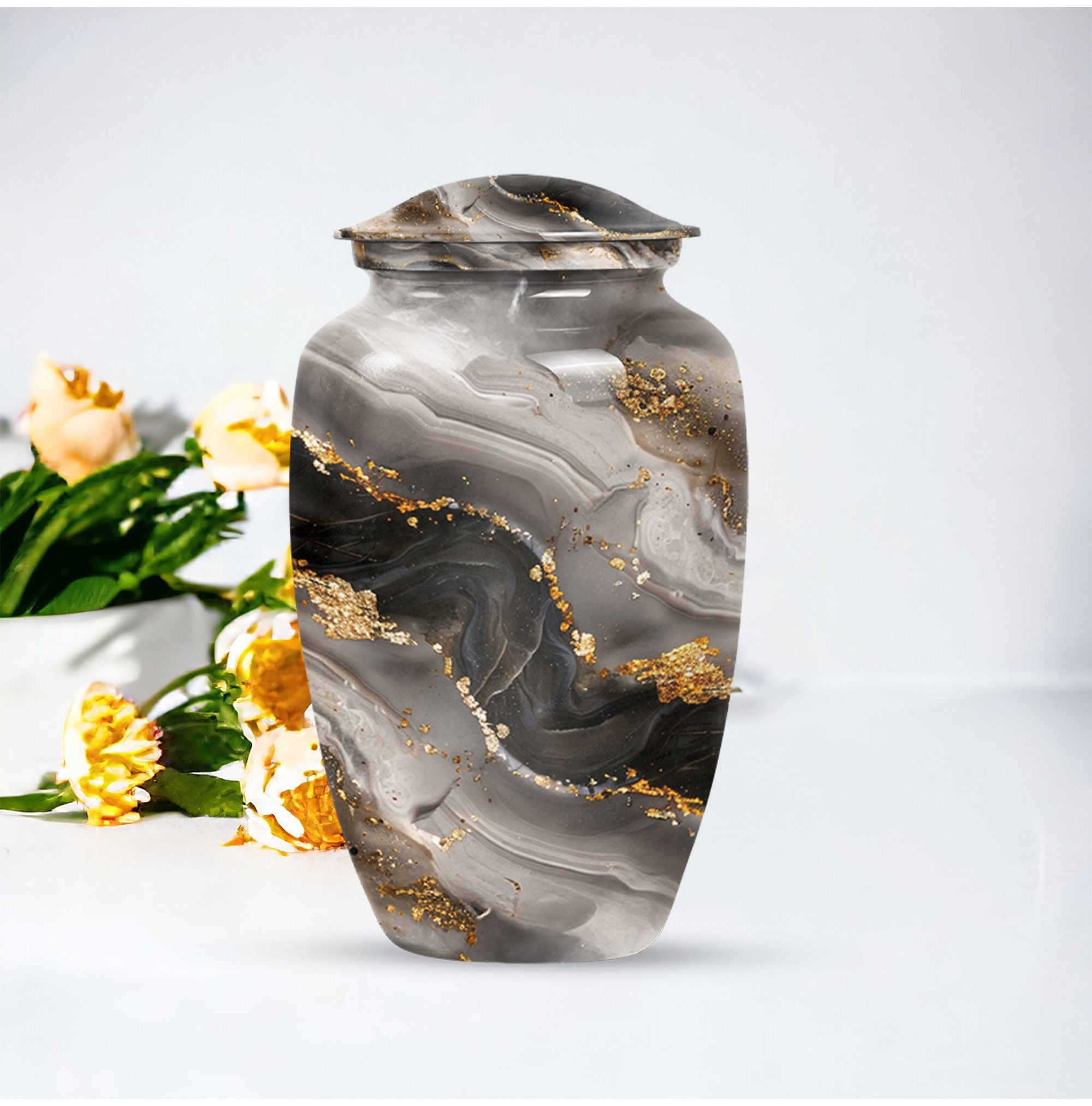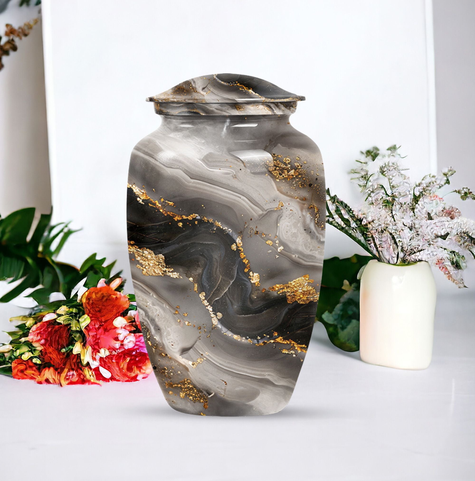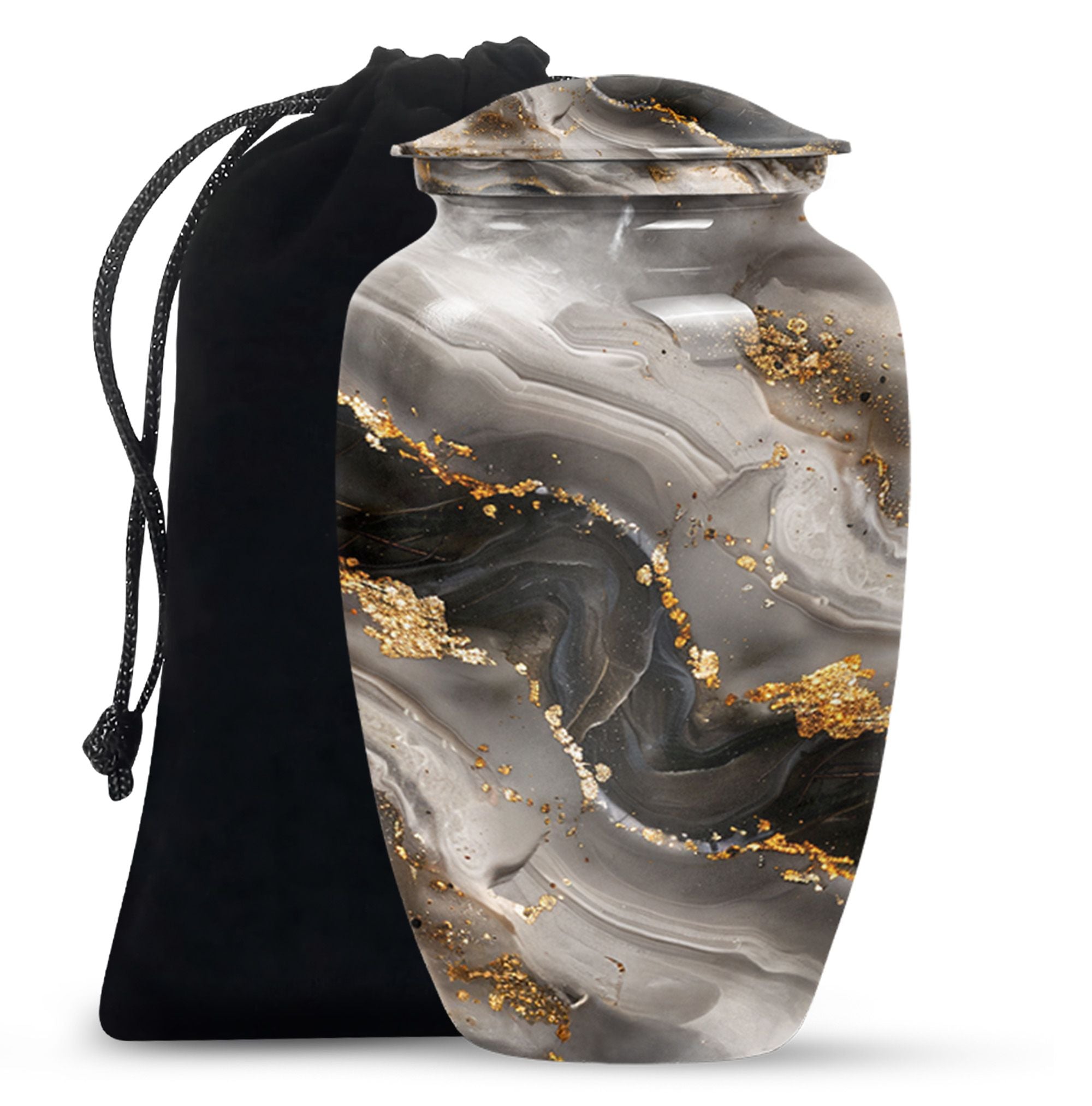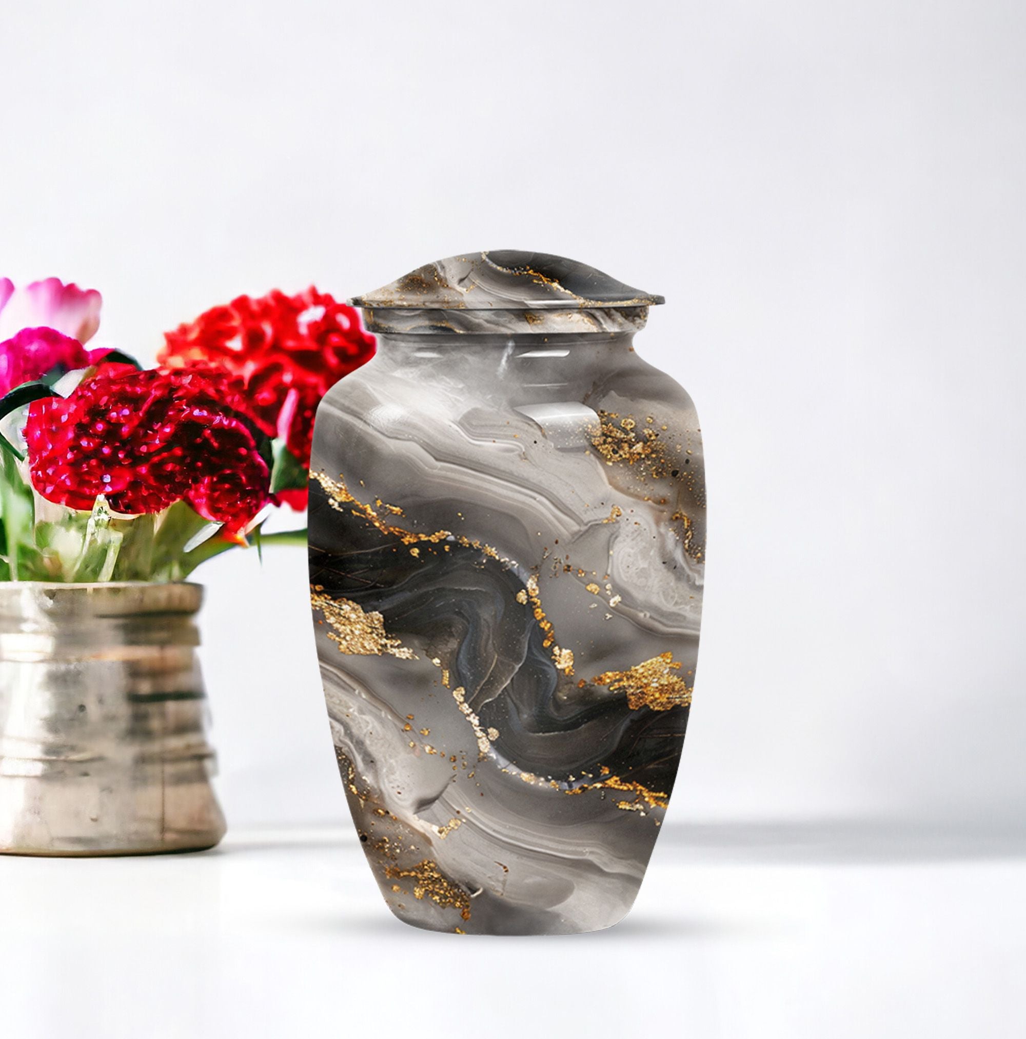 Our Vibrant Swirl Urn is a meticulously designed memorial piece, perfect for adults and seniors looking for ceremonial and remembrance supplies. Specially crafted out of durable, high-grade aluminium, this 10-inch tall urn holds sentimental value and longevity. Gorgeously weighing about 3.3 pounds, it showcases a spectacular abstract theme that resonates a sense of tranquility. Equipped with an impressive capacity of 200 cubic inches, it effortlessly accommodates human ashes, serving as a serene tribute to your loved ones. As a personalized touch, we offer custom engraving, where names of your choice can be etched onto it. Furthermore, each urn is accompanied by a lush velvet pouch that provides safe and respectful containment of ashes. Whether you are seeking memorial adult urns for human ashes women, funeral large urns for human ashes adult male, or adult urns for cremation ashes, our Vibrant Swirl Urn stands out as a splendid alternative. Cherish the memory of your loved ones with this timeless memorial urn.