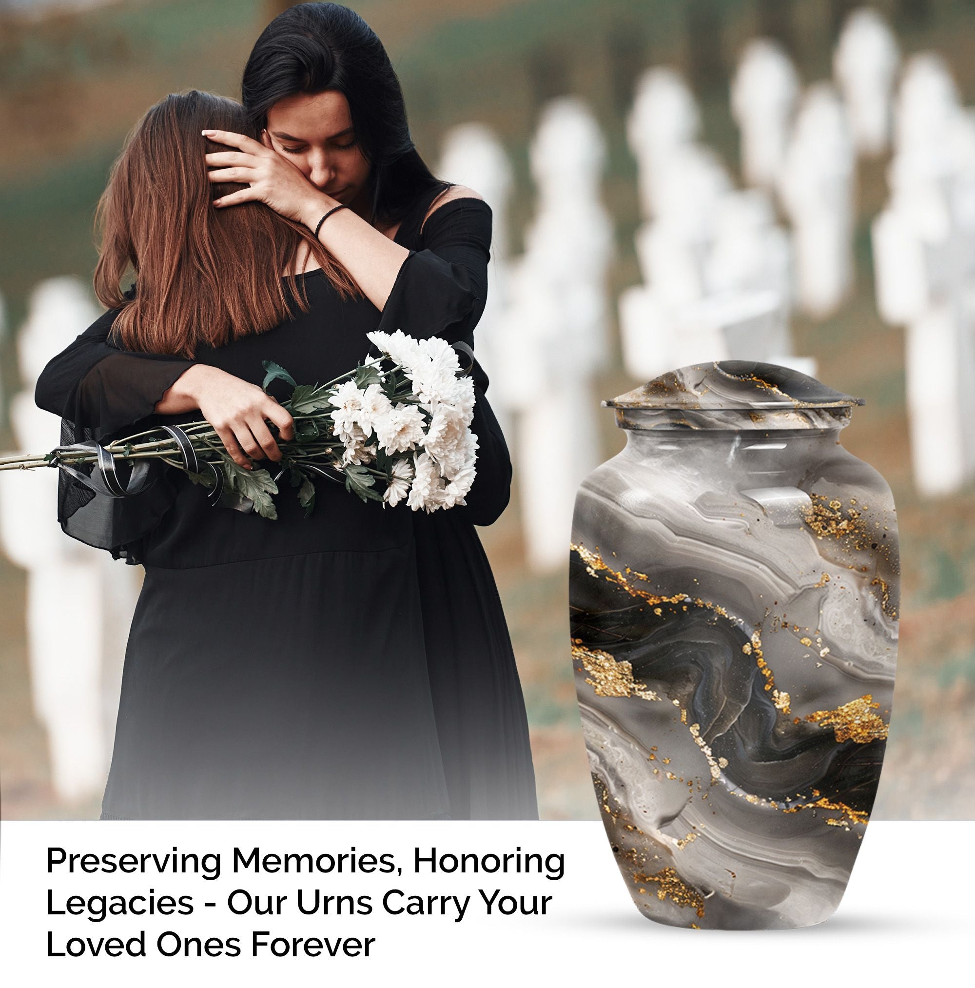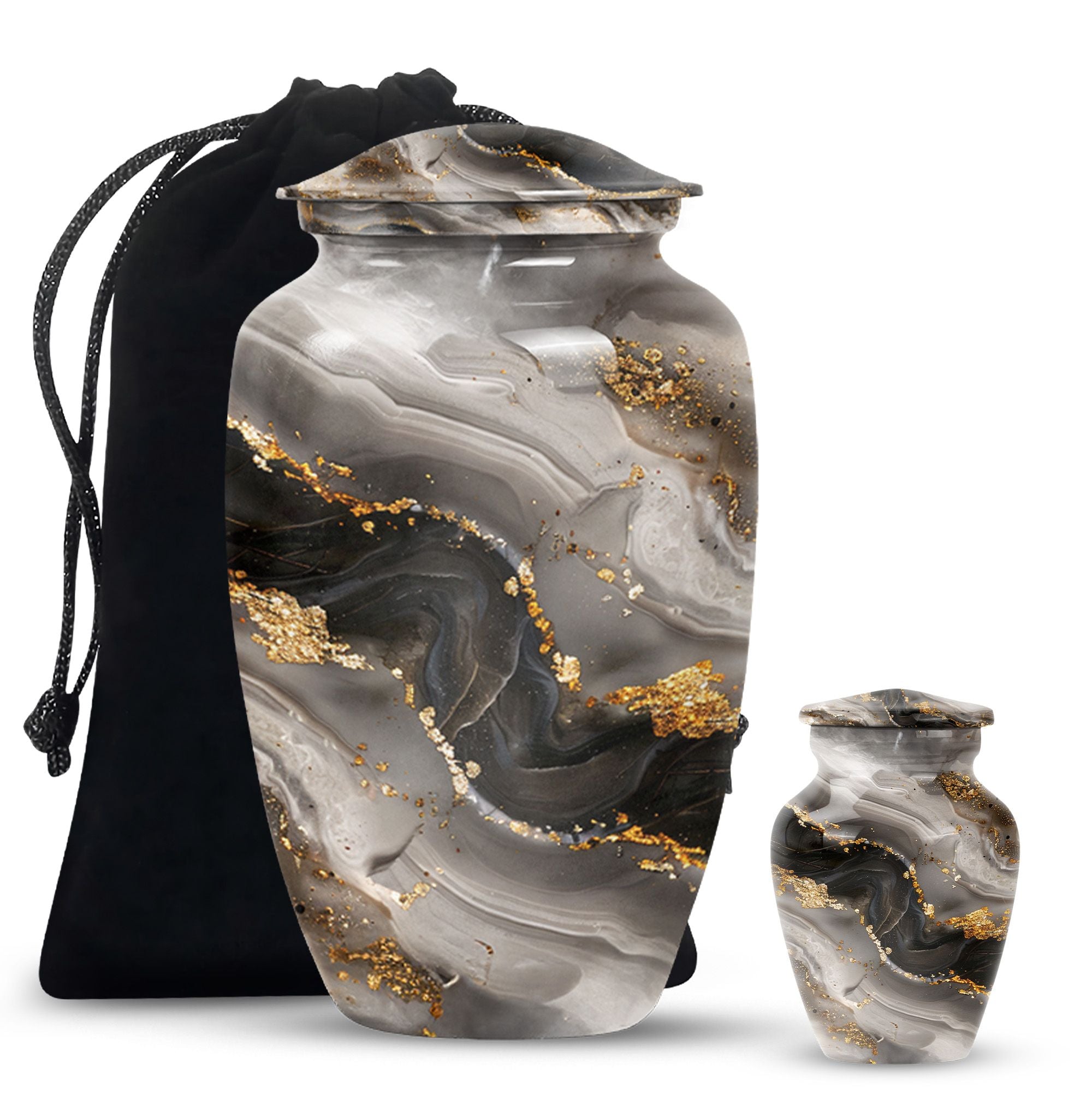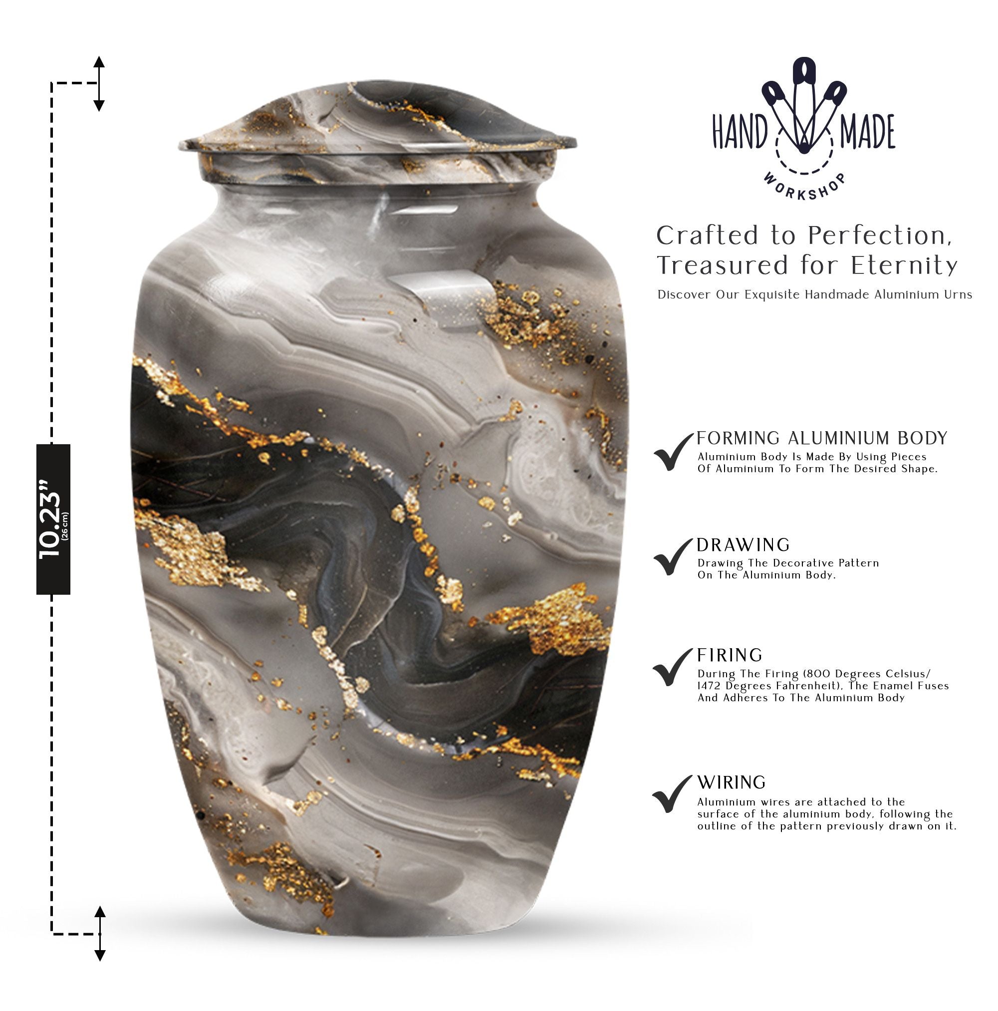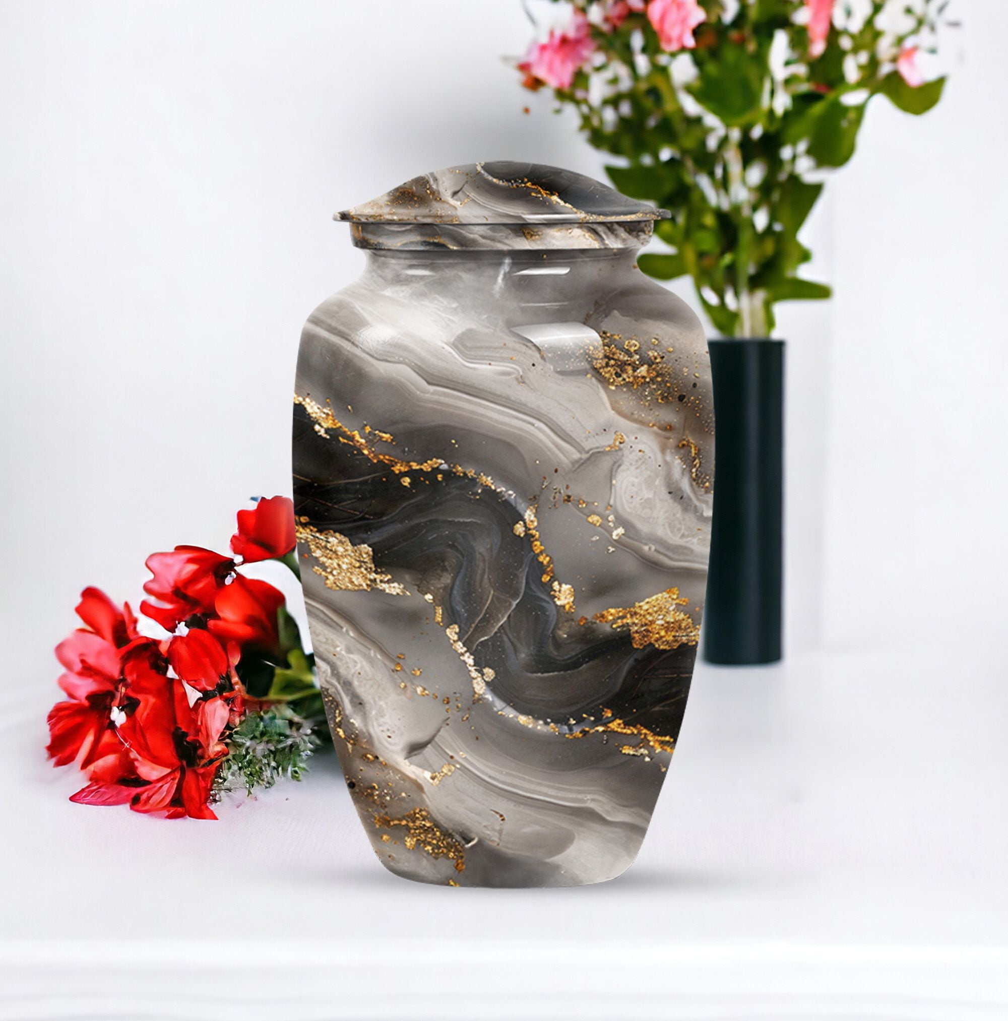 Our Vibrant Swirl Urn is a meticulously designed memorial piece, perfect for adults and seniors looking for ceremonial and remembrance supplies. Specially crafted out of durable, high-grade aluminium, this 10-inch tall urn holds sentimental value and longevity. Gorgeously weighing about 3.3 pounds, it showcases a spectacular abstract theme that resonates a sense of tranquility. Equipped with an impressive capacity of 200 cubic inches, it effortlessly accommodates human ashes, serving as a serene tribute to your loved ones. As a personalized touch, we offer custom engraving, where names of your choice can be etched onto it. Furthermore, each urn is accompanied by a lush velvet pouch that provides safe and respectful containment of ashes. Whether you are seeking memorial adult urns for human ashes women, funeral large urns for human ashes adult male, or adult urns for cremation ashes, our Vibrant Swirl Urn stands out as a splendid alternative. Cherish the memory of your loved ones with this timeless memorial urn.