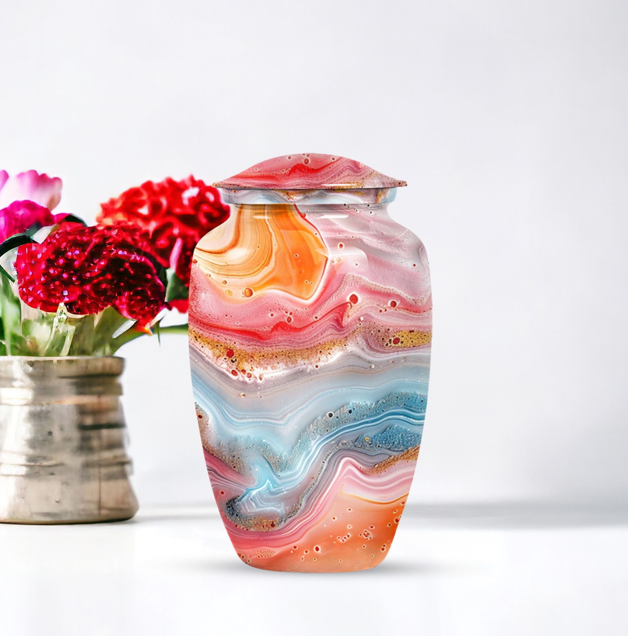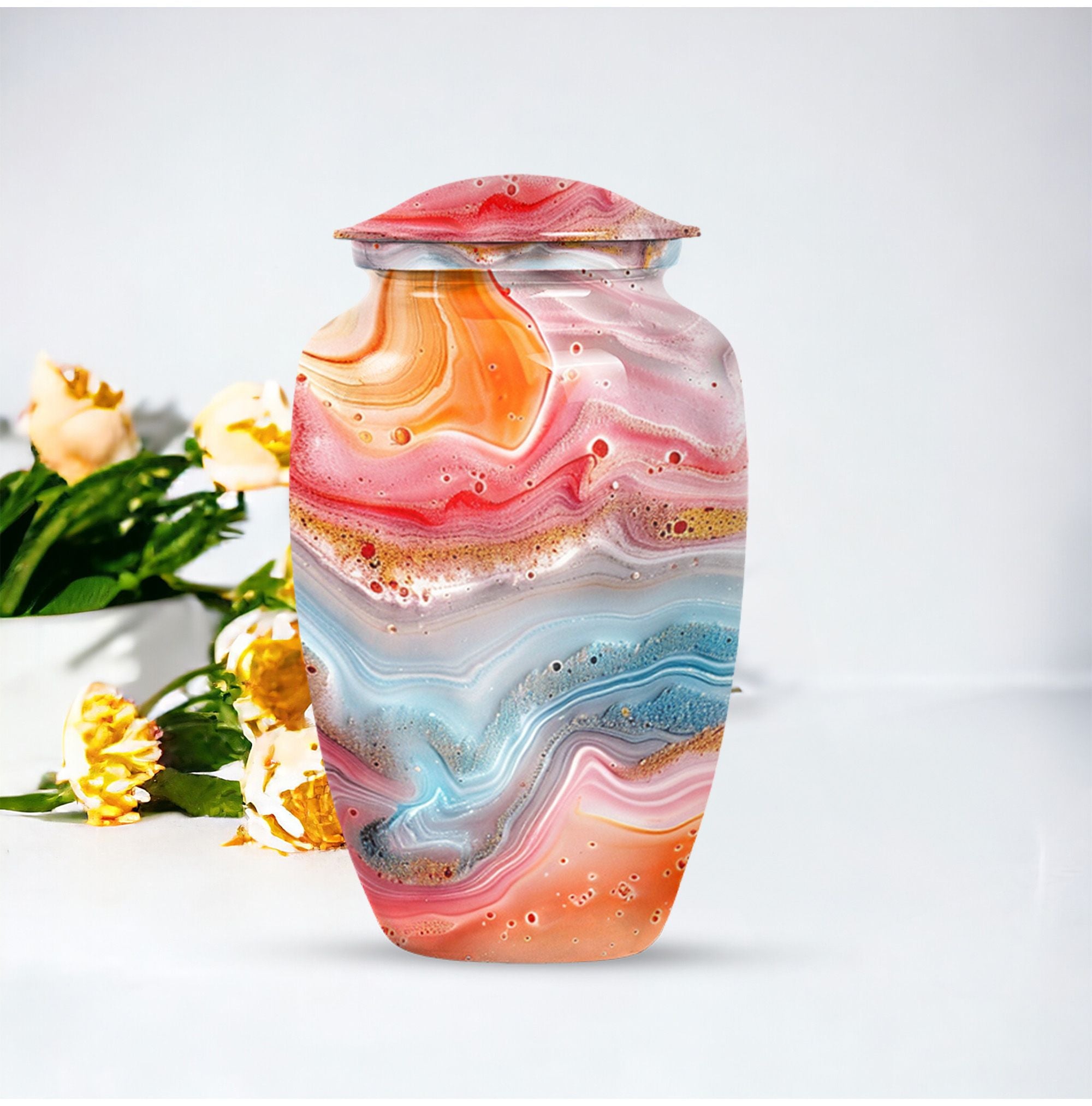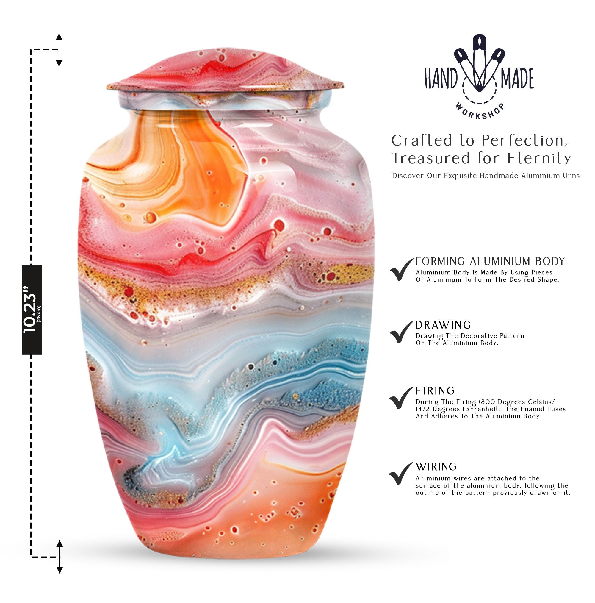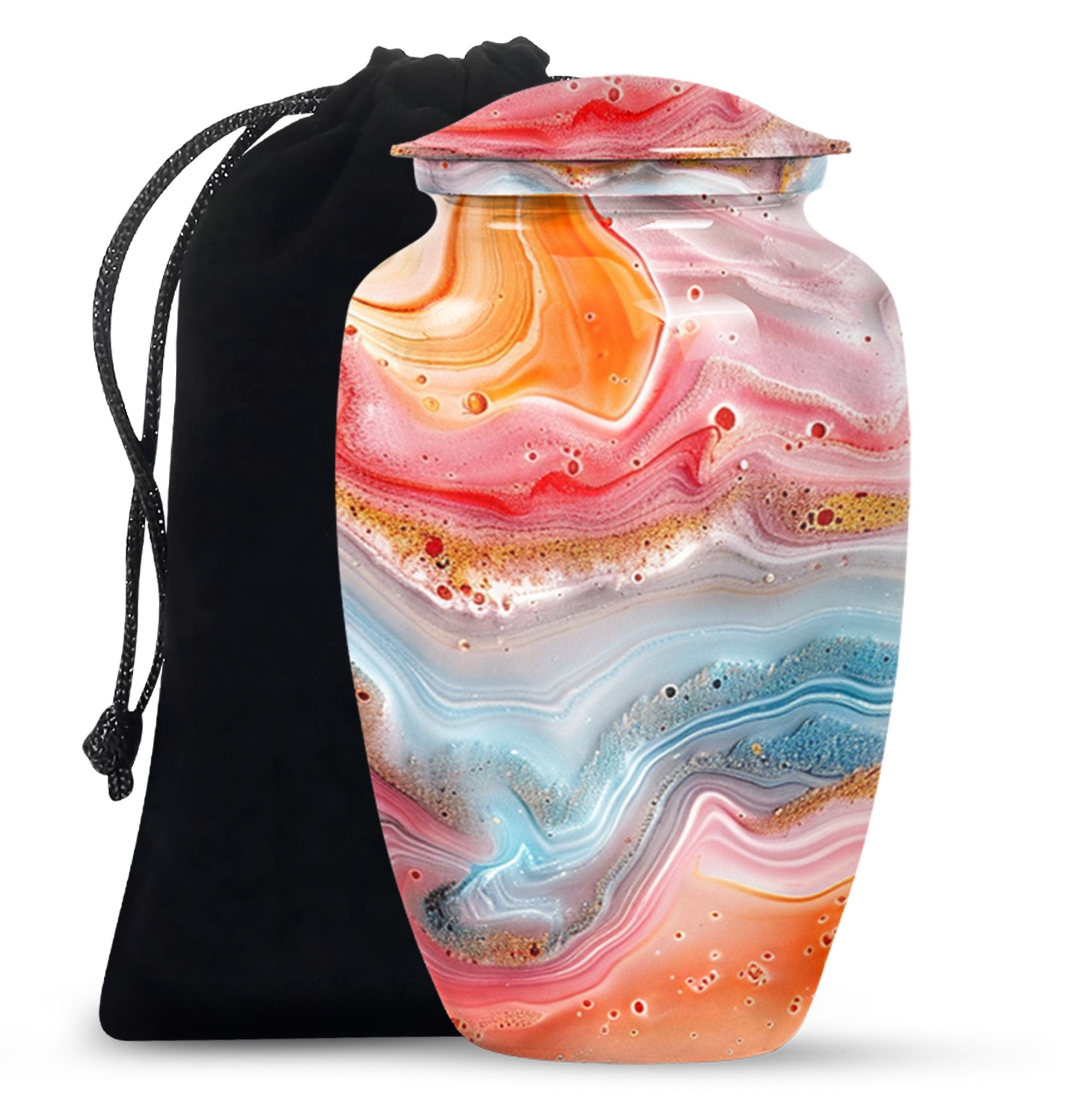 Find solace and embrace elegance with our Vibrant Swirl Urn, a perfect sacred vessel to cherish the memory of your loved ones. Offering a capacity of 200 cubic inches, this cremation urn is built to hold the ashes of an adult securely. Measuring 10 inches in height and weighing 3.3 pounds, it is an ideal option for a traditional tribute. Crafted from durable aluminium, our urn is designed with an abstract theme offering a modern take on usual large urns. The classic urn design combines tradition and modern craftsmanship to provide a lasting symbol of love and respect. Beyond its aesthetic appeal, we offer personalization to engrave names and create a unique memorial. The urn package also includes a velvet pouch for containment and protection of ashes, adding an element of convenience and thoughtfulness. This special urn is a suitable choice for those looking for burial urns for adult female ashes, urn for humans, and modern urns. Emphasize your love, honor your memory, and respect the restoration with our vibrant swirl urn.