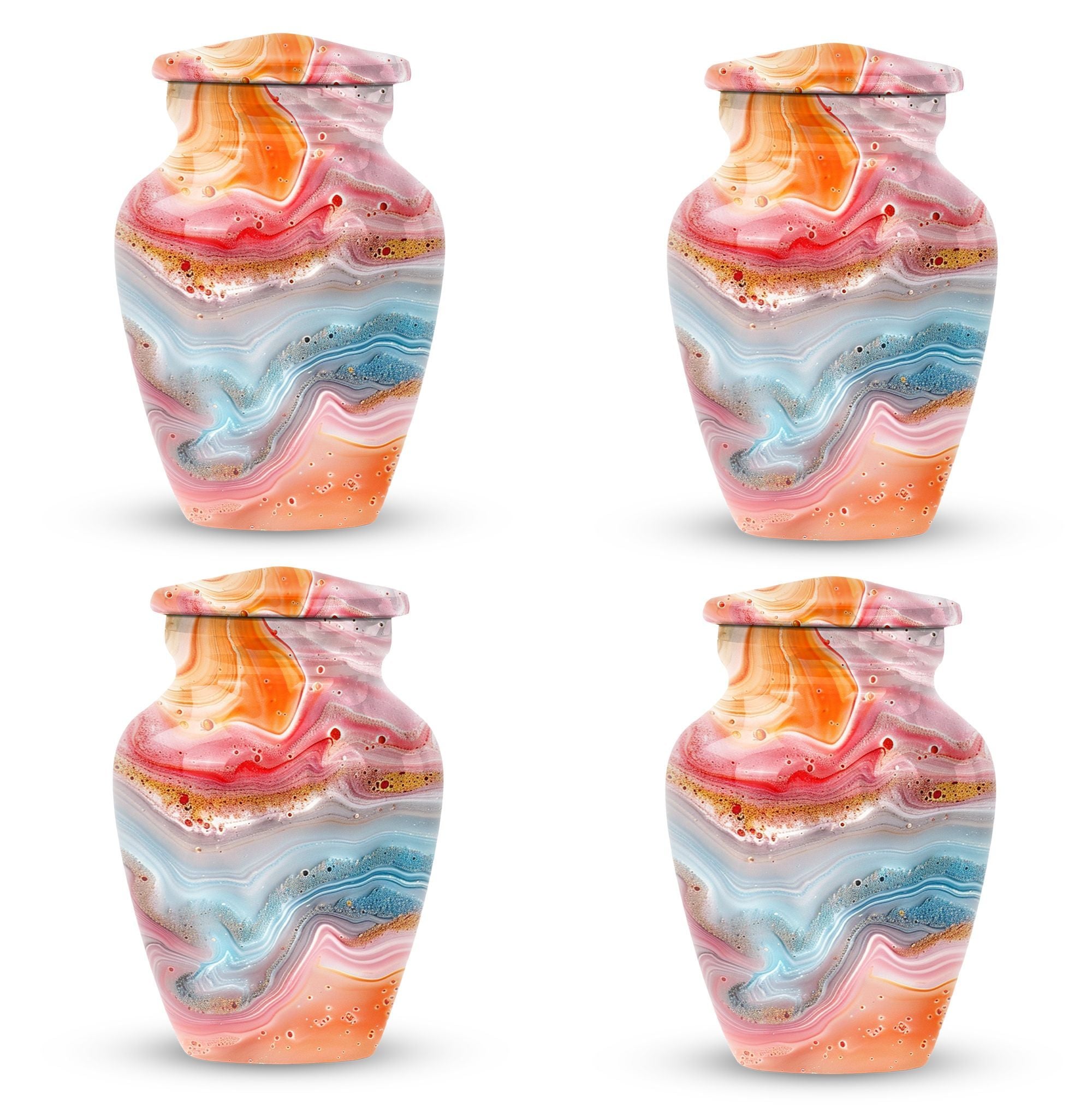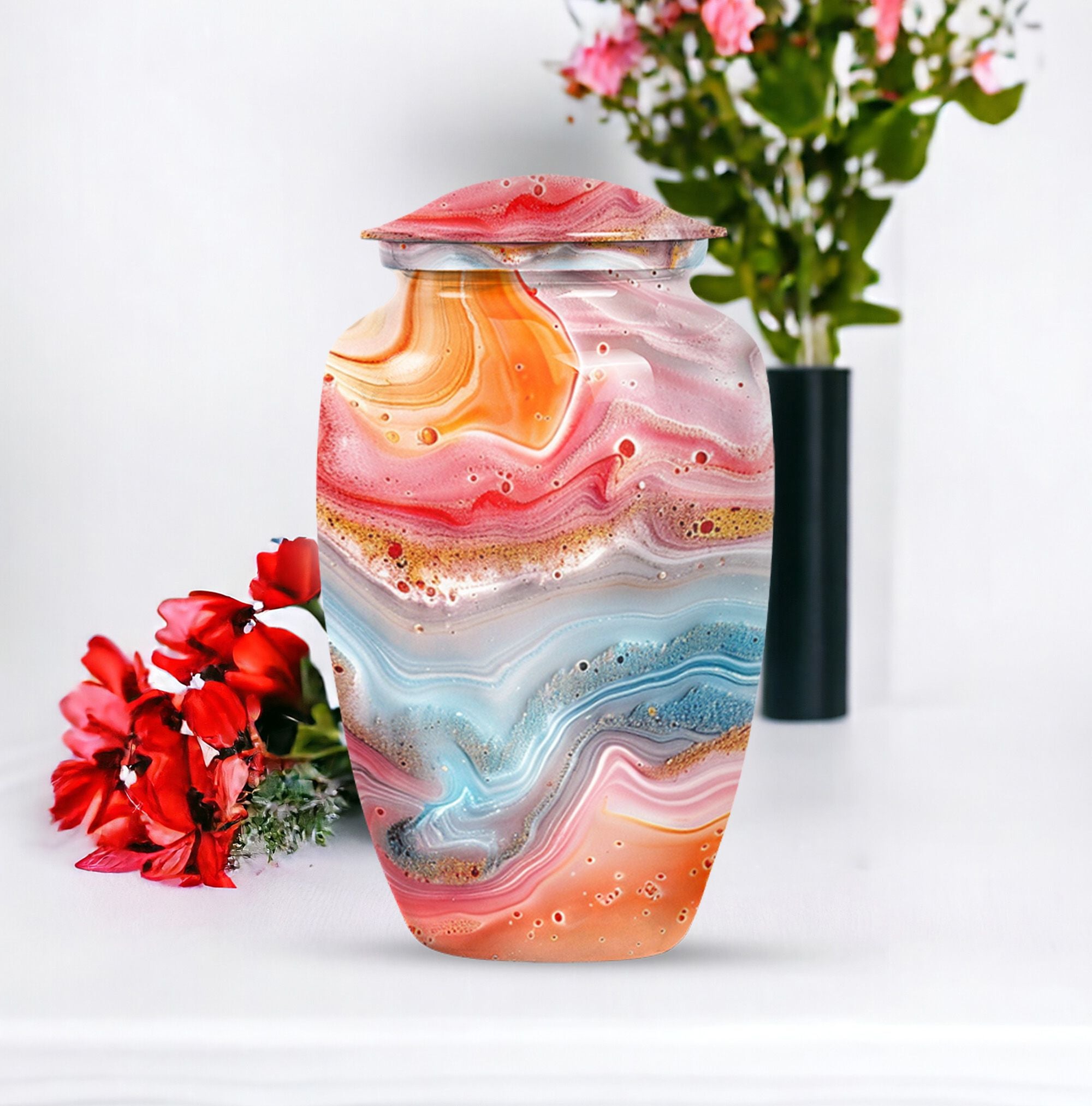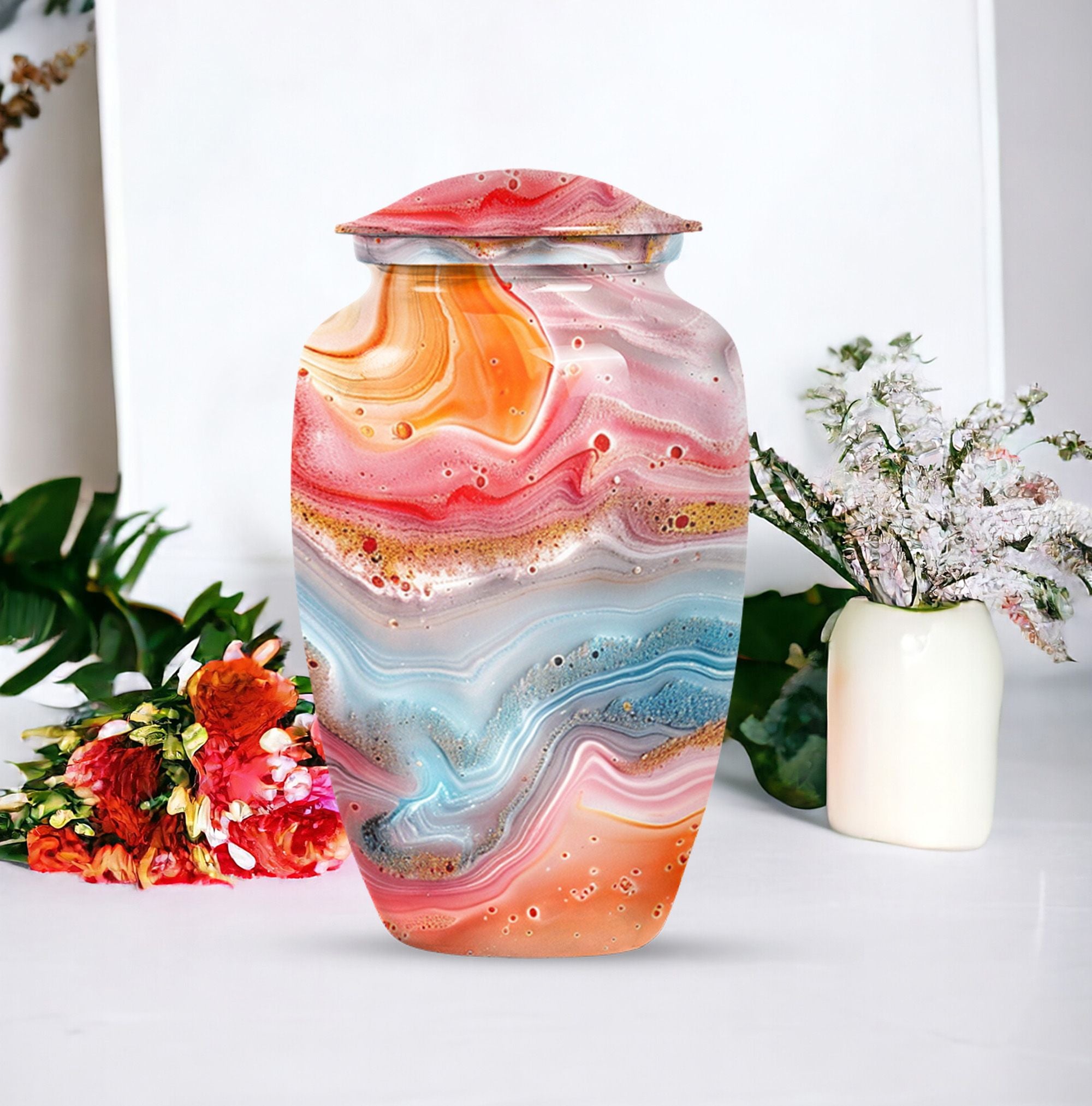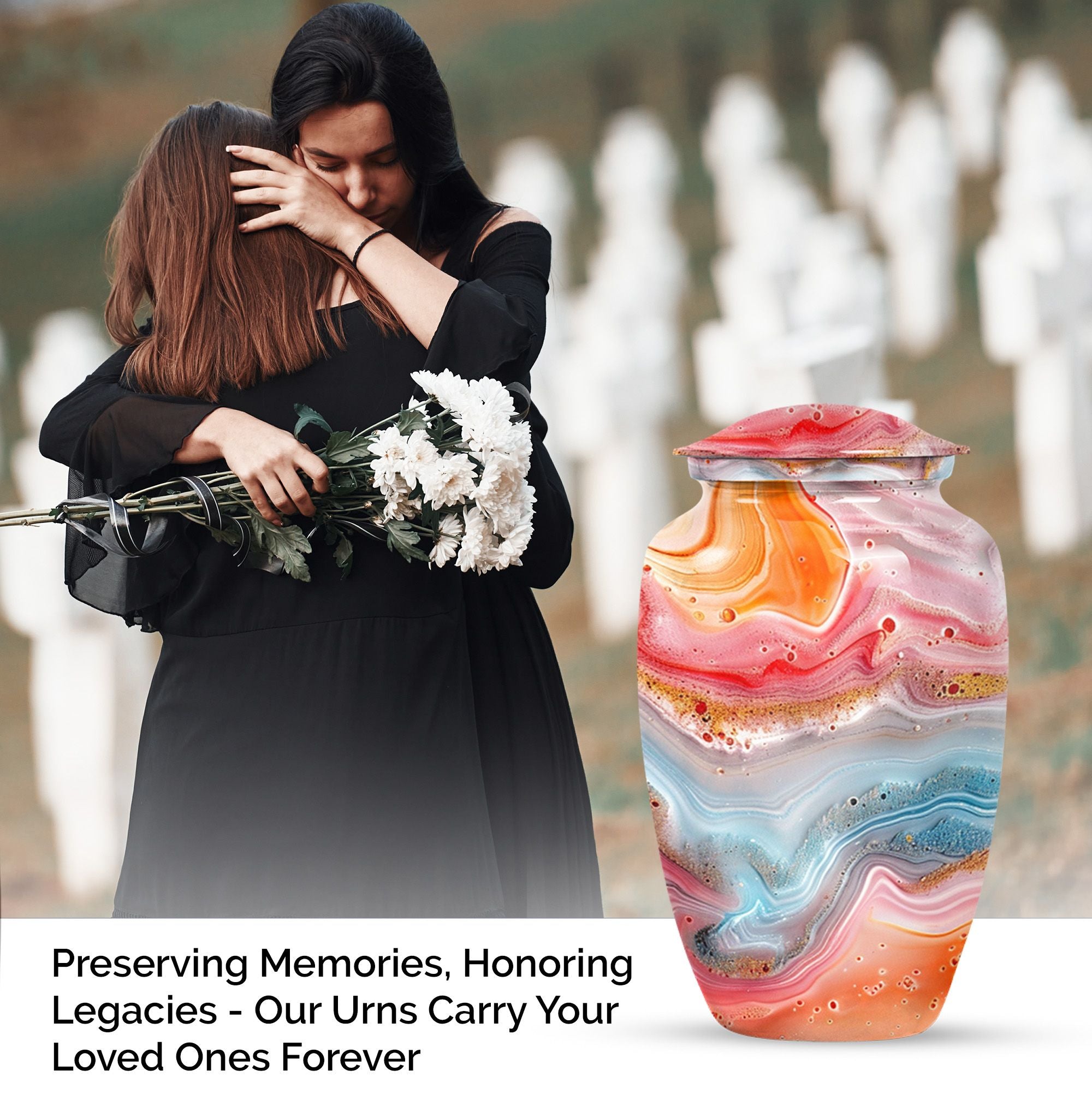 Find solace and embrace elegance with our Vibrant Swirl Urn, a perfect sacred vessel to cherish the memory of your loved ones. Offering a capacity of 200 cubic inches, this cremation urn is built to hold the ashes of an adult securely. Measuring 10 inches in height and weighing 3.3 pounds, it is an ideal option for a traditional tribute. Crafted from durable aluminium, our urn is designed with an abstract theme offering a modern take on usual large urns. The classic urn design combines tradition and modern craftsmanship to provide a lasting symbol of love and respect. Beyond its aesthetic appeal, we offer personalization to engrave names and create a unique memorial. The urn package also includes a velvet pouch for containment and protection of ashes, adding an element of convenience and thoughtfulness. This special urn is a suitable choice for those looking for burial urns for adult female ashes, urn for humans, and modern urns. Emphasize your love, honor your memory, and respect the restoration with our vibrant swirl urn.